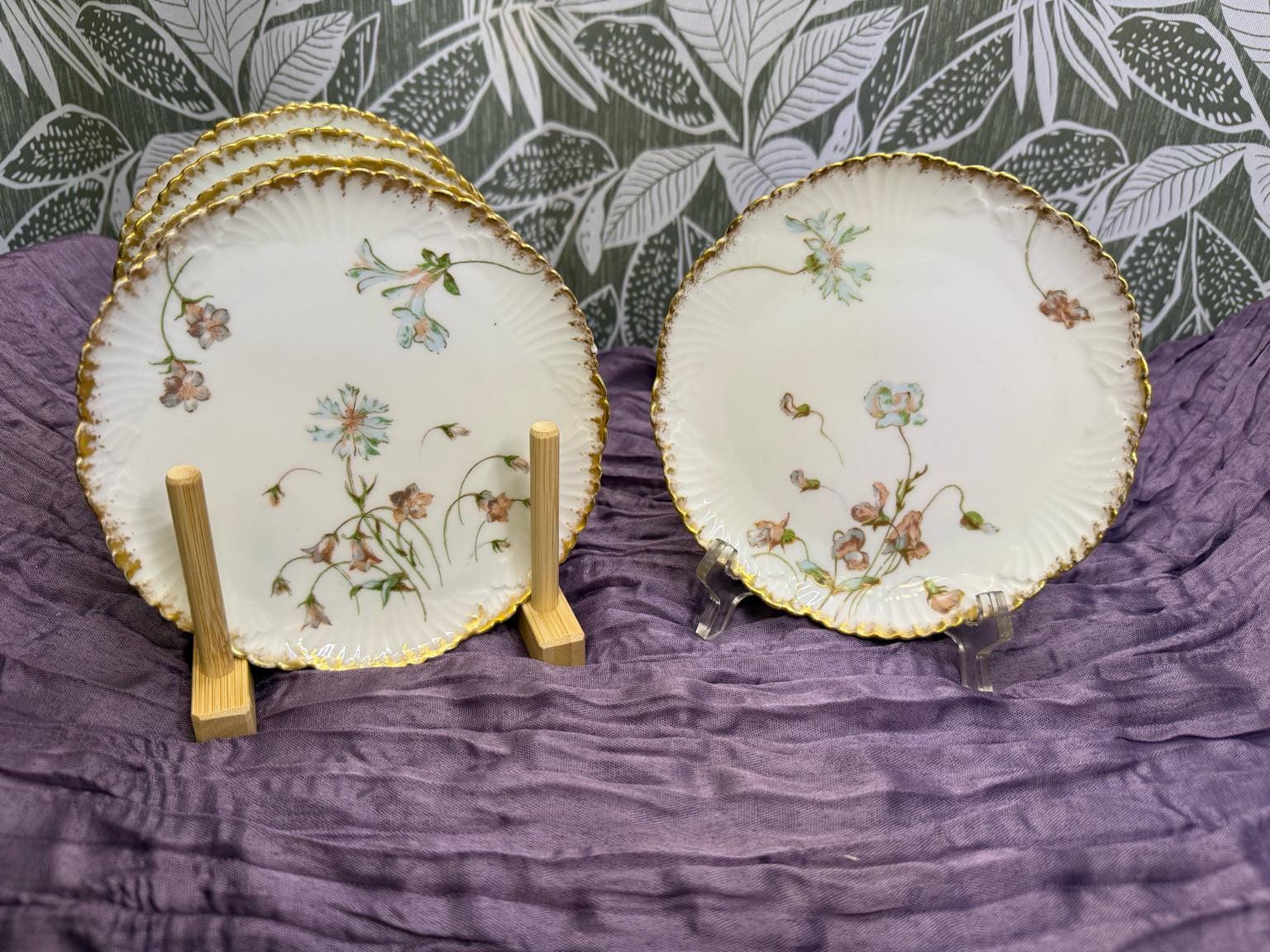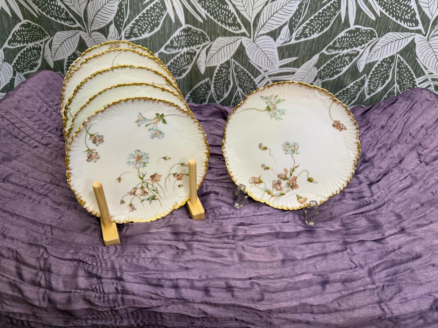 Bring timeless French elegance to your table with this exquisite antique J. Pouyat Limoges porcelain plate, crafted in France in the early 1900s. Each 6 ¼" bread & butter / dessert plate is beautifully hand-painted with delicate floral motifs and finished with 24k gold scalloped edging, showcasing the fine craftsmanship that makes Limoges porcelain so highly sought after.