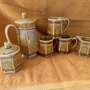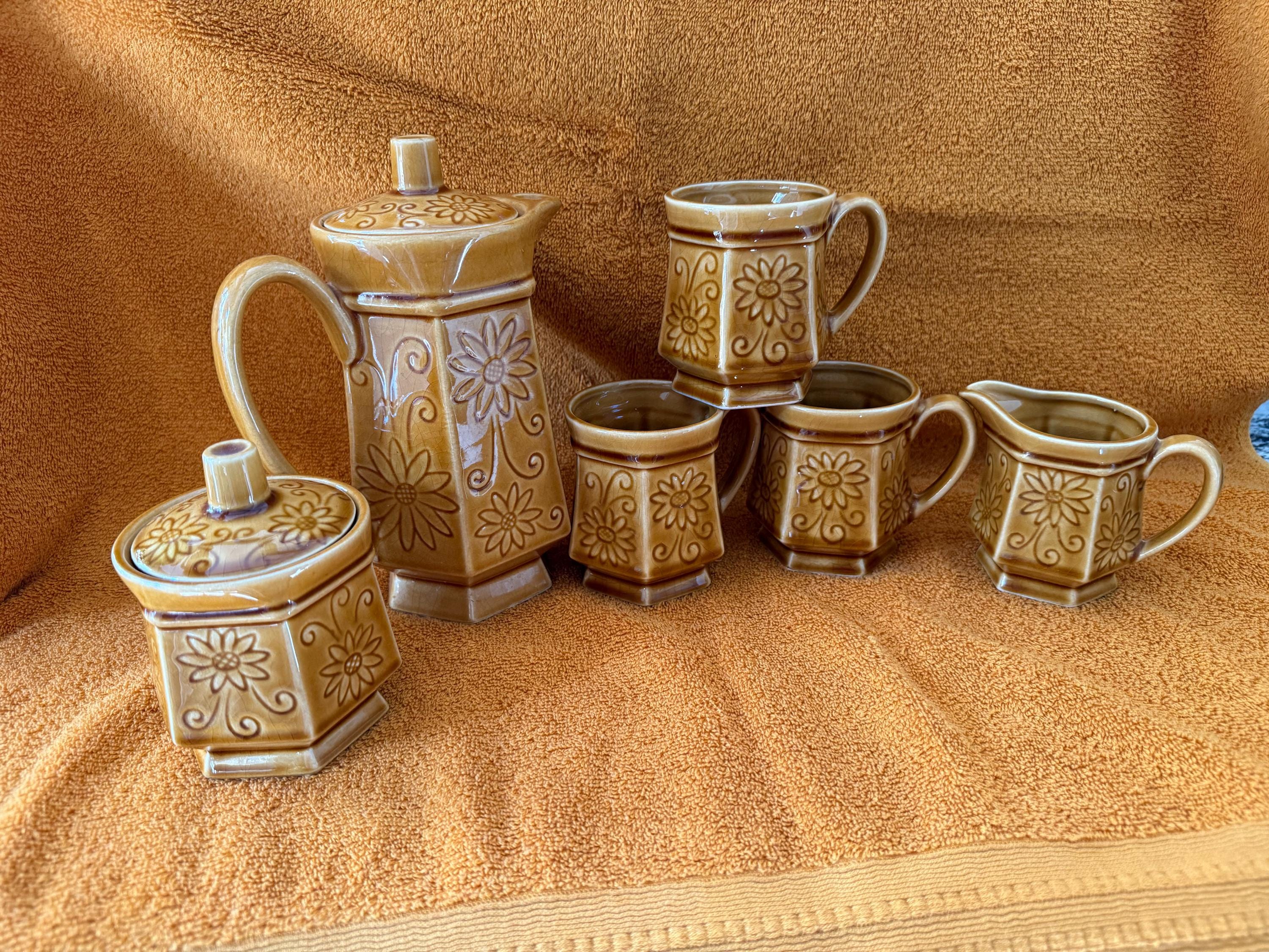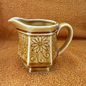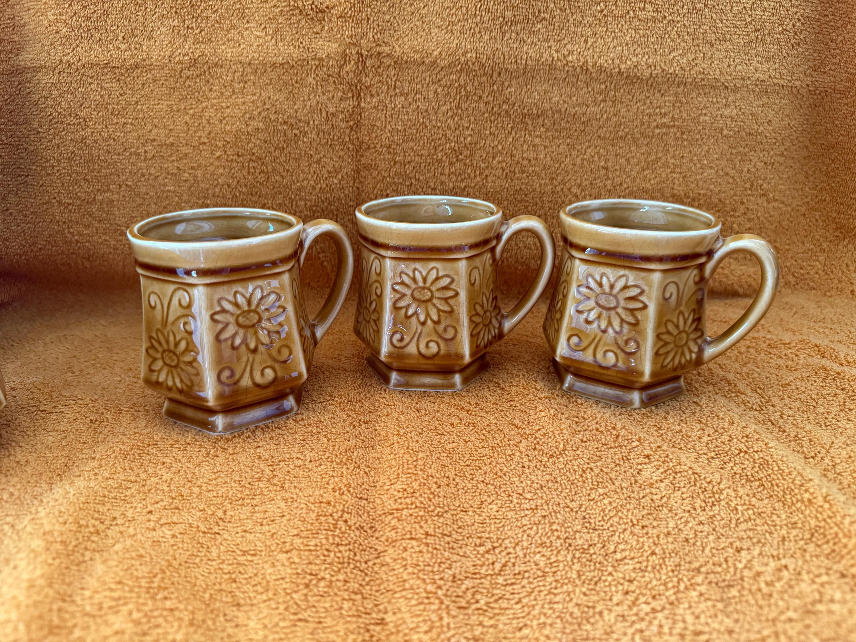 Start your morning in retro style with this cozy vintage stoneware mug. Featuring a warm caramel-brown glaze with embossed daisy flowers and swirled details, this mug has a timeless look that’s both charming and durable. Each mug has a unique hexagonal base, adding to its 1970s retro appeal.