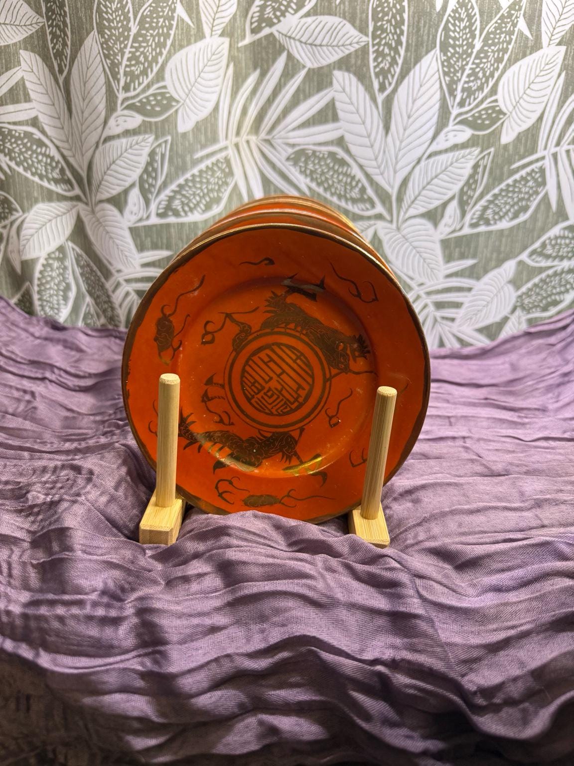 Each plate features a striking deep red background with gold and black hand-painted dragon and calligraphy details, symbolizing strength, power, and good fortune. The center medallion showcases a traditional Asian geometric design, framed by swirling clouds and a detailed dragon motif.