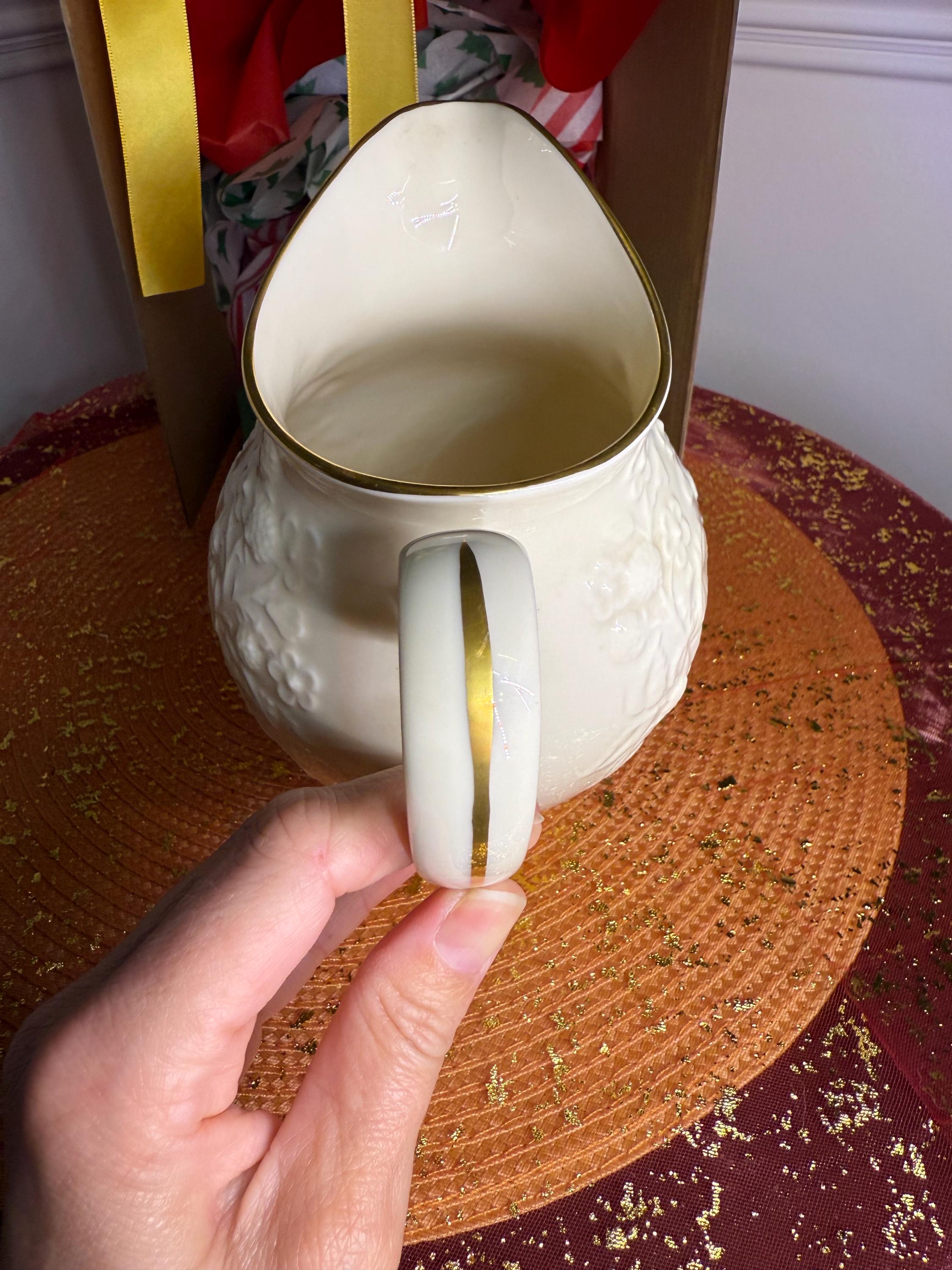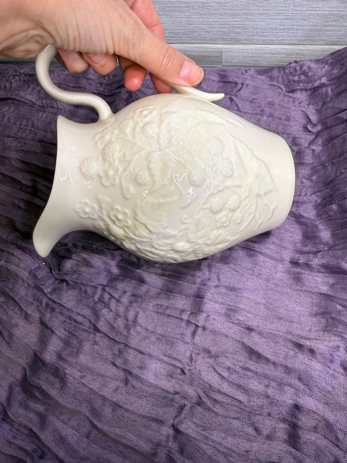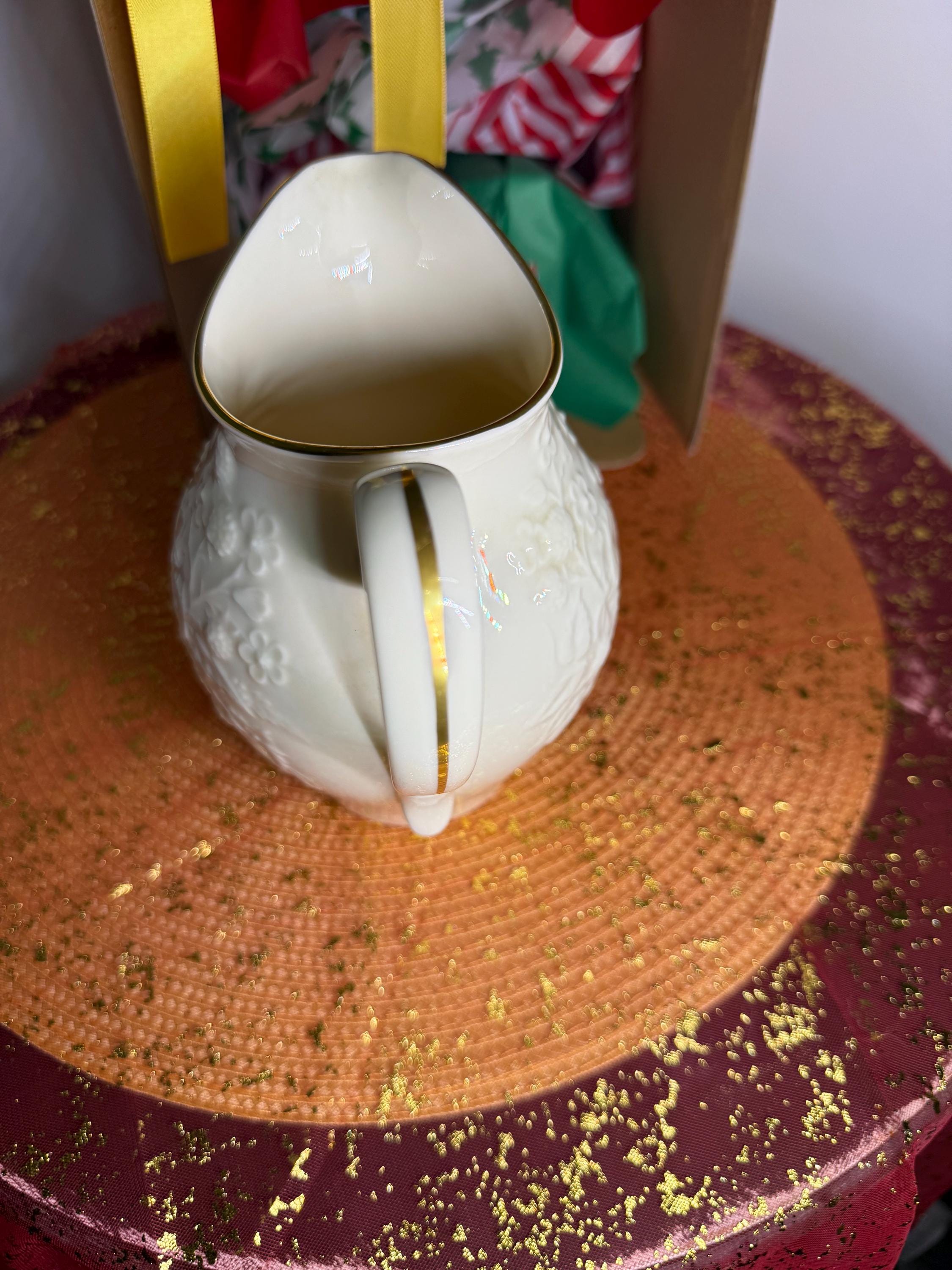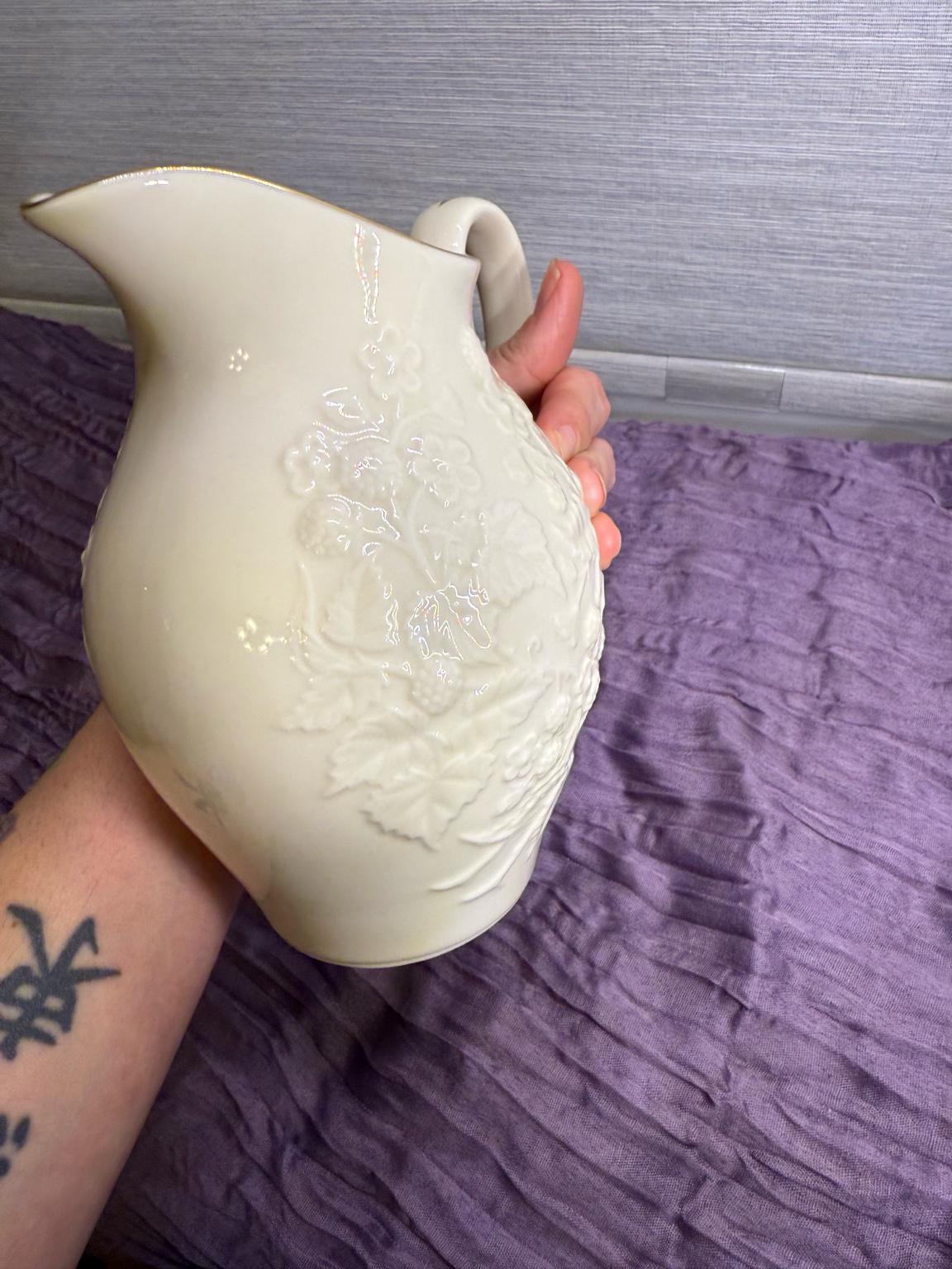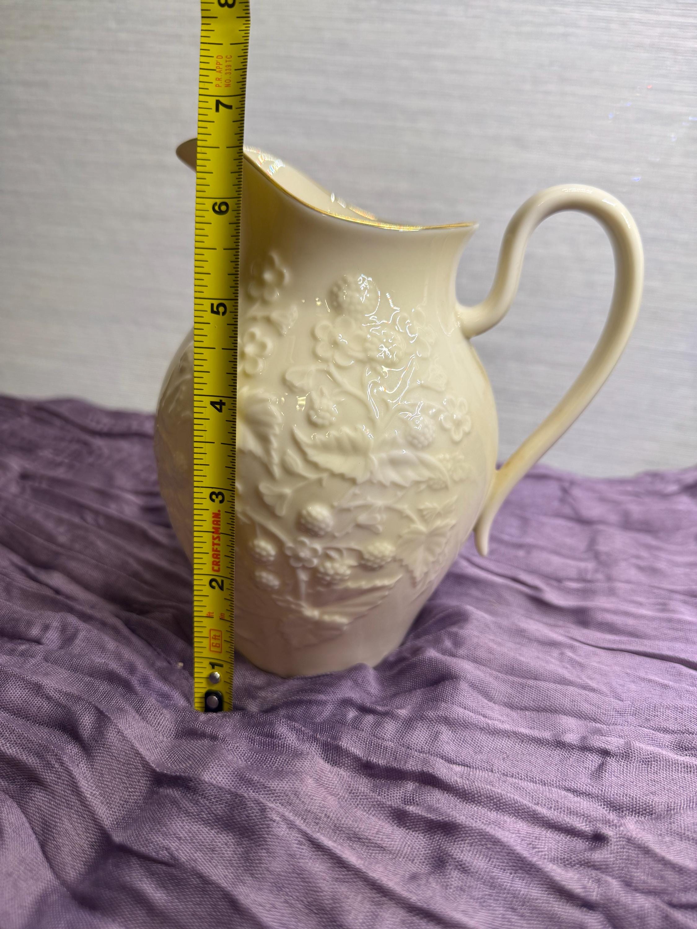 Add timeless elegance to your table with this classic Lenox porcelain pitcher. Standing at 7.5 inches tall, this piece was produced between the 1960s–1980s and showcases Lenox’s signature ivory fine China. The pitcher features a raised floral and fruit motif, with the rim and handle hand-decorated in 24k gold.
