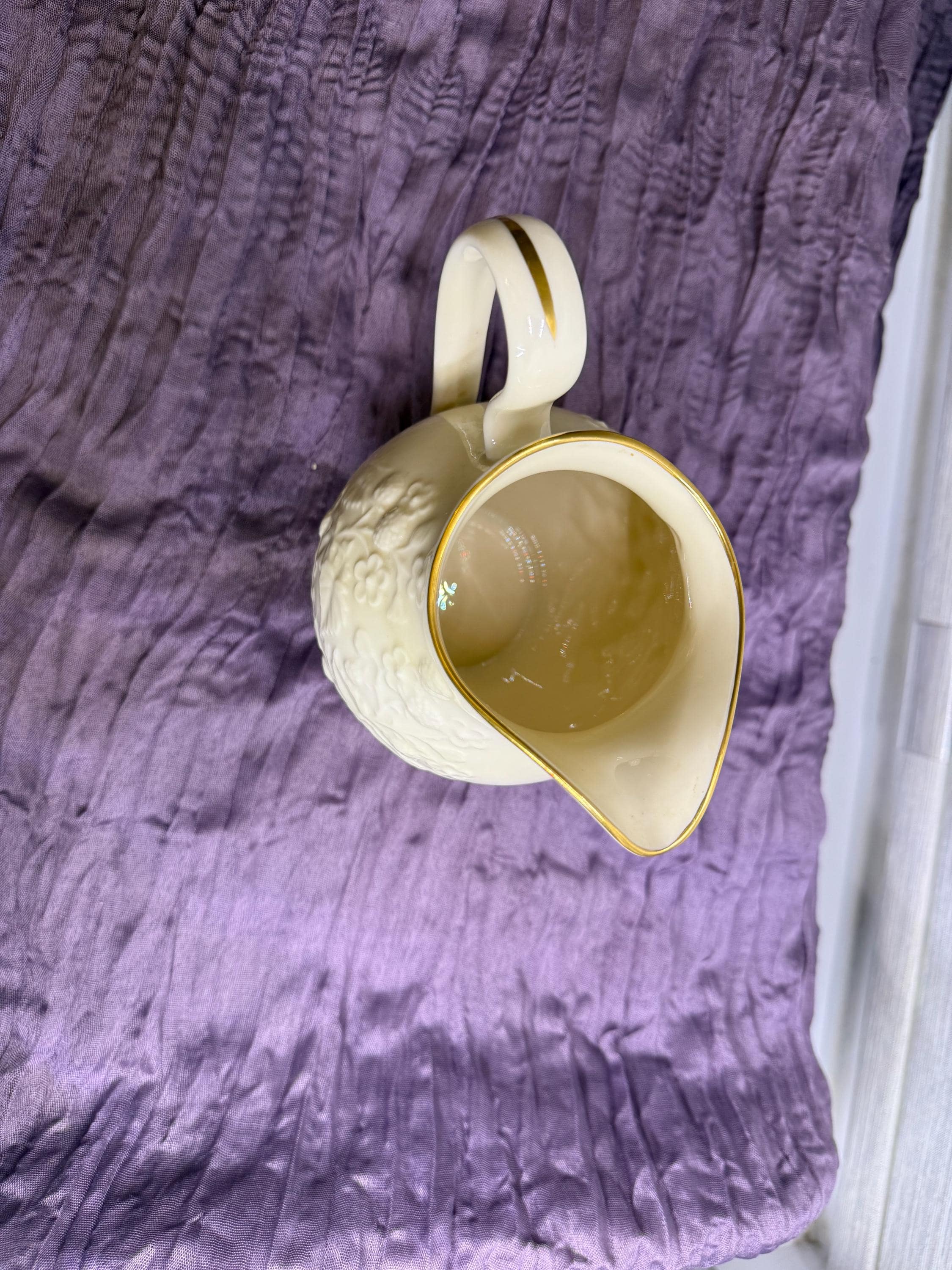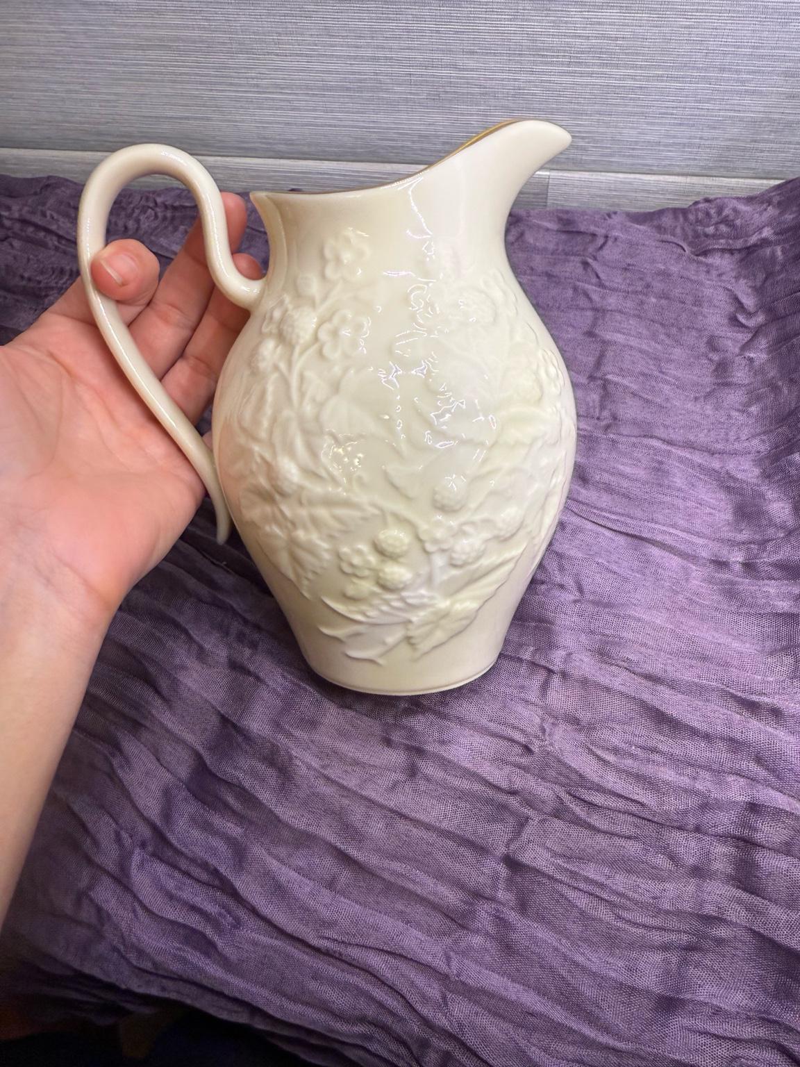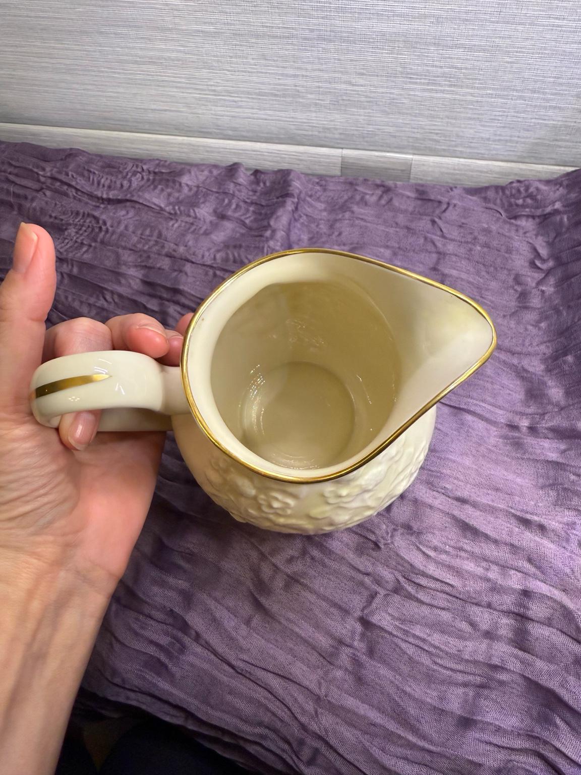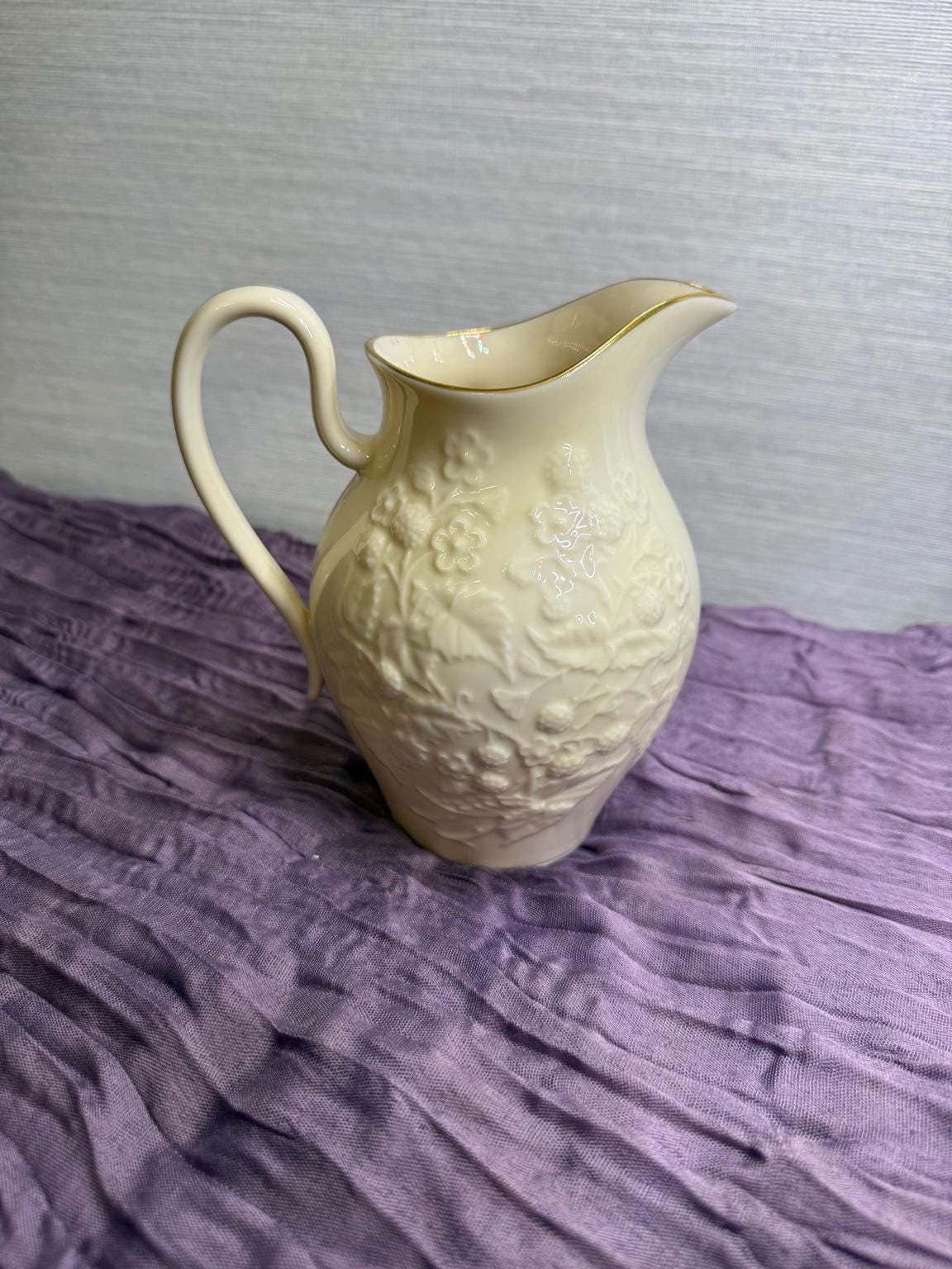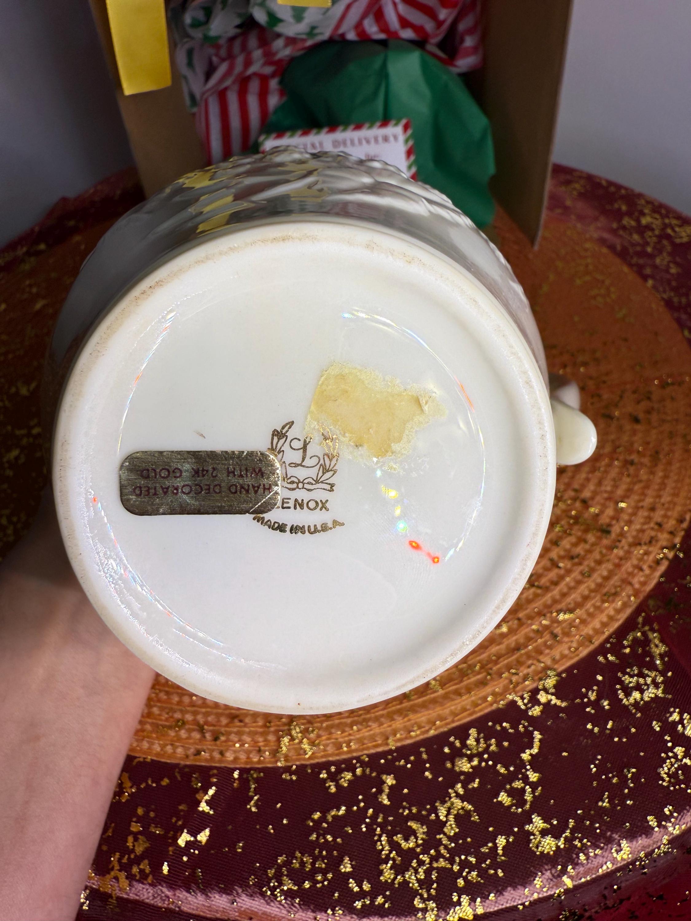 Add timeless elegance to your table with this classic Lenox porcelain pitcher. Standing at 7.5 inches tall, this piece was produced between the 1960s–1980s and showcases Lenox’s signature ivory fine China. The pitcher features a raised floral and fruit motif, with the rim and handle hand-decorated in 24k gold.