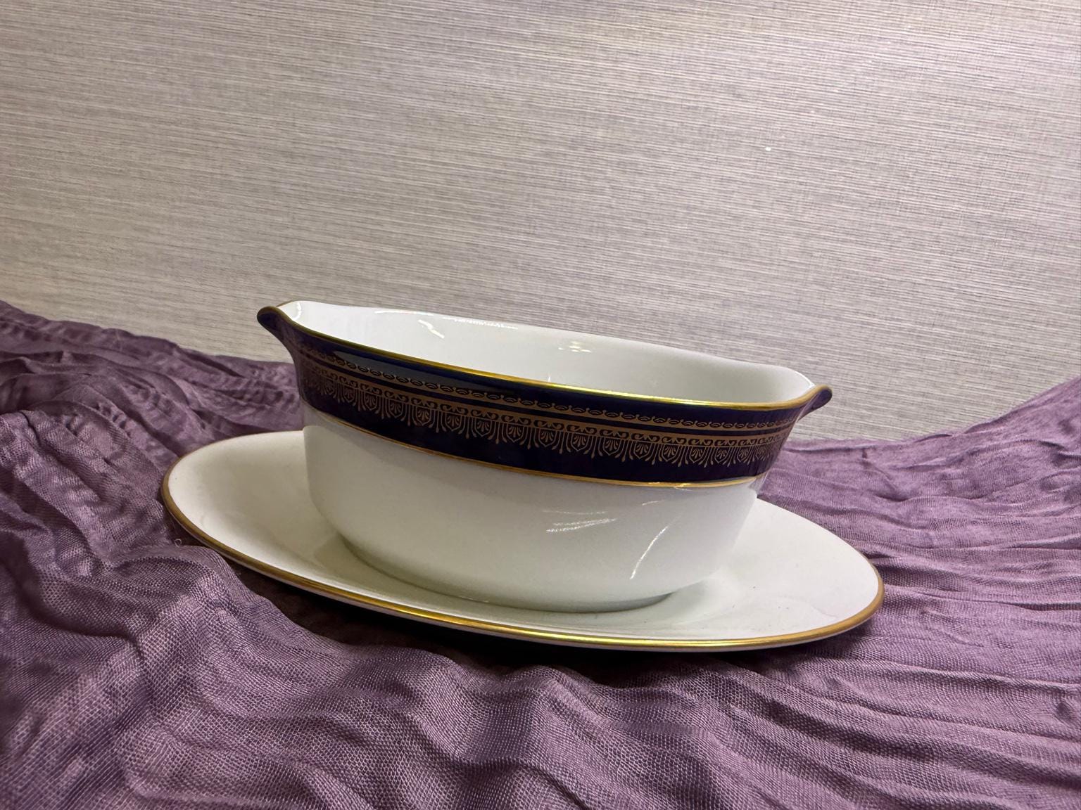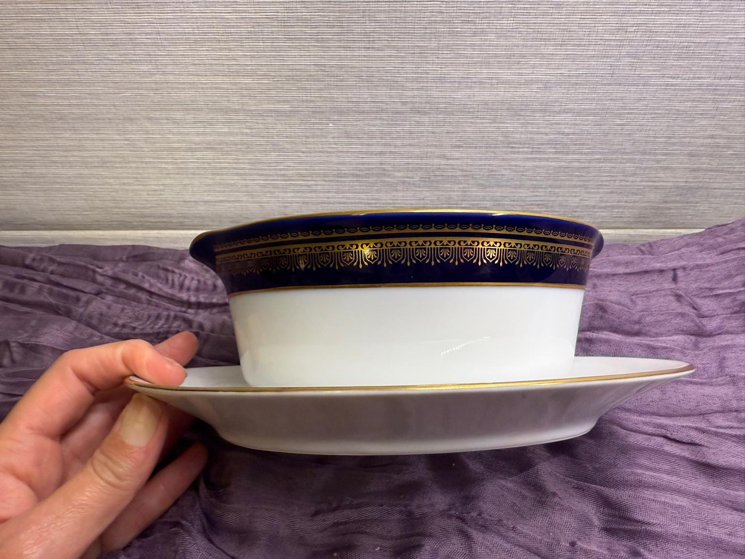 Bring a touch of timeless charm to your table with this beautiful Noritake Legacy Vienna gravy boat with attached underplate. The deep cobalt blue band paired with rich gold accents makes this piece absolutely eye-catching, whether you’re serving a holiday meal or simply setting a special table at home.