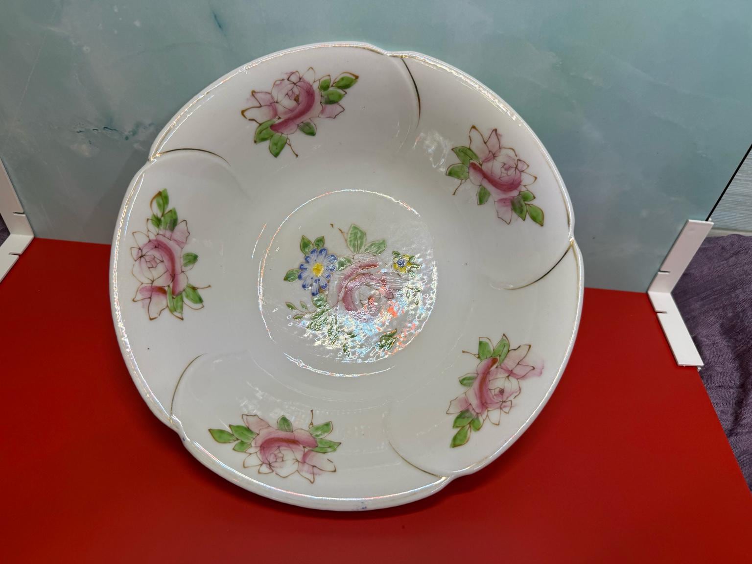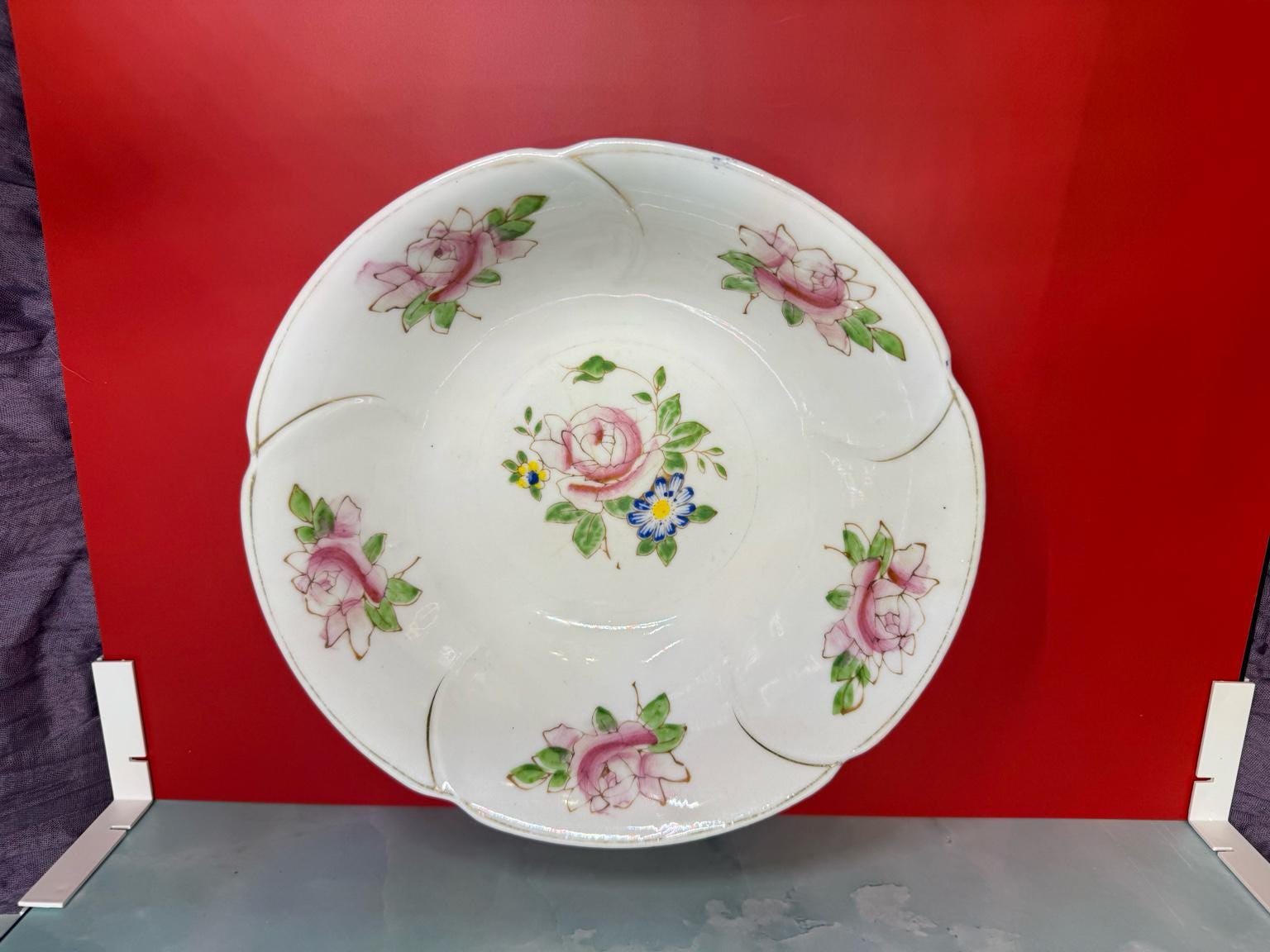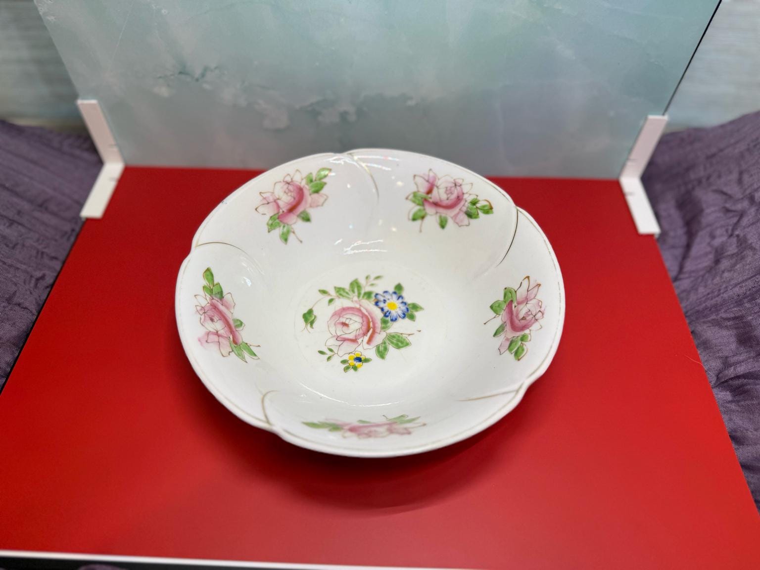 This charming 9-inch porcelain bowl is decorated with hand-painted pink roses and colorful floral details, accented with subtle gold outlining. Marked “Made in Occupied Japan” on the underside, this piece dates from the post-WWII era (1945–1952), making it a collectible example of mid-century Japanese export porcelain.