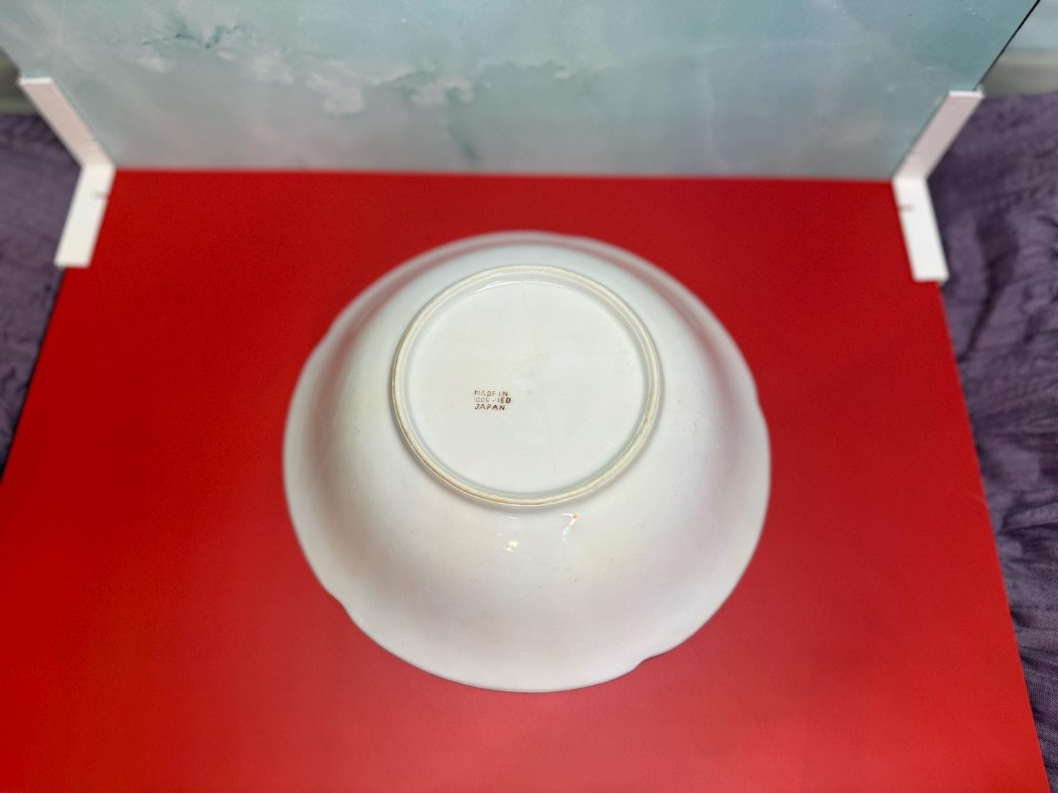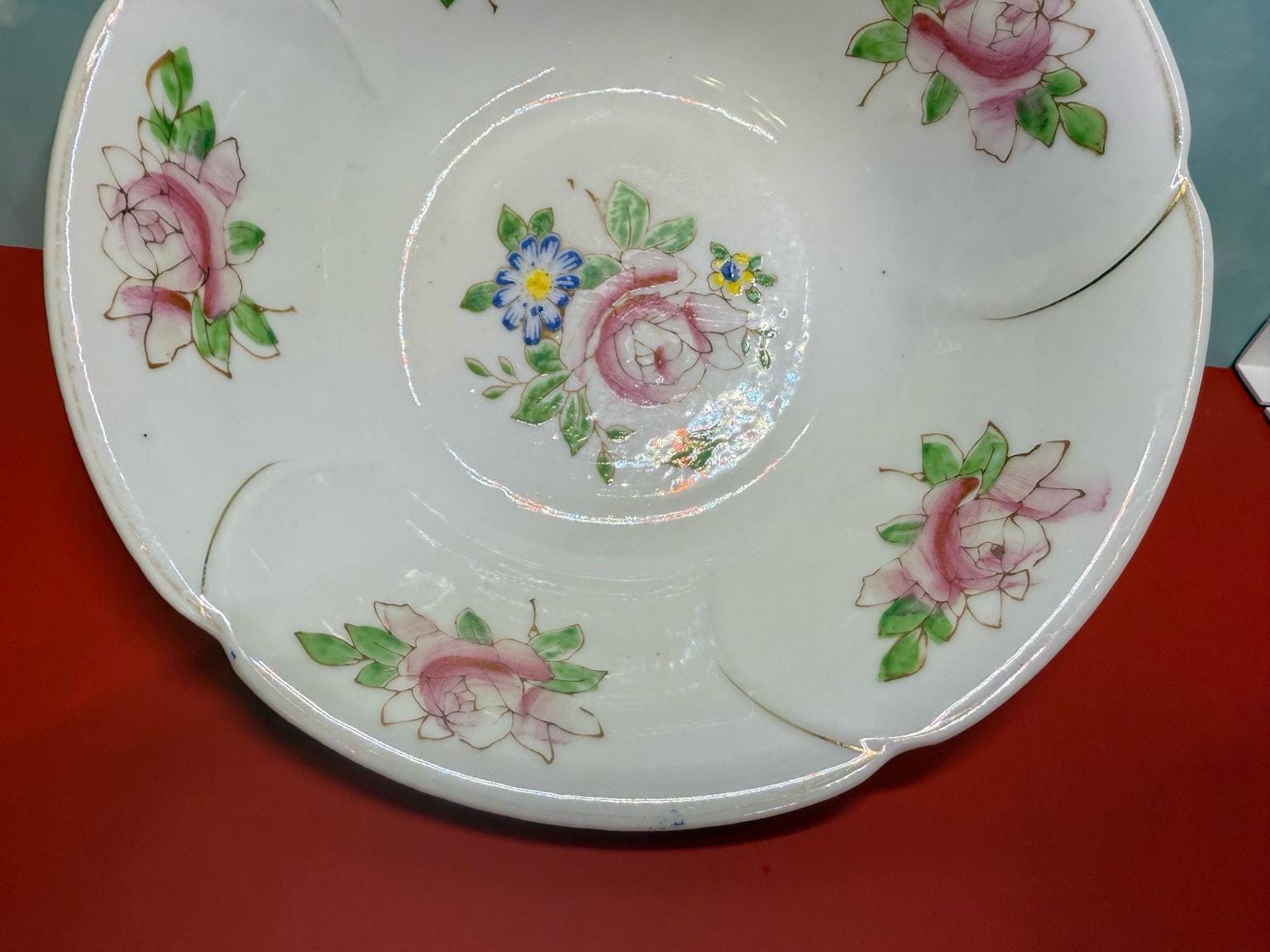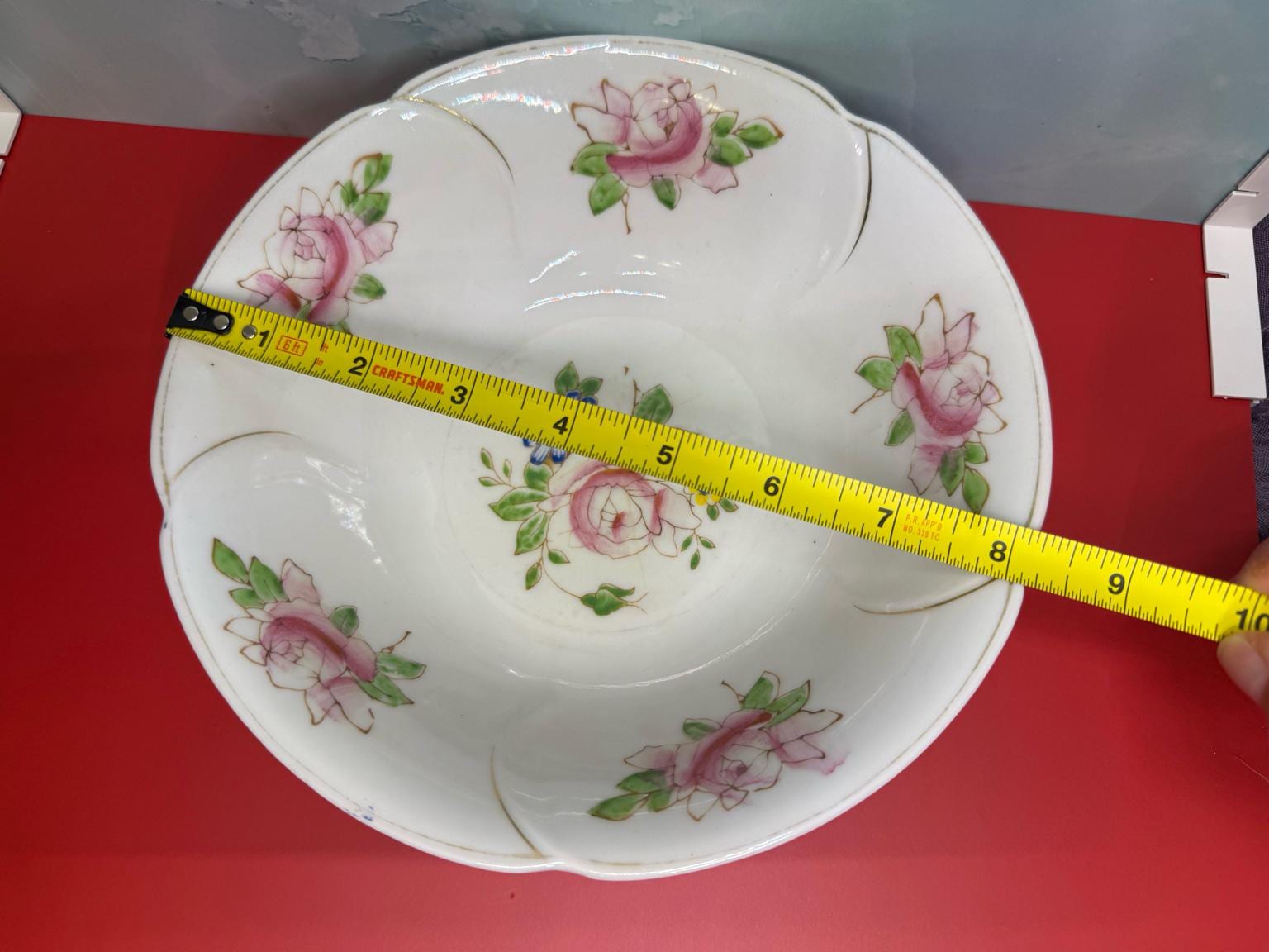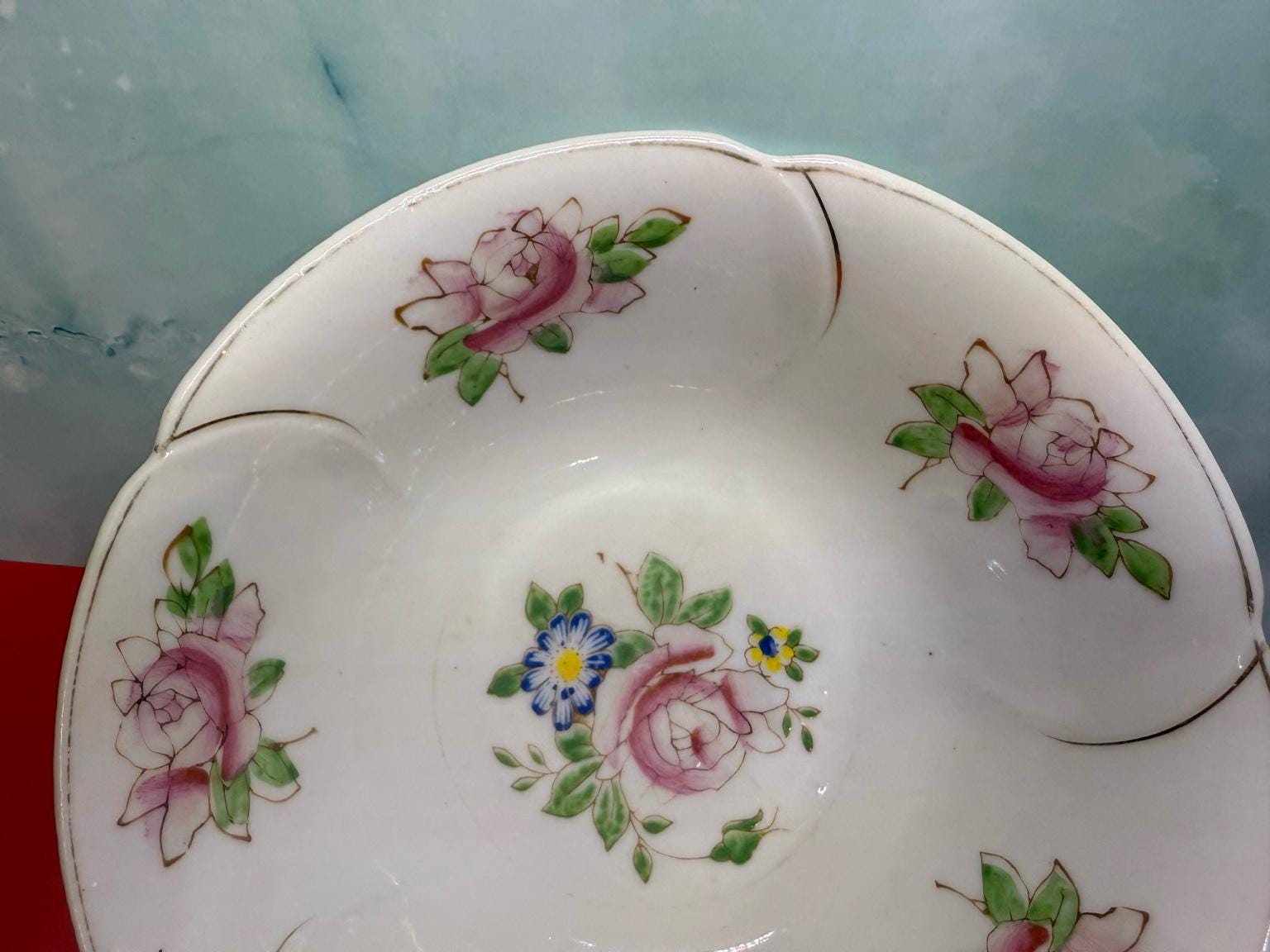 This charming 9-inch porcelain bowl is decorated with hand-painted pink roses and colorful floral details, accented with subtle gold outlining. Marked “Made in Occupied Japan” on the underside, this piece dates from the post-WWII era (1945–1952), making it a collectible example of mid-century Japanese export porcelain.