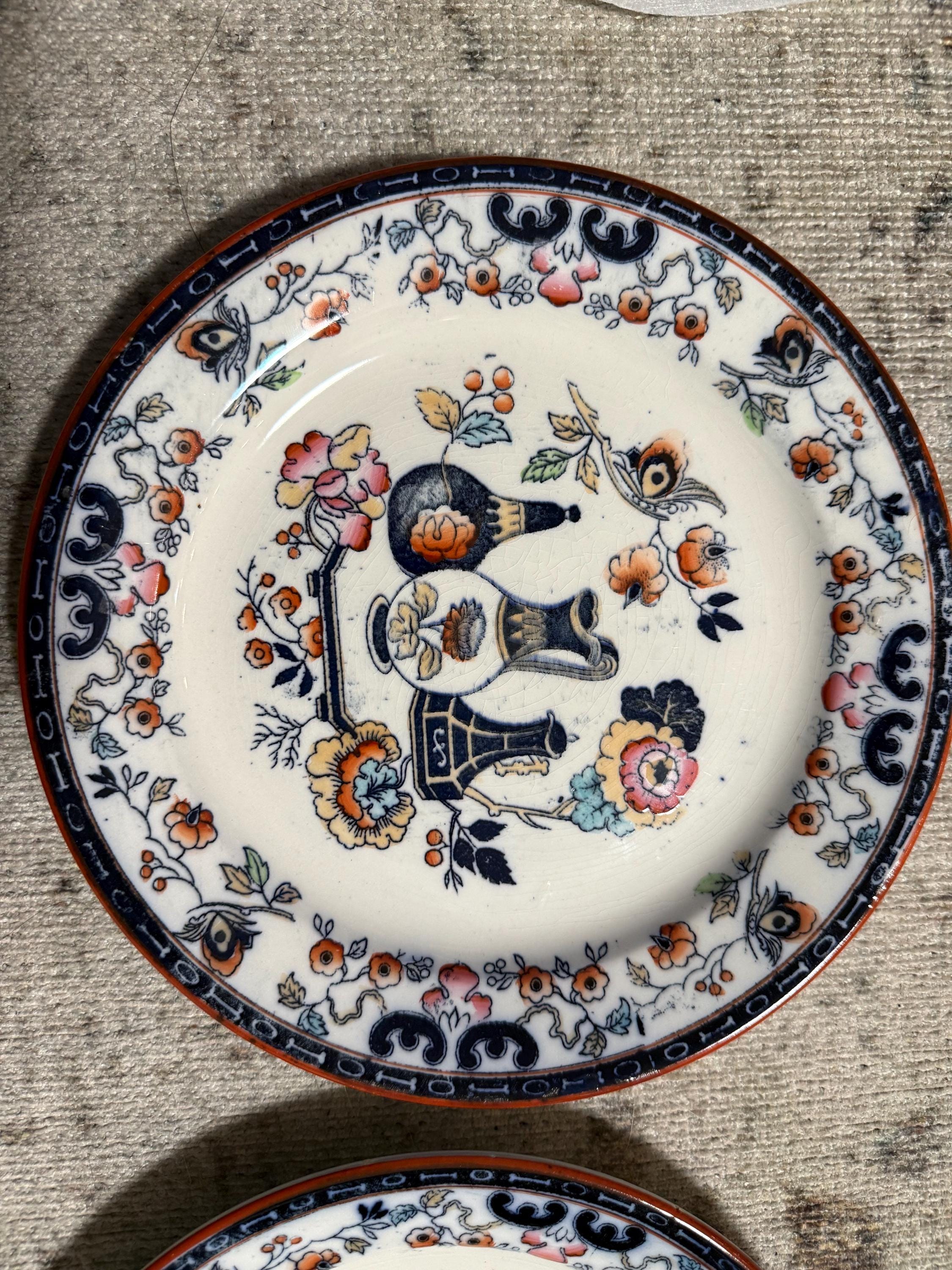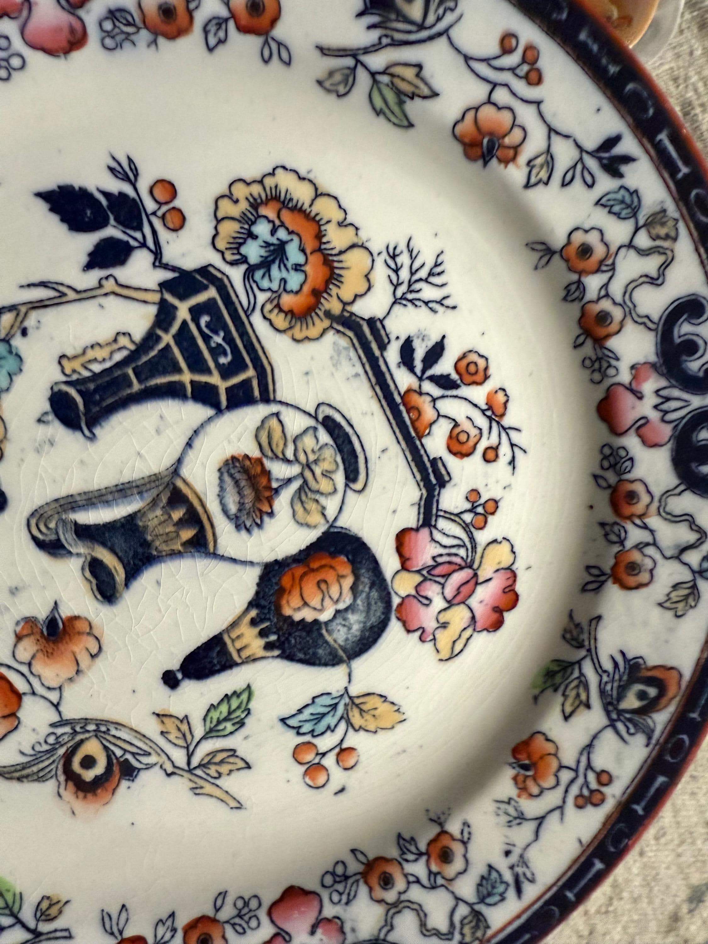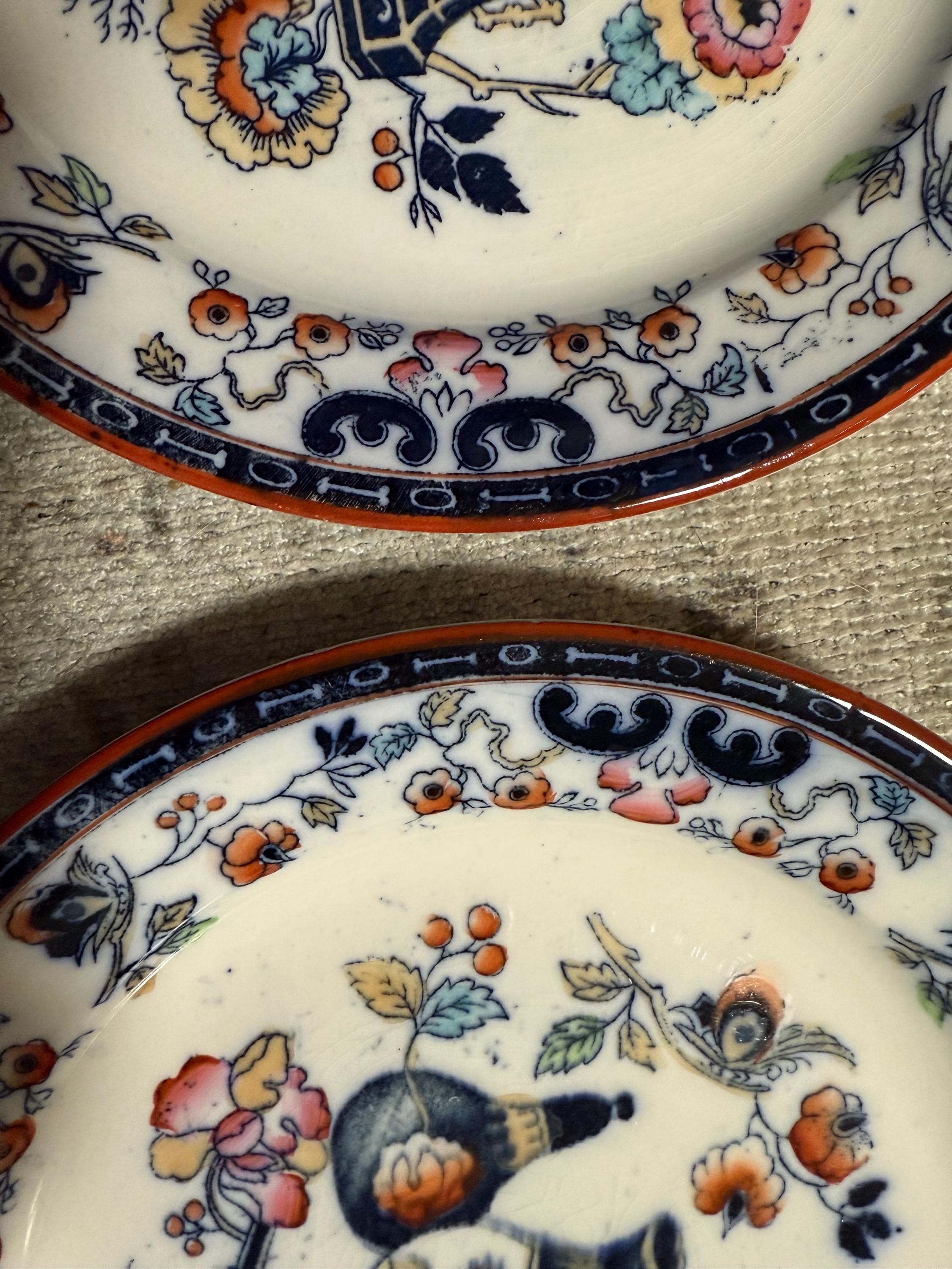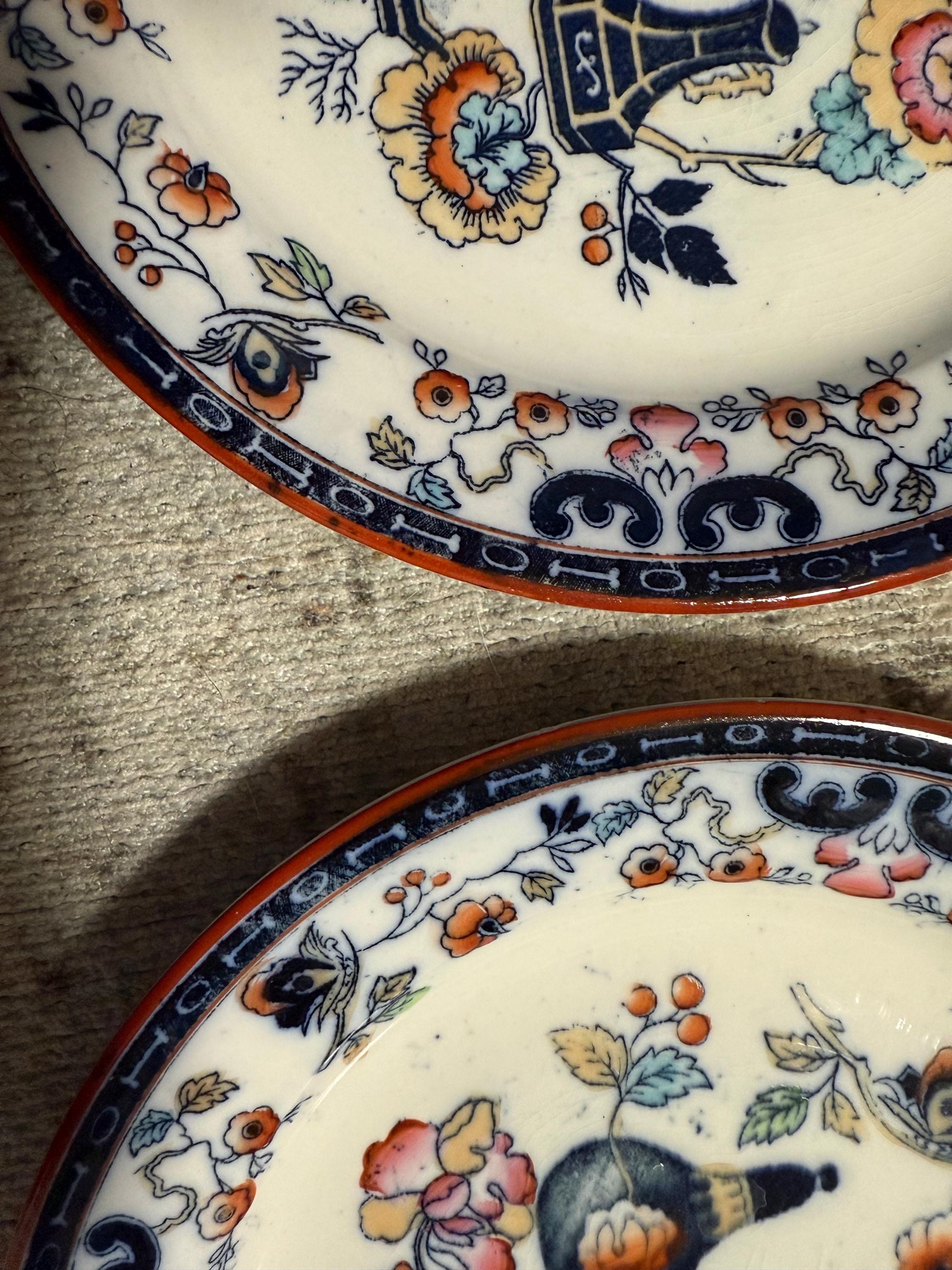A stunning antique set of two Maastricht “Pompeia” dinner plates made in Holland by Petrus Regout around the early 1900s. Each plate features a vibrant hand-painted floral Imari-style design over a classic Dutch transferware pattern, with delicate touches of cobalt blue, burnt orange, soft yellow, and black. The edges are finished in a warm reddish-brown trim, and the plates display charming age-related crazing and patina, typical of authentic pieces from this period.