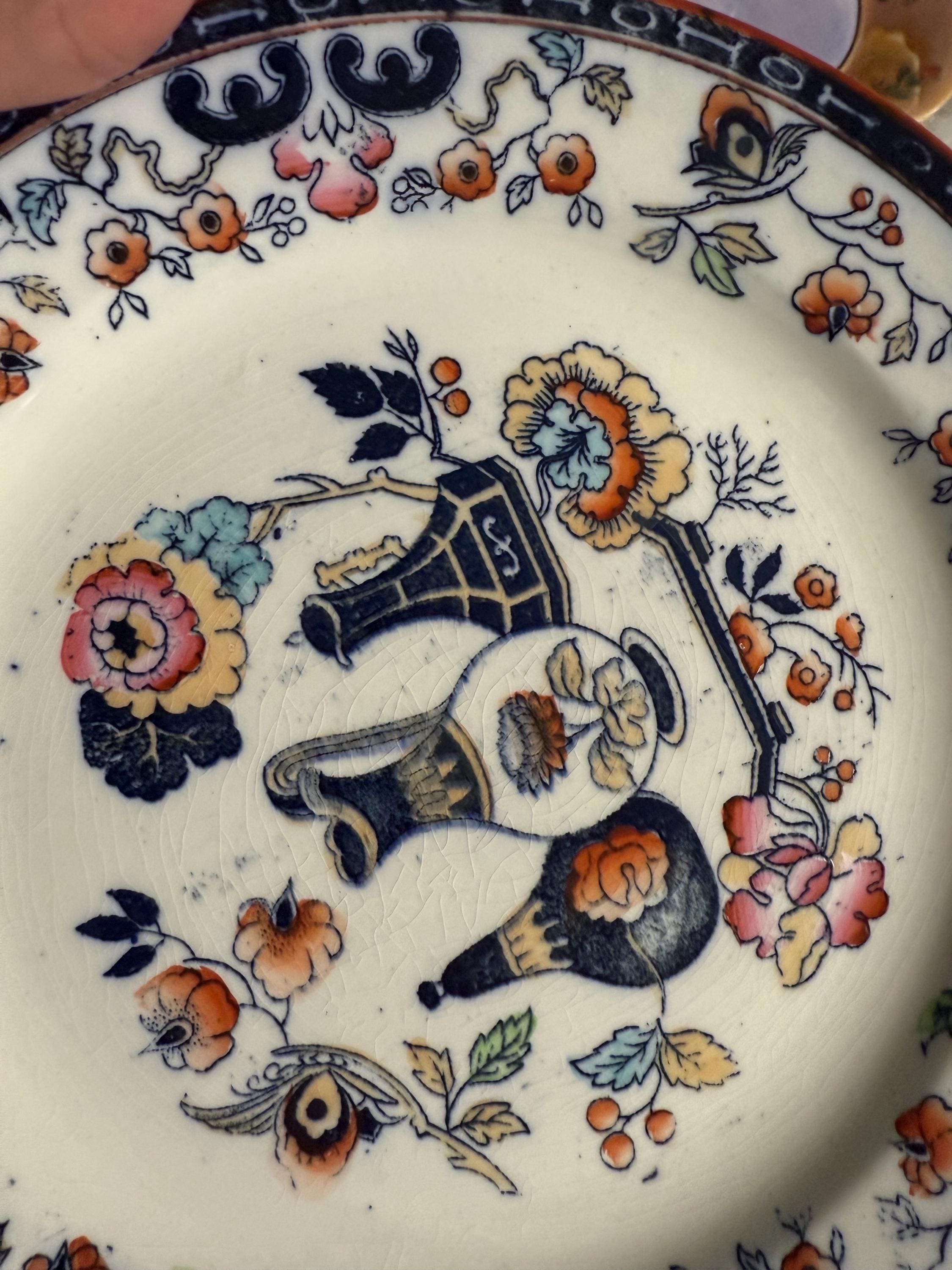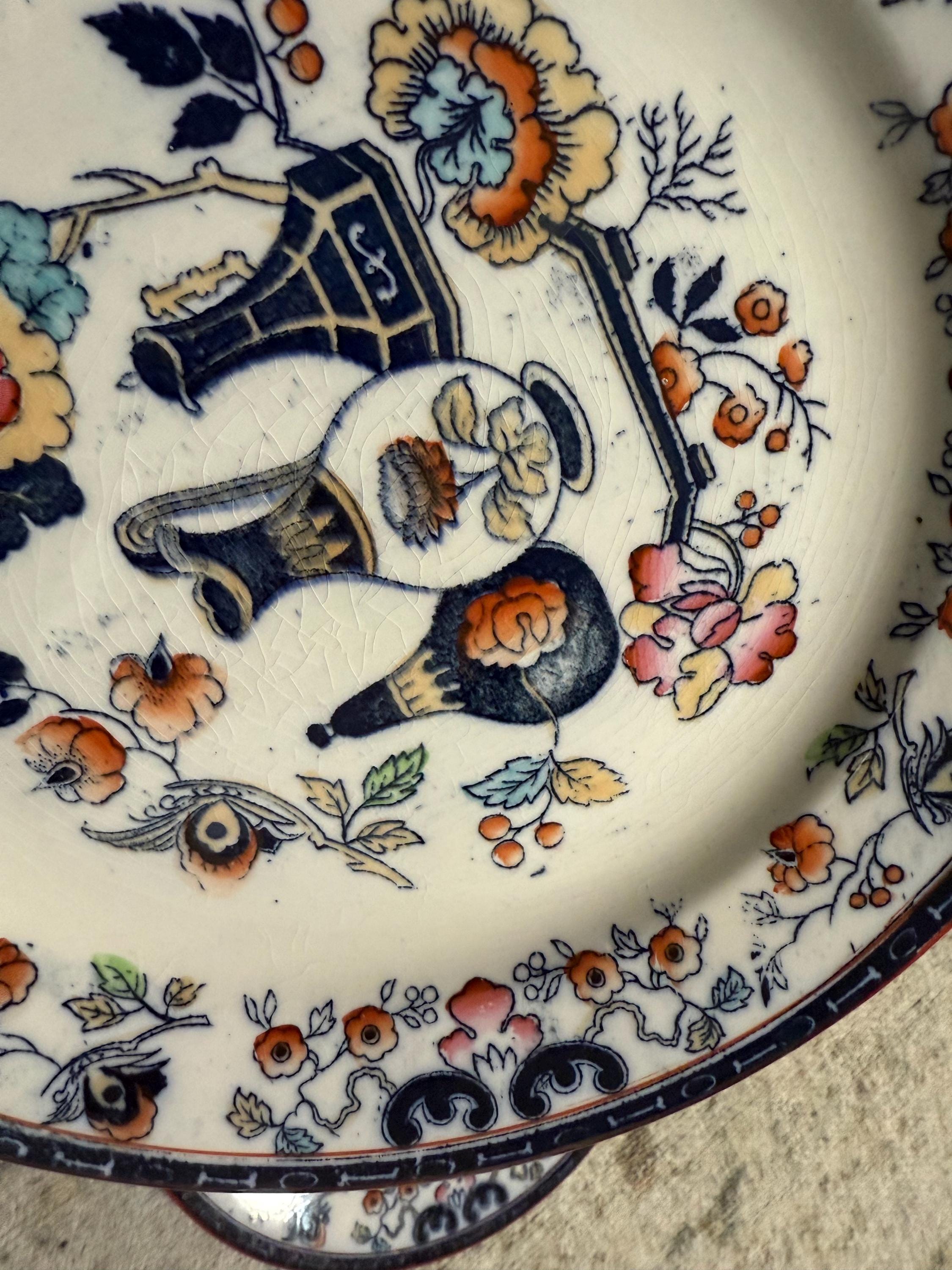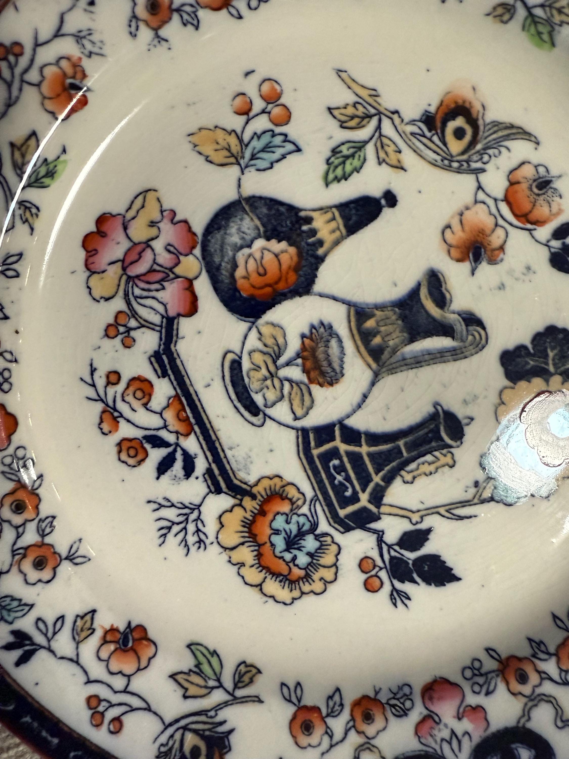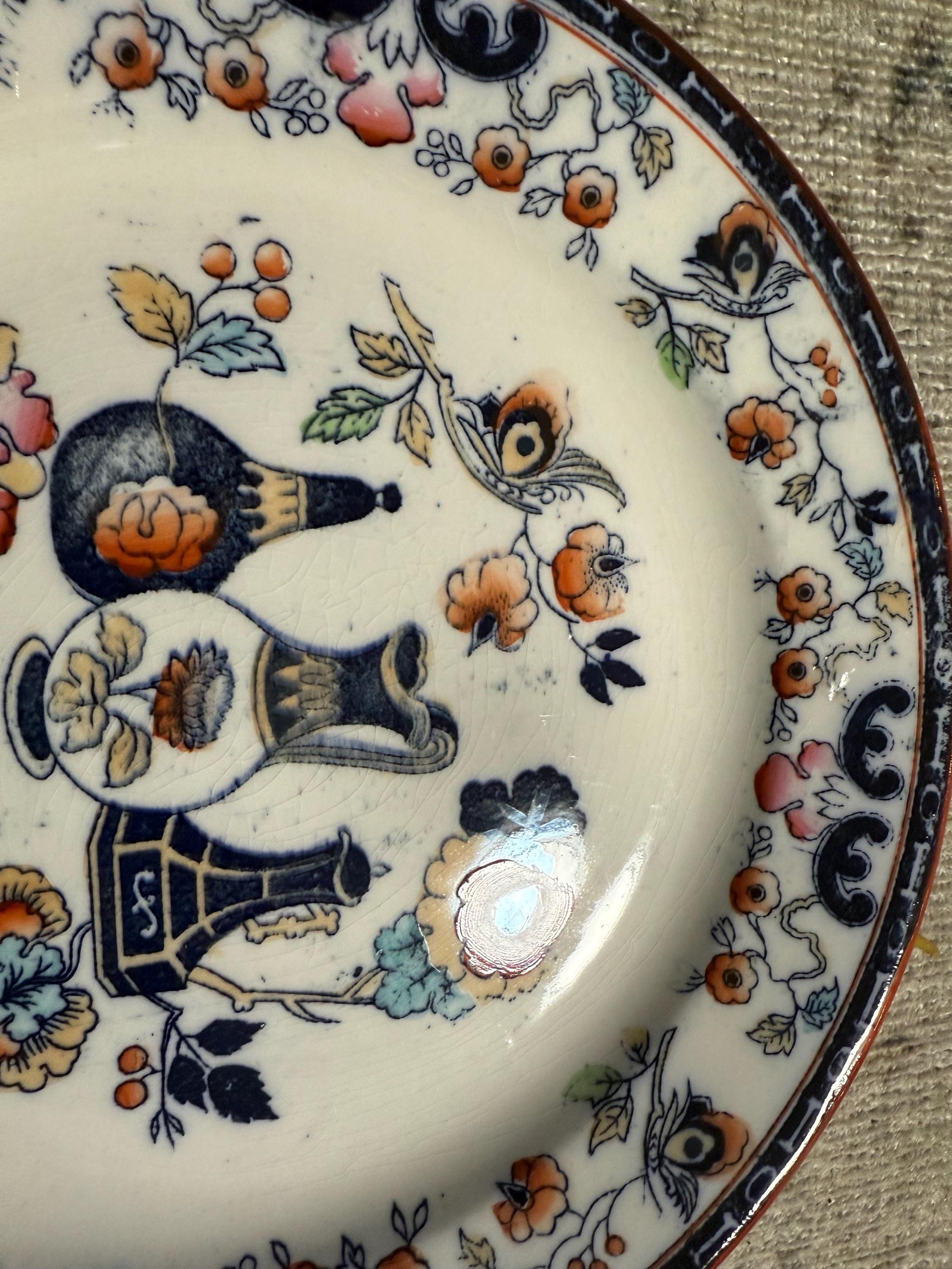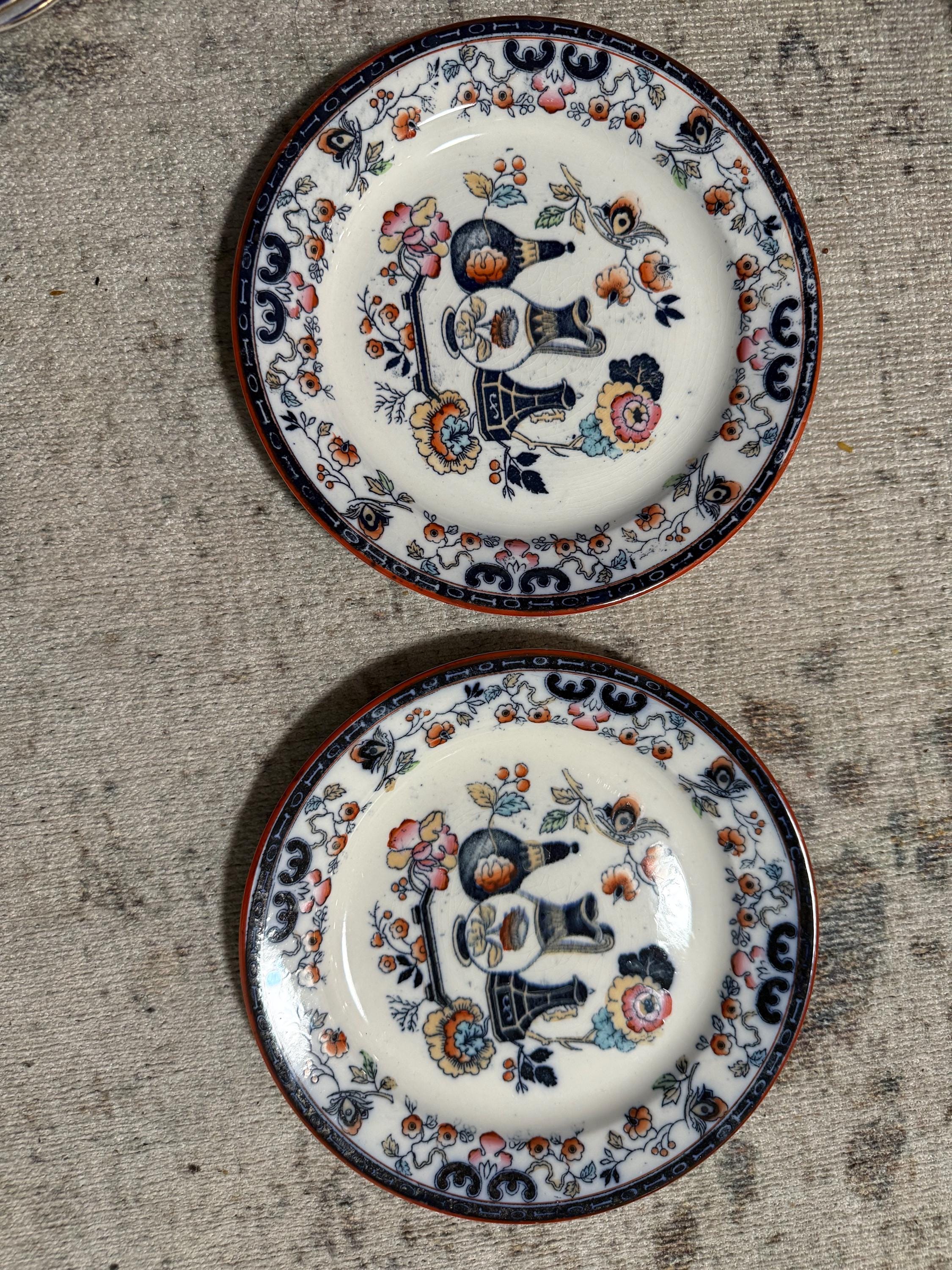 A stunning antique set of two Maastricht “Pompeia” dinner plates made in Holland by Petrus Regout around the early 1900s. Each plate features a vibrant hand-painted floral Imari-style design over a classic Dutch transferware pattern, with delicate touches of cobalt blue, burnt orange, soft yellow, and black. The edges are finished in a warm reddish-brown trim, and the plates display charming age-related crazing and patina, typical of authentic pieces from this period.