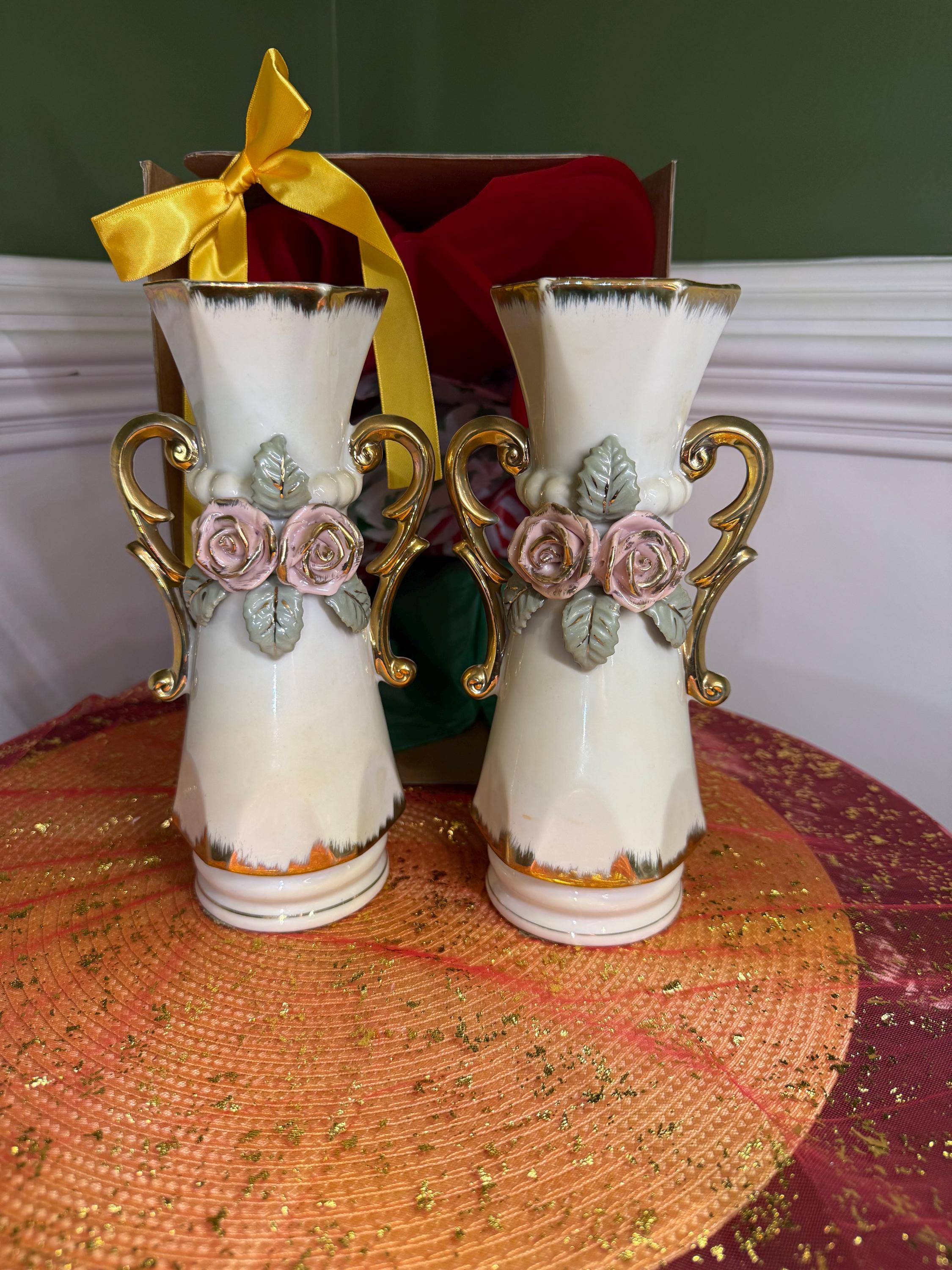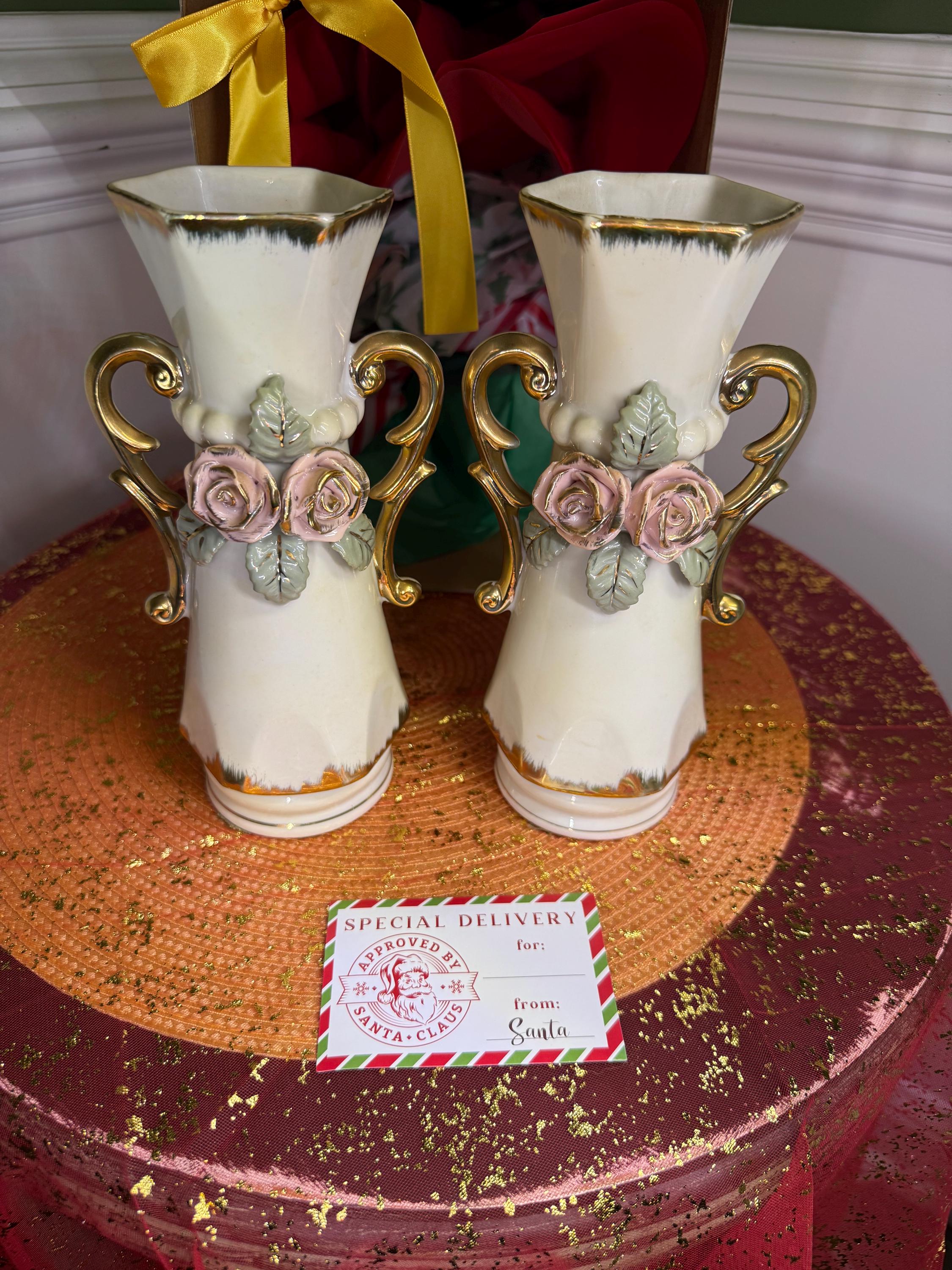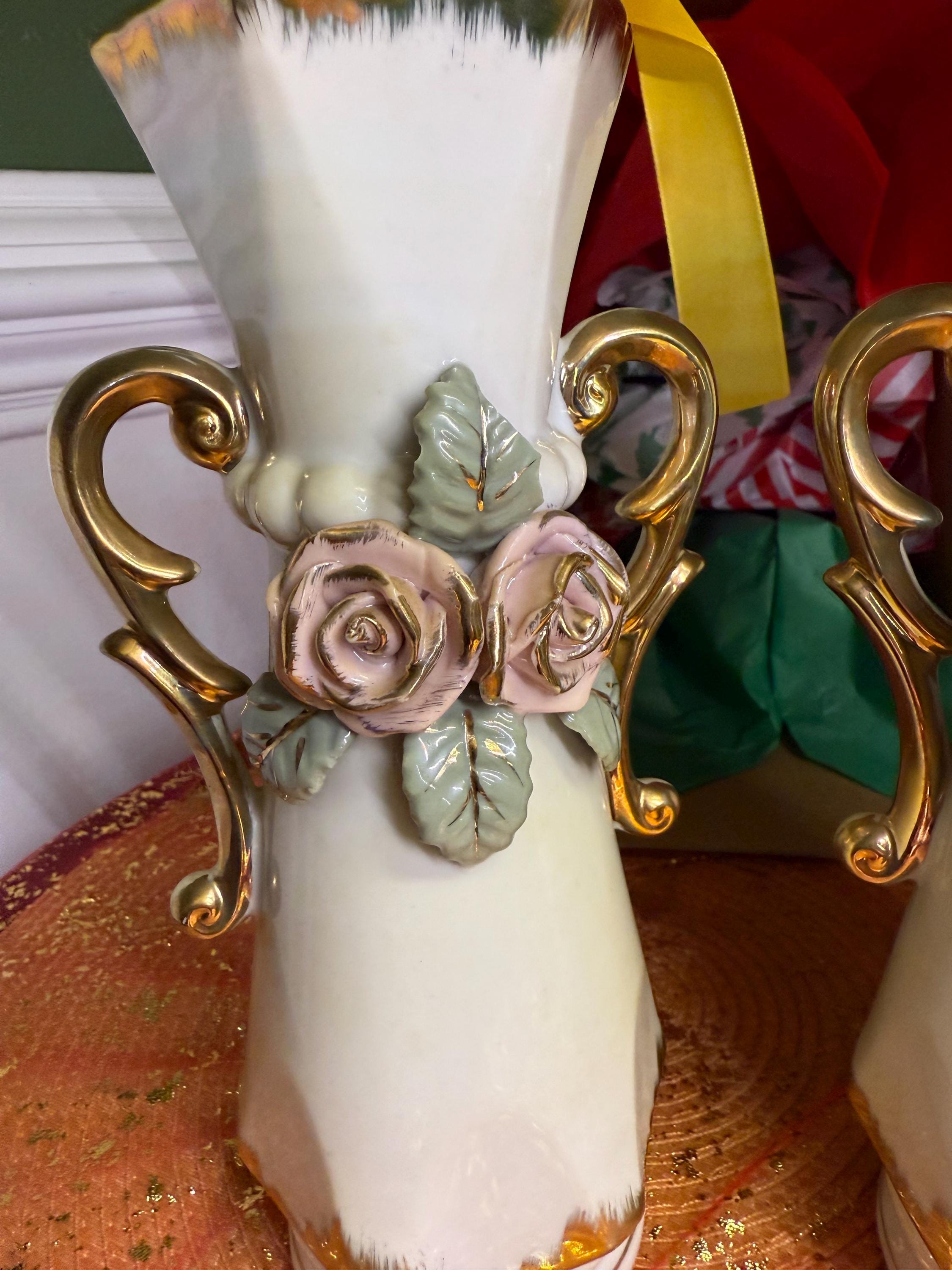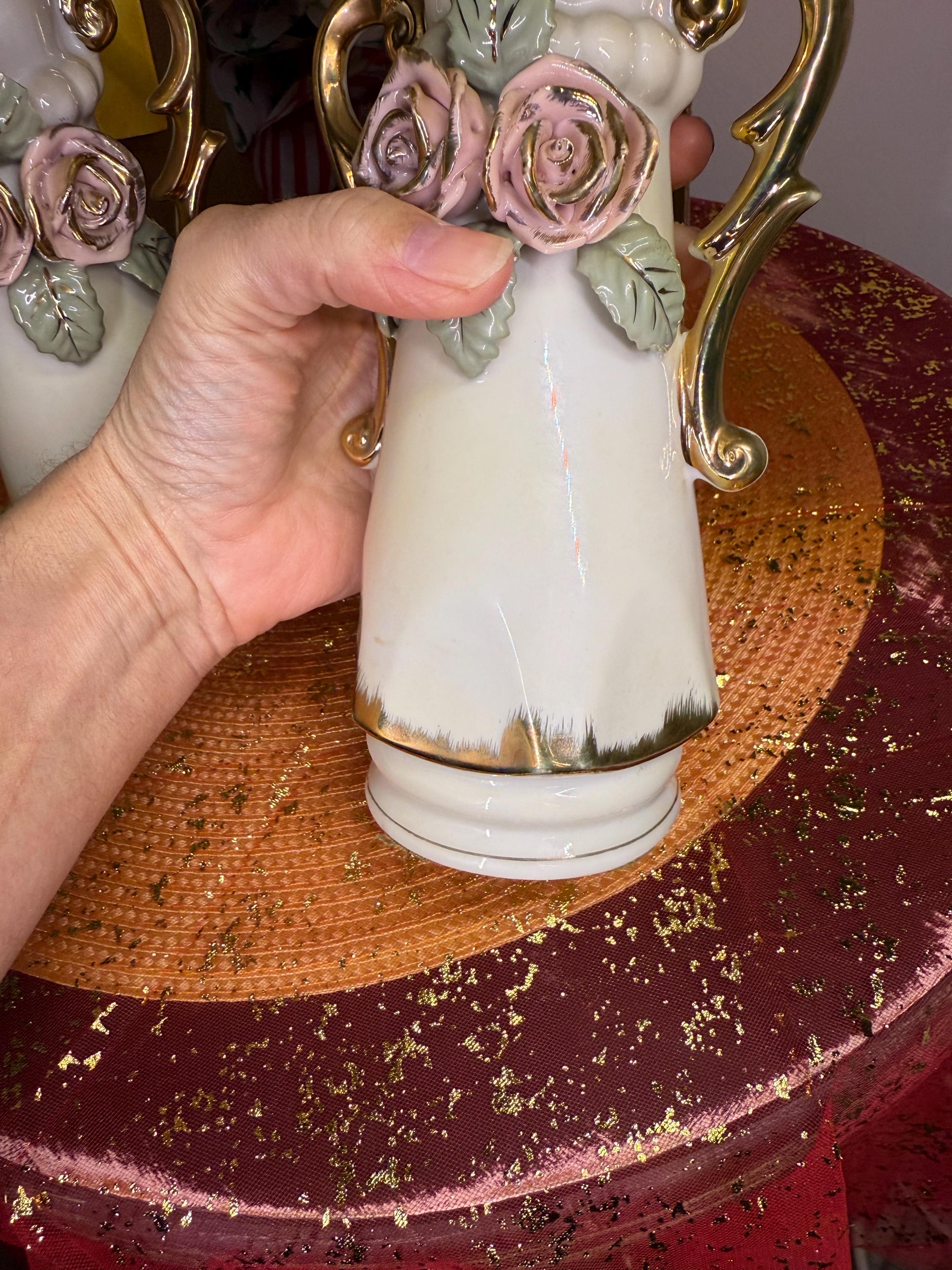 Looking to add a little romance (and a lot of style) to your space? These vintage porcelain vases are giving all the shabby chic vibes! With their hand-applied pink roses, leafy details, and swoon-worthy gold scroll handles, they’re ready to bring cottagecore charm or Victorian elegance straight to your shelf.