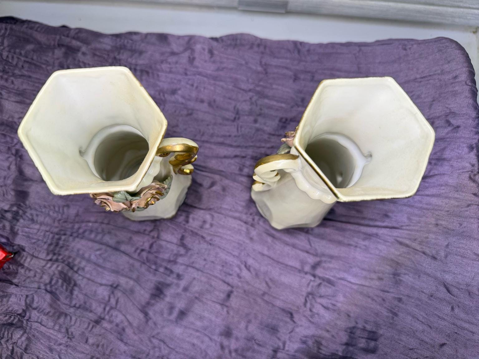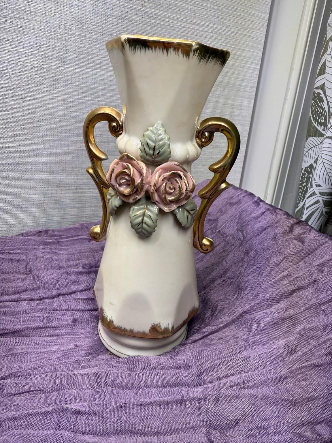 Material: Porcelain with applied roses, hand-painted details, and gold gilt trim