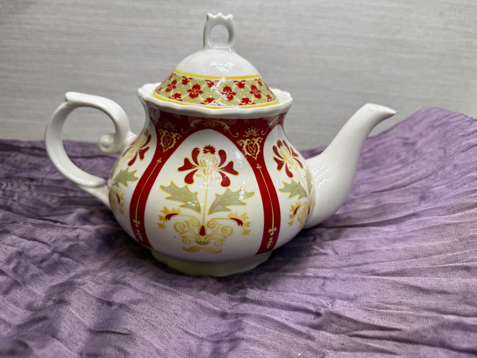 Red & Gold Regal – A striking red and gold patterned teapot accented with floral details, elegant for holidays or formal gatherings.