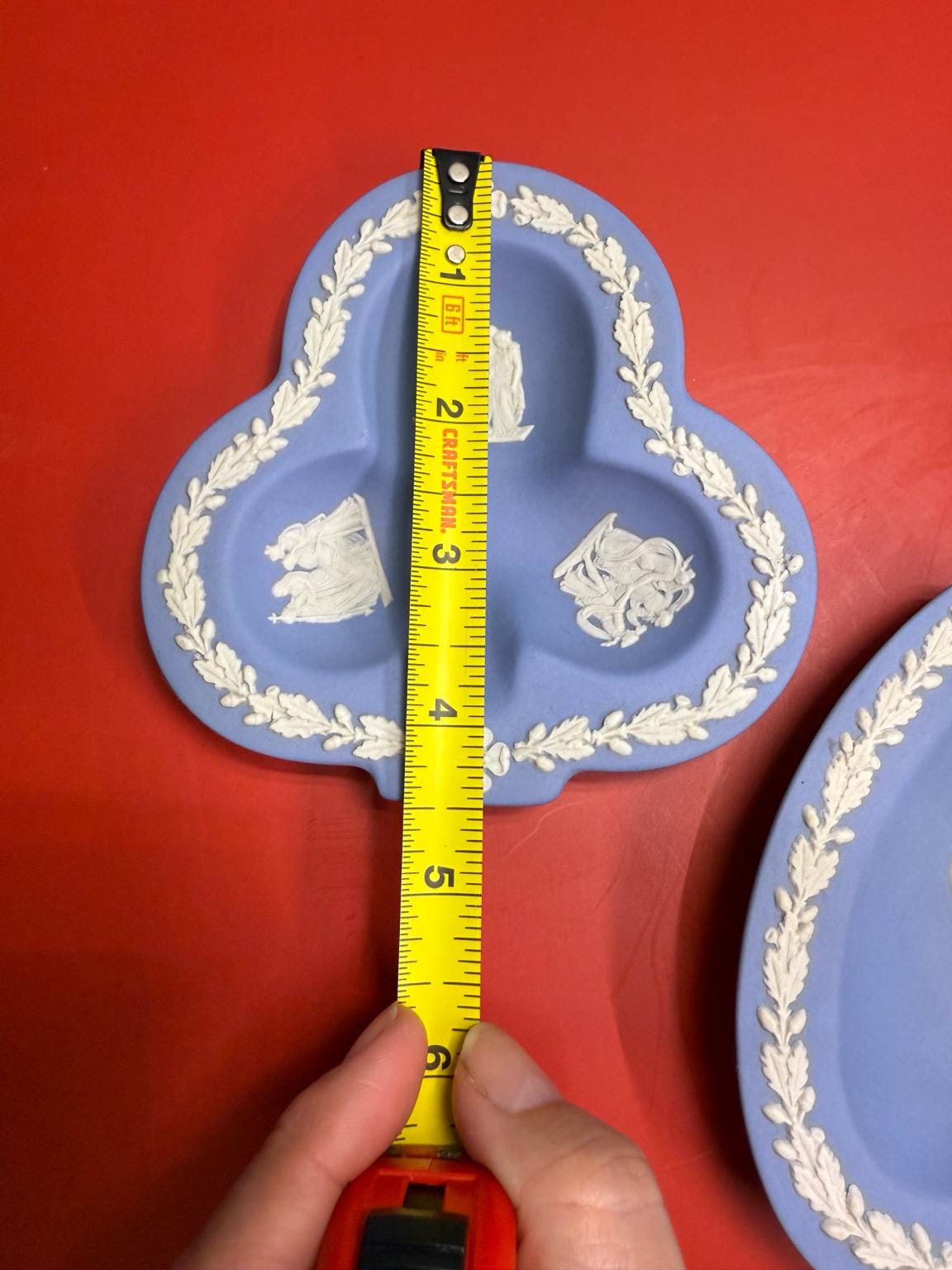 Clover Dish (1955) – approx. 5.5” wide, three neoclassical scenes with laurel border. Dated by impressed letter S = 1955.
