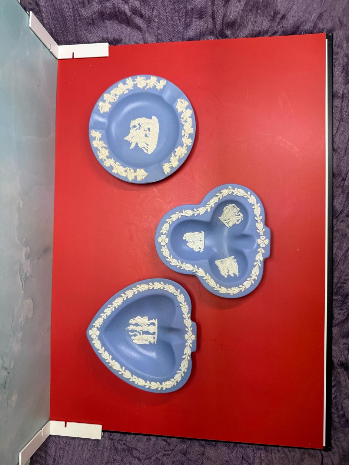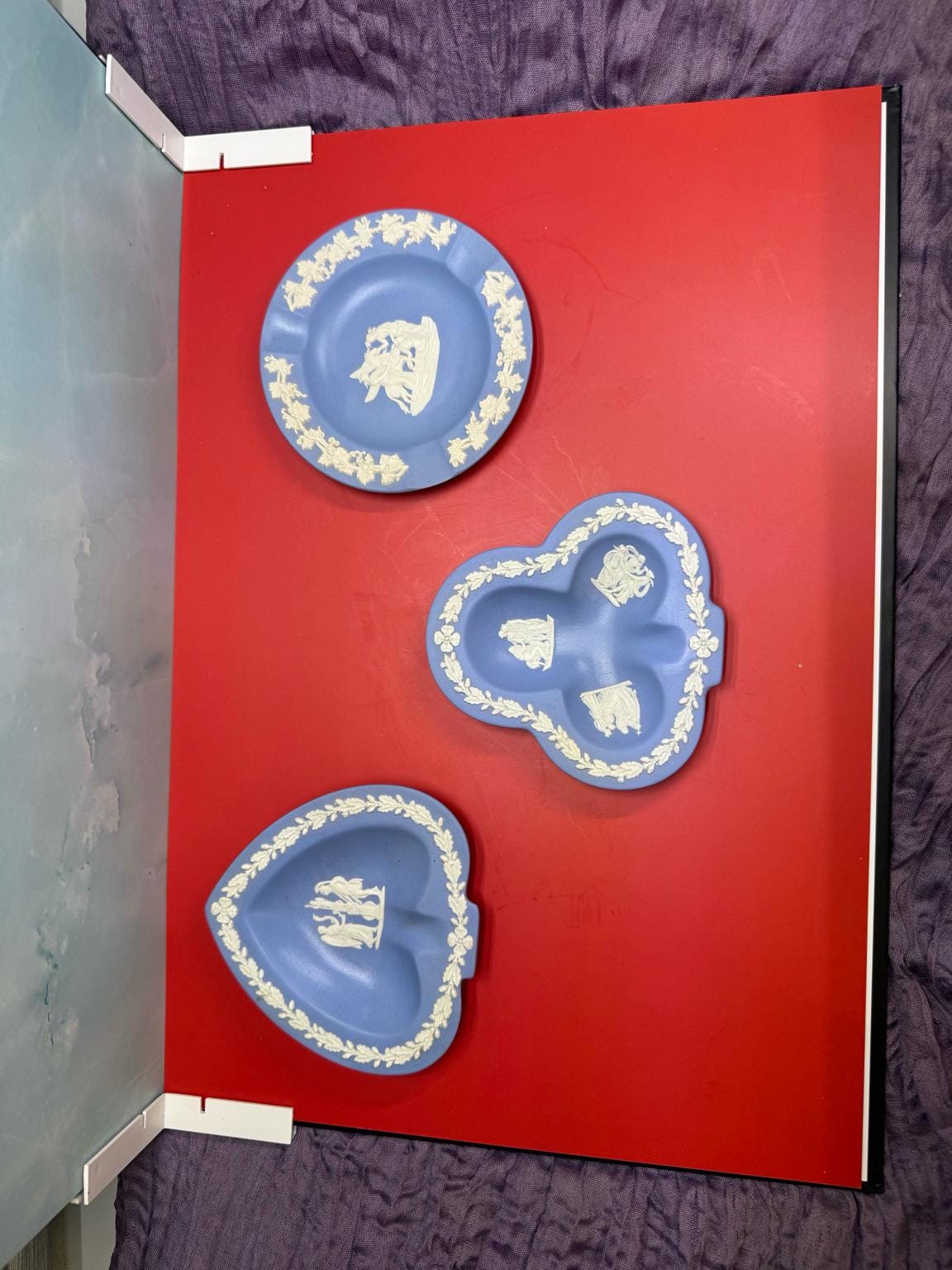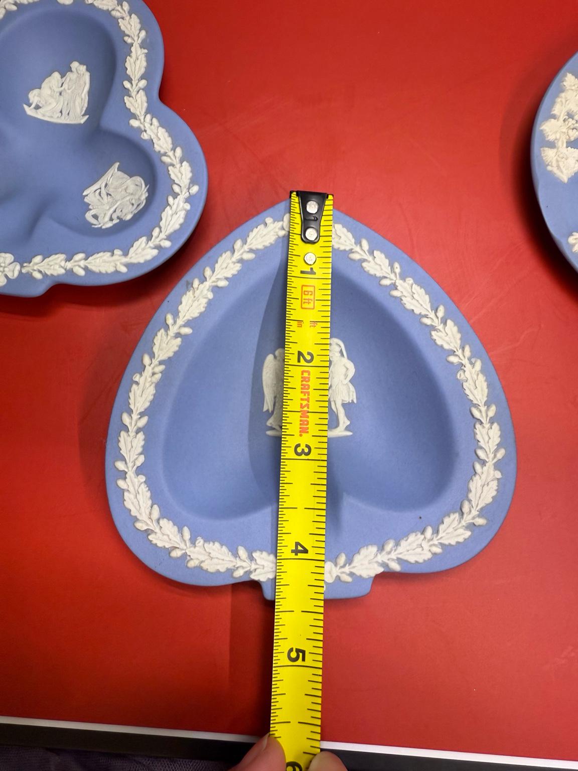 authentic vintage Wedgwood Jasperware trinket dishes, crafted in the iconic pale blue with white neoclassical reliefs. Each dish is marked “Wedgwood – Made in England” and dated to the mid-20th century, making them both collectible and charmingly functional.