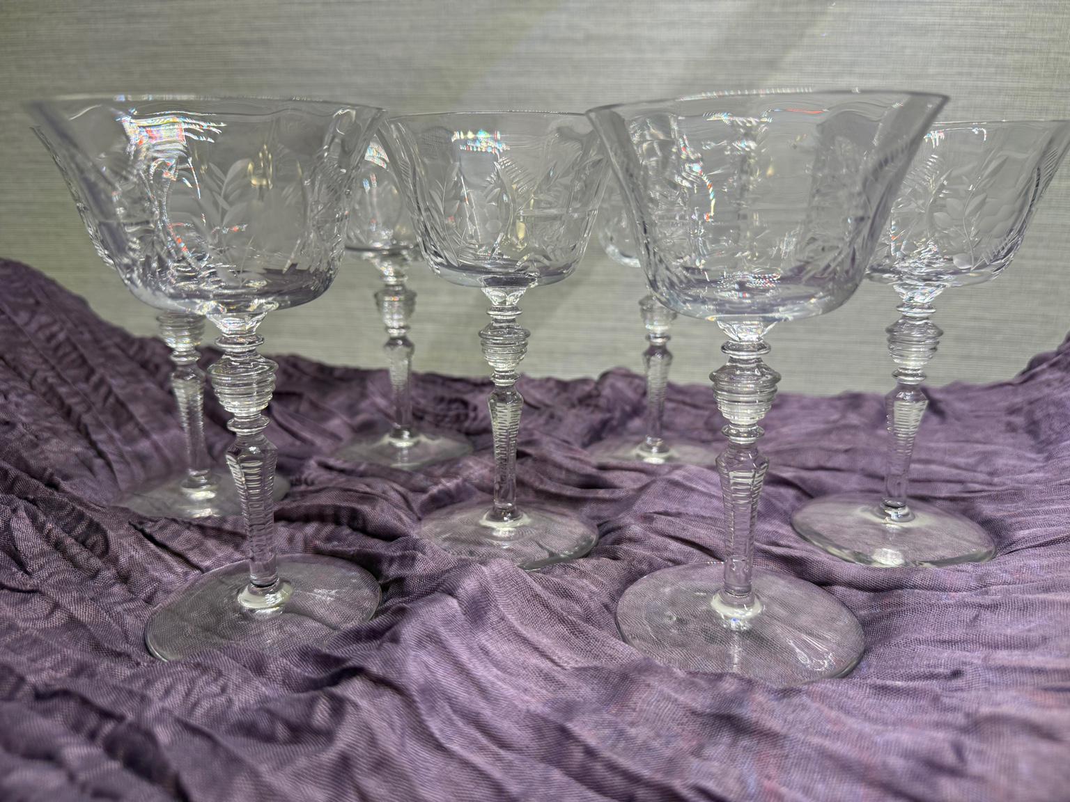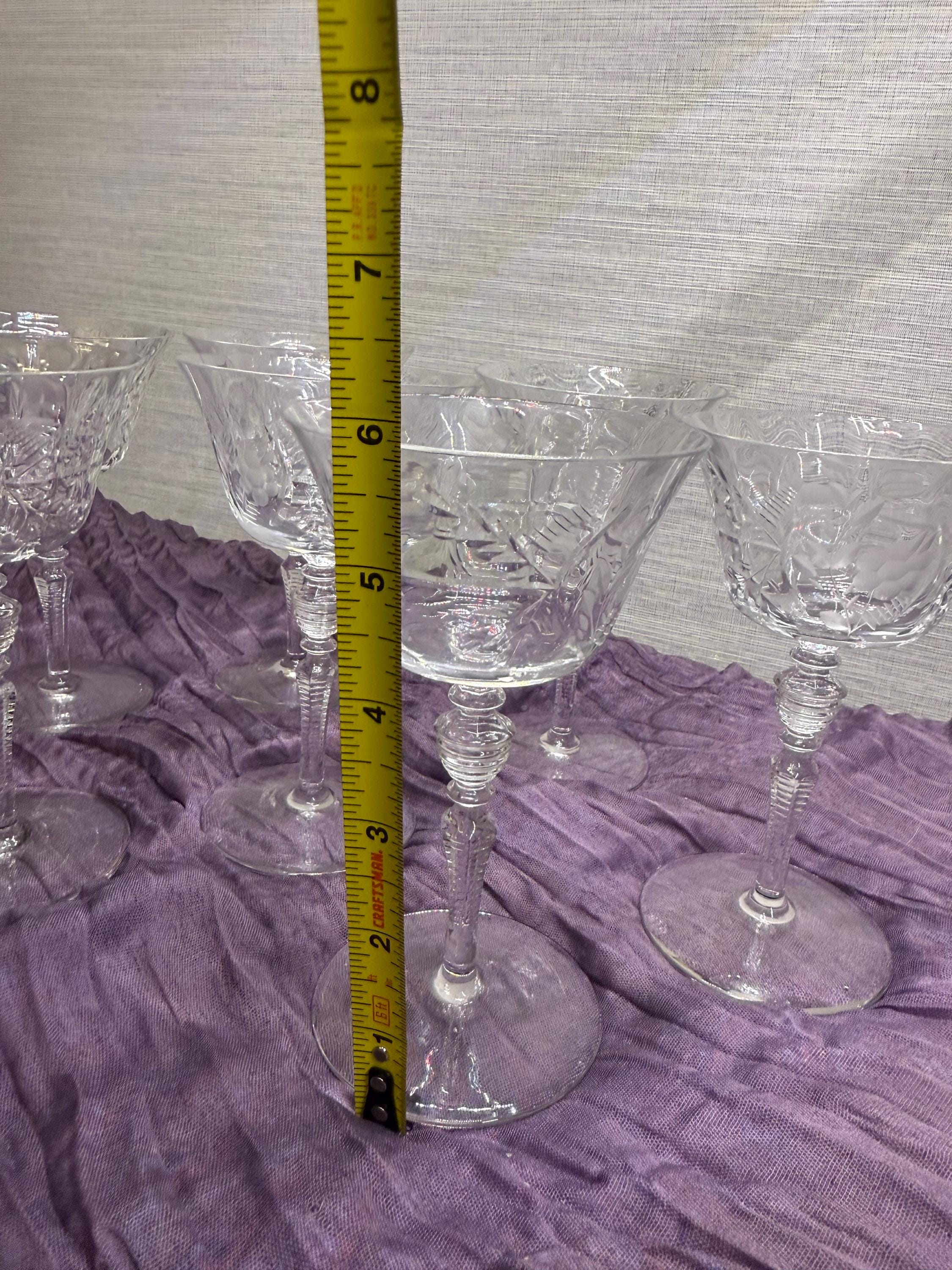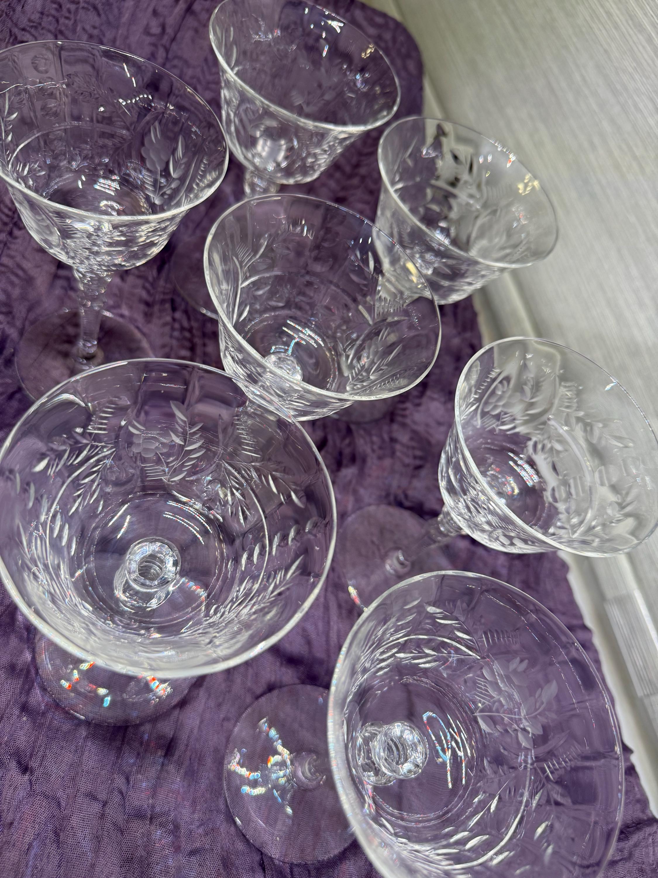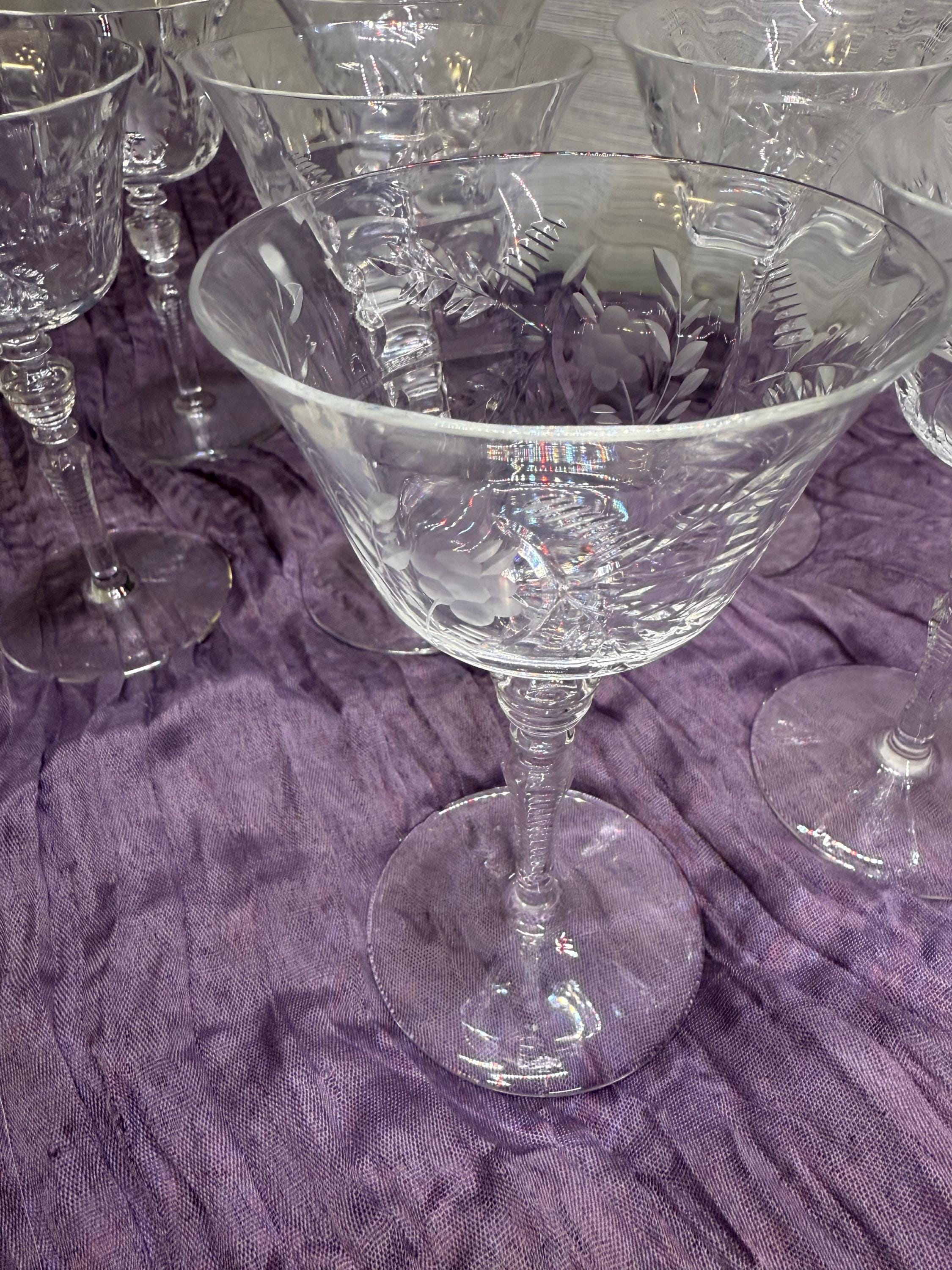 Add a touch of gorgeous sophistication to your celebrations with these beautiful Tiffany & Co. crystal champagne coupes. Crafted in the mid-century era (1960s–1980s), each glass shimmers with stunning etched grapevine and leaf details, complemented by an elegantly faceted stem that feels luxurious in hand.
