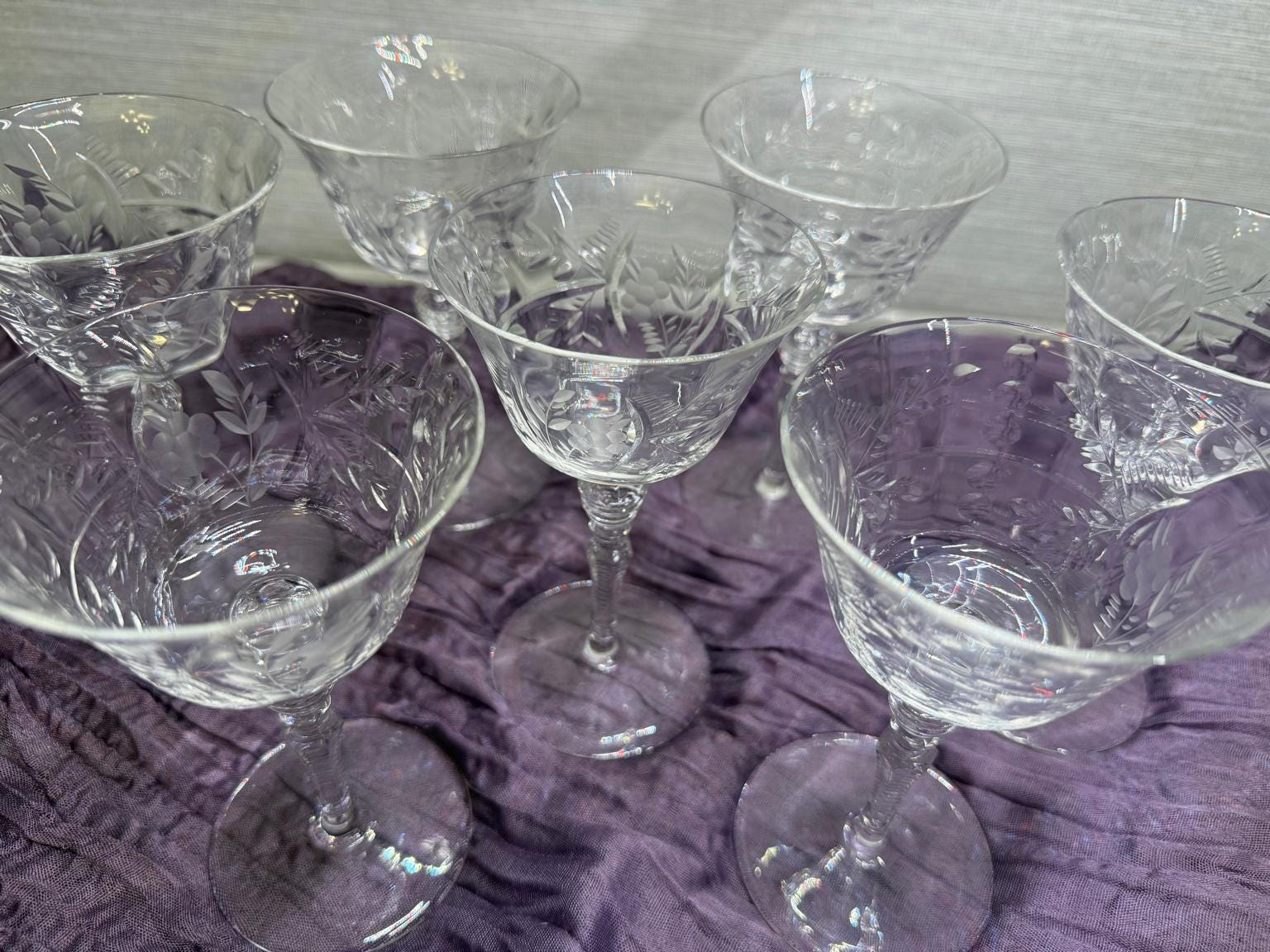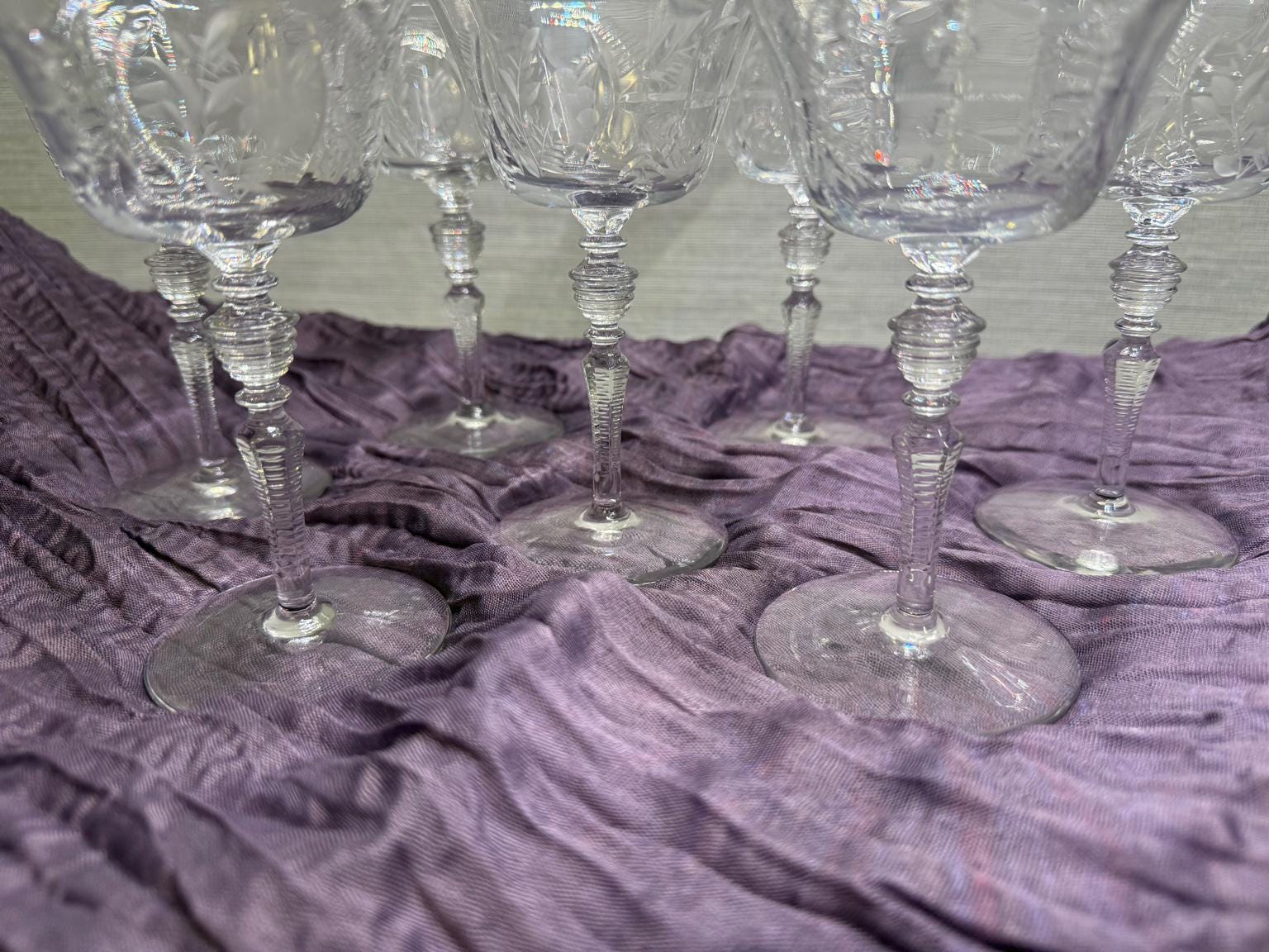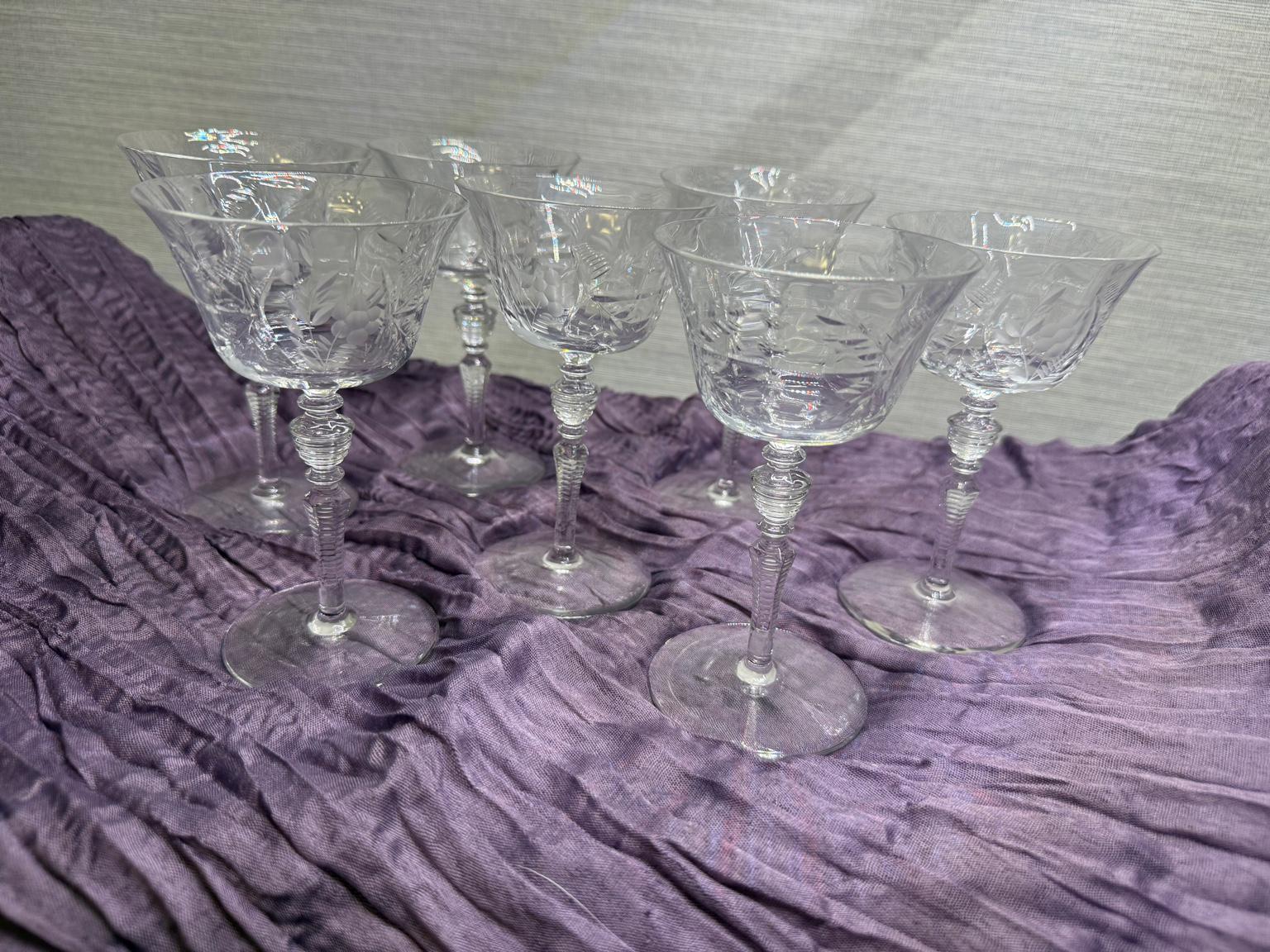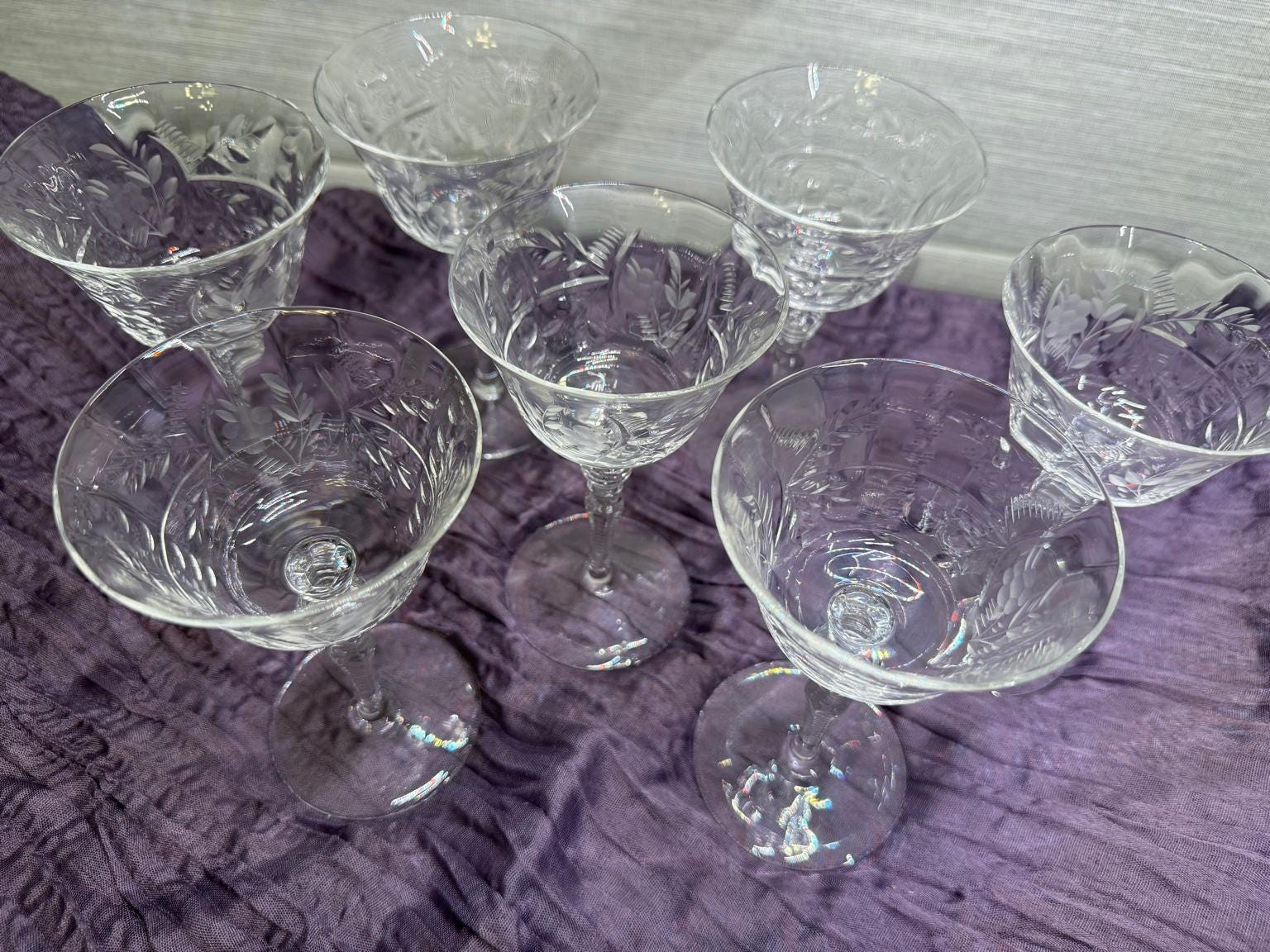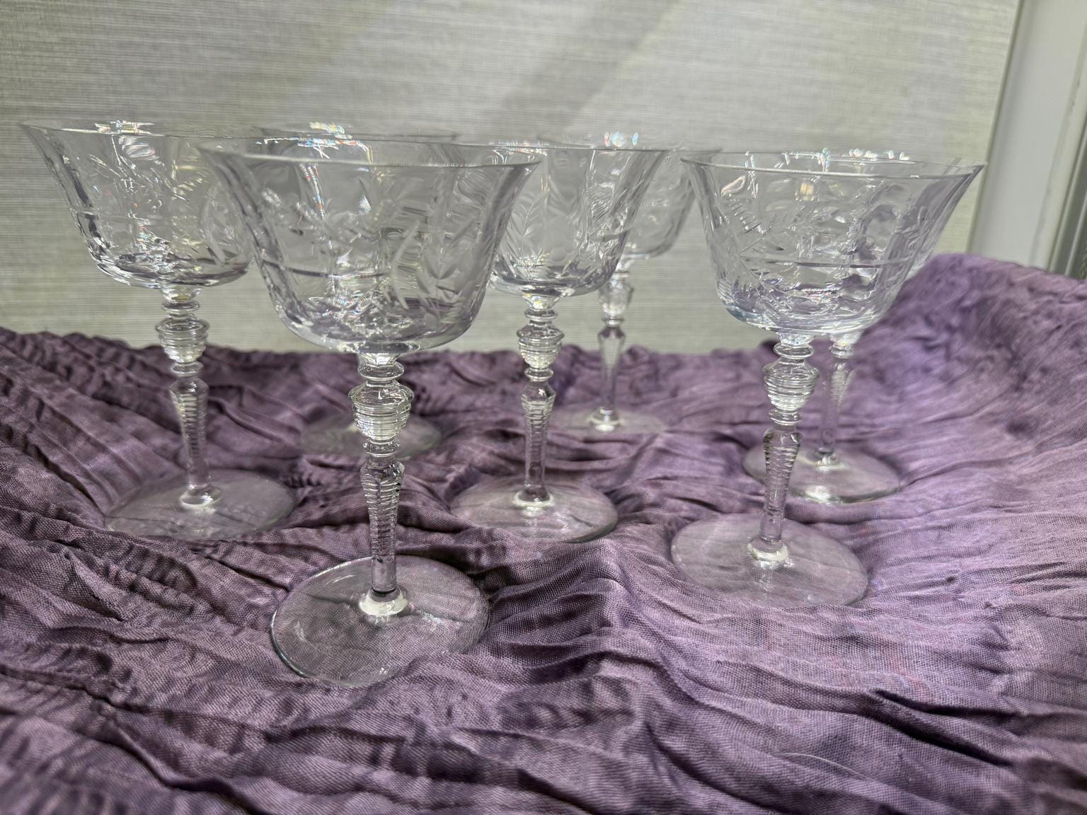 Add a touch of gorgeous sophistication to your celebrations with these beautiful Tiffany & Co. crystal champagne coupes. Crafted in the mid-century era (1960s–1980s), each glass shimmers with stunning etched grapevine and leaf details, complemented by an elegantly faceted stem that feels luxurious in hand.