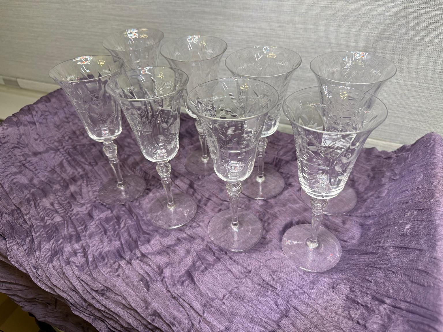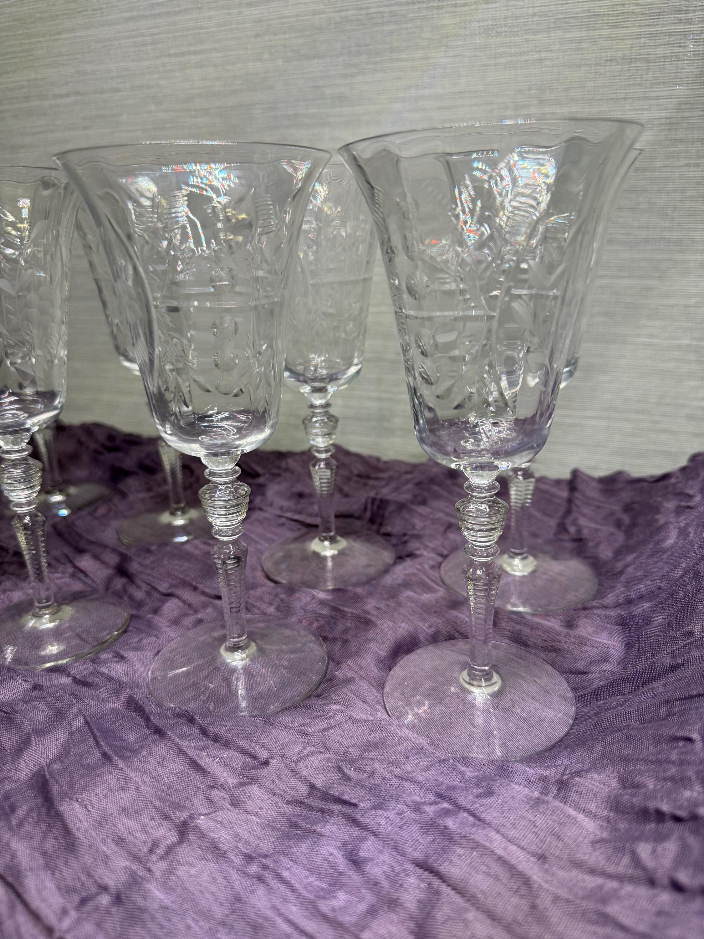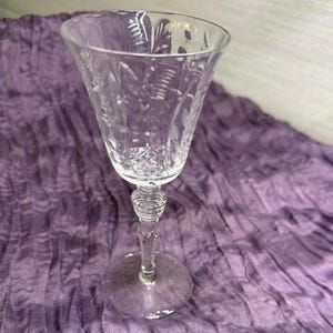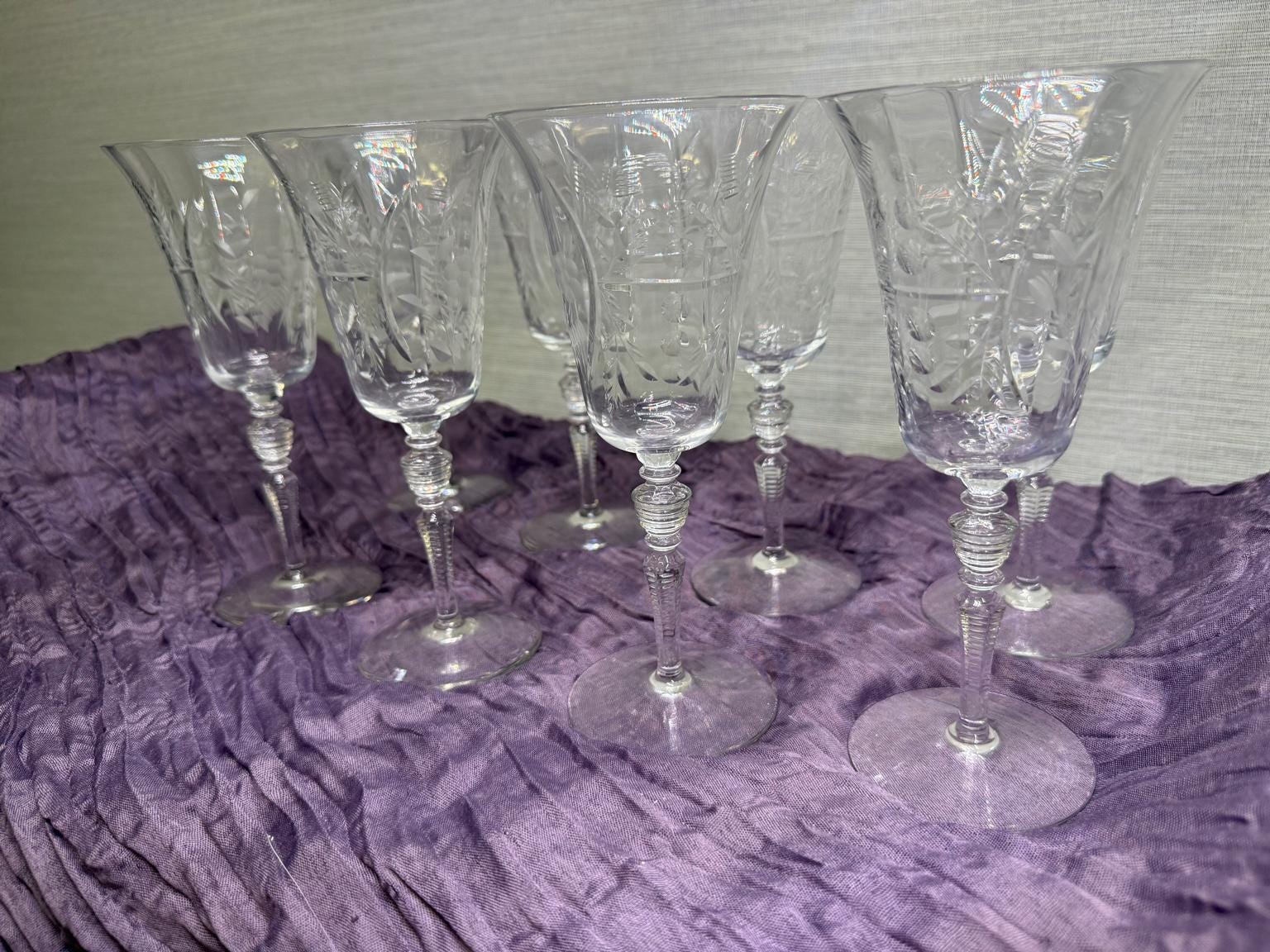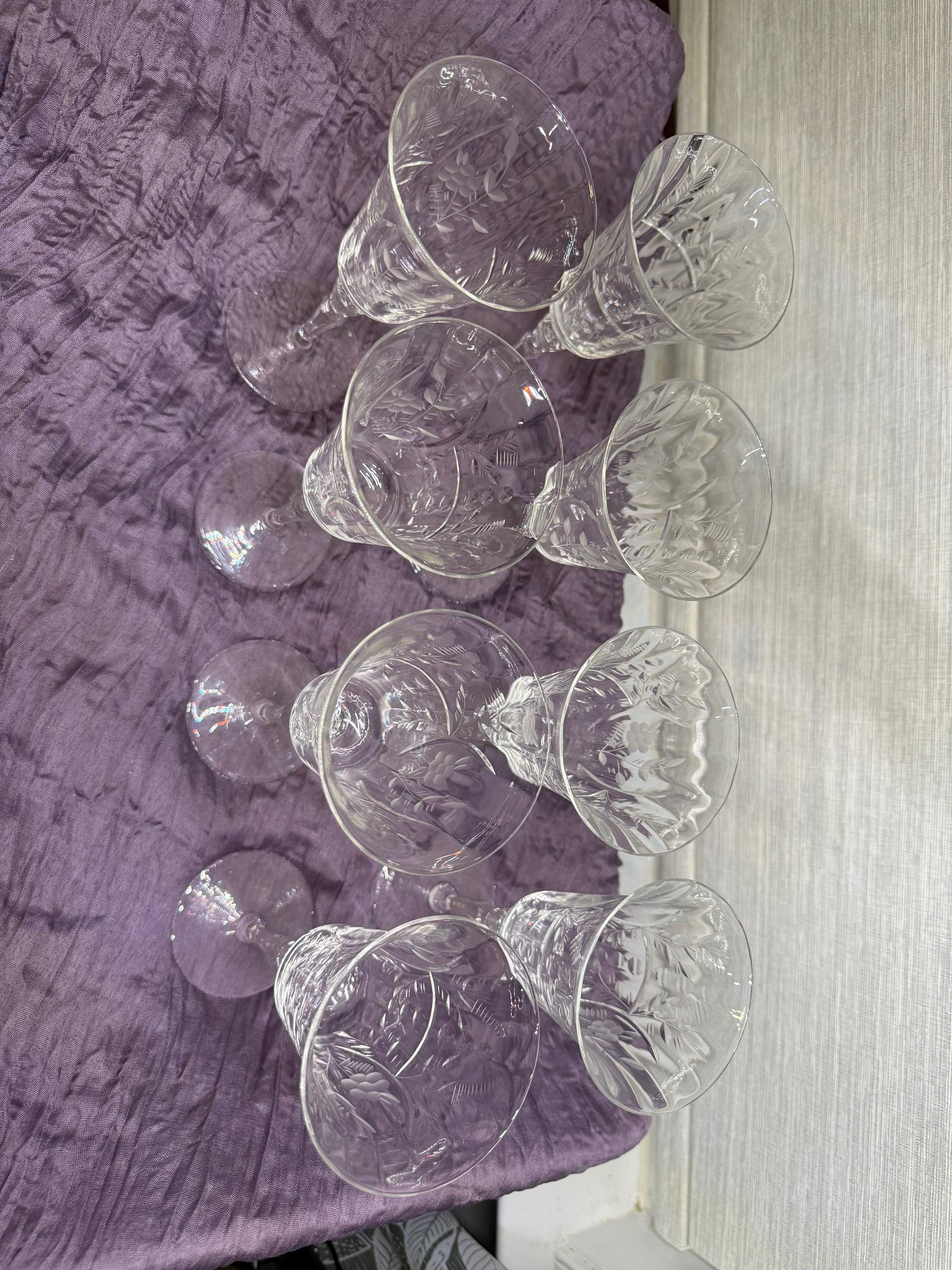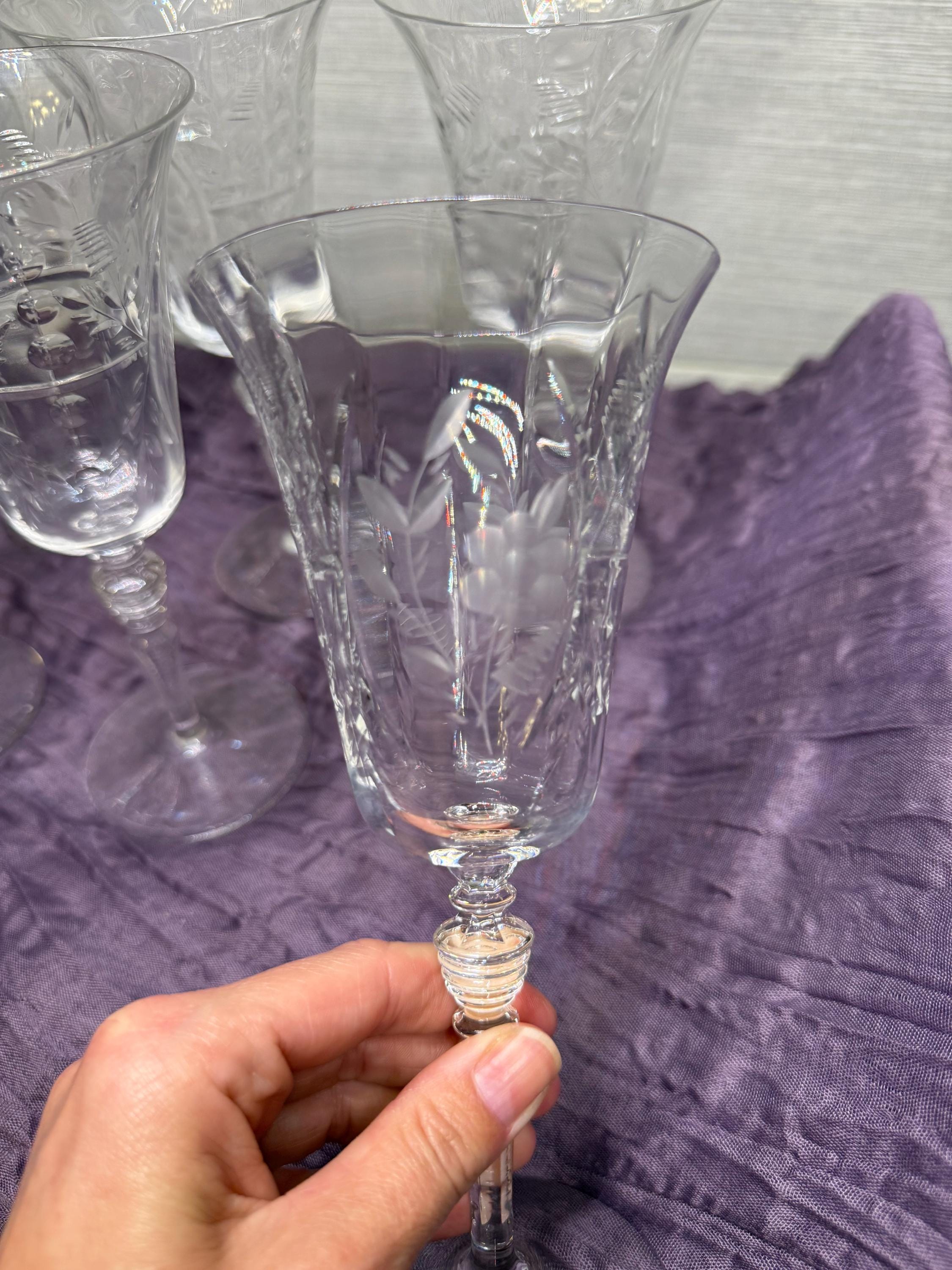 This listing is for one Tiffany & Co. crystal wine goblet. Each goblet is crafted from fine lead crystal and features a stunning hand-etched floral and leaf design, scalloped flared rim, and elegant ribbed stem. Tiffany crystal is known for its clarity, craftsmanship, and timeless appeal.