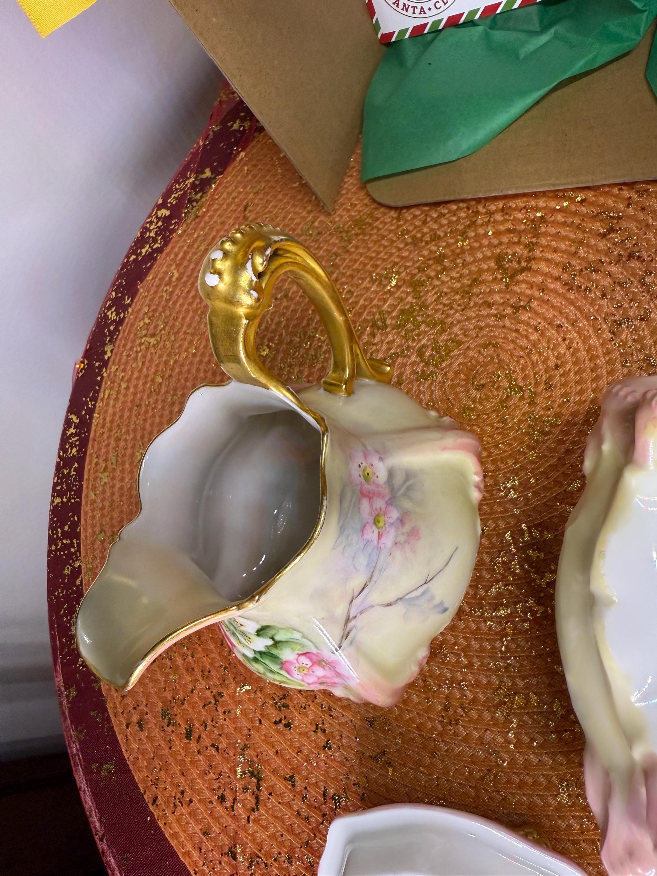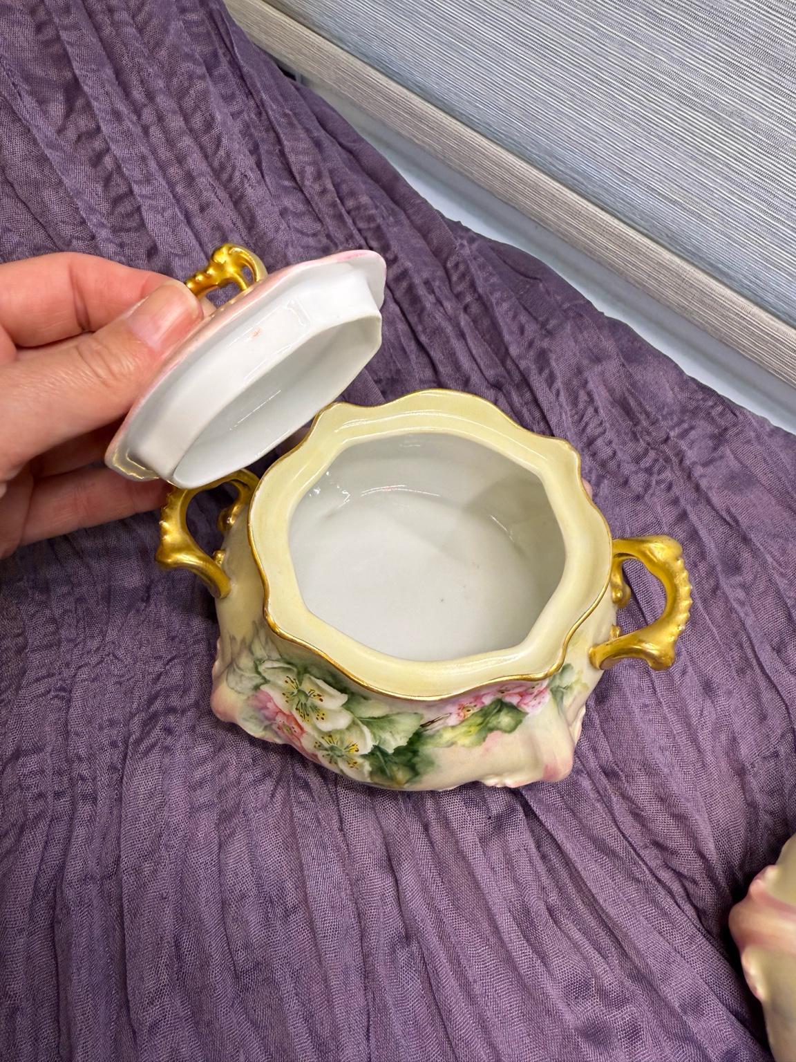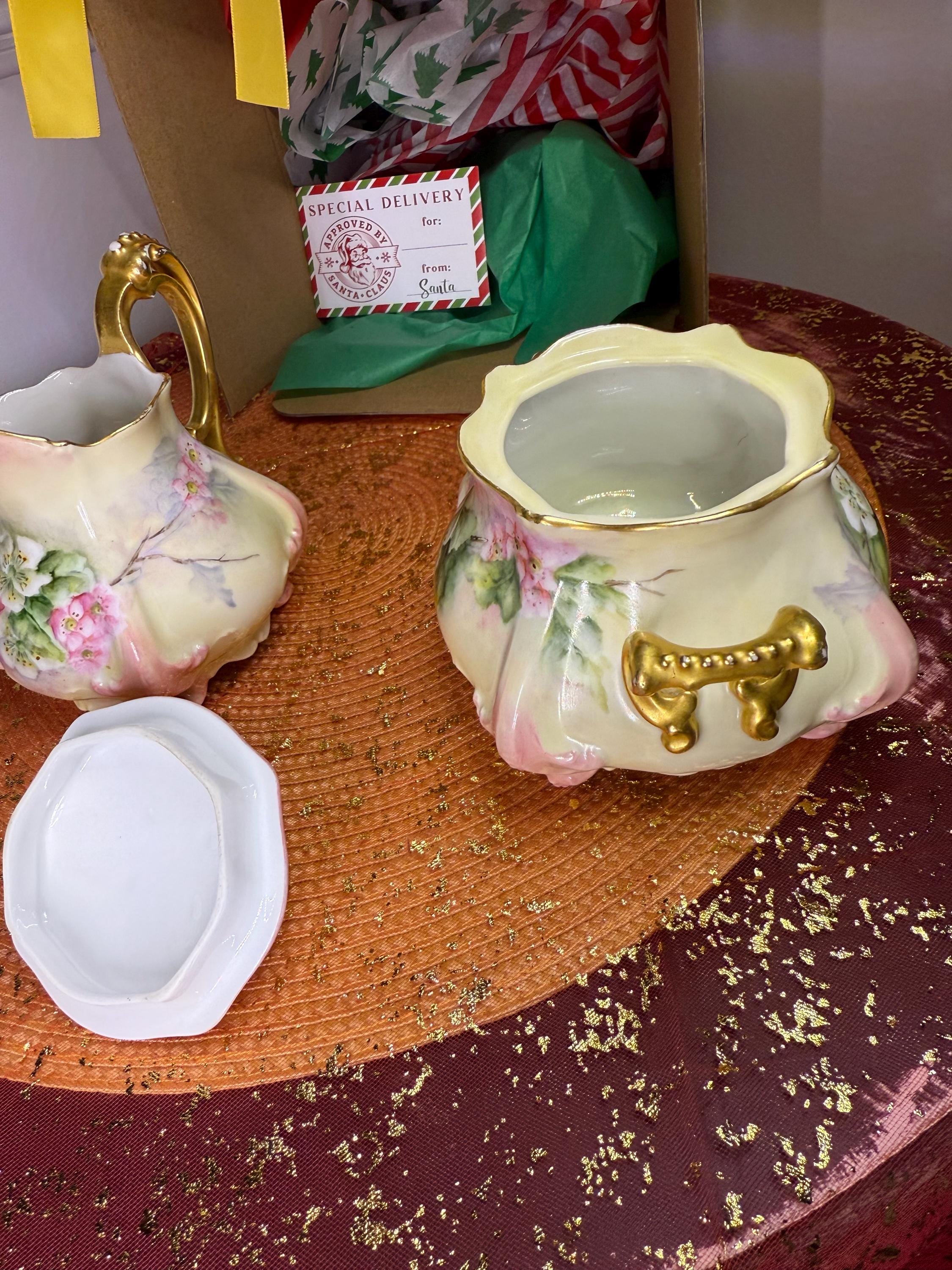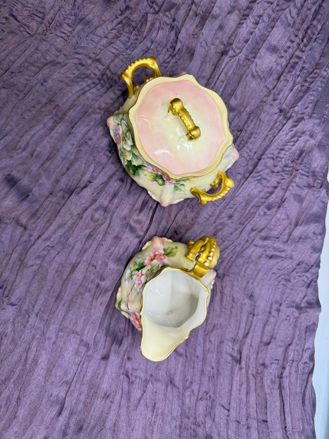 This antique T&V Limoges France sugar bowl with lid and matching creamer is a stunning example of early 1900s fine porcelain. Part of the “New Palissy” line, both pieces are hand-painted with delicate pink and white blossoms accented by green leaves and soft pastel shading and finished with ornate gold gilt handles and trim.