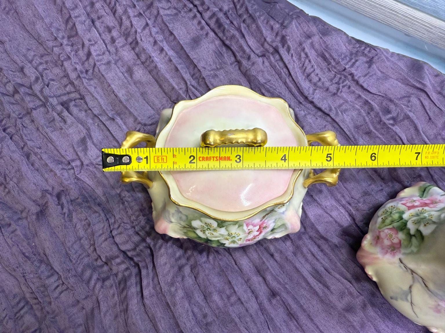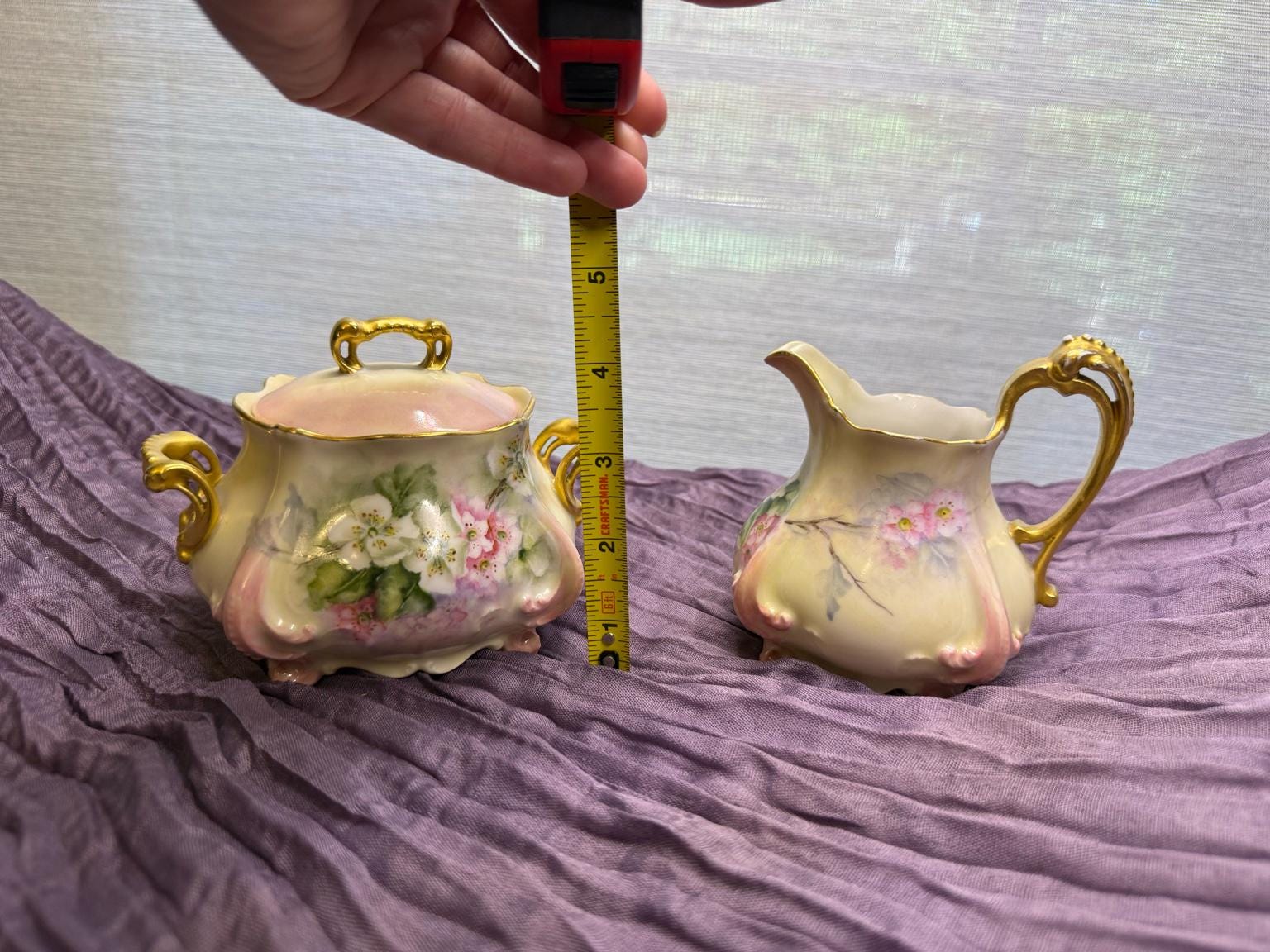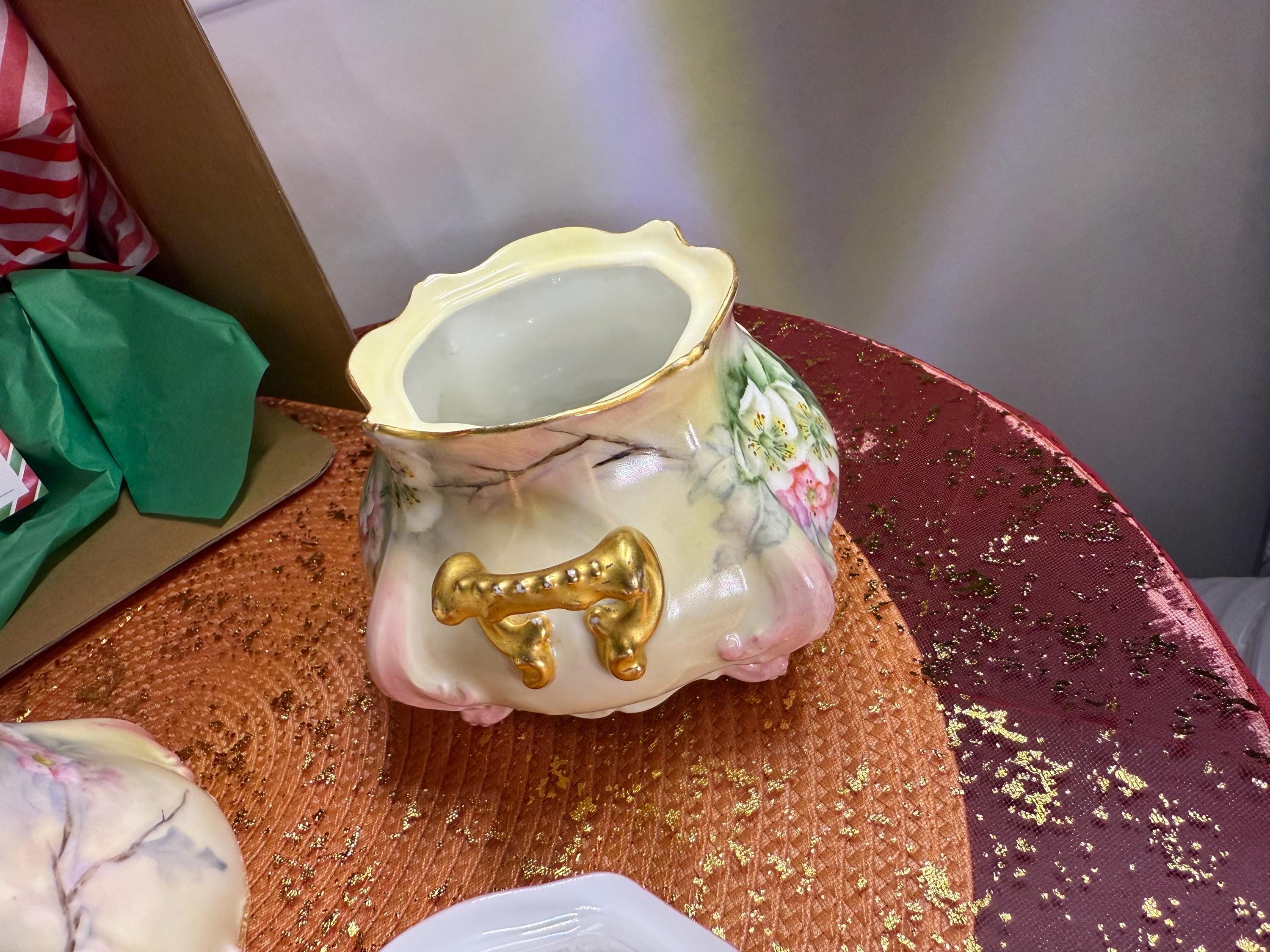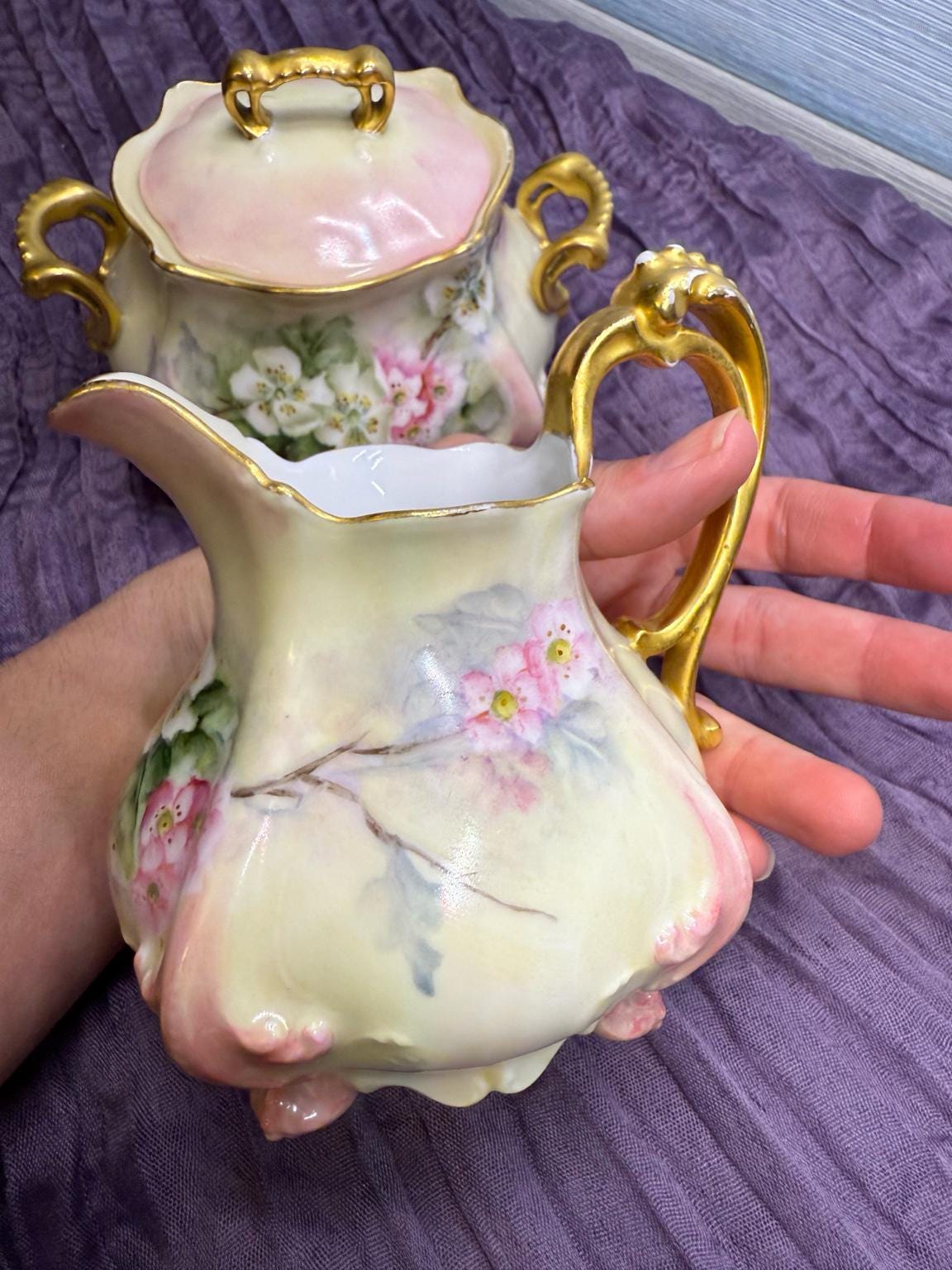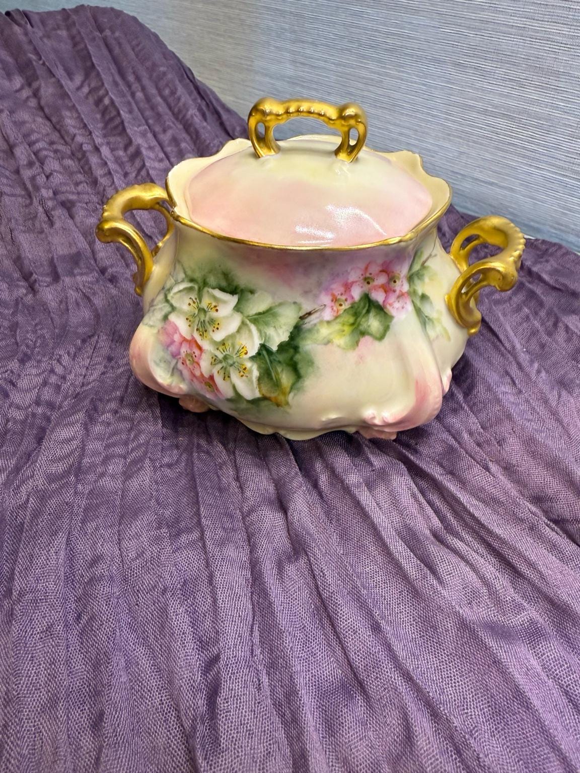 This antique T&V Limoges France sugar bowl with lid and matching creamer is a stunning example of early 1900s fine porcelain. Part of the “New Palissy” line, both pieces are hand-painted with delicate pink and white blossoms accented by green leaves and soft pastel shading and finished with ornate gold gilt handles and trim.