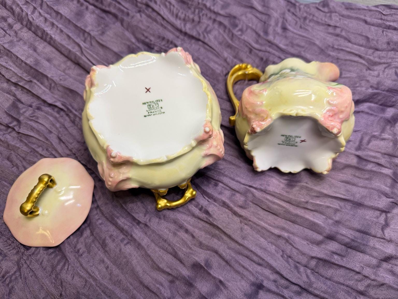 The sugar bowl includes its fitted lid, and both pieces feature elegant footed bases and graceful curves characteristic of Limoges artistry. The bottoms are stamped “T&V Limoges France”, along with the “New Palissy” mark and red X decorator’s mark.