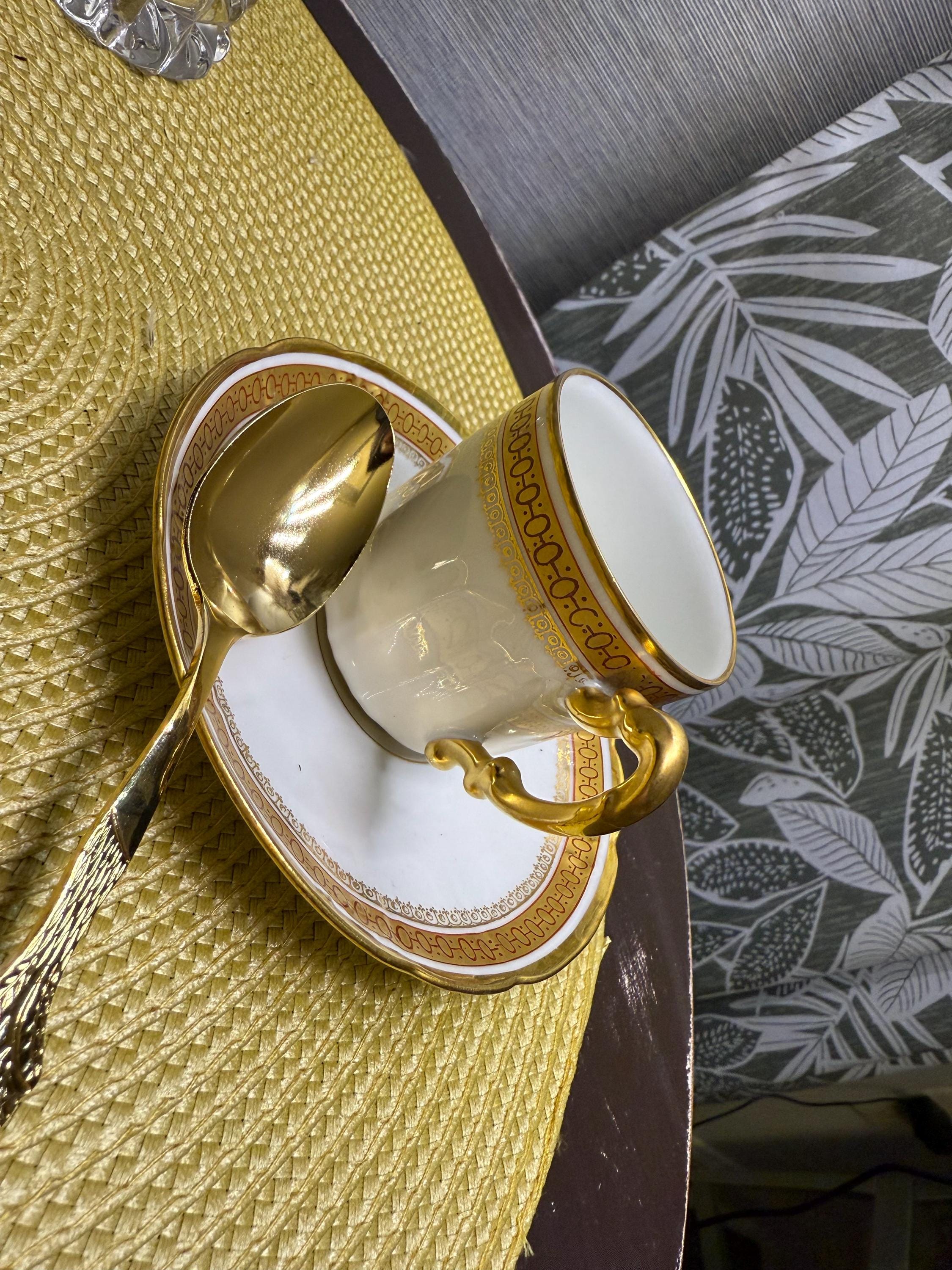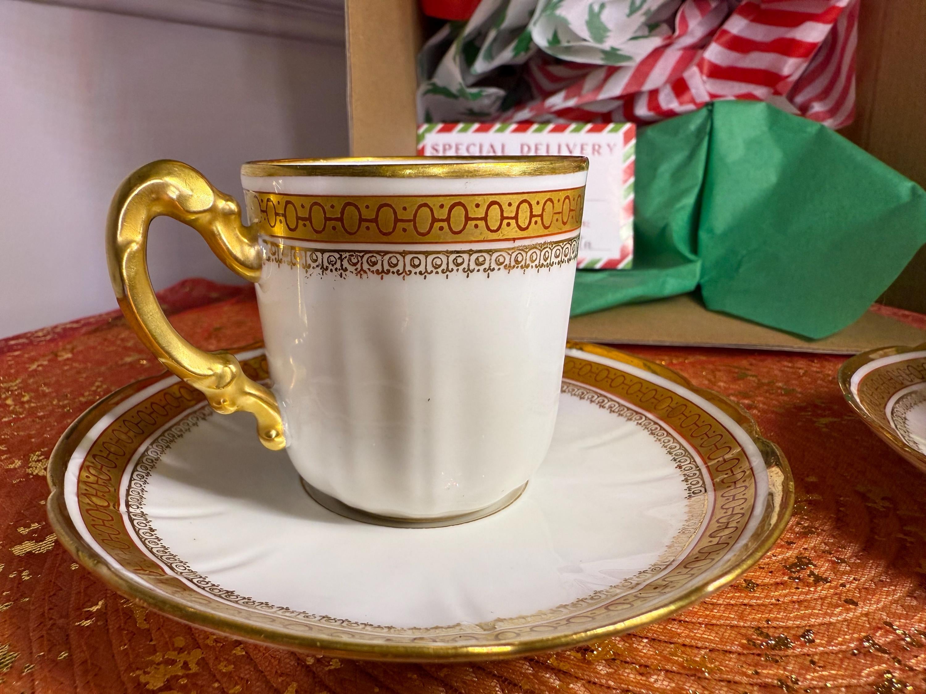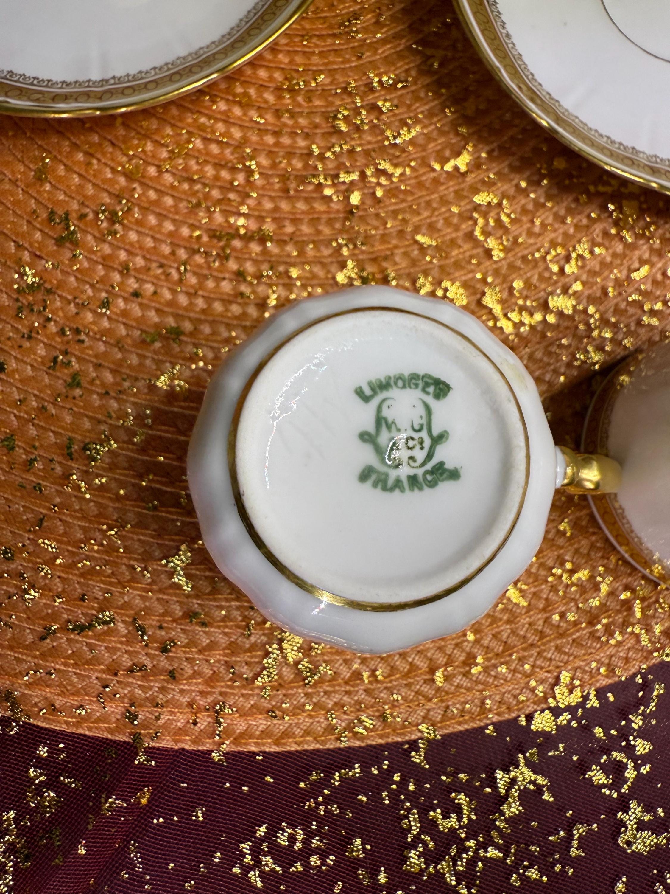 This beautiful Limoges cup and saucer duo was made in France by Gérard, Dufraisseix & Abbot (GDA Limoges) between 1900–1940. The fine white porcelain is decorated with a luxurious 24k gold encrusted border and an ornate scrolled handle, showcasing the timeless elegance of French craftsmanship.