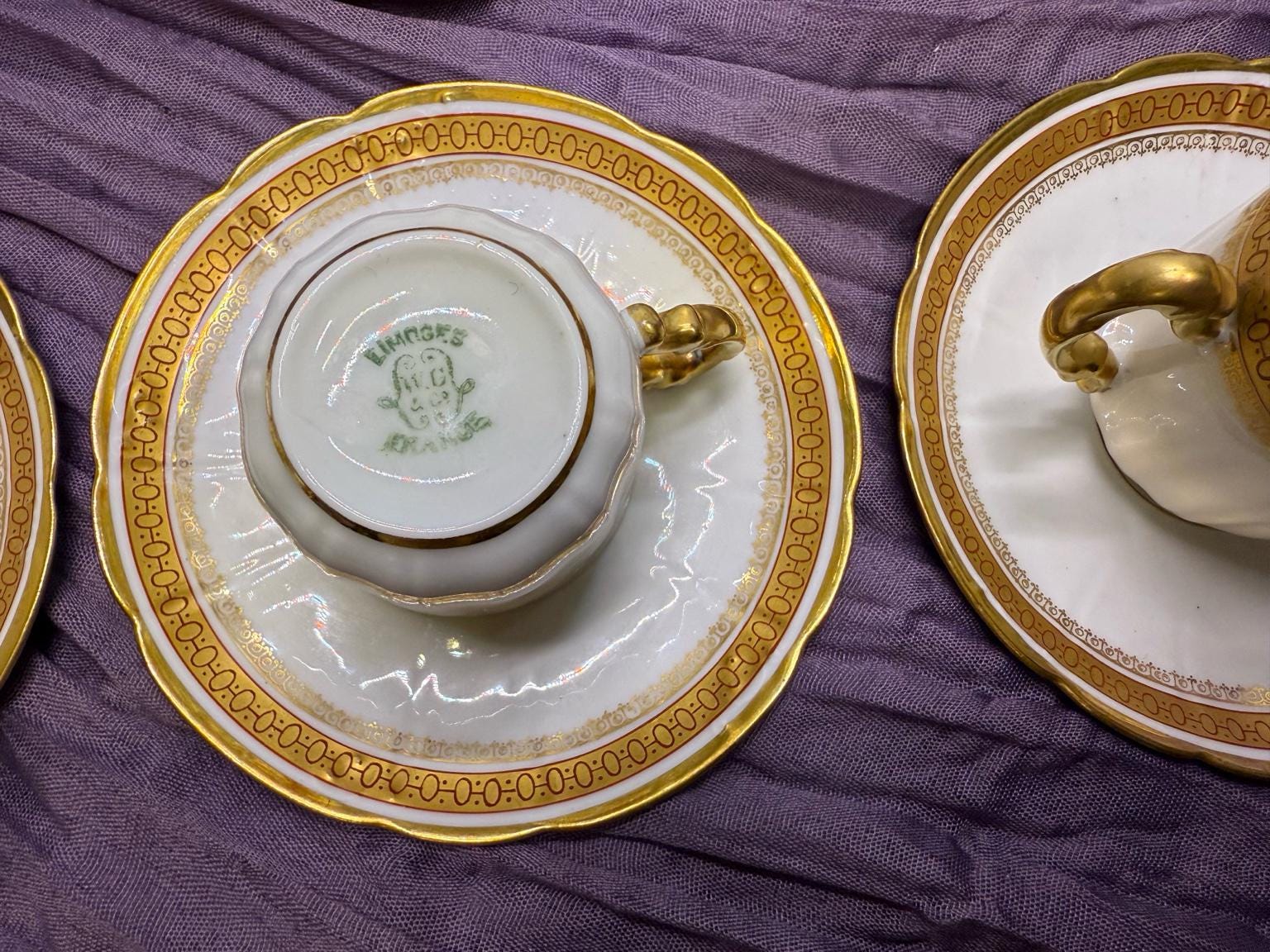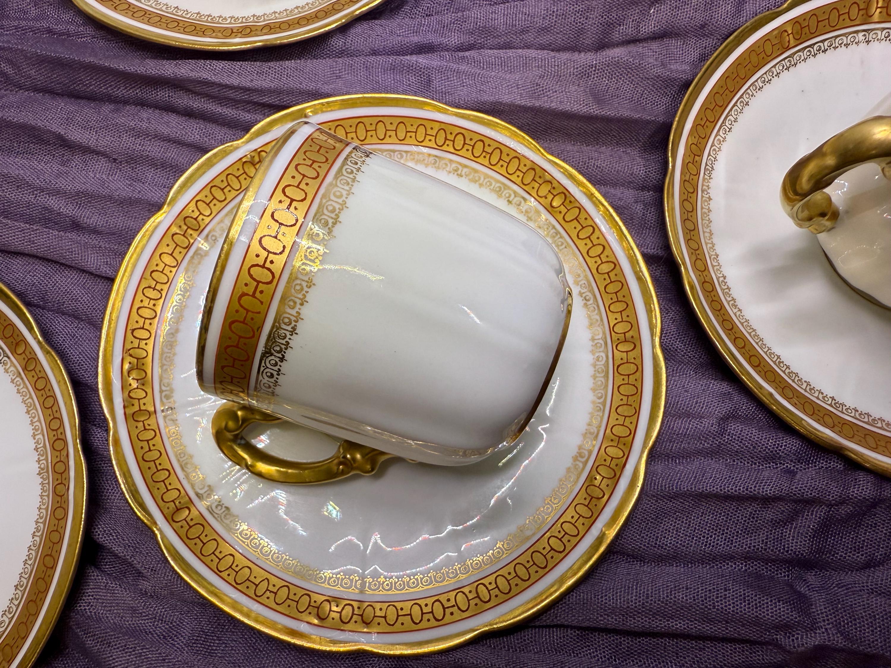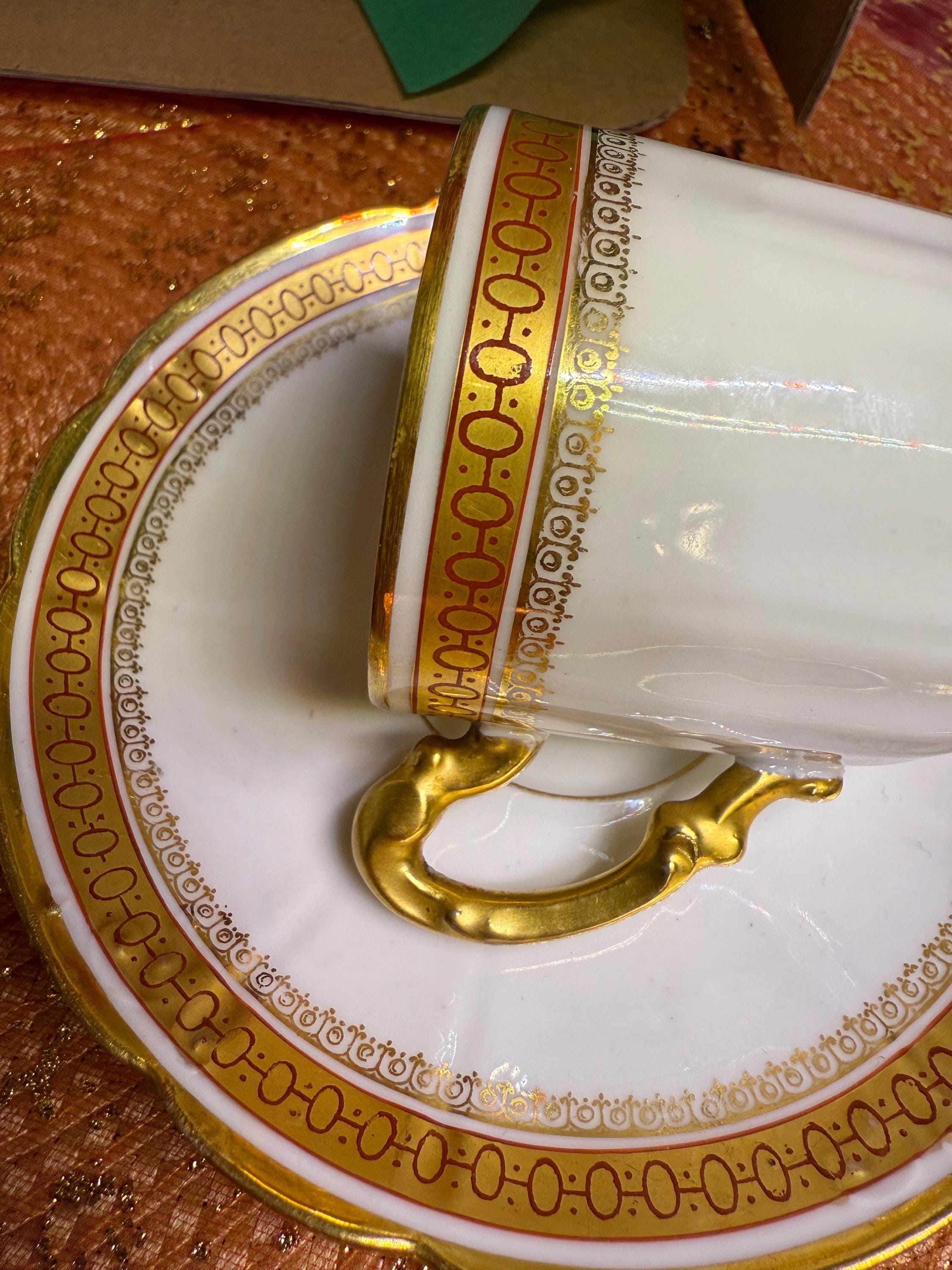 This beautiful Limoges cup and saucer duo was made in France by Gérard, Dufraisseix & Abbot (GDA Limoges) between 1900–1940. The fine white porcelain is decorated with a luxurious 24k gold encrusted border and an ornate scrolled handle, showcasing the timeless elegance of French craftsmanship.