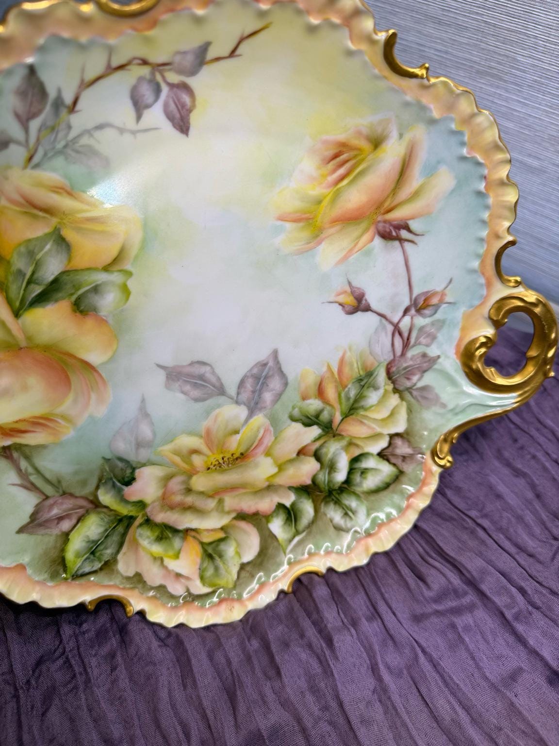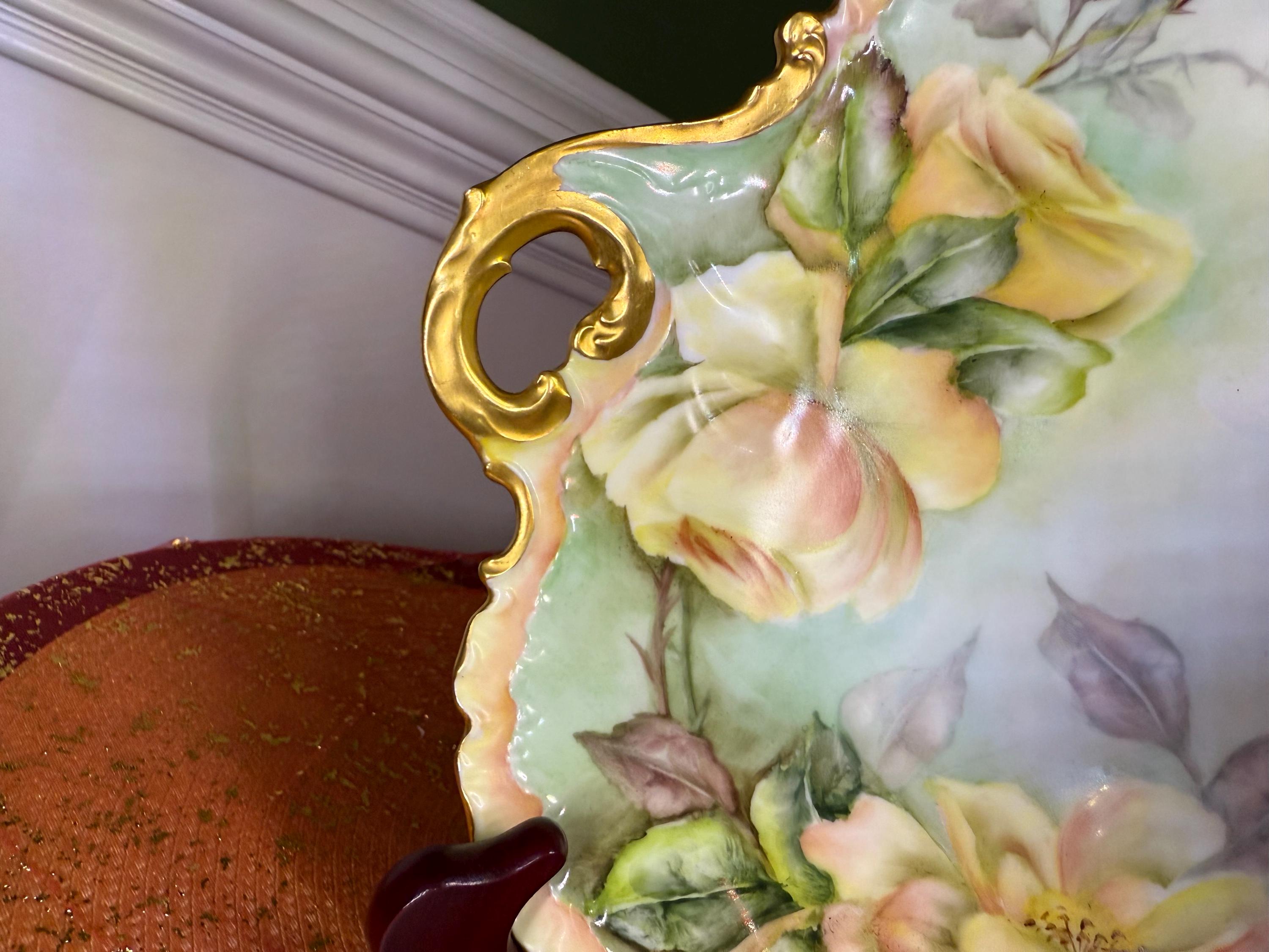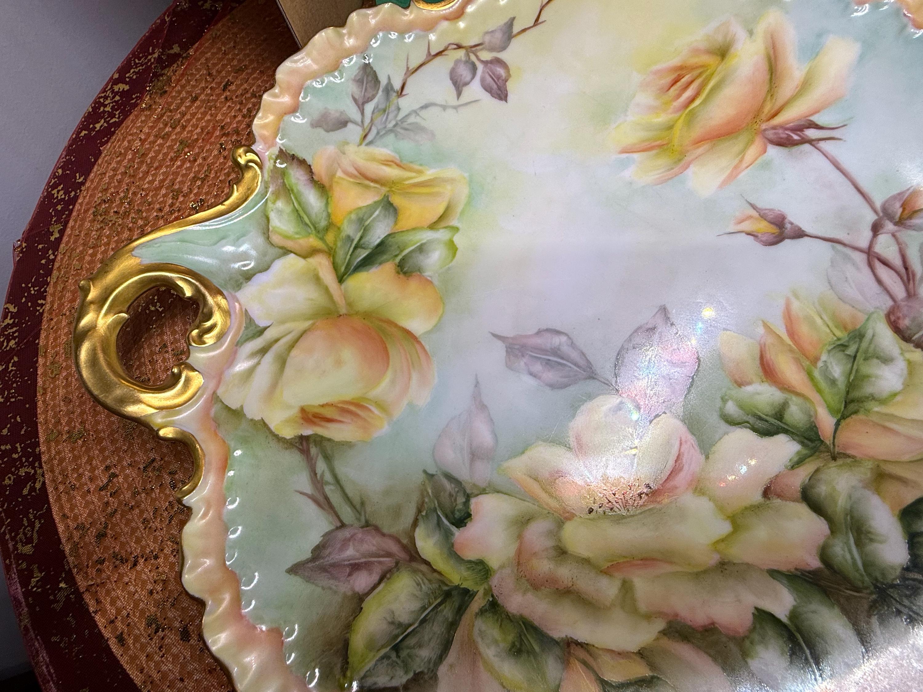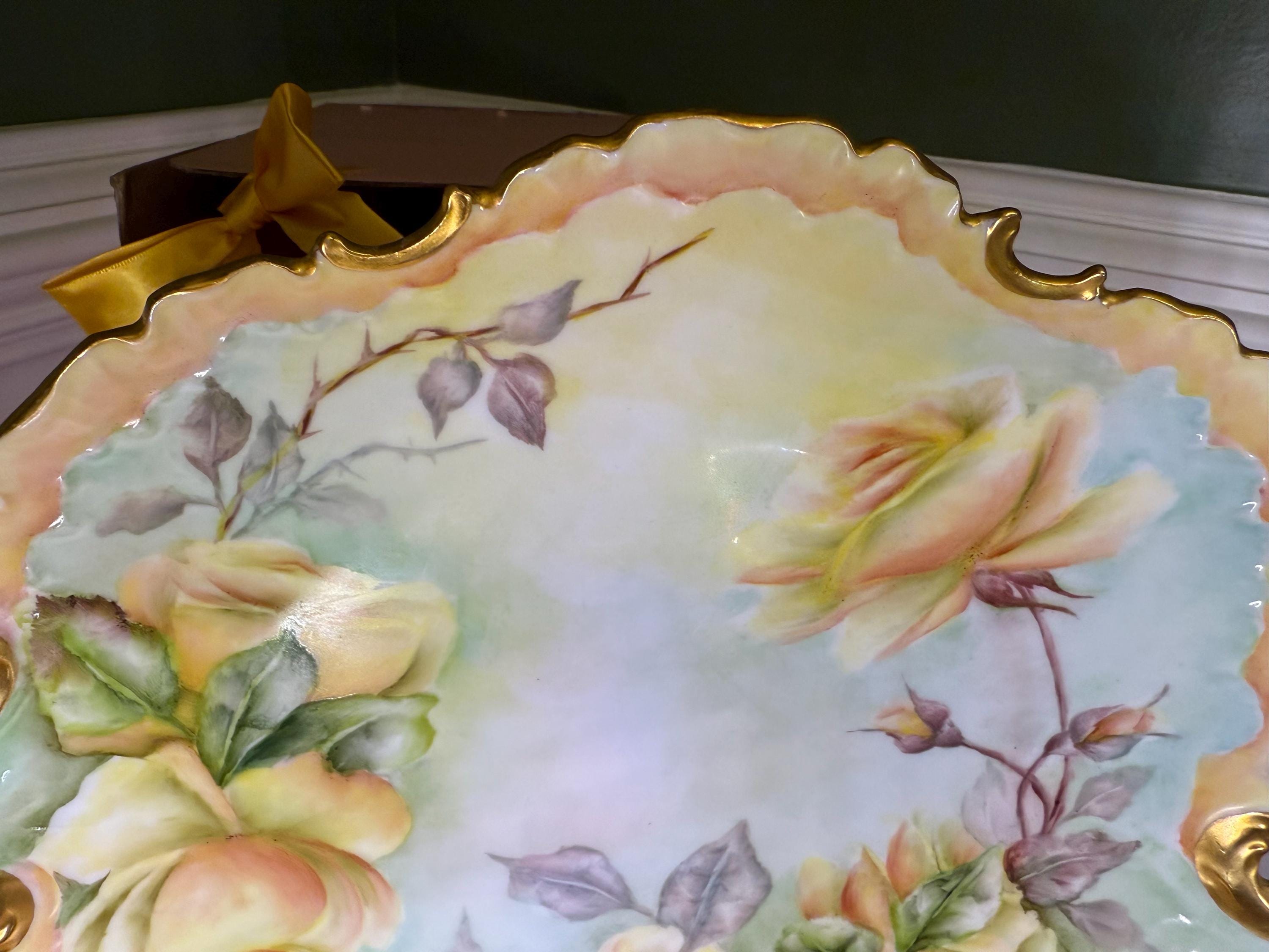 This absolutely stunning hand-painted porcelain charger is a true treasure from the renowned Rosenthal Porcelain Company of Bavaria, Germany. Featuring lush yellow and peach roses with delicate green leaves, the artistry brings this floral scene to life with soft shading and exquisite detail. The scalloped edges are richly accented in heavy gold gilding, and the ornate double handles make this piece both functional and decorative.