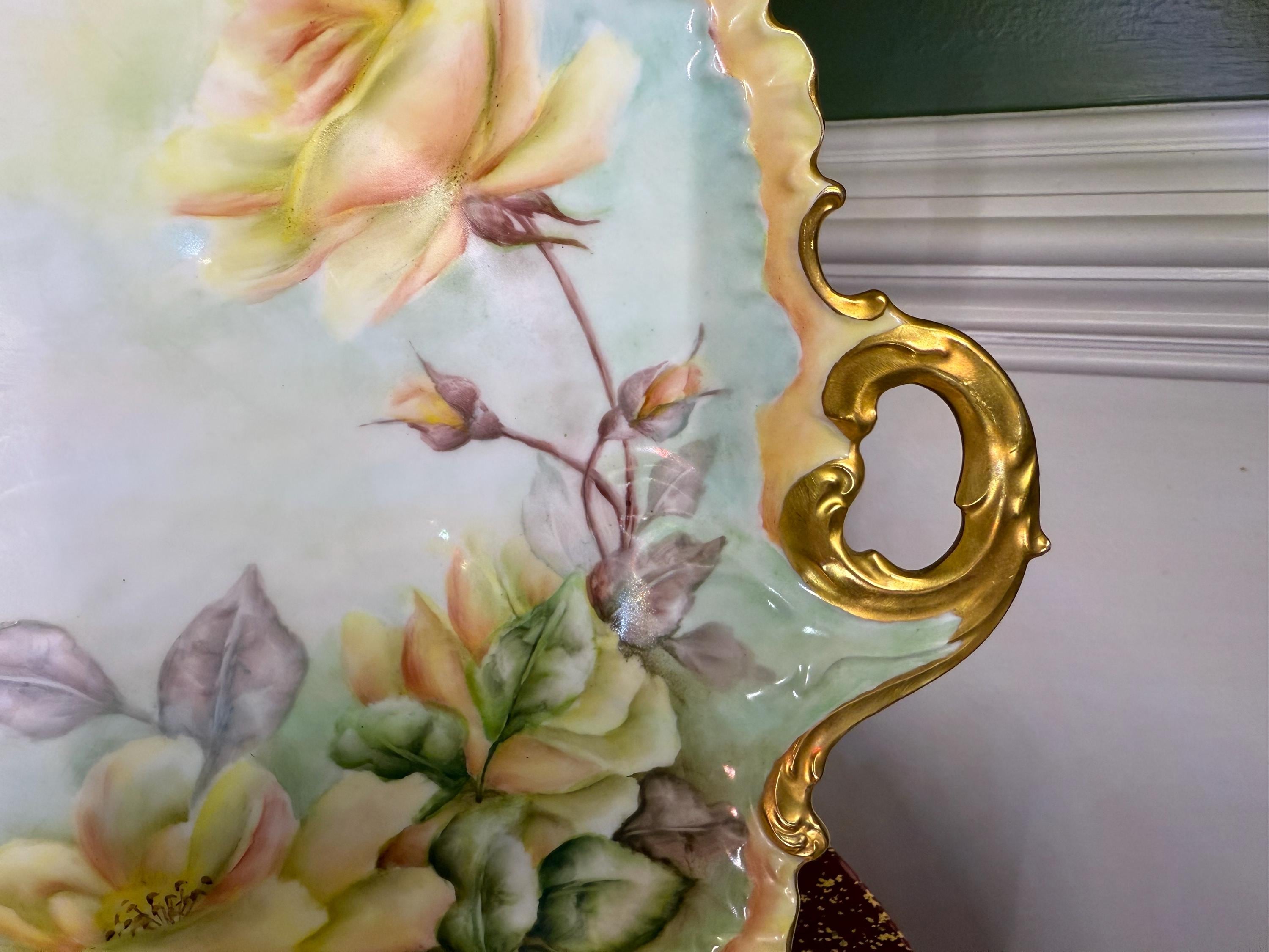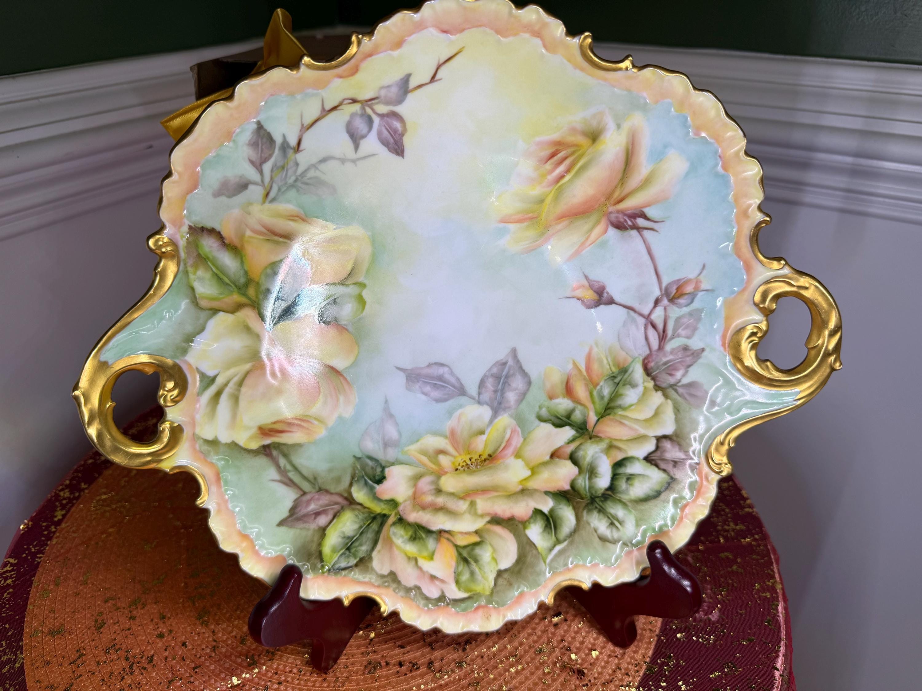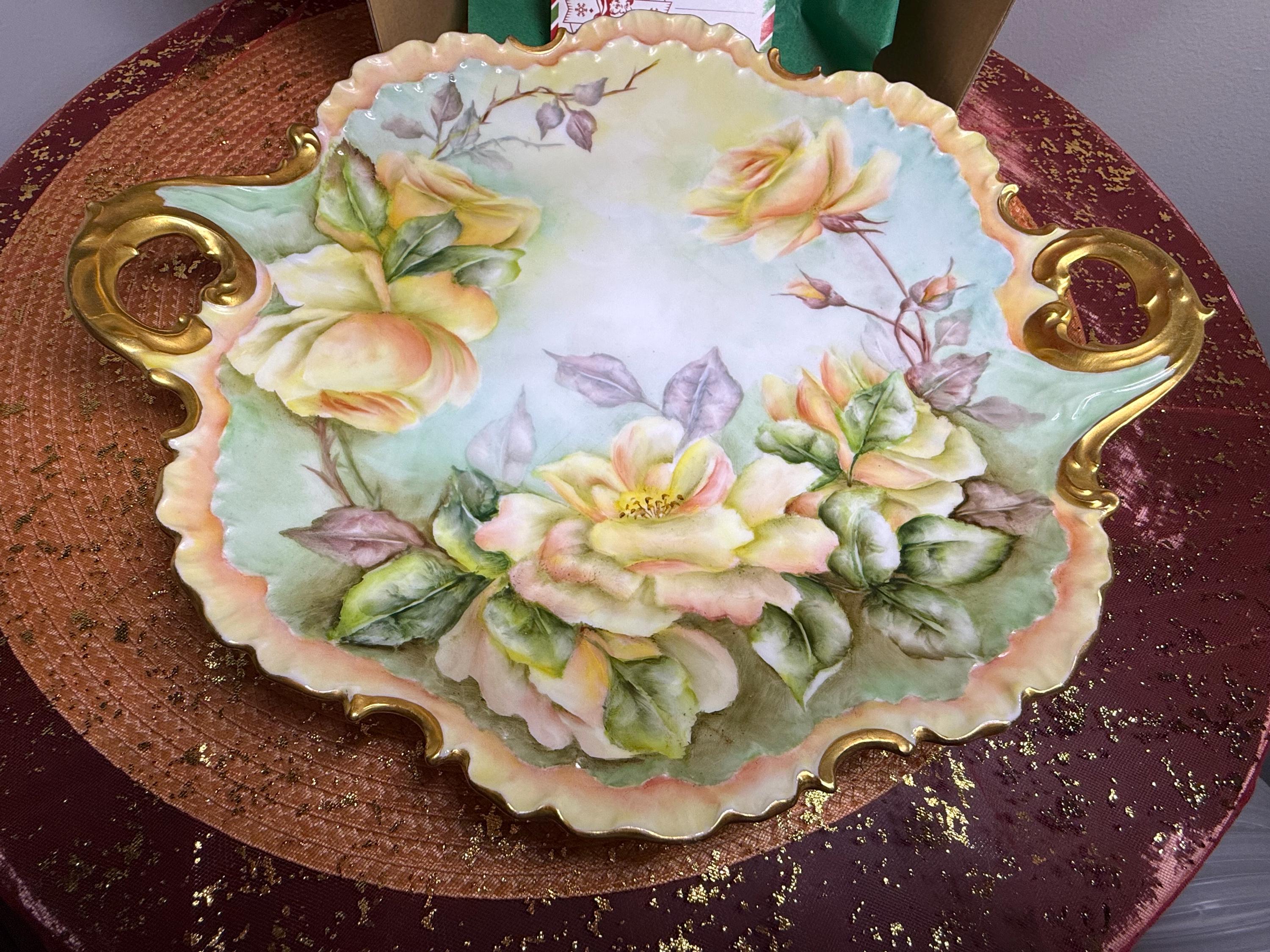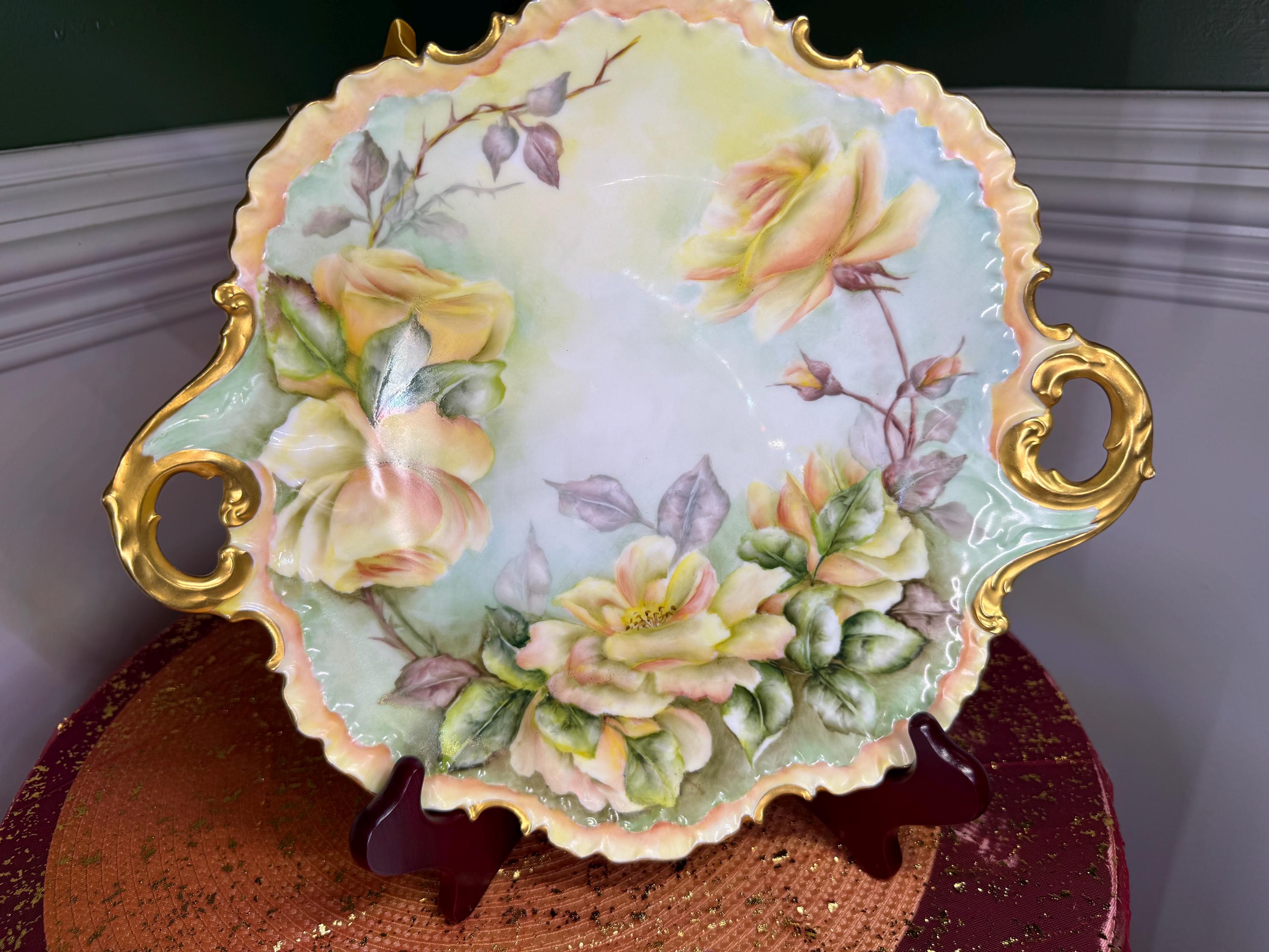 This absolutely stunning hand-painted porcelain charger is a true treasure from the renowned Rosenthal Porcelain Company of Bavaria, Germany. Featuring lush yellow and peach roses with delicate green leaves, the artistry brings this floral scene to life with soft shading and exquisite detail. The scalloped edges are richly accented in heavy gold gilding, and the ornate double handles make this piece both functional and decorative.