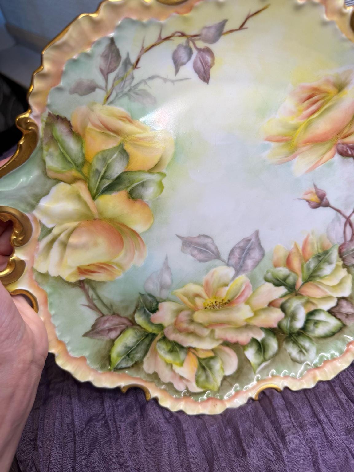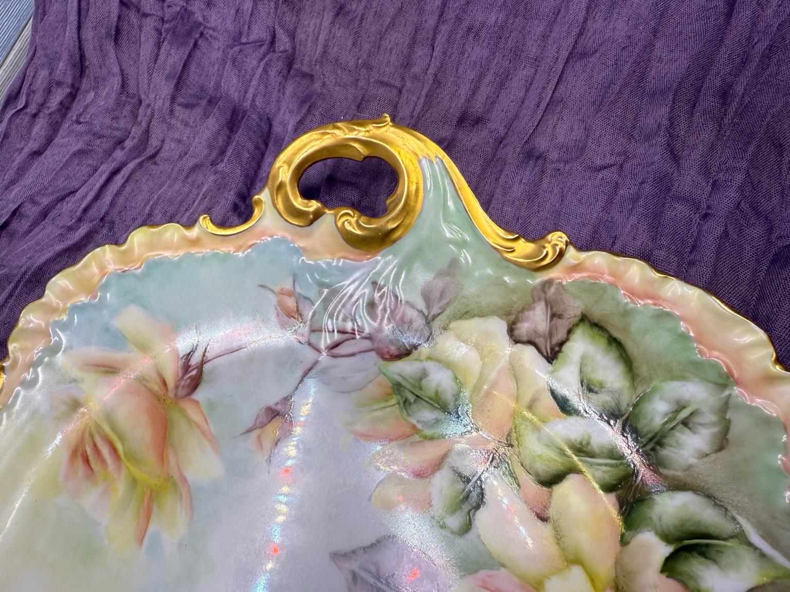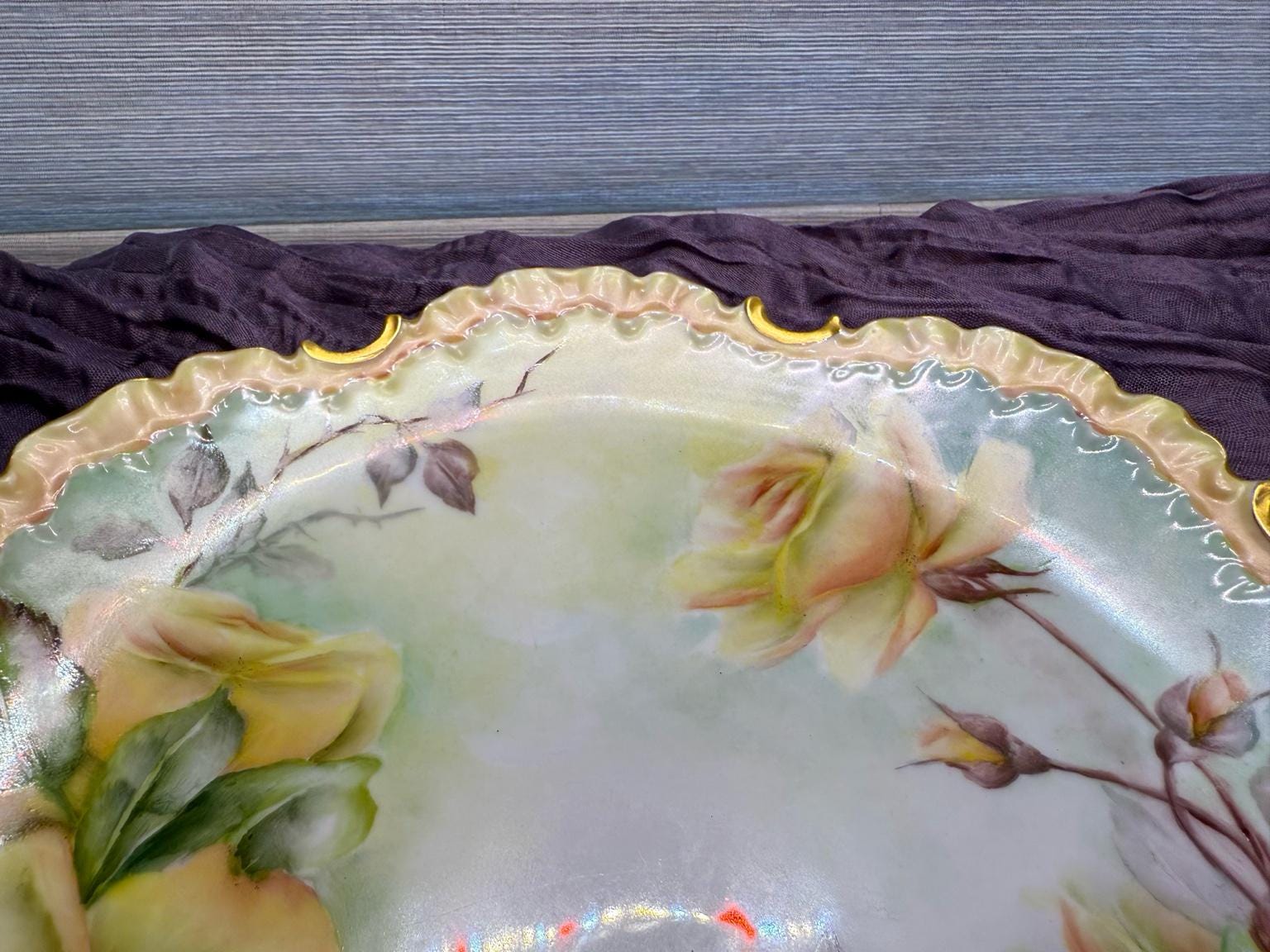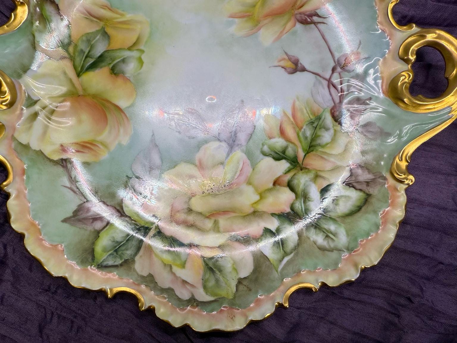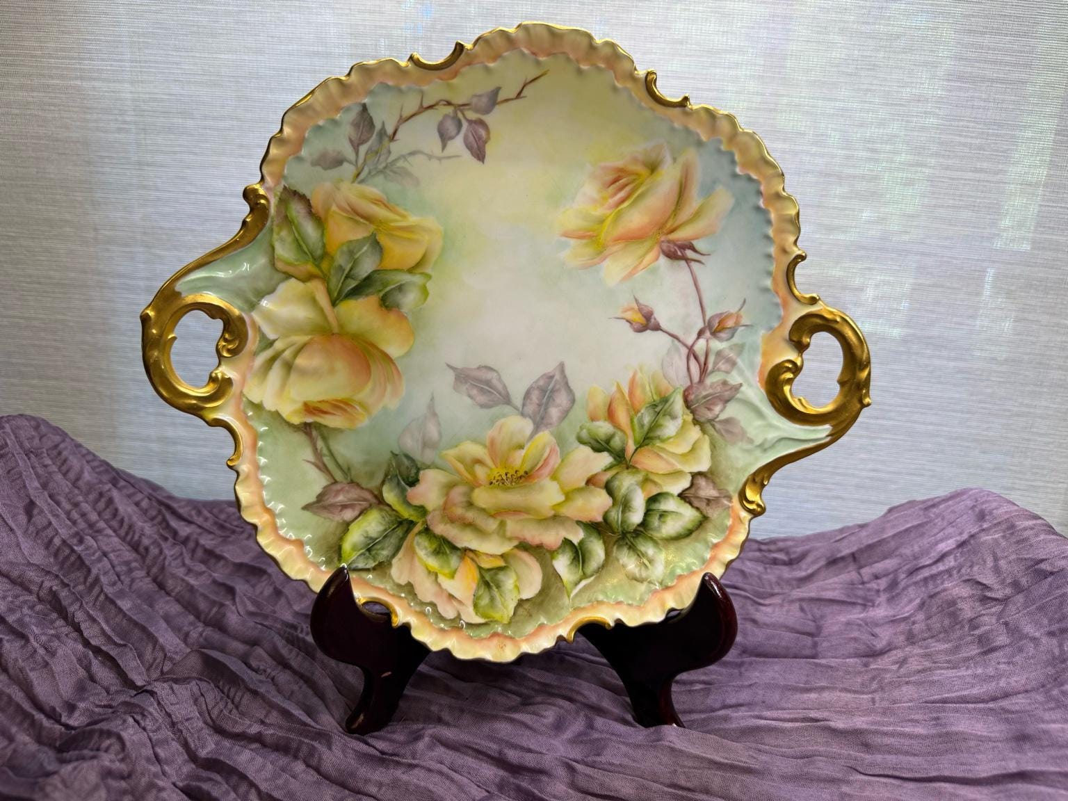 This absolutely stunning hand-painted porcelain charger is a true treasure from the renowned Rosenthal Porcelain Company of Bavaria, Germany. Featuring lush yellow and peach roses with delicate green leaves, the artistry brings this floral scene to life with soft shading and exquisite detail. The scalloped edges are richly accented in heavy gold gilding, and the ornate double handles make this piece both functional and decorative.