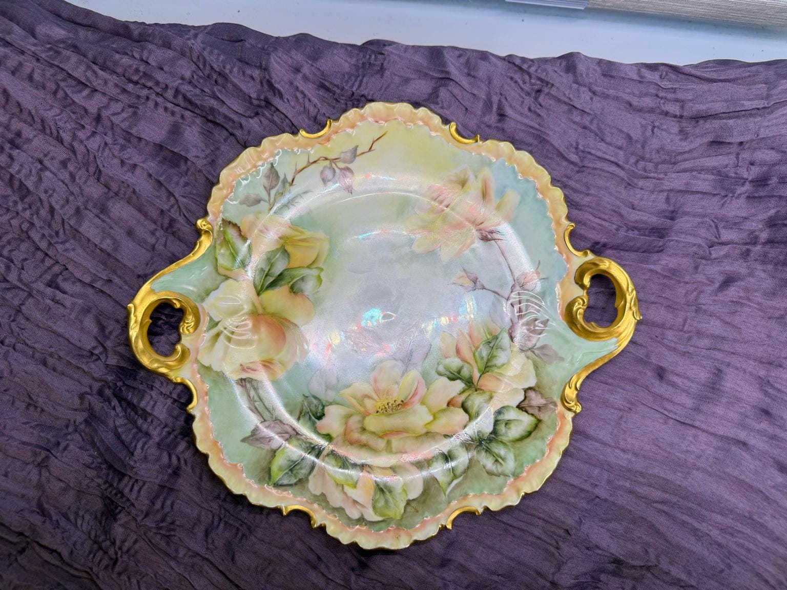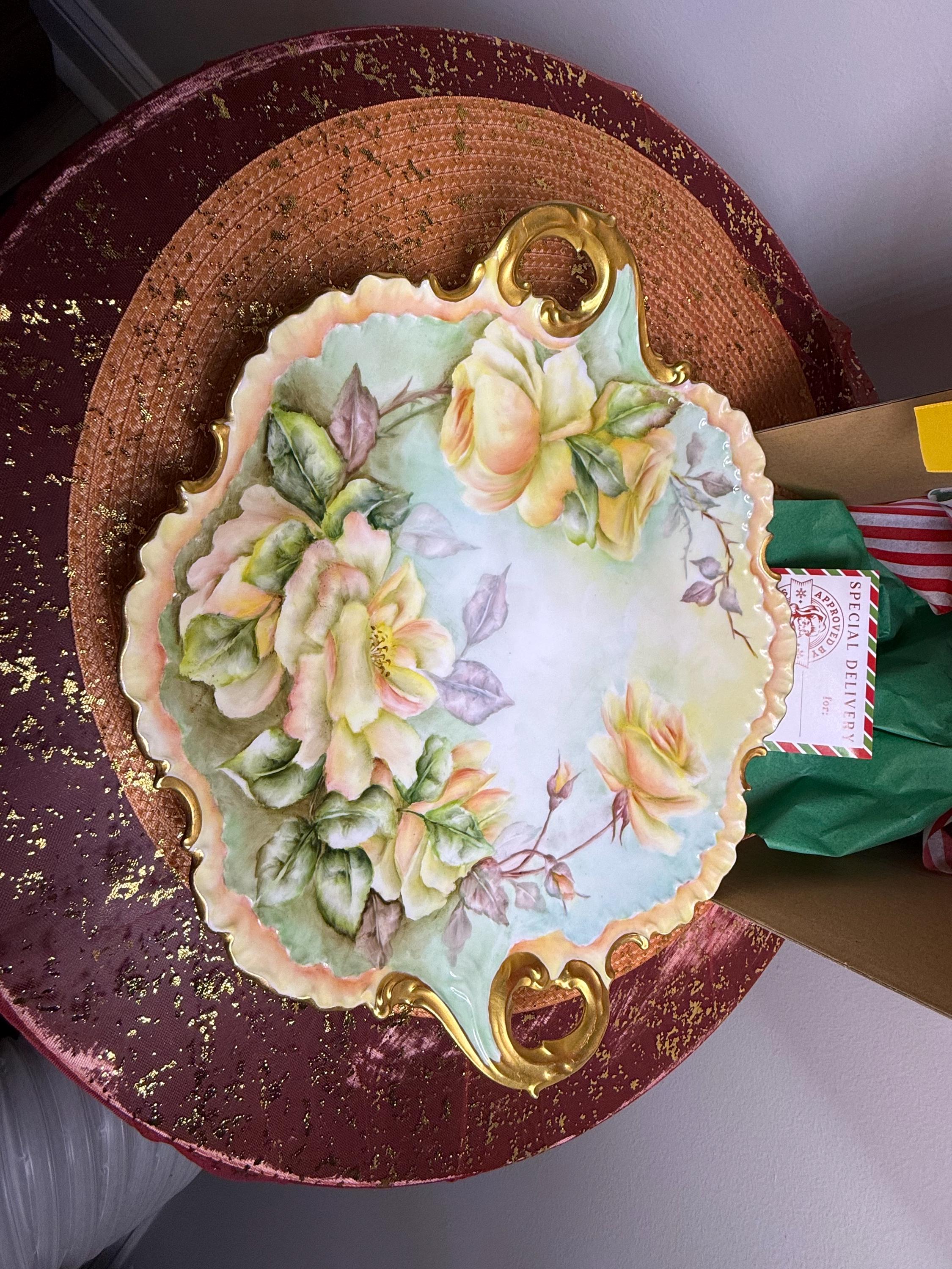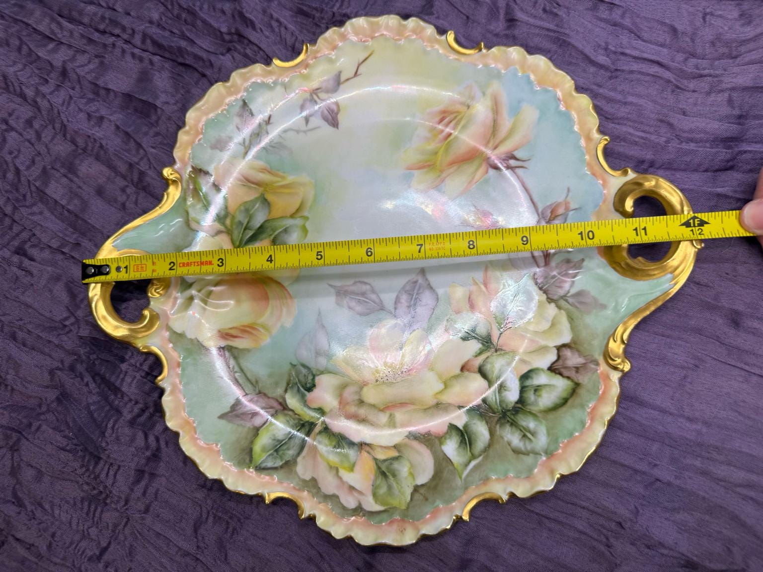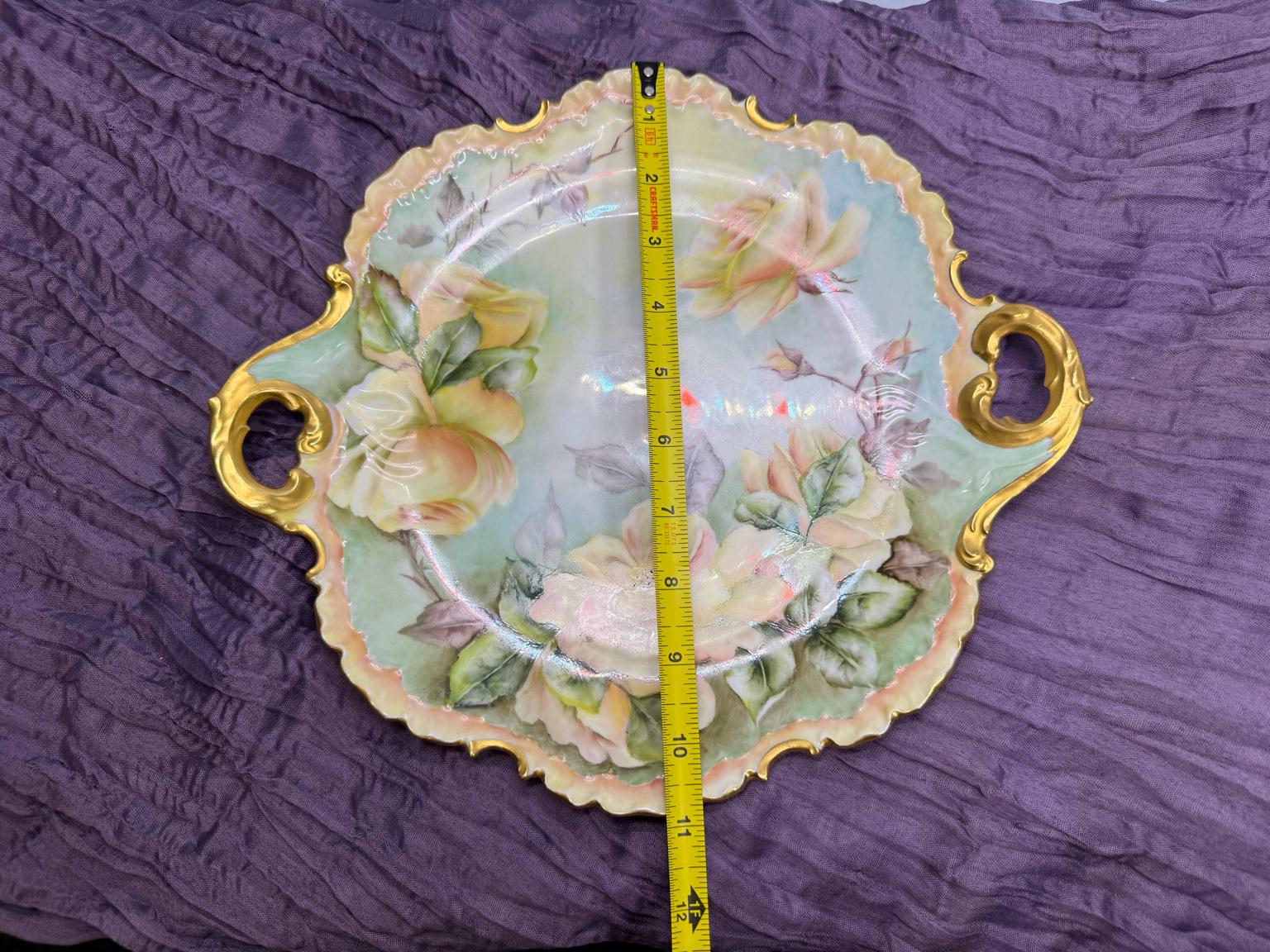 This absolutely stunning hand-painted porcelain charger is a true treasure from the renowned Rosenthal Porcelain Company of Bavaria, Germany. Featuring lush yellow and peach roses with delicate green leaves, the artistry brings this floral scene to life with soft shading and exquisite detail. The scalloped edges are richly accented in heavy gold gilding, and the ornate double handles make this piece both functional and decorative.
