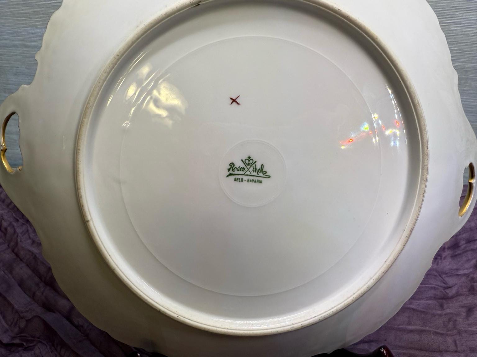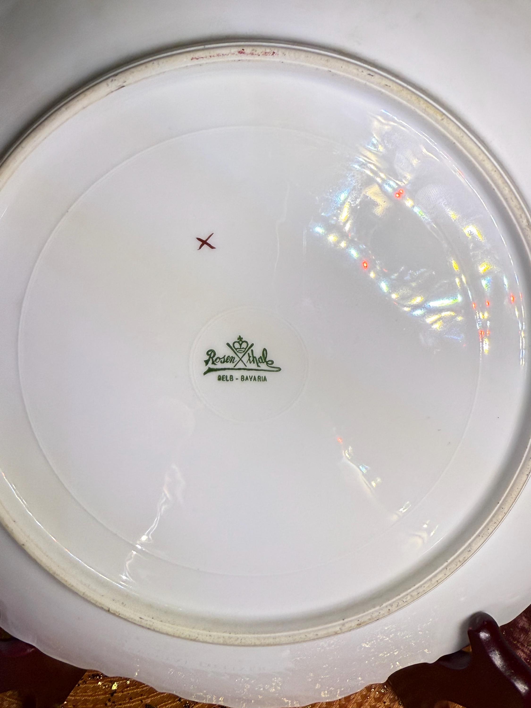 The Rosenthal hallmark on the back (used between 1891–1910) confirms its authenticity and places this charger in the early production years of Rosenthal’s fine Bavarian porcelain. The additional red “X” mark is typical of decorator or quality control marks applied during finishing.