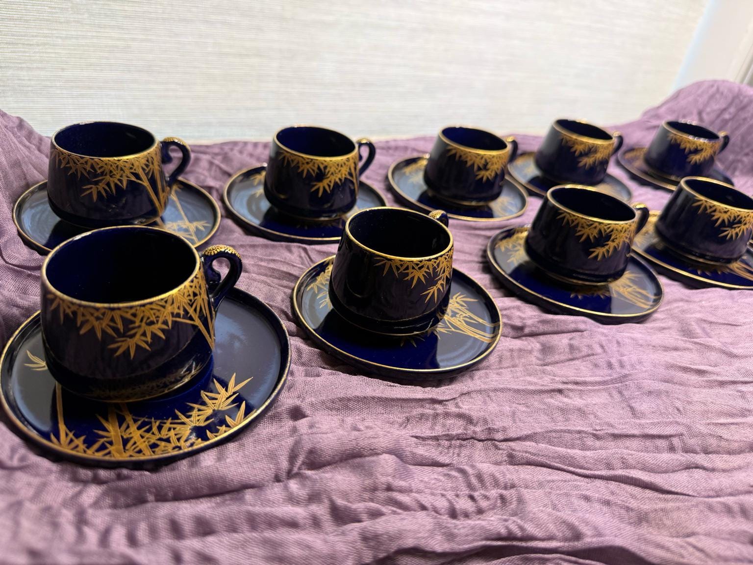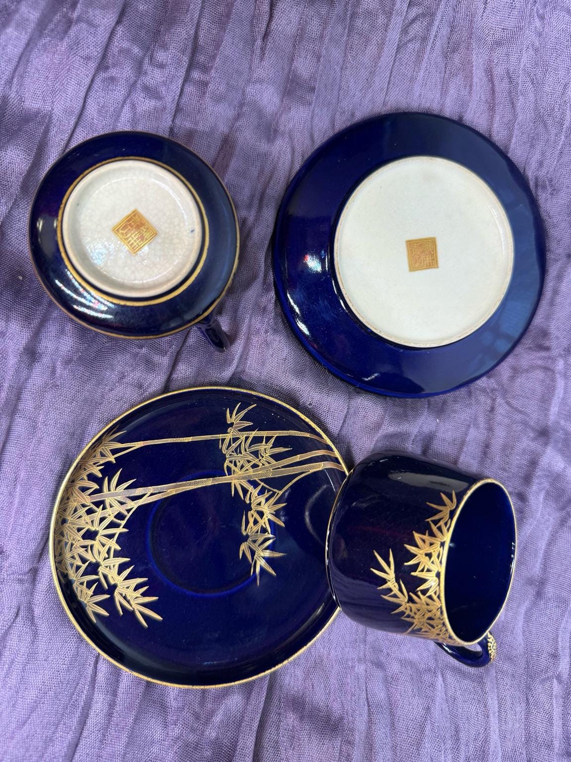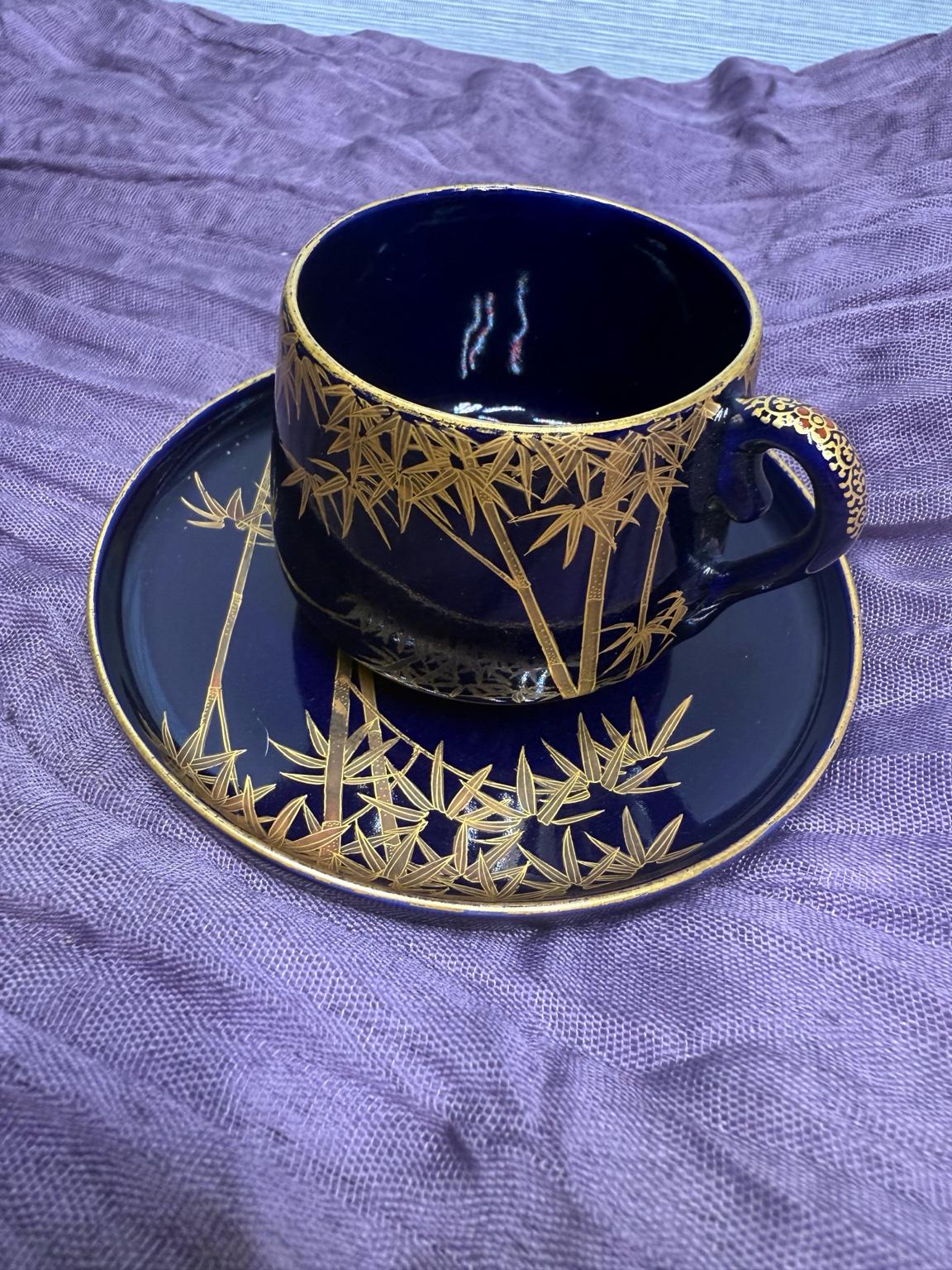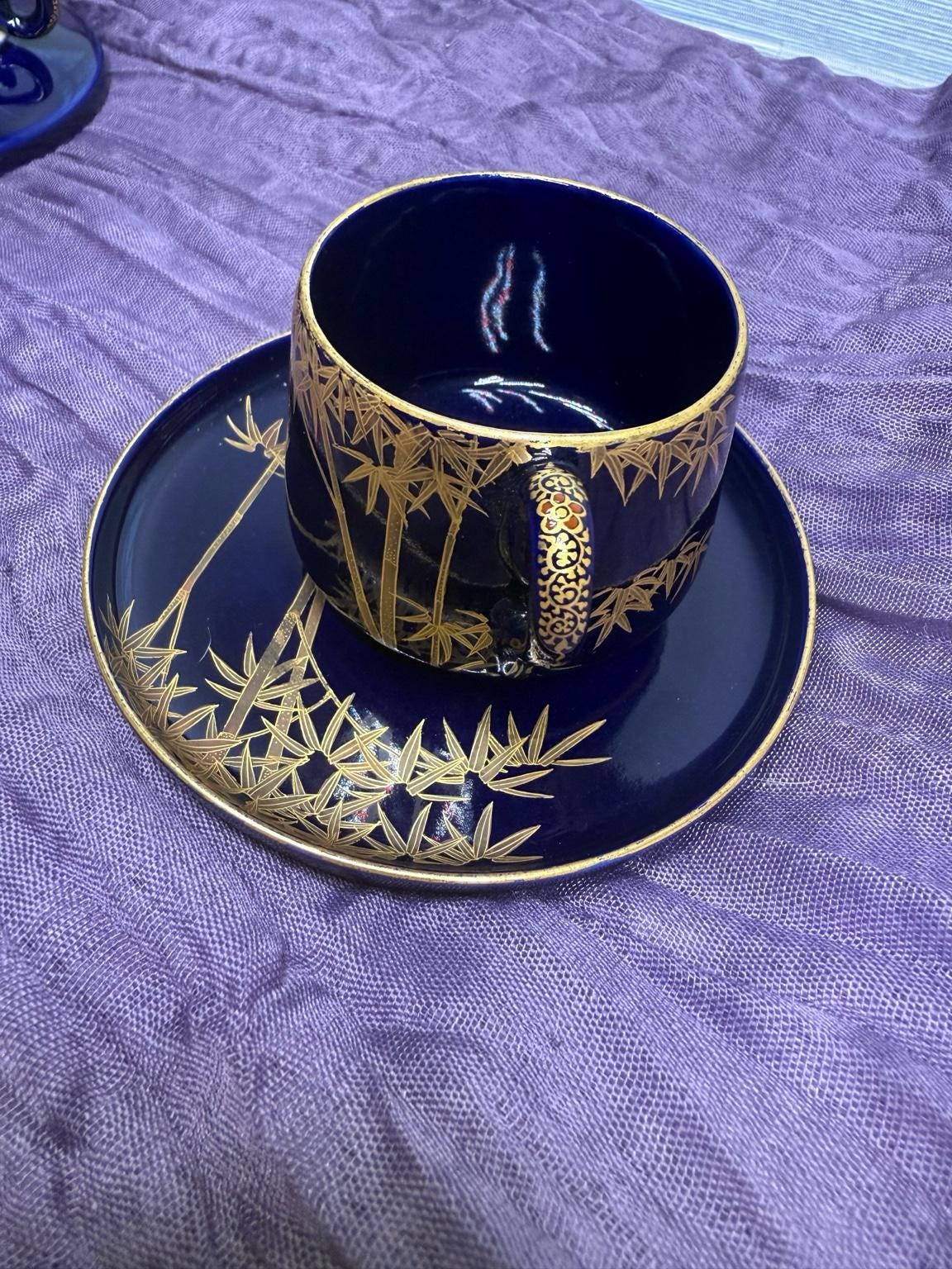 This listing is for one cup and one matching saucer. The porcelain is finished in a deep cobalt glaze with a gold bamboo design. The cup’s handle and rim are also detailed in gold. Each piece carries the Kutani (九谷焼) mark on the base, showing its origin from Ishikawa Prefecture, Japan.