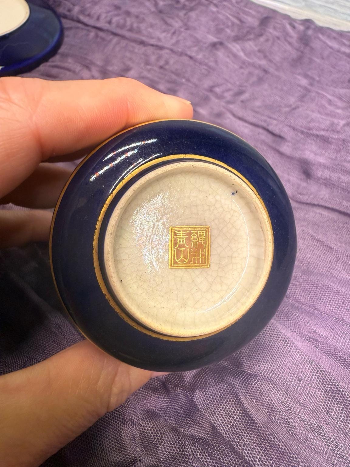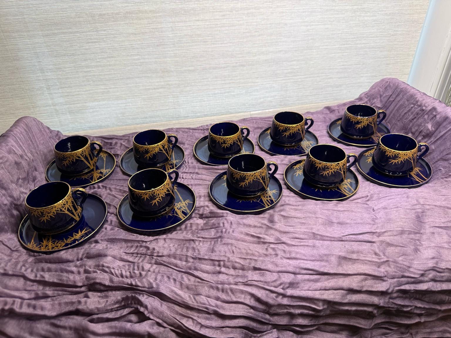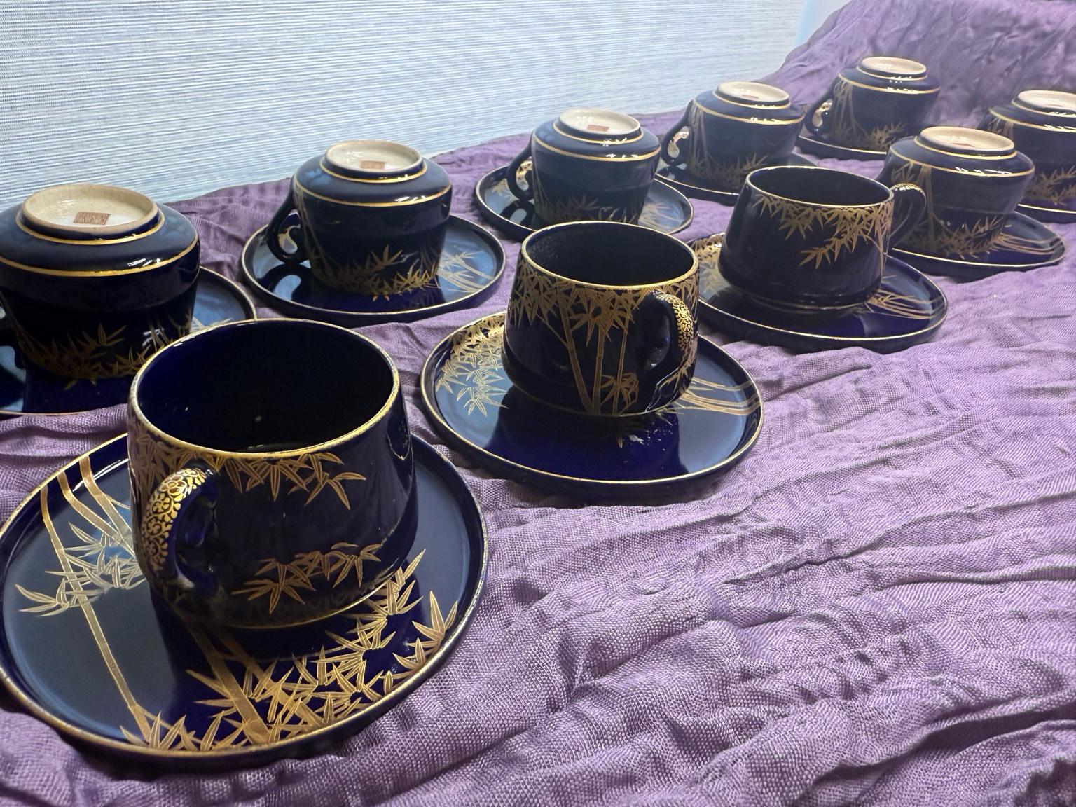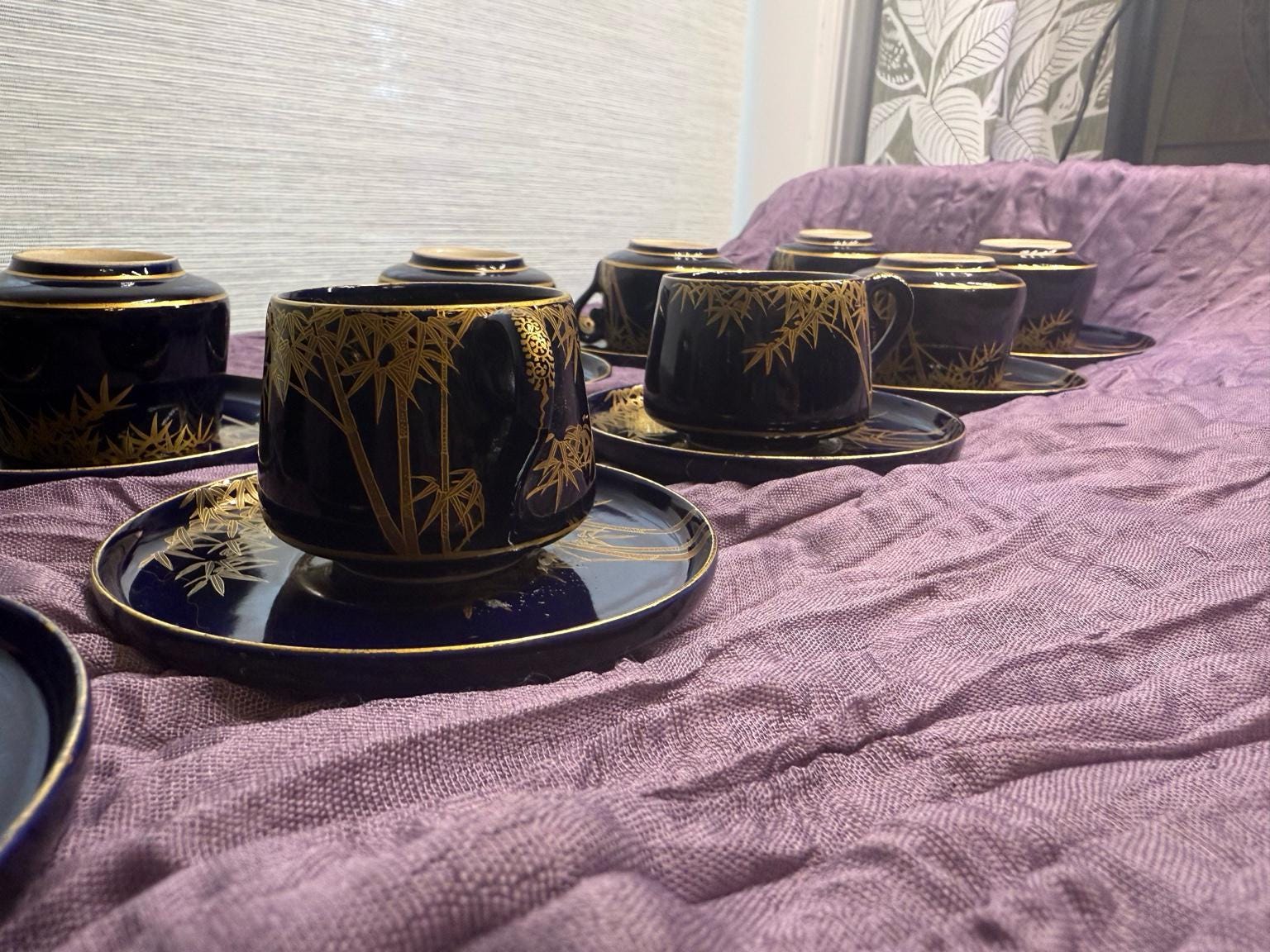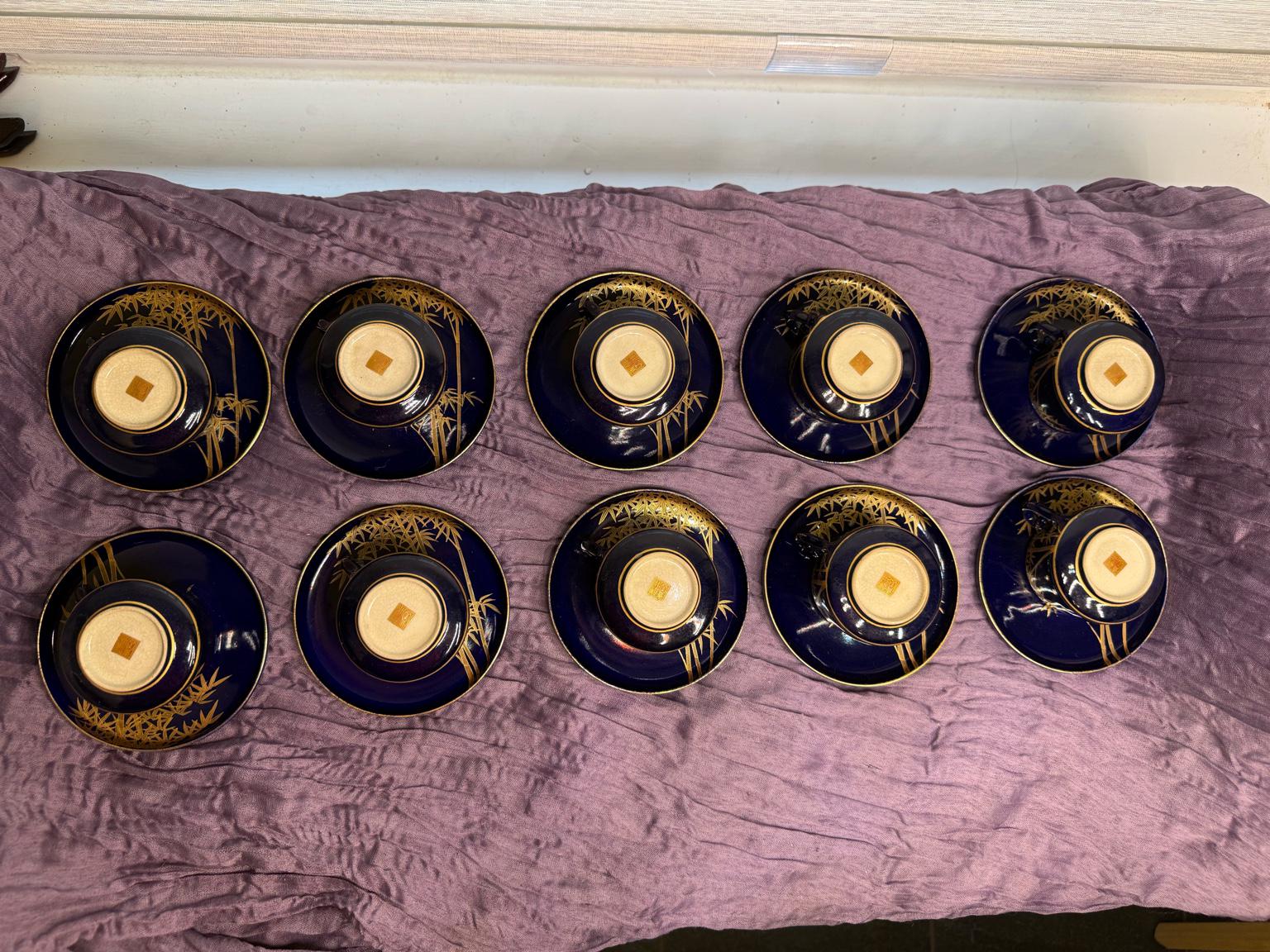 This listing is for one cup and one matching saucer. The porcelain is finished in a deep cobalt glaze with a gold bamboo design. The cup’s handle and rim are also detailed in gold. Each piece carries the Kutani (九谷焼) mark on the base, showing its origin from Ishikawa Prefecture, Japan.