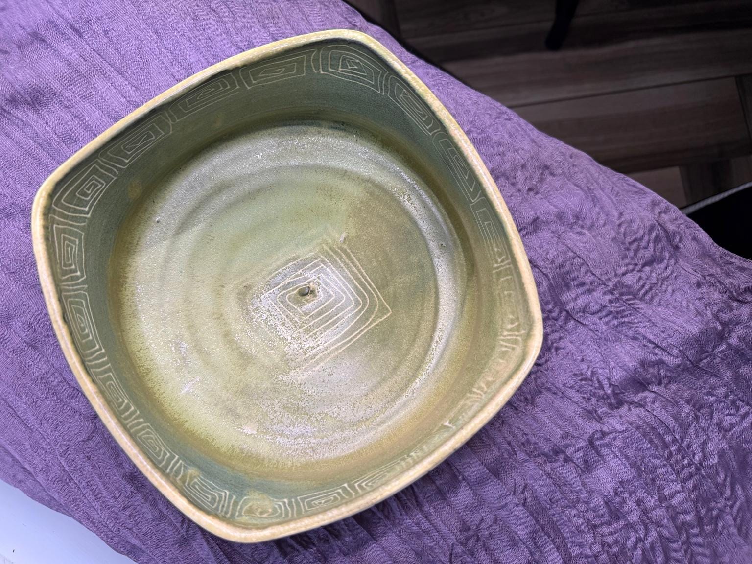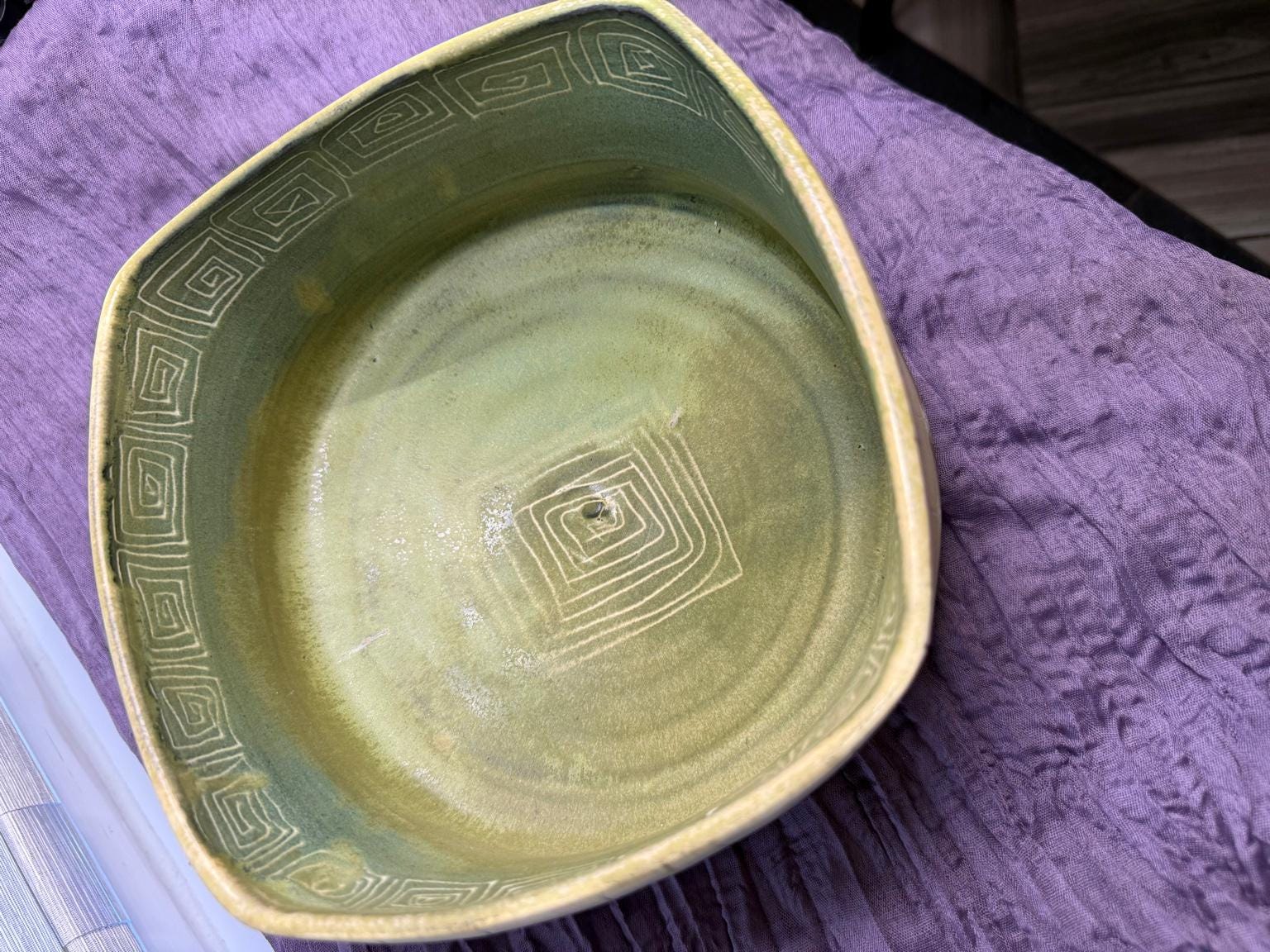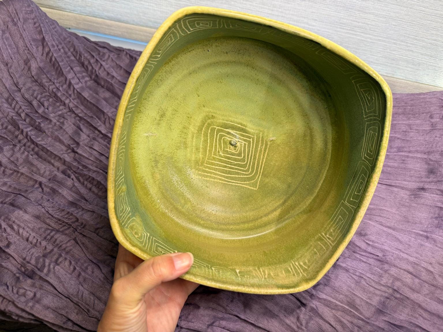 The bowl features a unique rounded-square form with softly flared edges, glazed in earthy tones of olive green and warm yellow. Along the inner rim, a mesmerizing spiral geometric pattern dances around the bowl, echoing into its center like ripples of time.