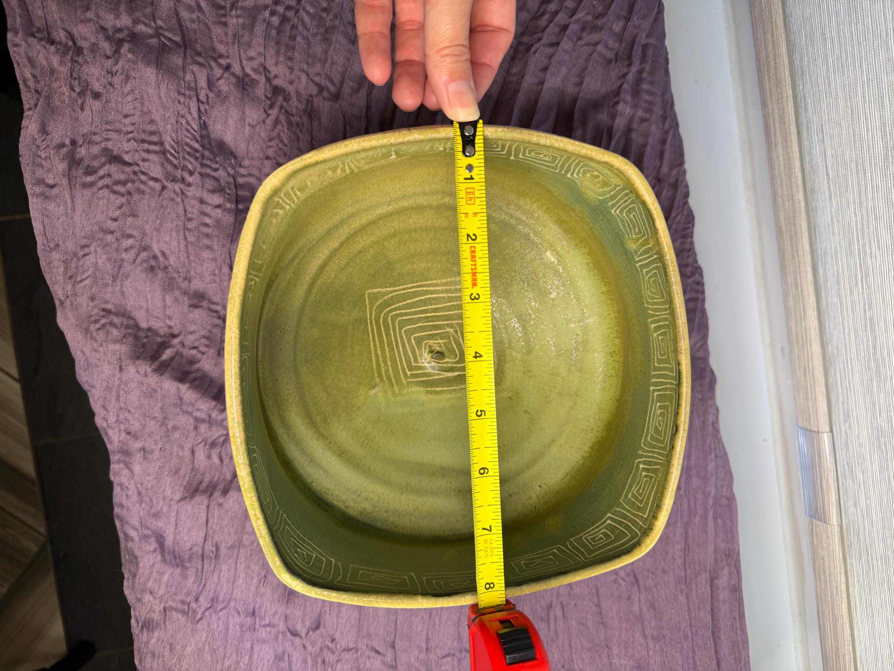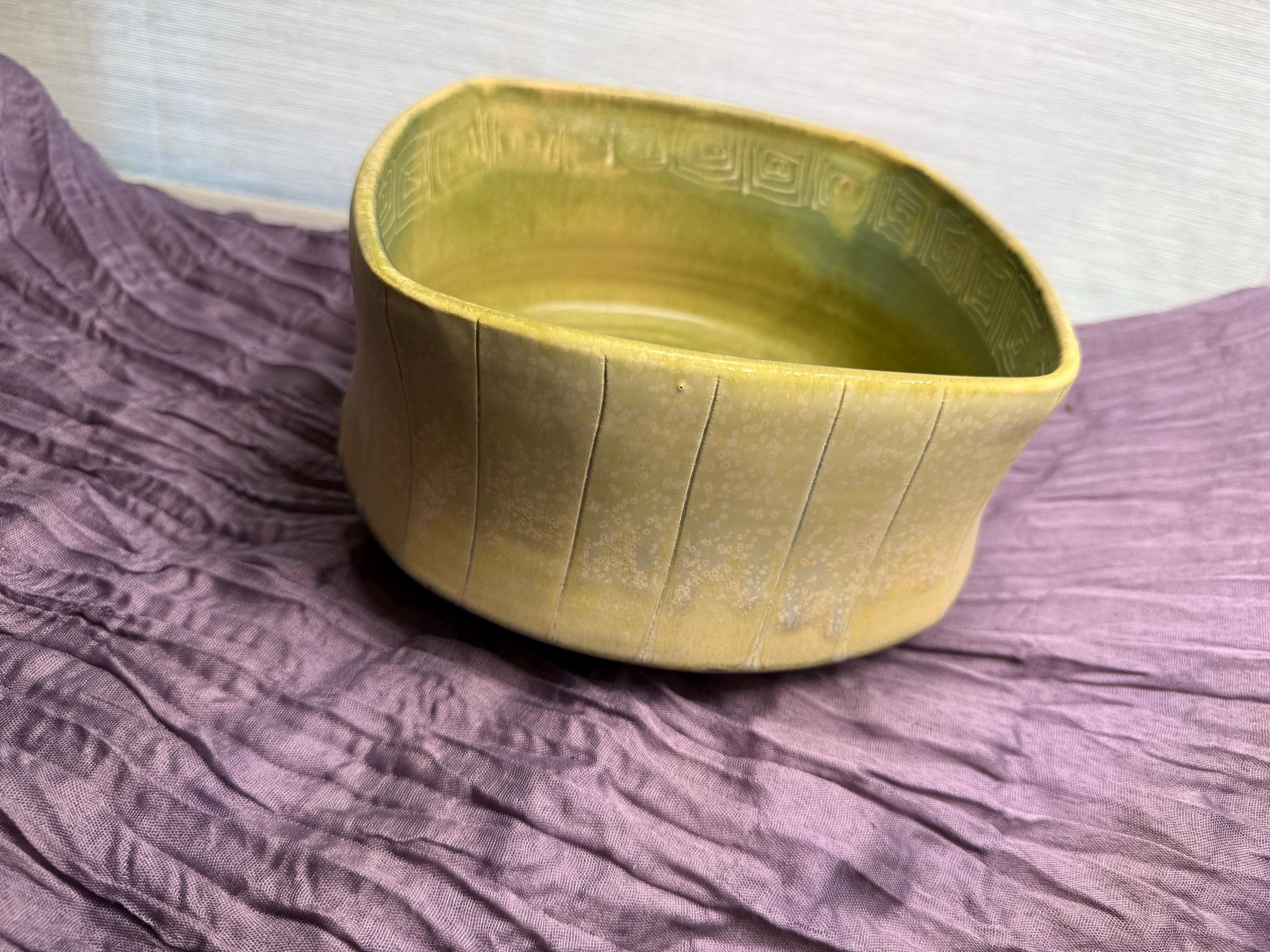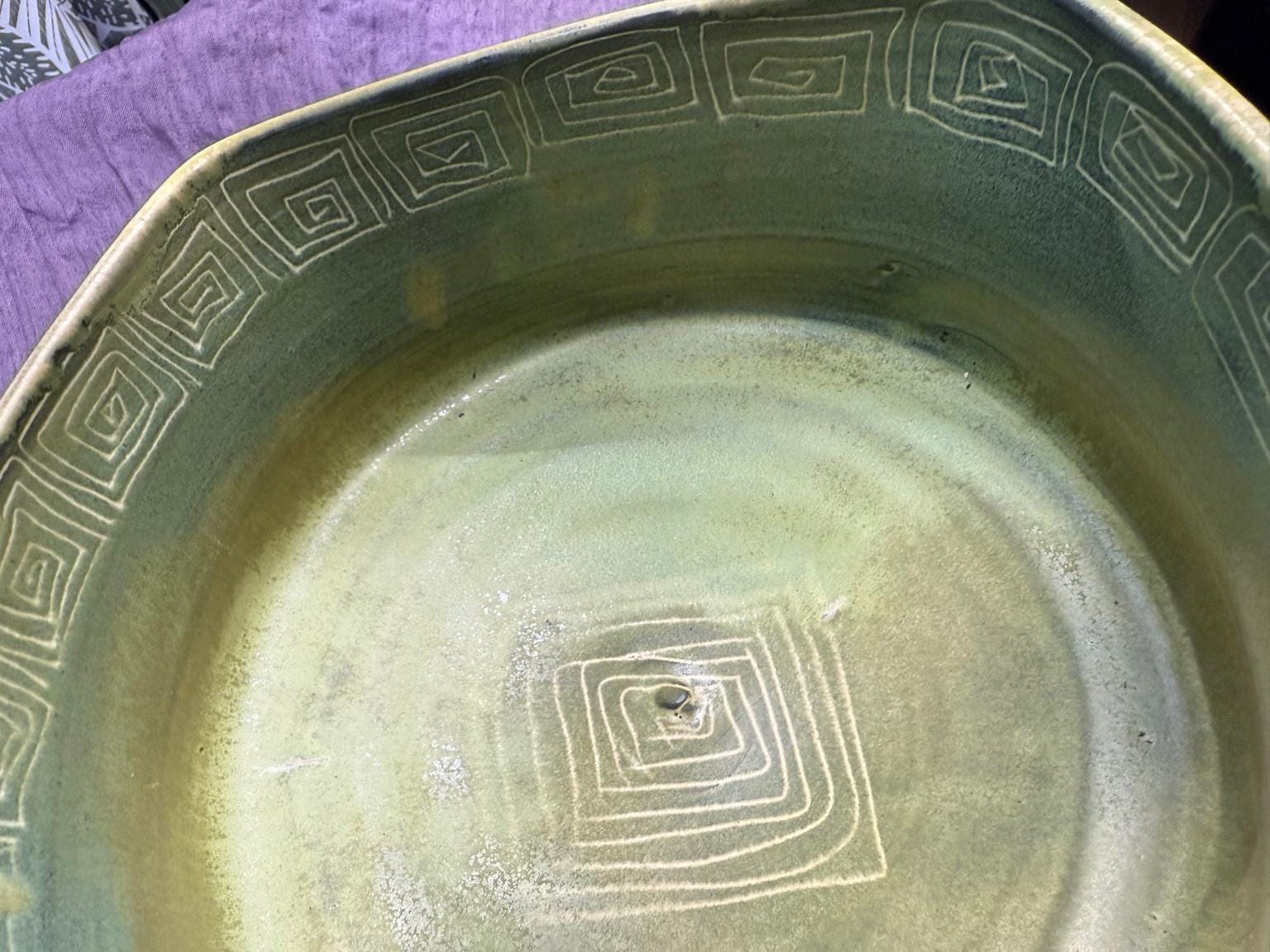 The bowl features a unique rounded-square form with softly flared edges, glazed in earthy tones of olive green and warm yellow. Along the inner rim, a mesmerizing spiral geometric pattern dances around the bowl, echoing into its center like ripples of time.
