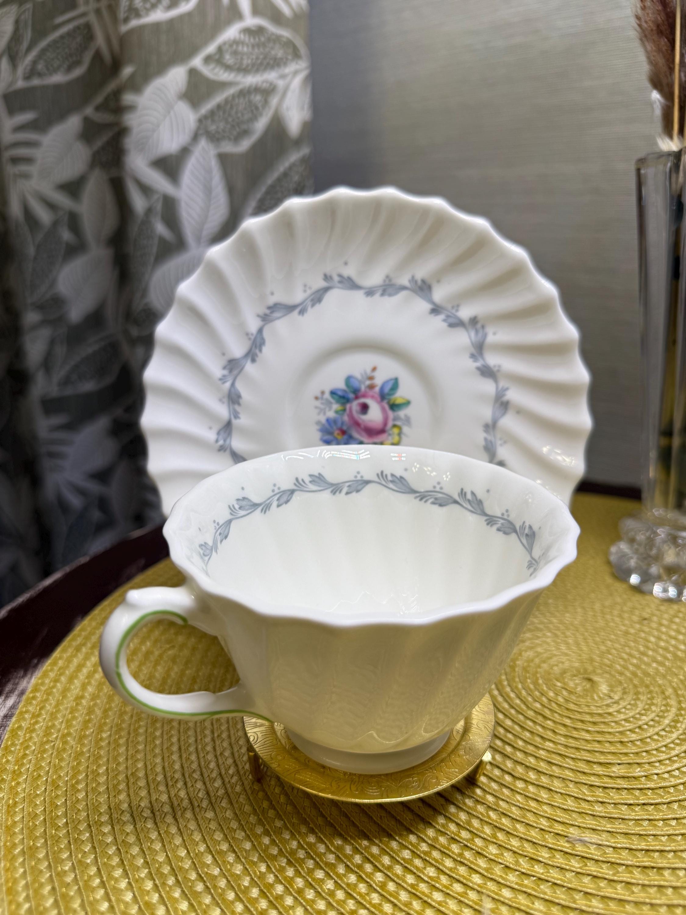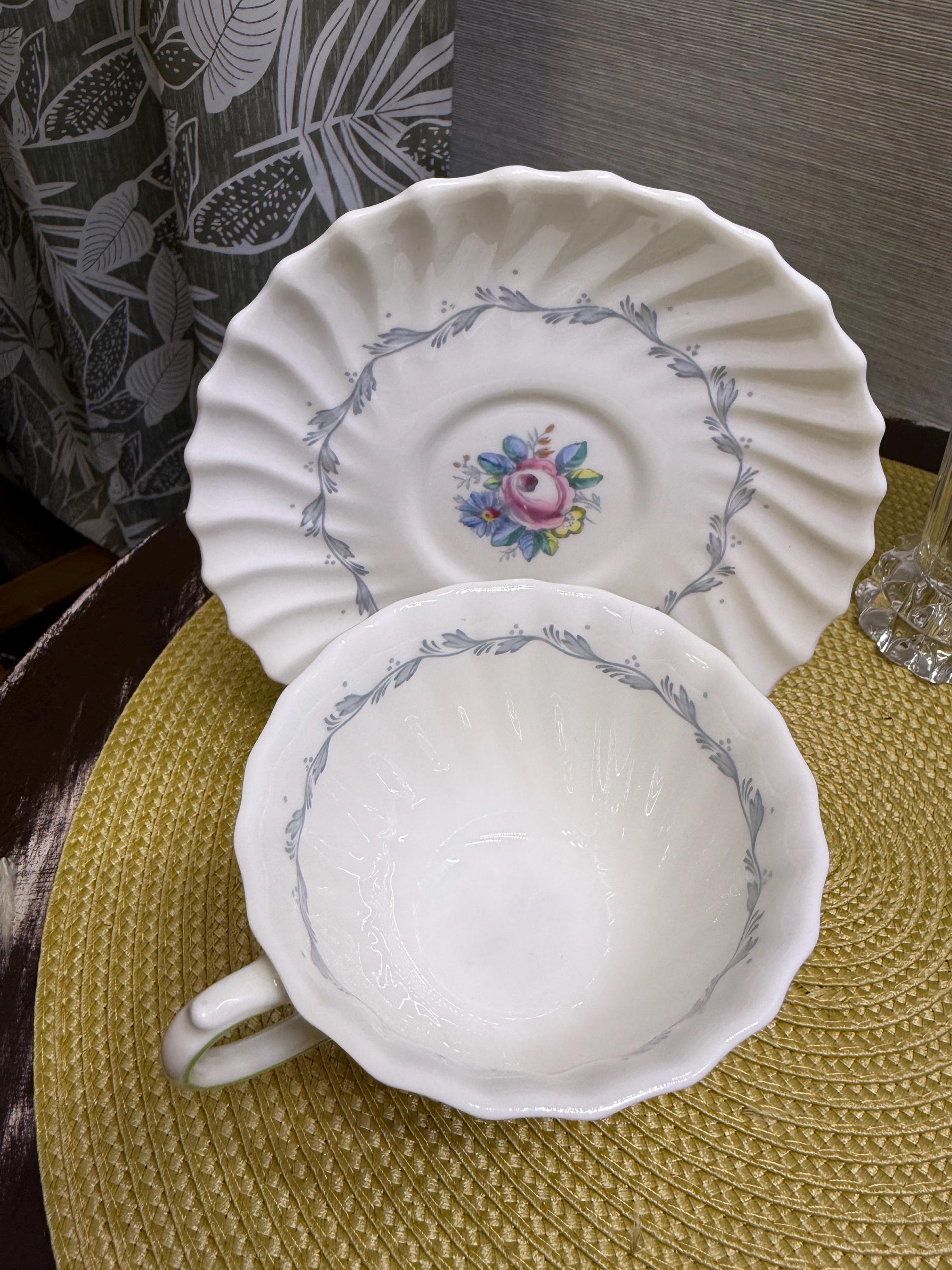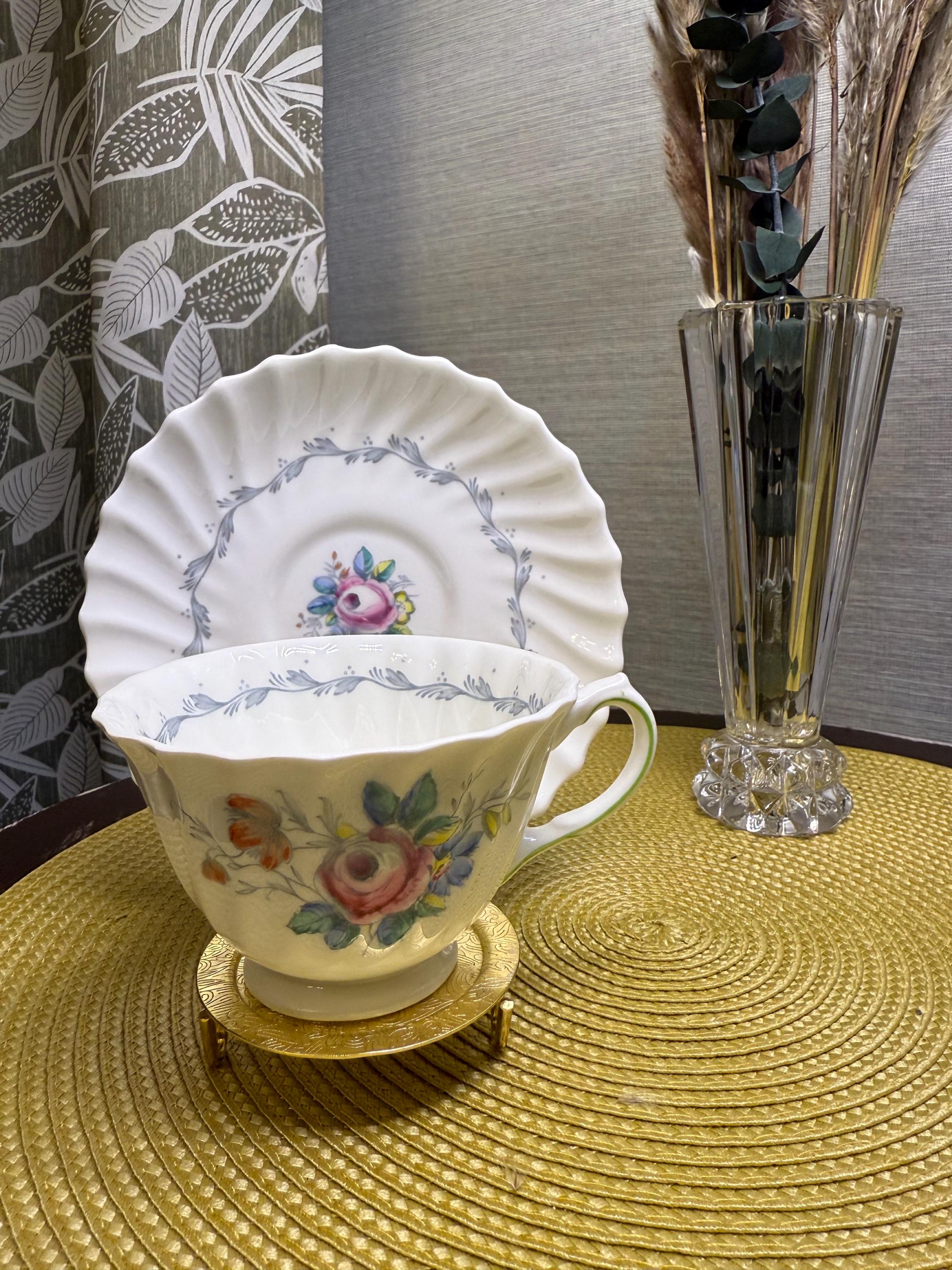 Crafted in England from fine bone China, this vintage duo embodies mid-century charm with its scalloped fluted edges, hand-painted floral bouquet, and soft, green-trimmed handle. A delicate gray garland encircles the rim, framing a rose centerpiece that feels straight from an English garden in bloom.