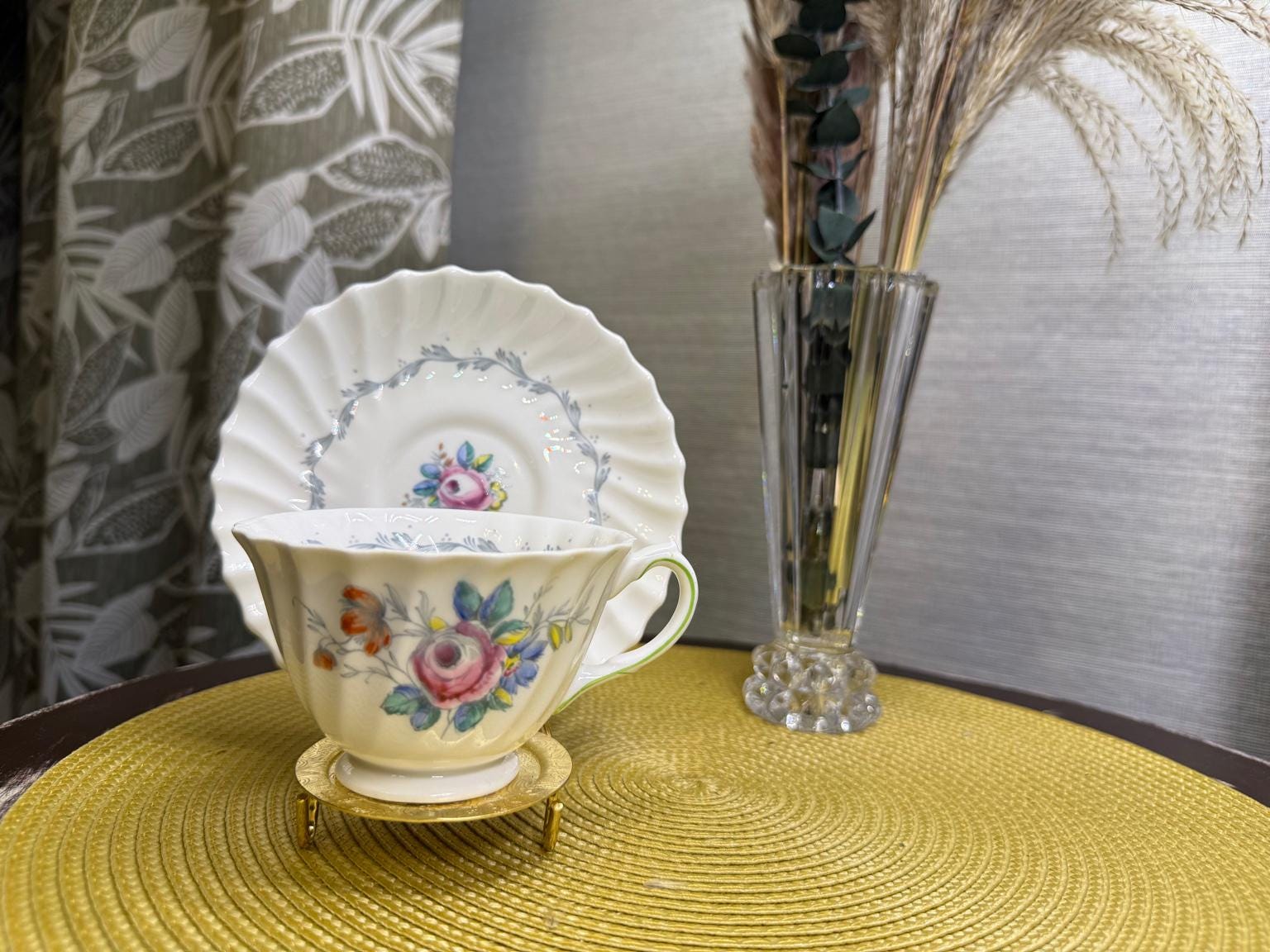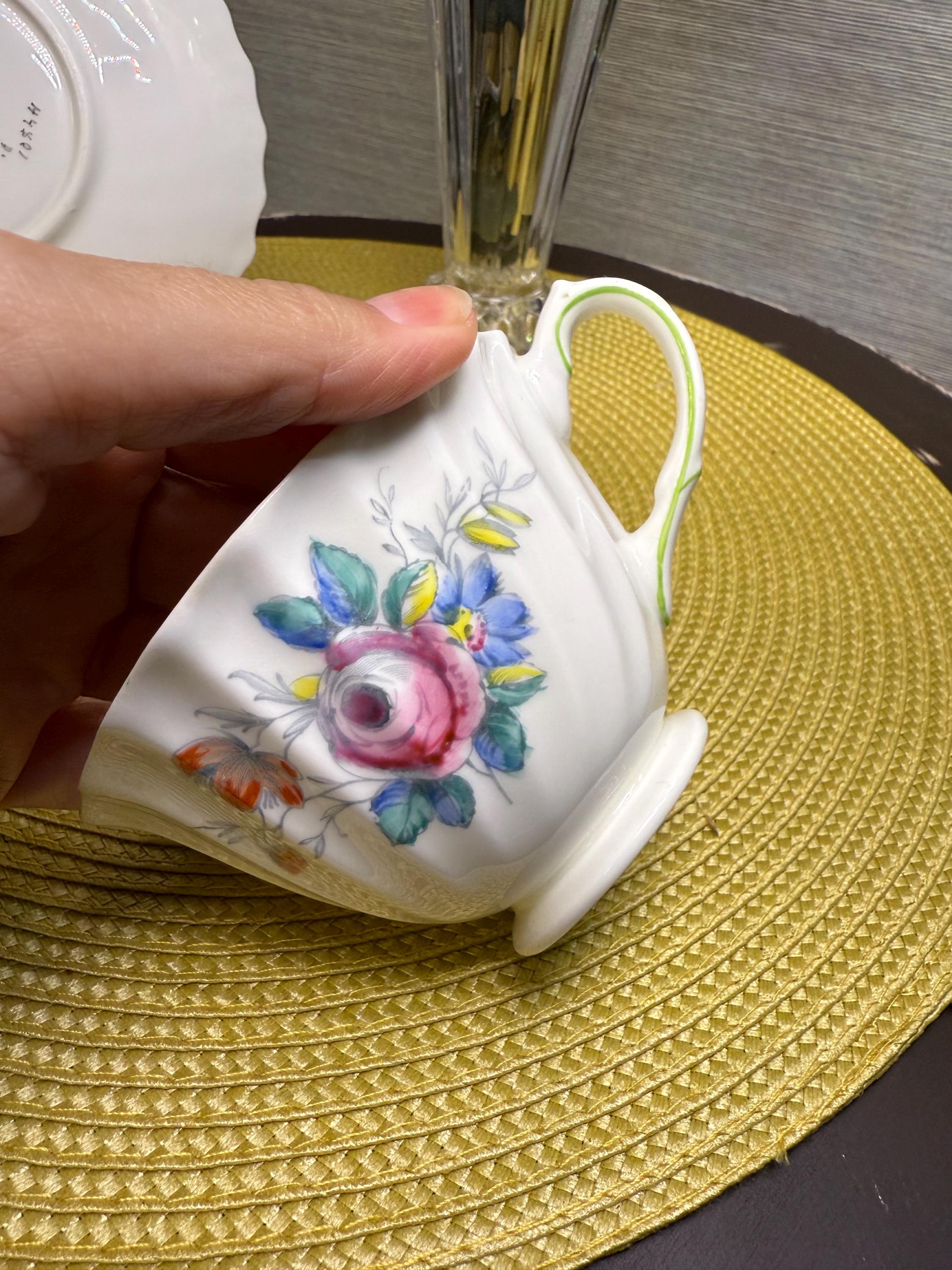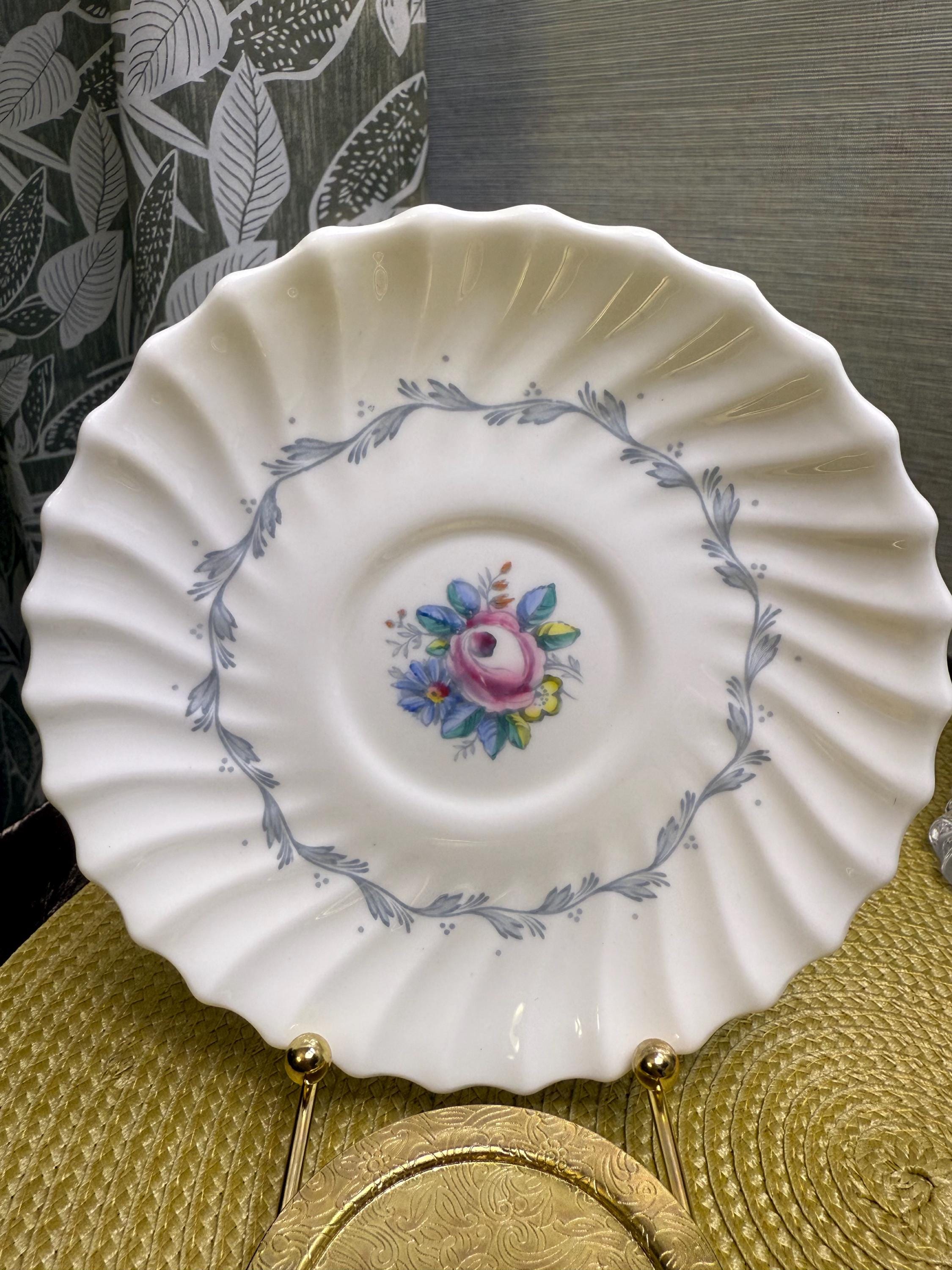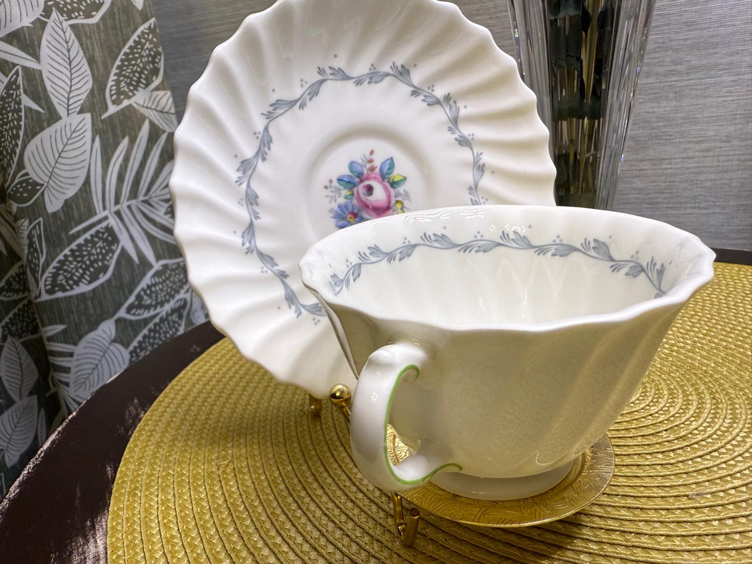 Crafted in England from fine bone China, this vintage duo embodies mid-century charm with its scalloped fluted edges, hand-painted floral bouquet, and soft, green-trimmed handle. A delicate gray garland encircles the rim, framing a rose centerpiece that feels straight from an English garden in bloom.
