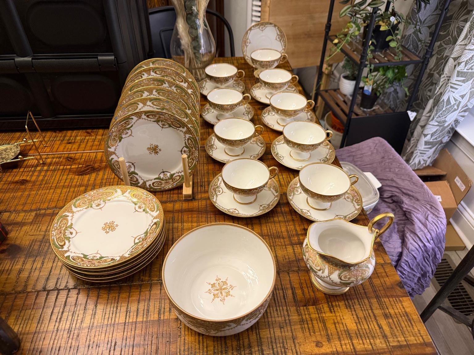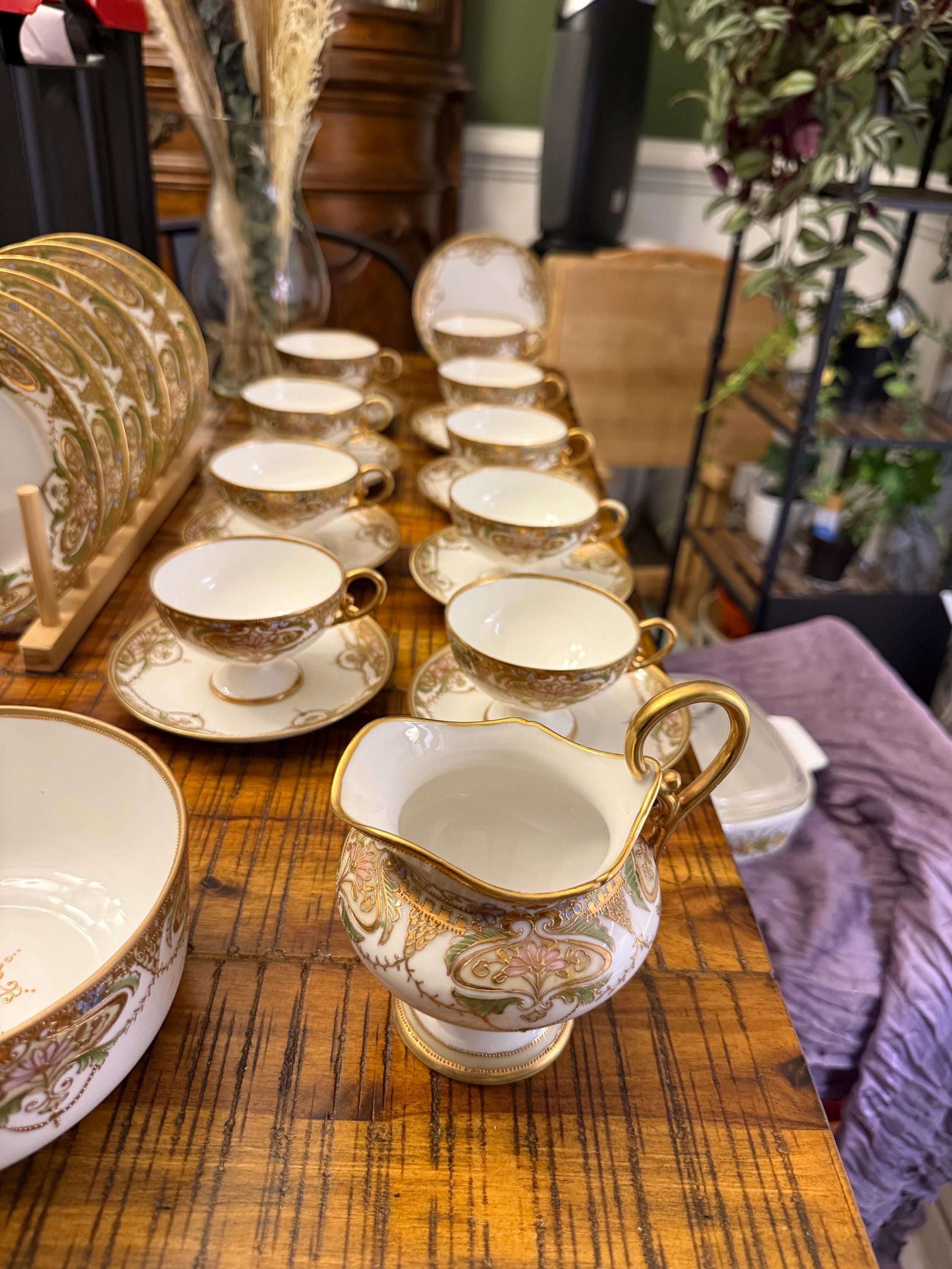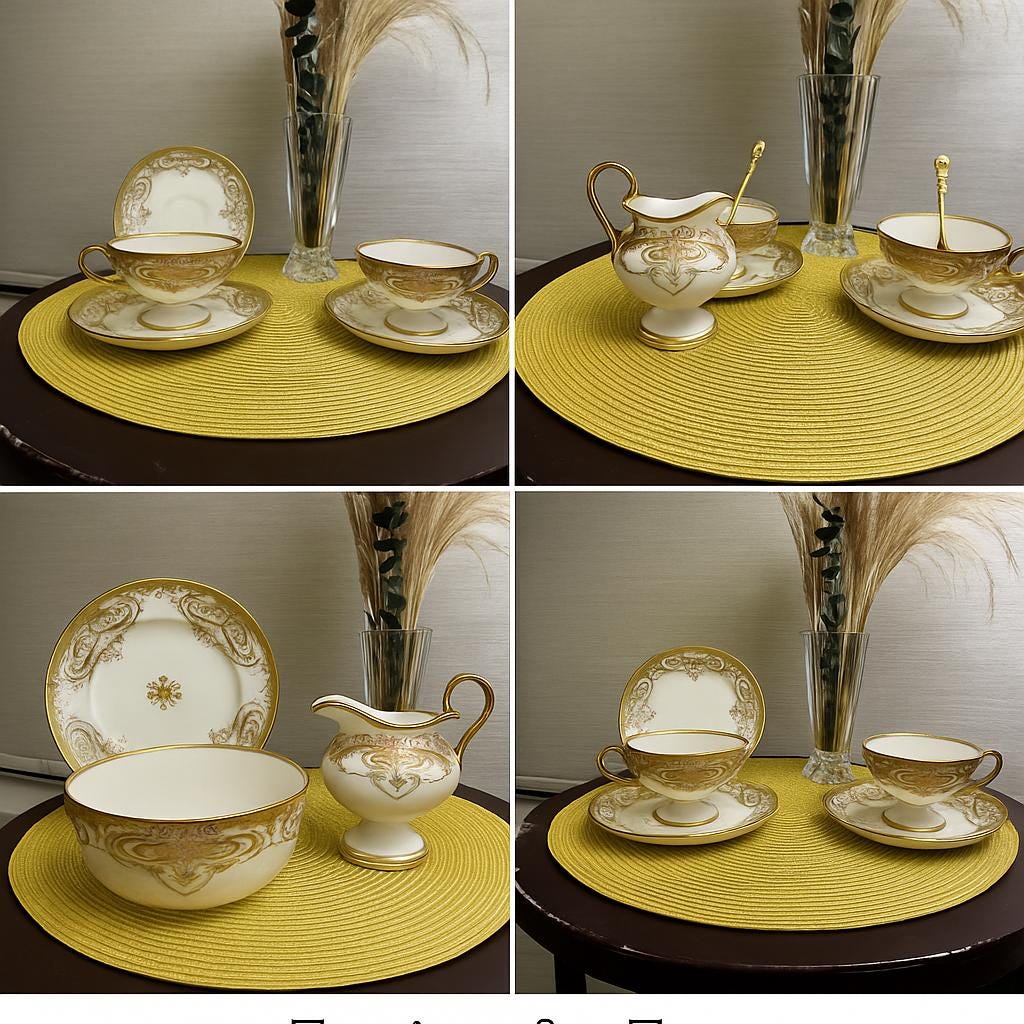 Each piece of this luxurious porcelain collection gleams with hand-applied 24K gold, raised enamel scrollwork, and soft pastel floral detailing. Crafted in Japan between 1955–1962, the “Vendome” pattern comes from Noritake’s Venerable Classics line — a post-war revival that reintroduced fine hand-painted porcelain and gold-gilded design to the modern home.