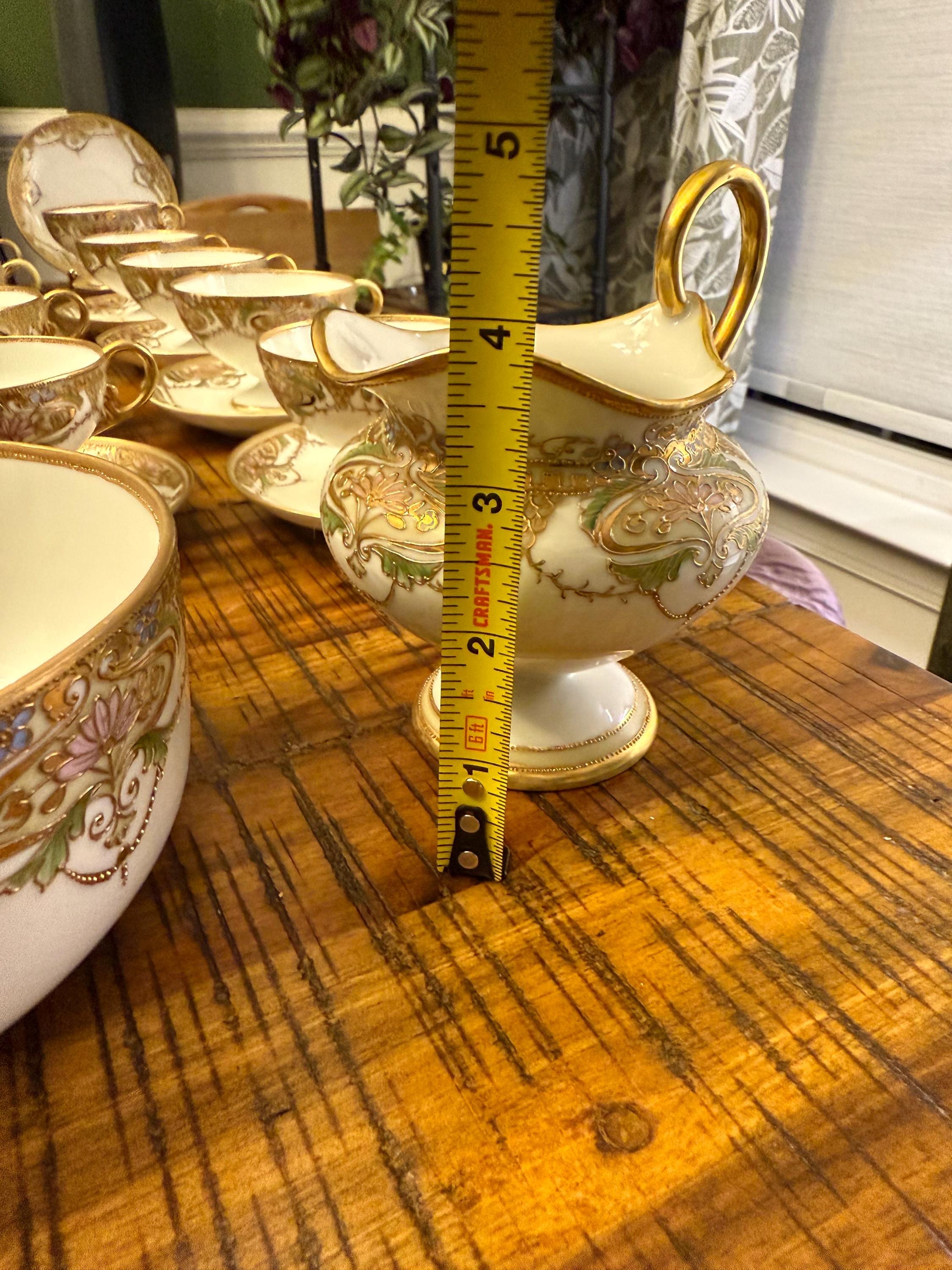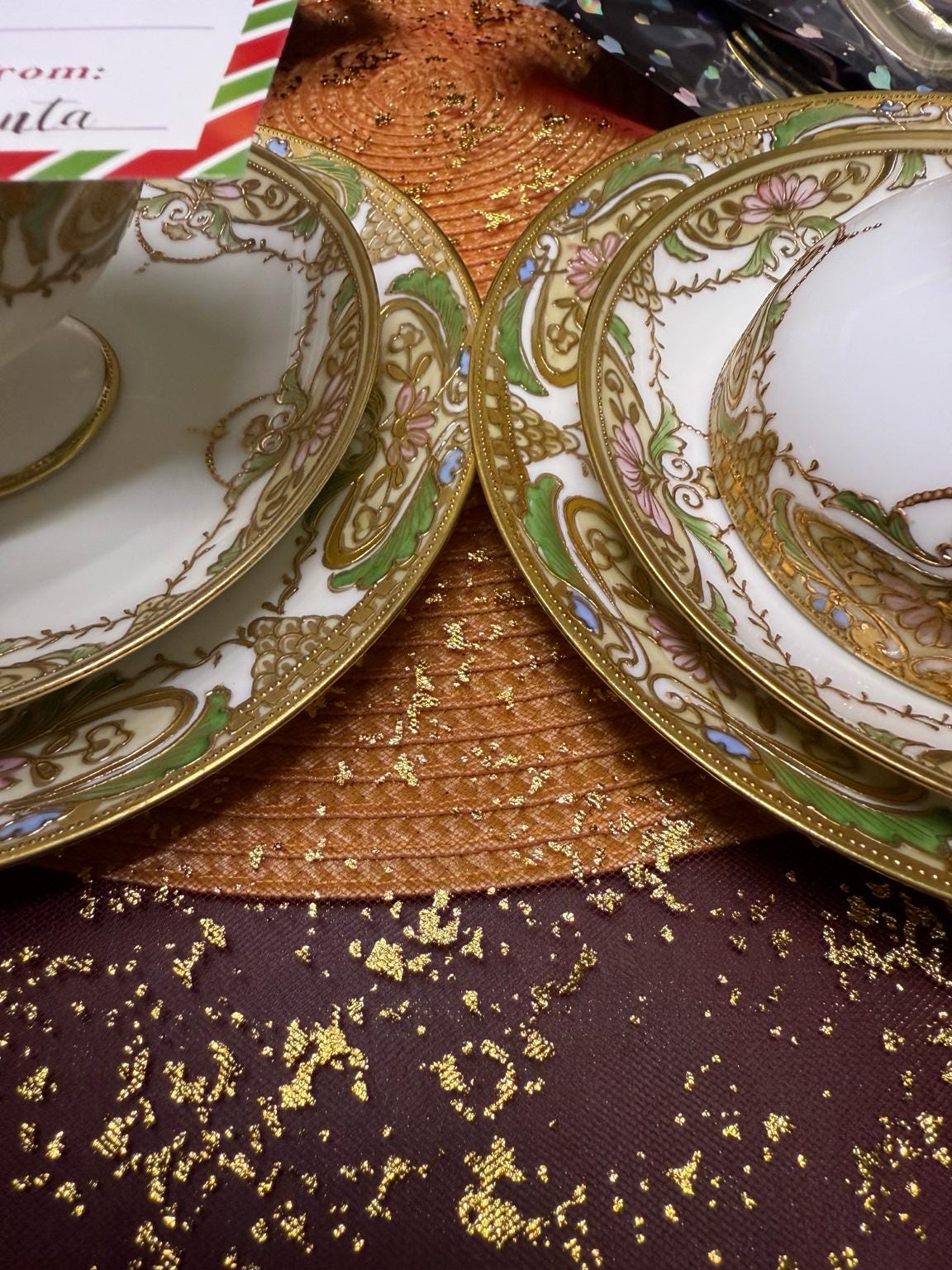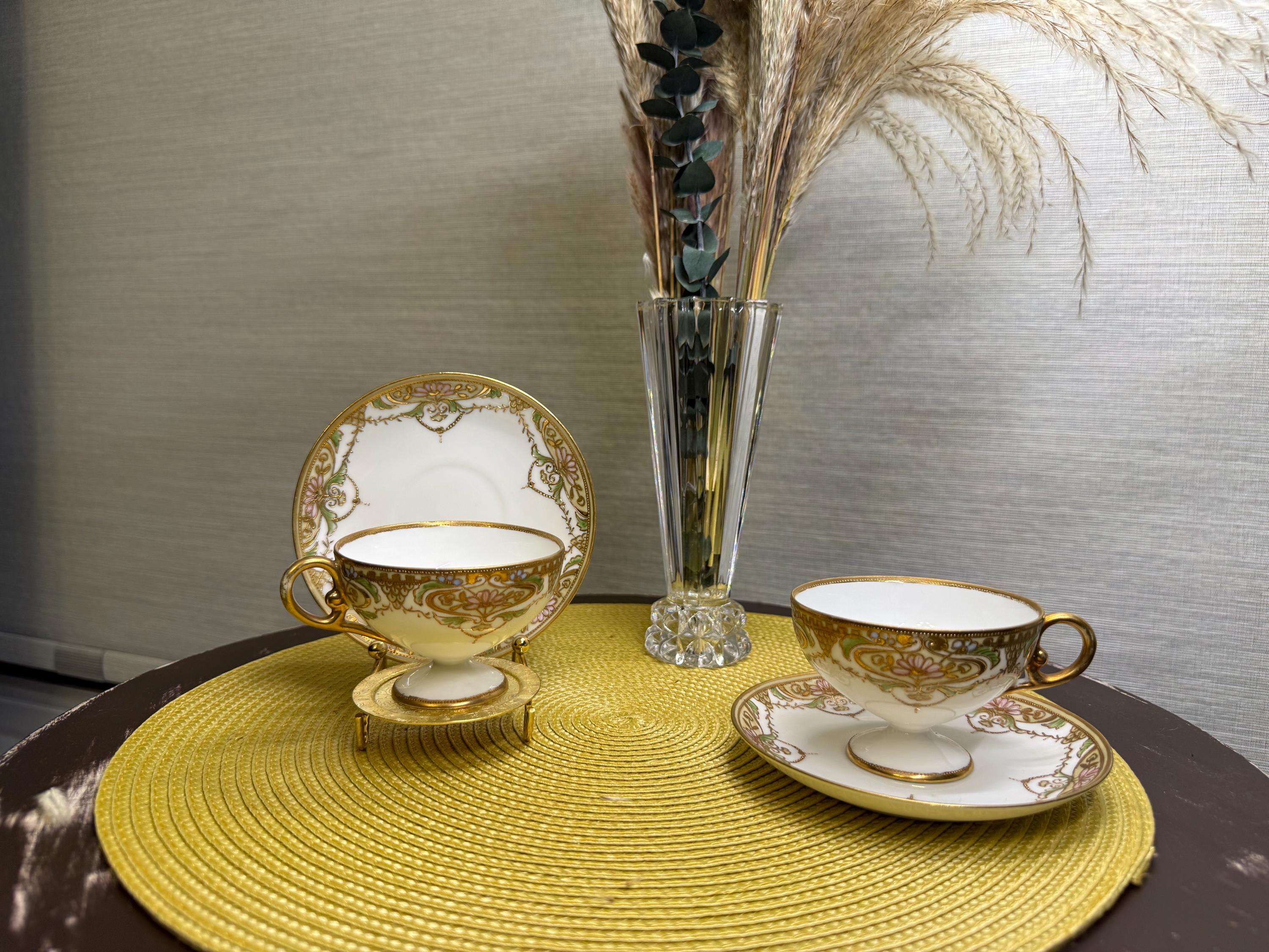 Each piece of this luxurious porcelain collection gleams with hand-applied 24K gold, raised enamel scrollwork, and soft pastel floral detailing. Crafted in Japan between 1955–1962, the “Vendome” pattern comes from Noritake’s Venerable Classics line — a post-war revival that reintroduced fine hand-painted porcelain and gold-gilded design to the modern home.