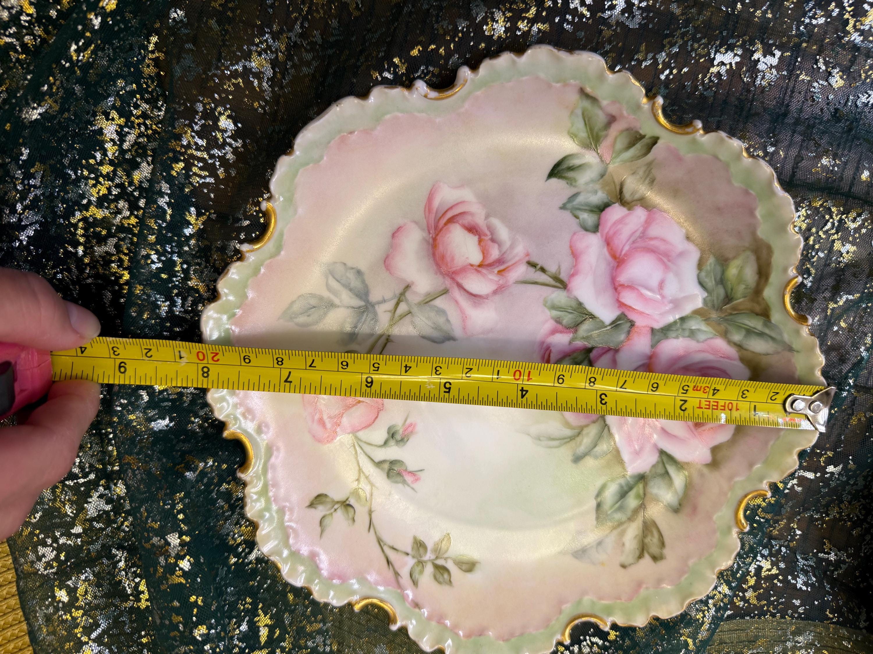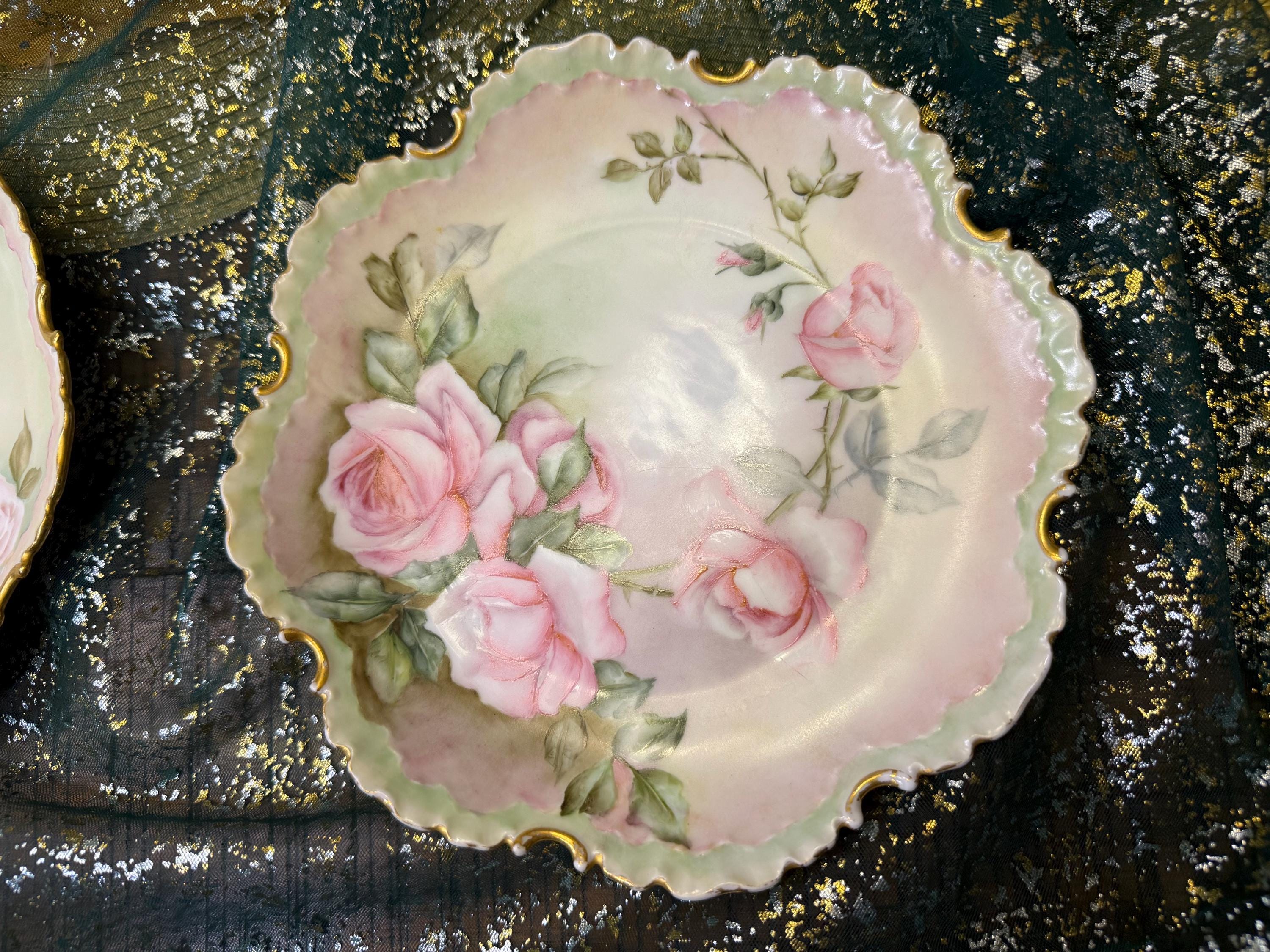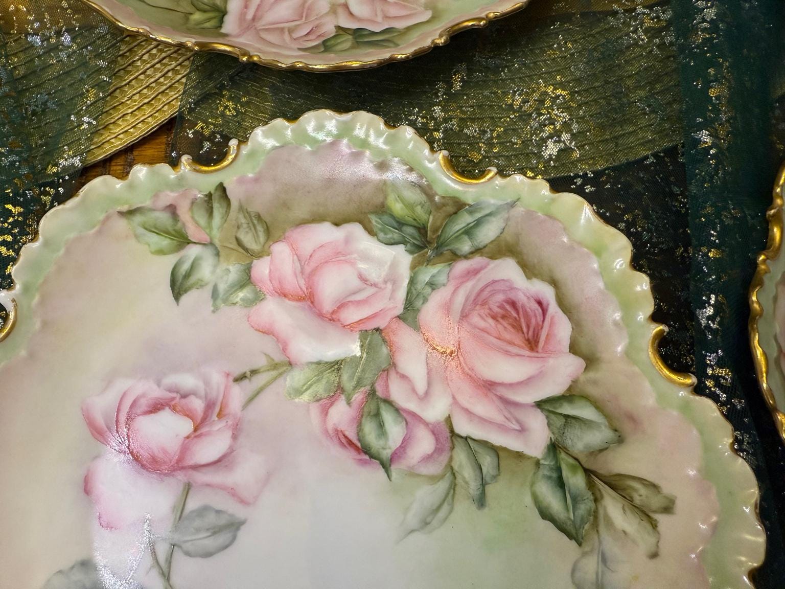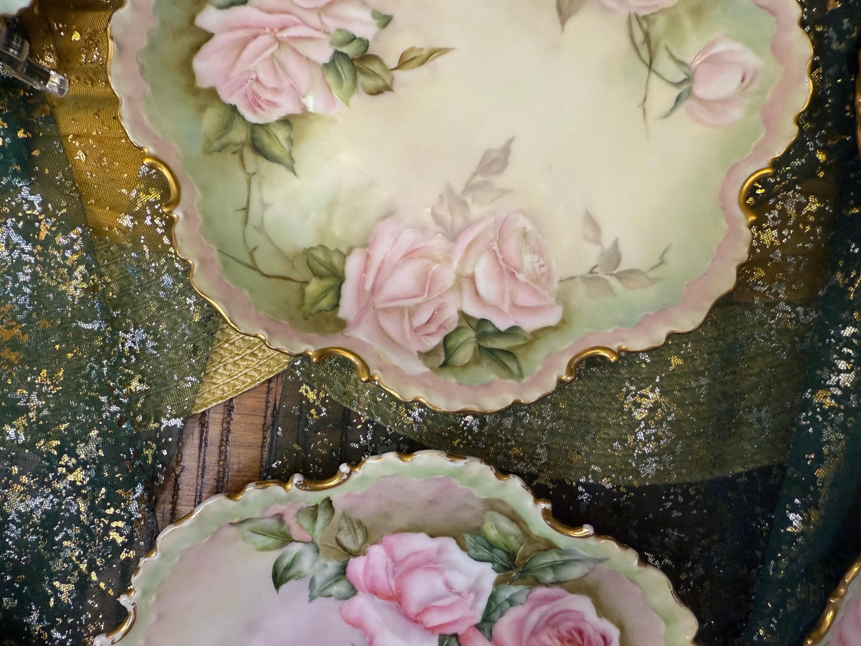Bring the beauty of hand-painted Bavarian porcelain to your home with this exquisite set of six antique plates from Rosen Thale Monbijou, Bavaria. Each plate measures approximately 8 inches and features delicately hand-painted pink roses against soft pastel green and cream tones, finished with ornate scalloped edges and gold trim.