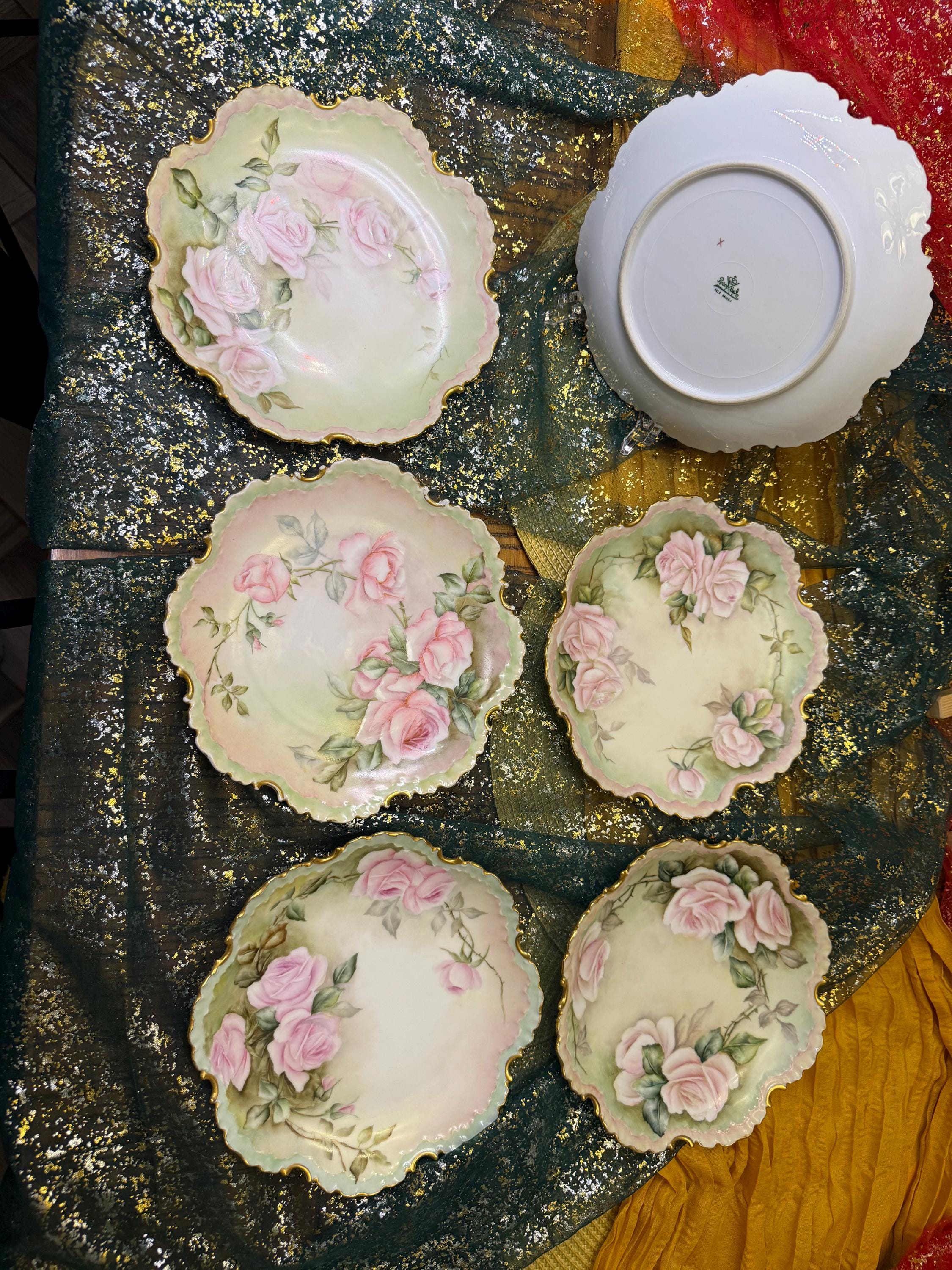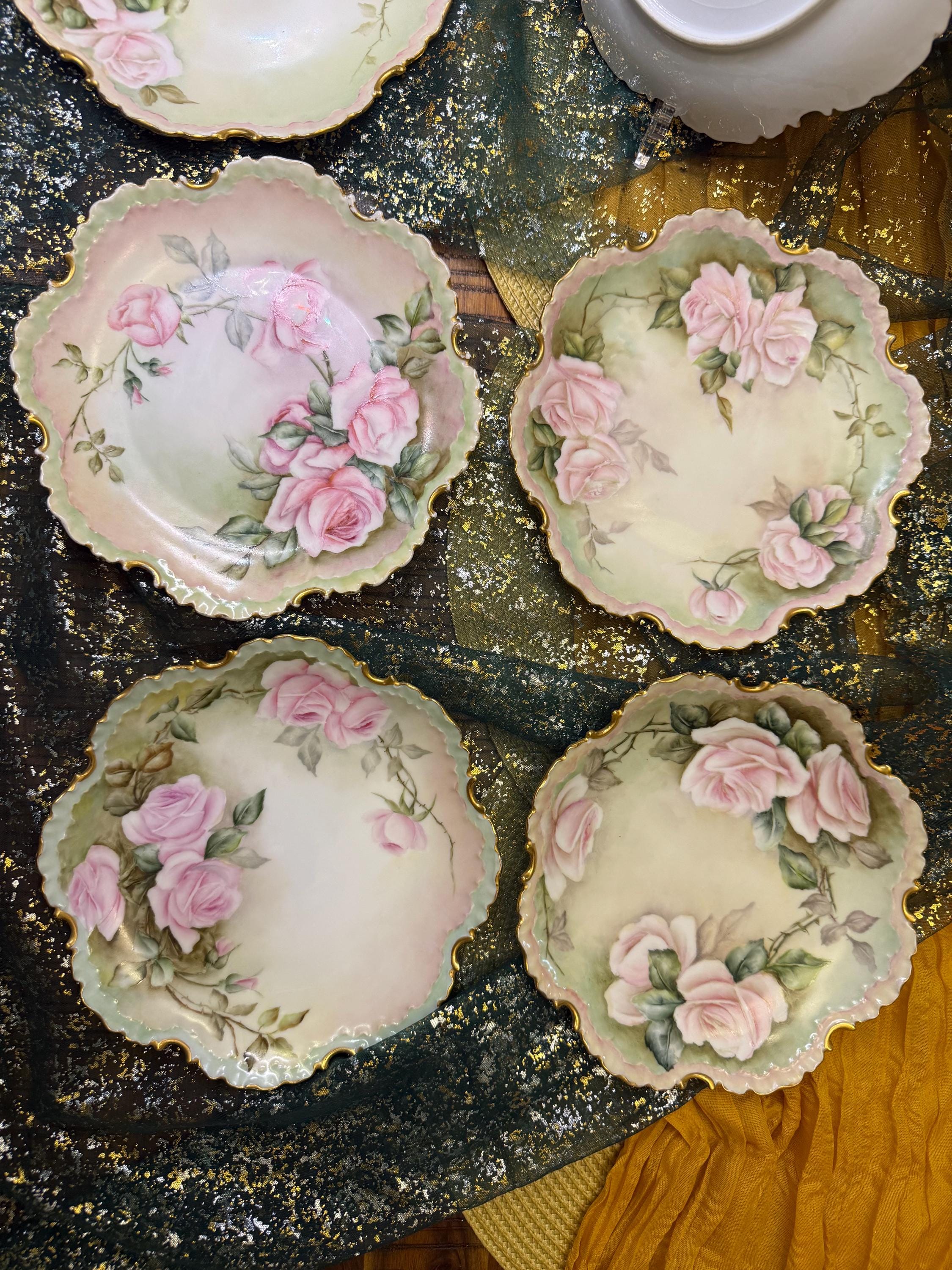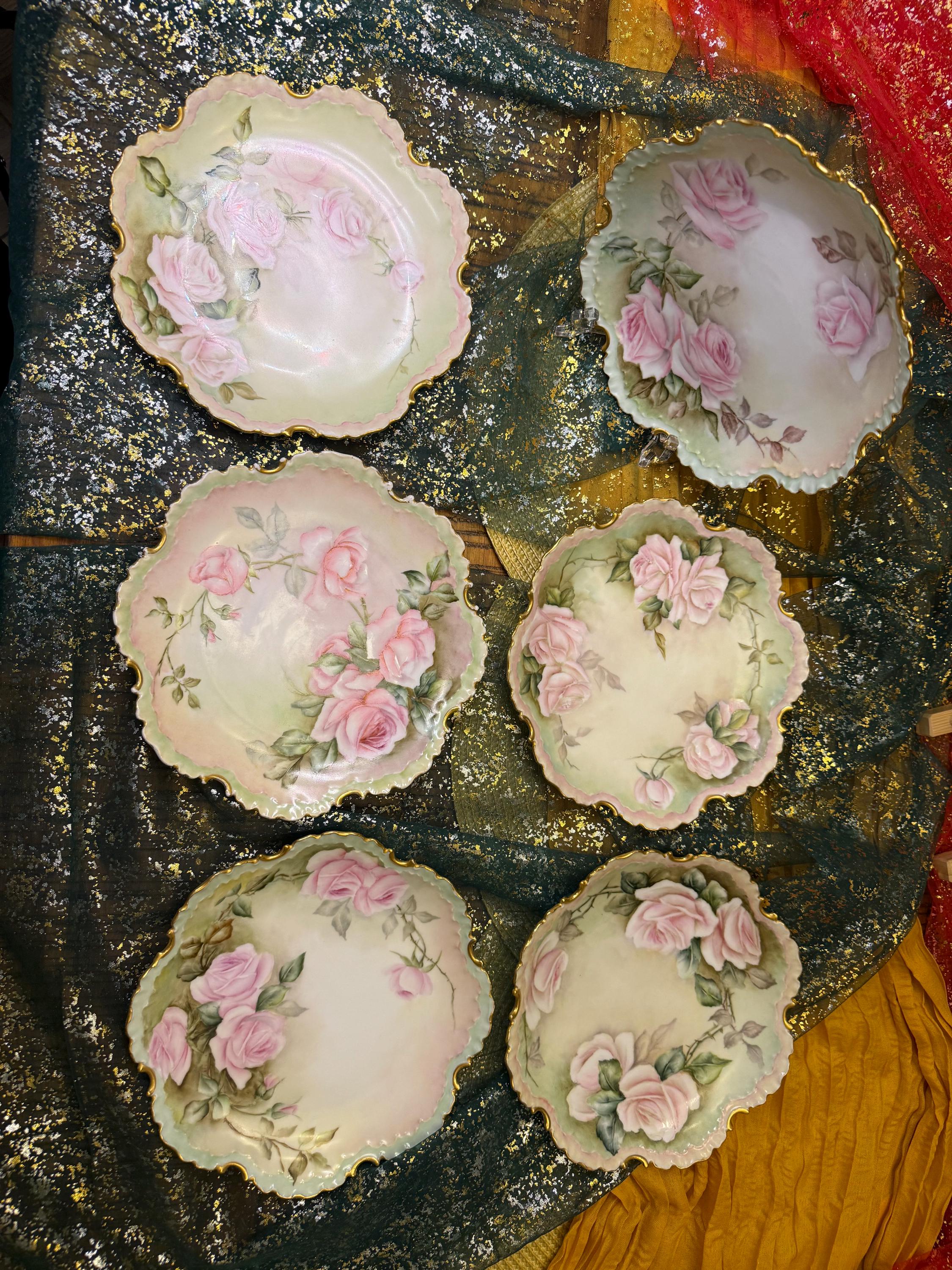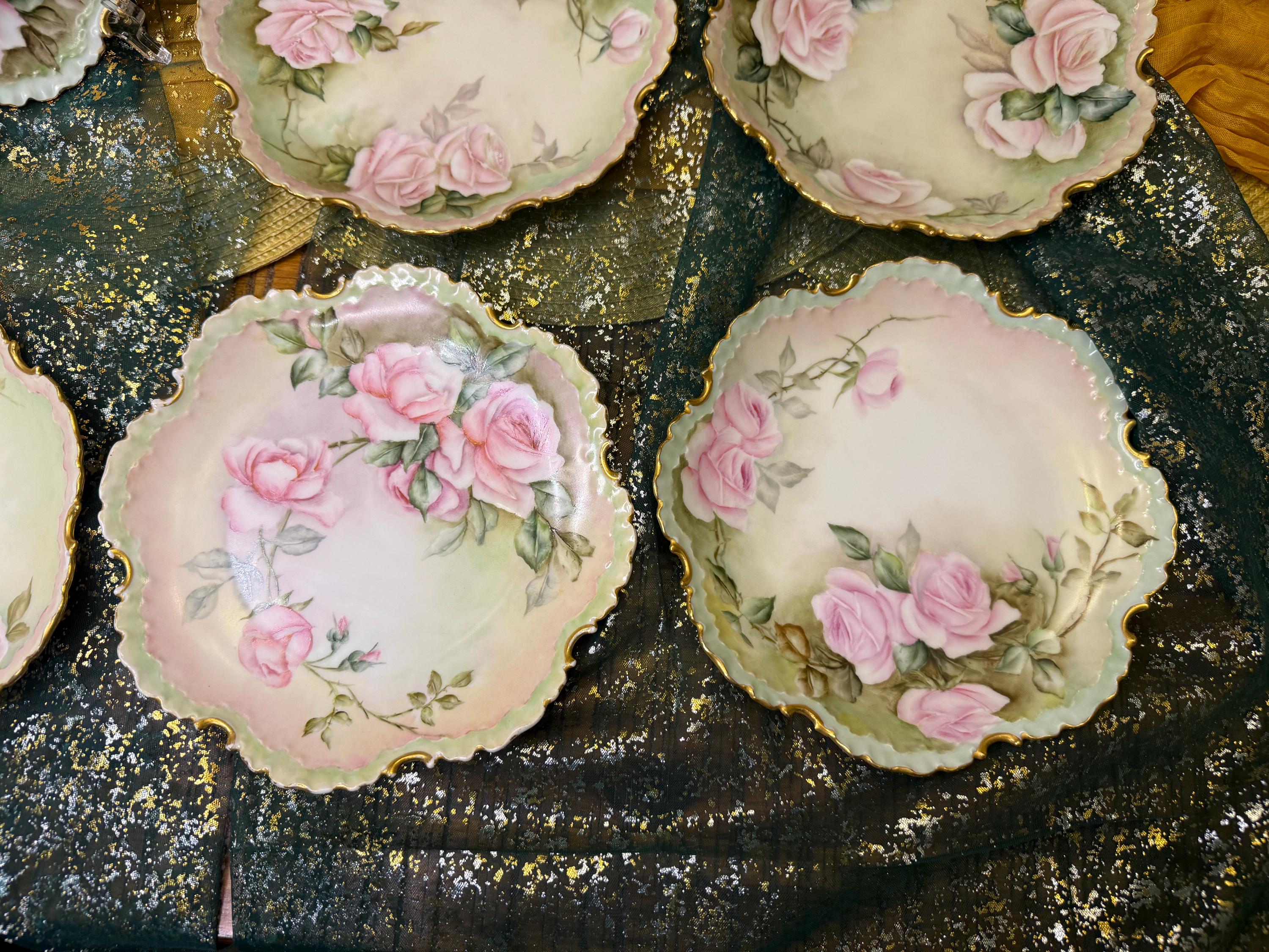 Bring the beauty of hand-painted Bavarian porcelain to your home with this exquisite set of six antique plates from Rosen Thale Monbijou, Bavaria. Each plate measures approximately 8 inches and features delicately hand-painted pink roses against soft pastel green and cream tones, finished with ornate scalloped edges and gold trim.
