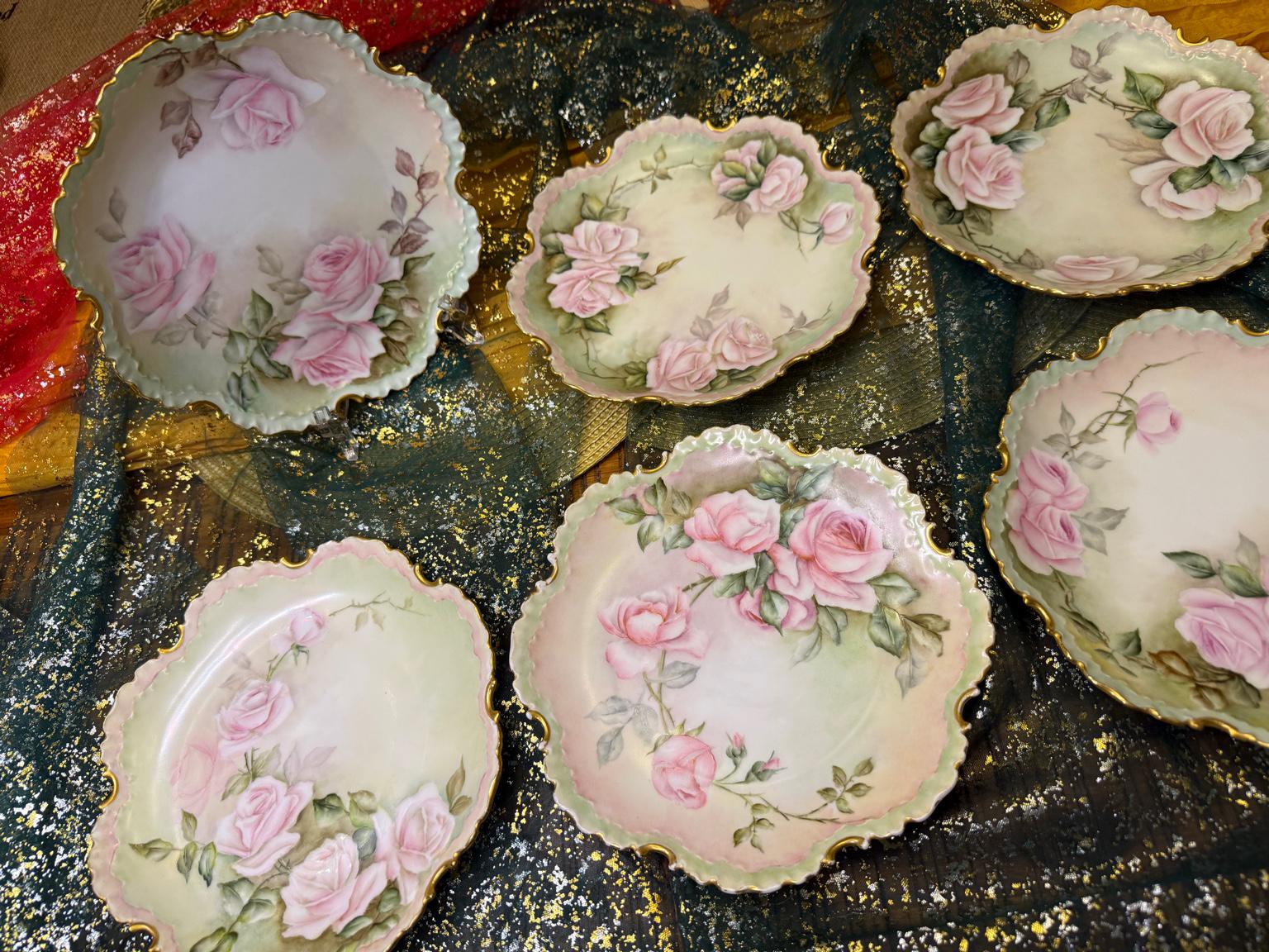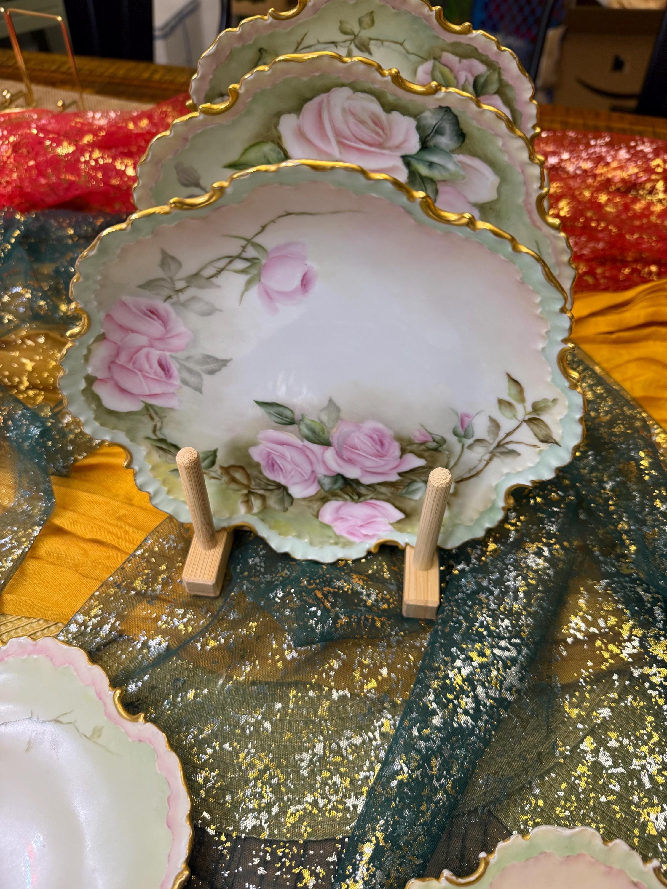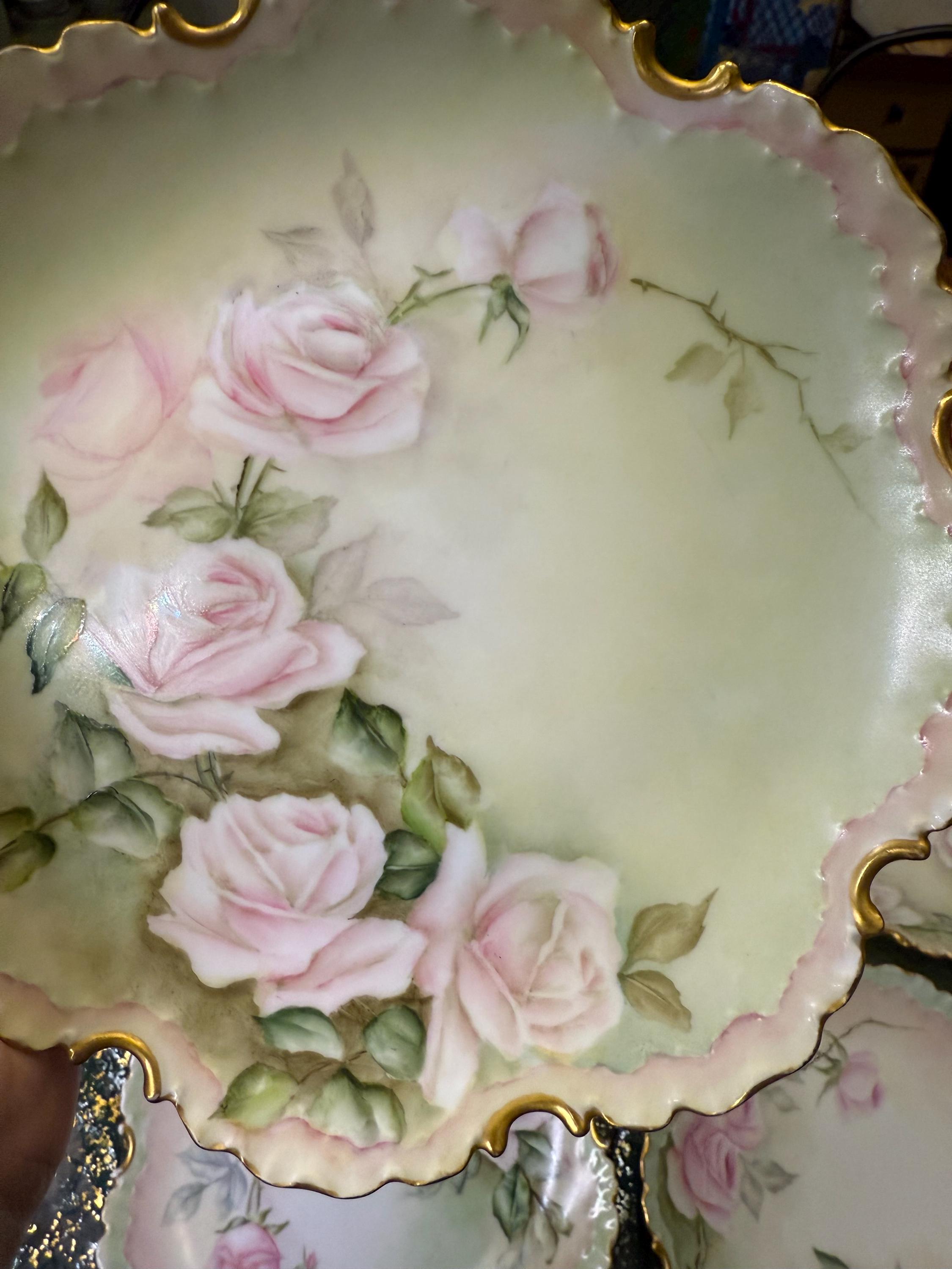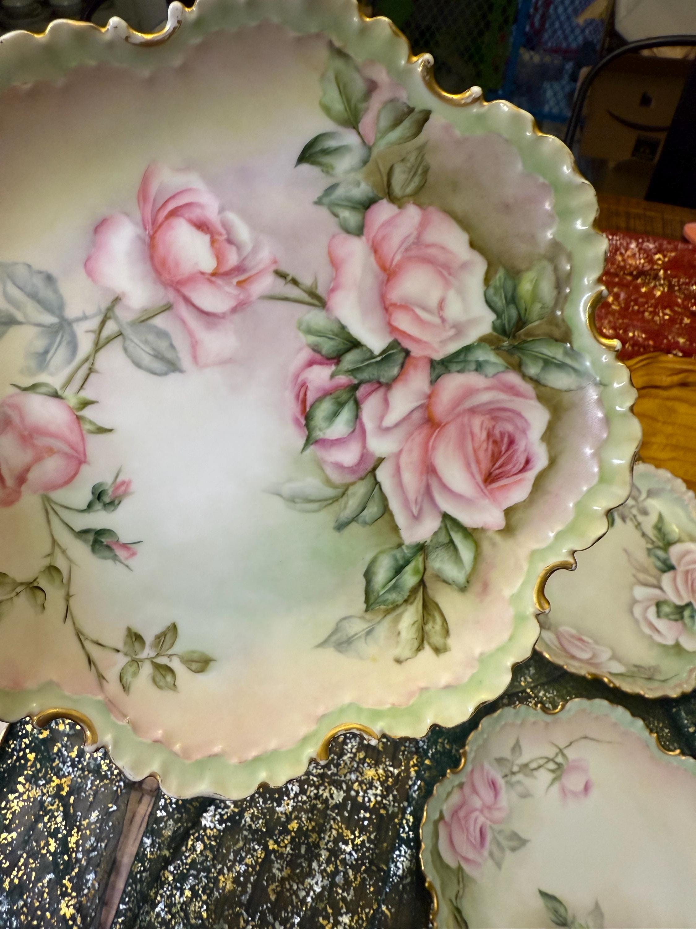 Bring the beauty of hand-painted Bavarian porcelain to your home with this exquisite set of six antique plates from Rosen Thale Monbijou, Bavaria. Each plate measures approximately 8 inches and features delicately hand-painted pink roses against soft pastel green and cream tones, finished with ornate scalloped edges and gold trim.