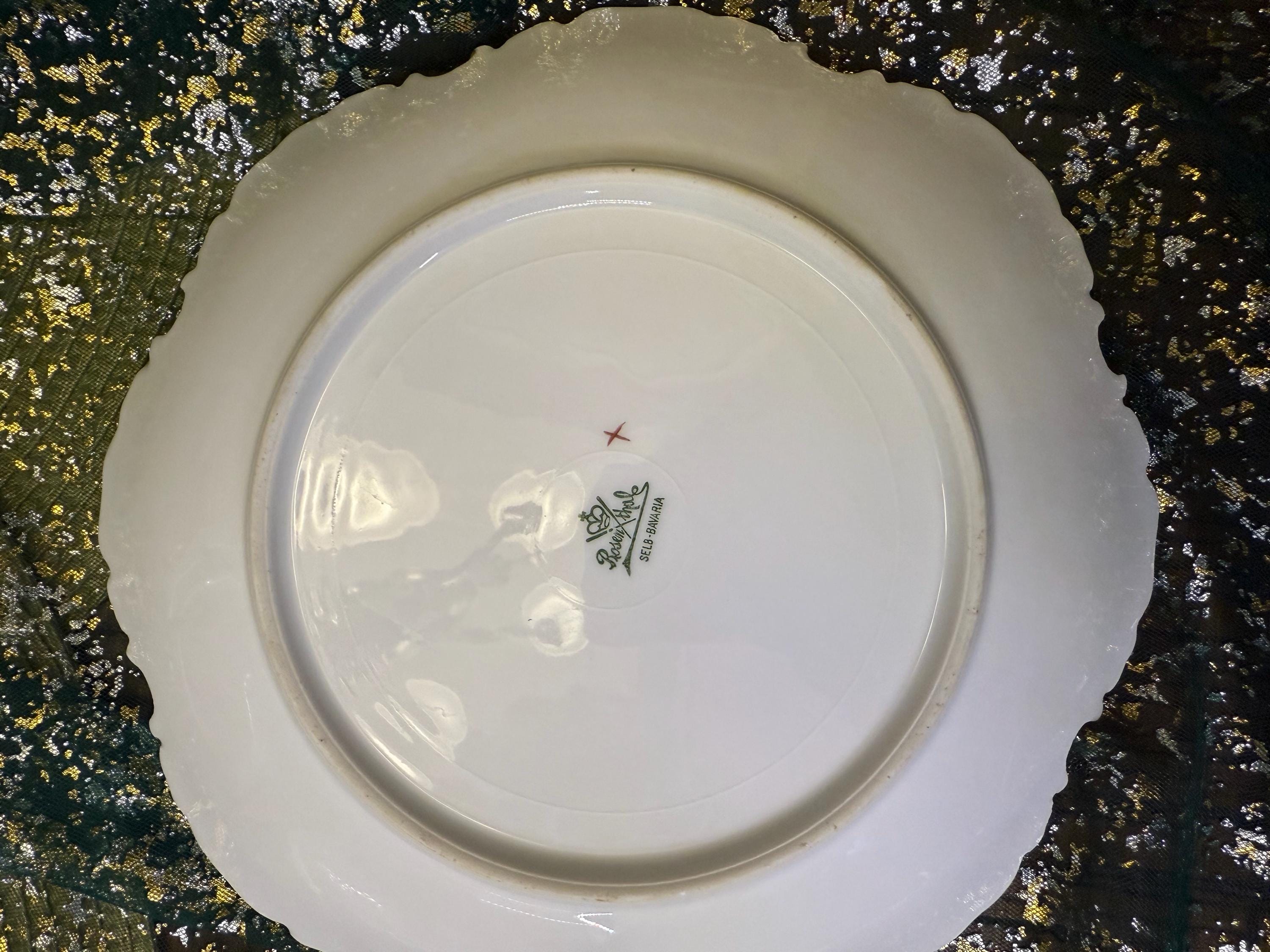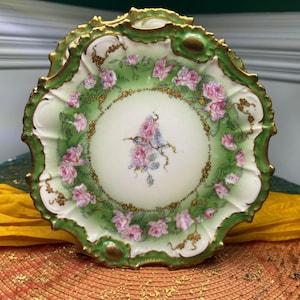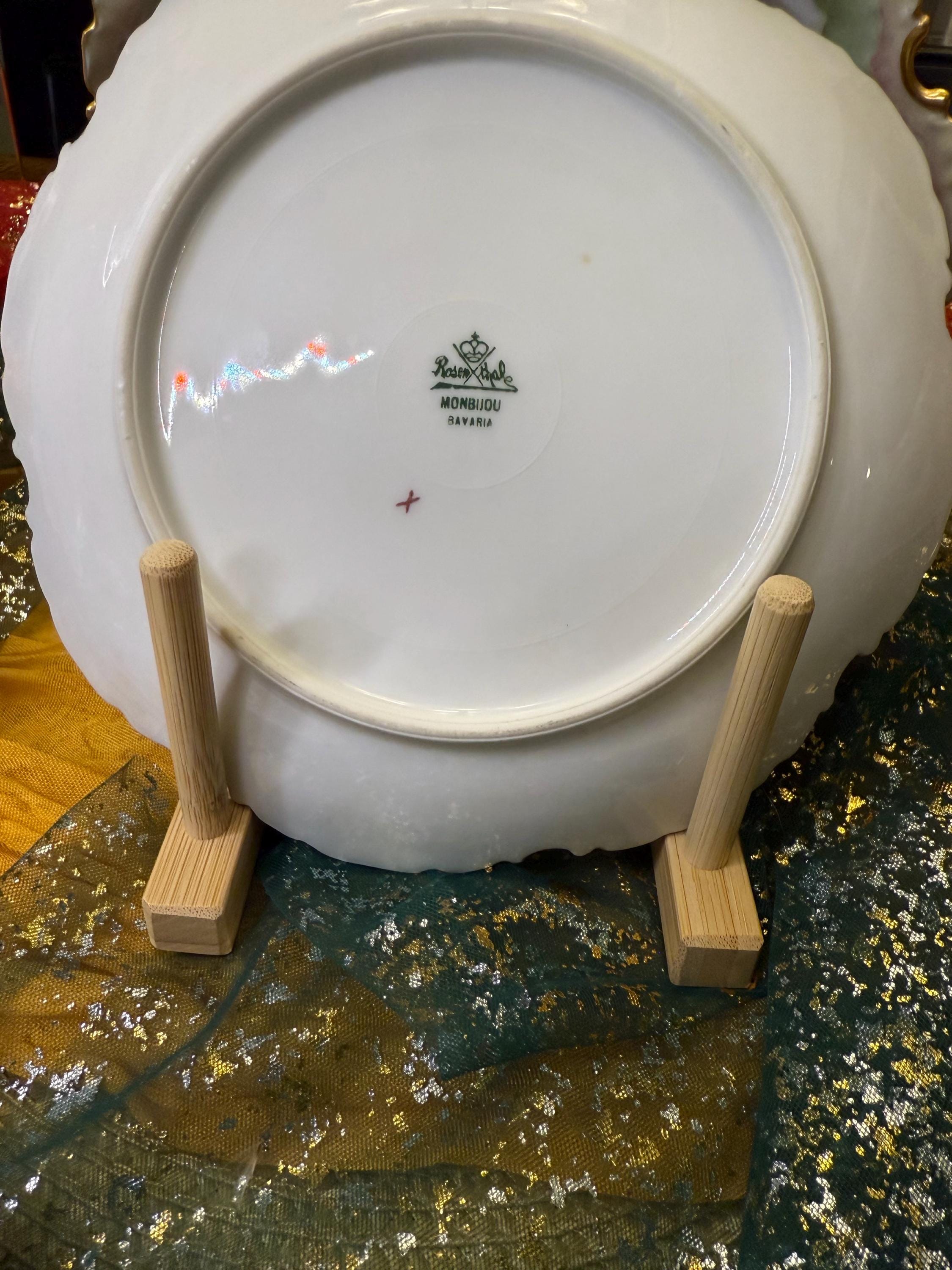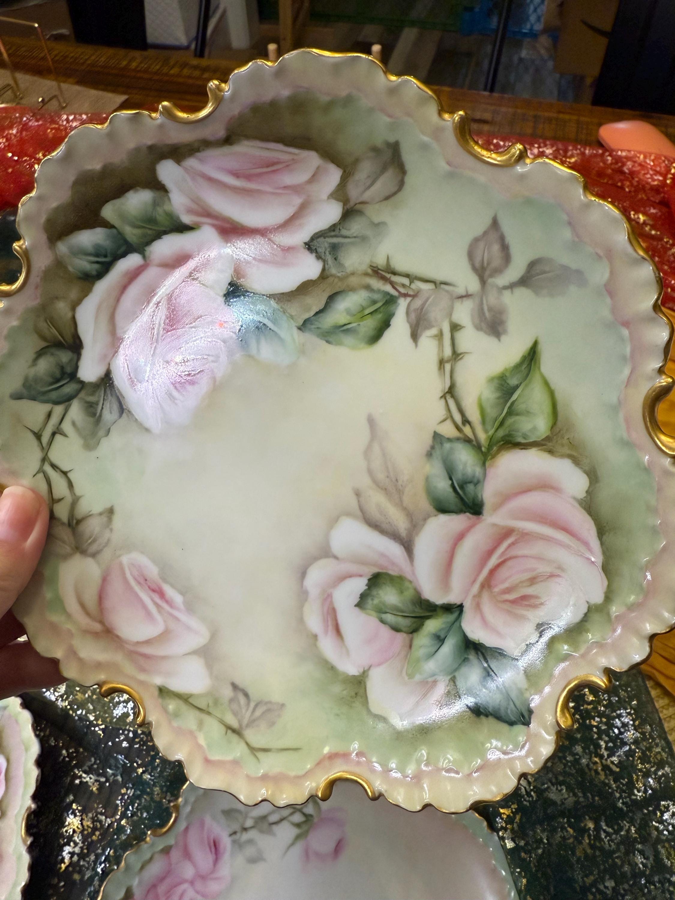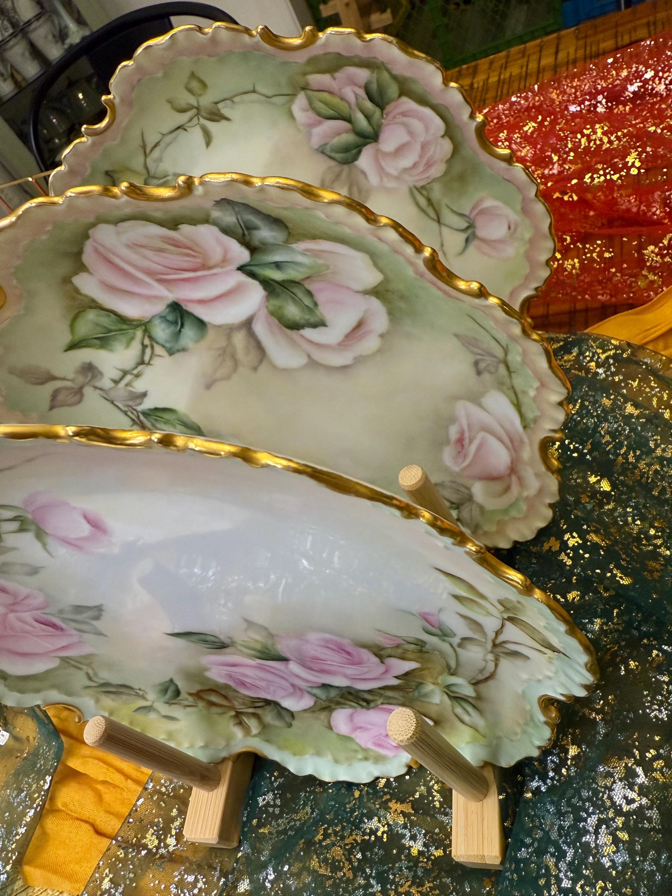 Bring the beauty of hand-painted Bavarian porcelain to your home with this exquisite set of six antique plates from Rosen Thale Monbijou, Bavaria. Each plate measures approximately 8 inches and features delicately hand-painted pink roses against soft pastel green and cream tones, finished with ornate scalloped edges and gold trim.