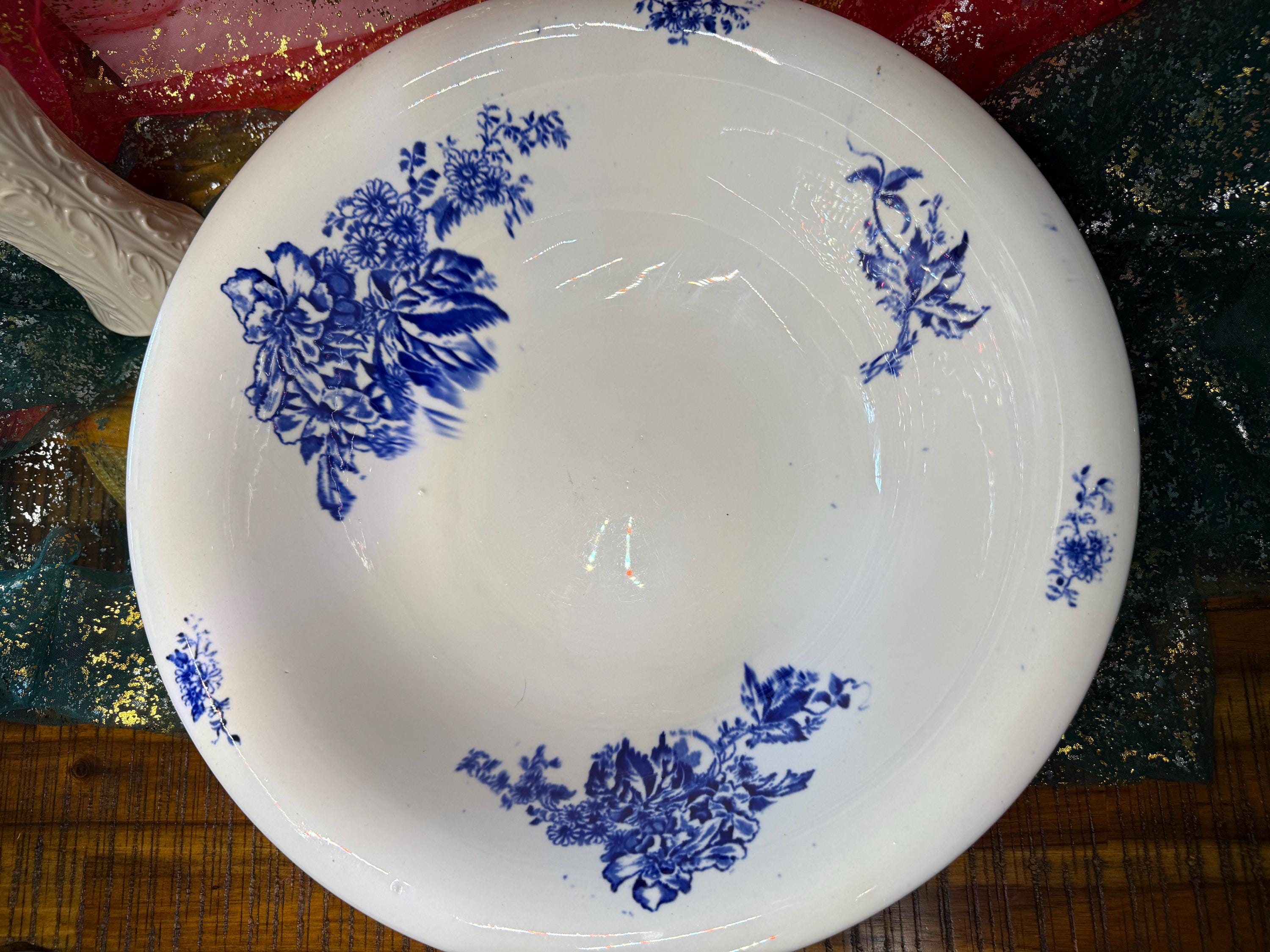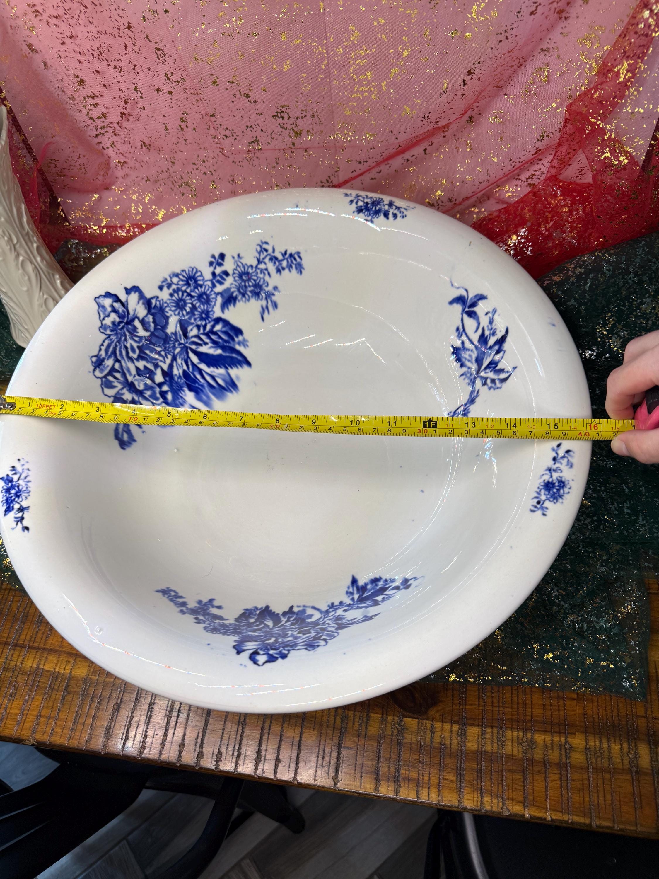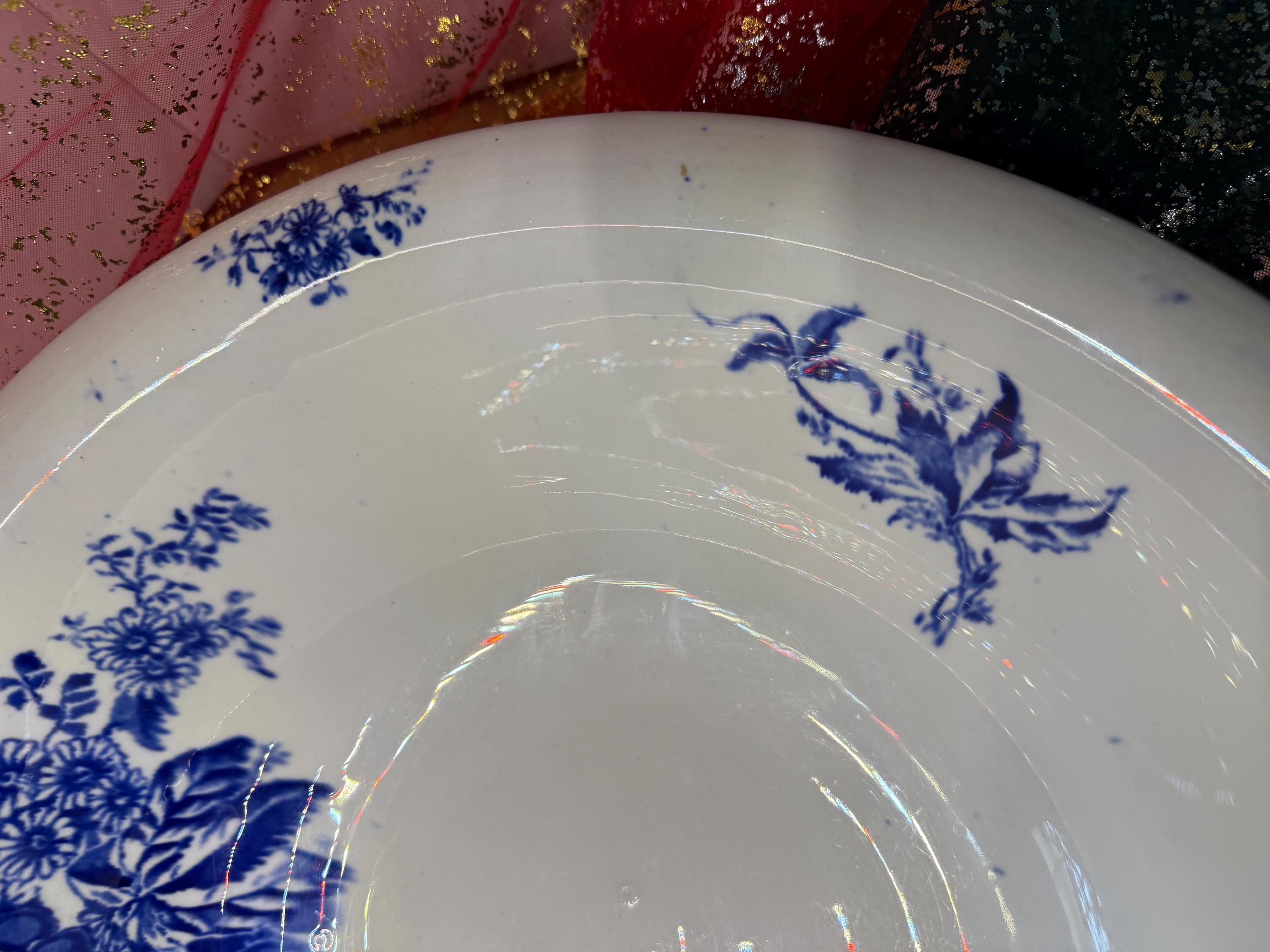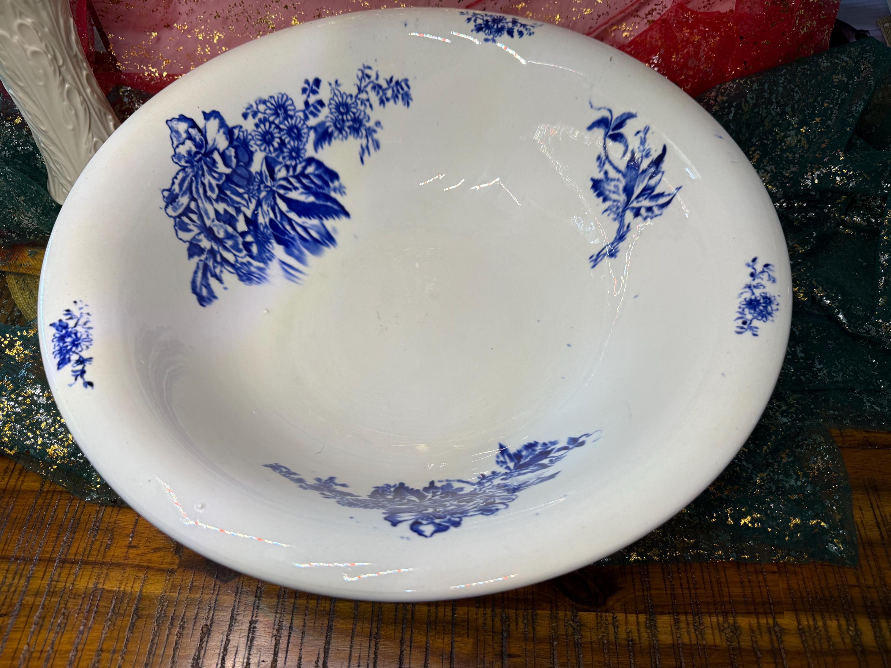 This stunning oversized antique bowl features classic cobalt blue floral transferware on a white ceramic body. Measuring approximately 15 inches across and 5 inches deep, it is a substantial piece that was originally used as a wash basin in the Victorian era, though it also works beautifully today as a decorative centerpiece, serving bowl, or display piece.