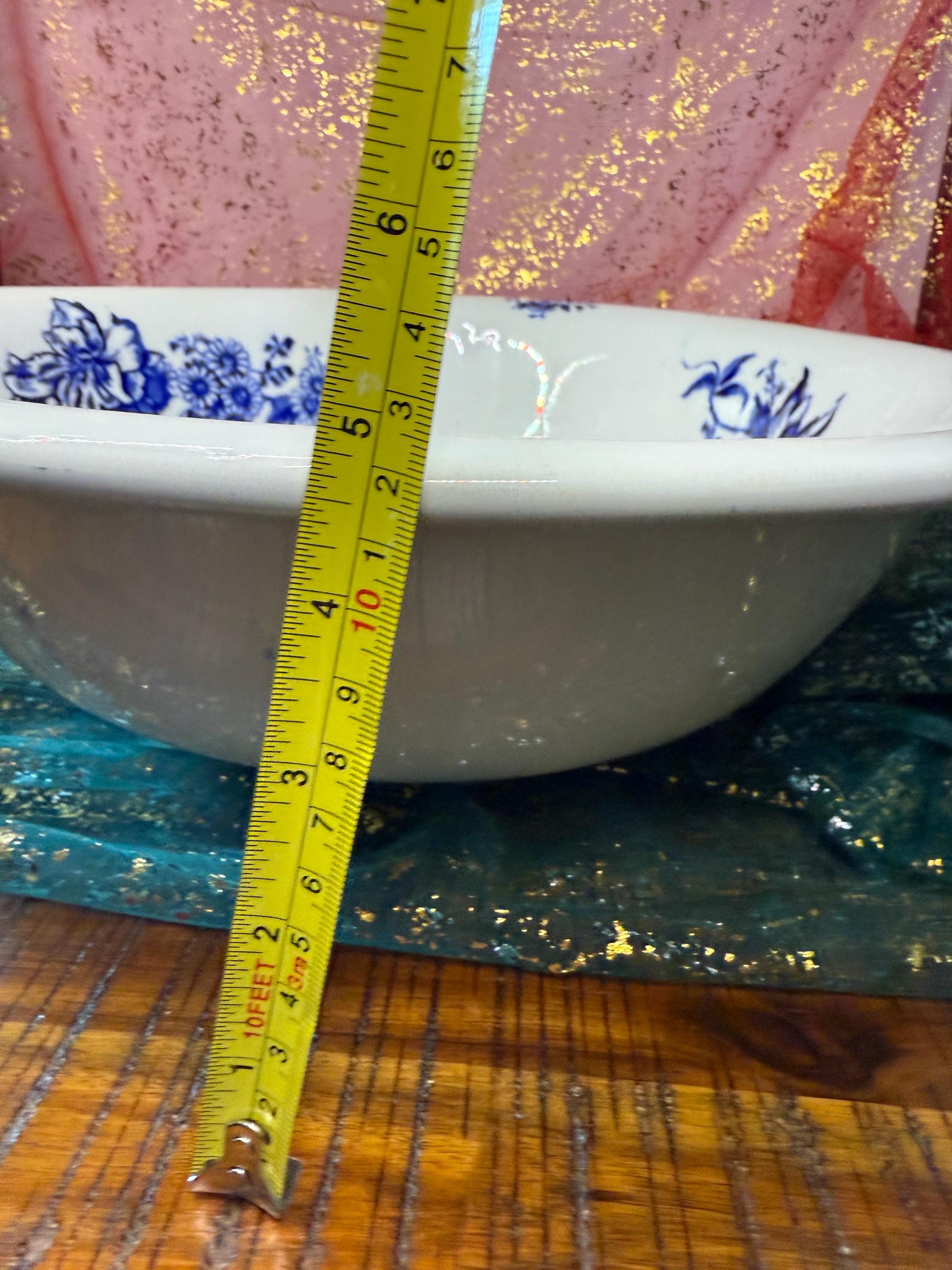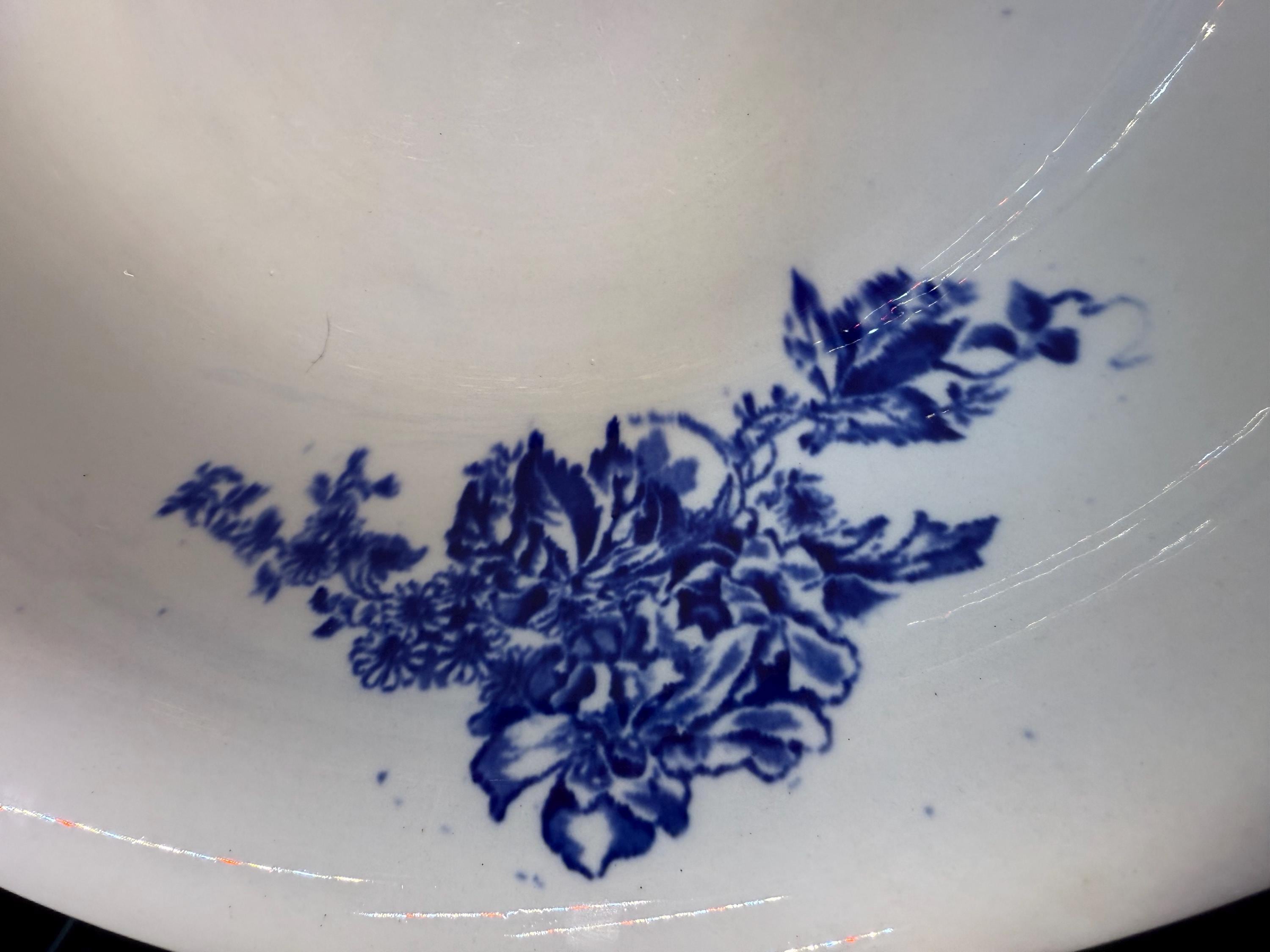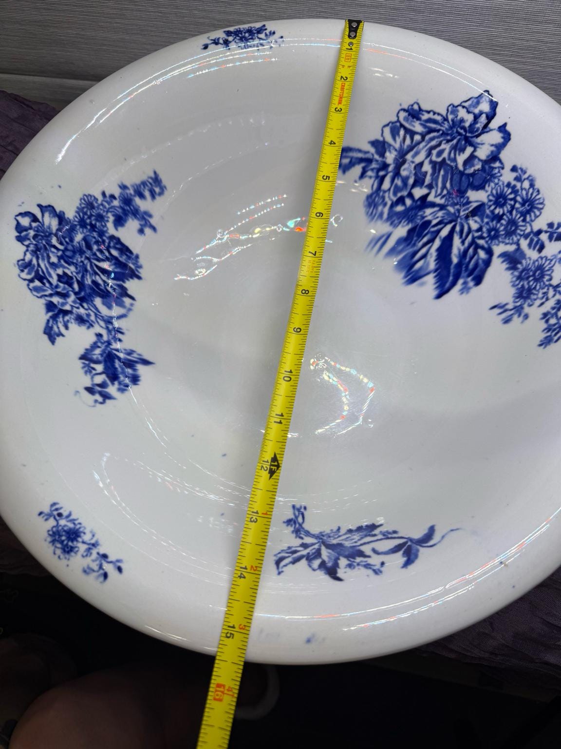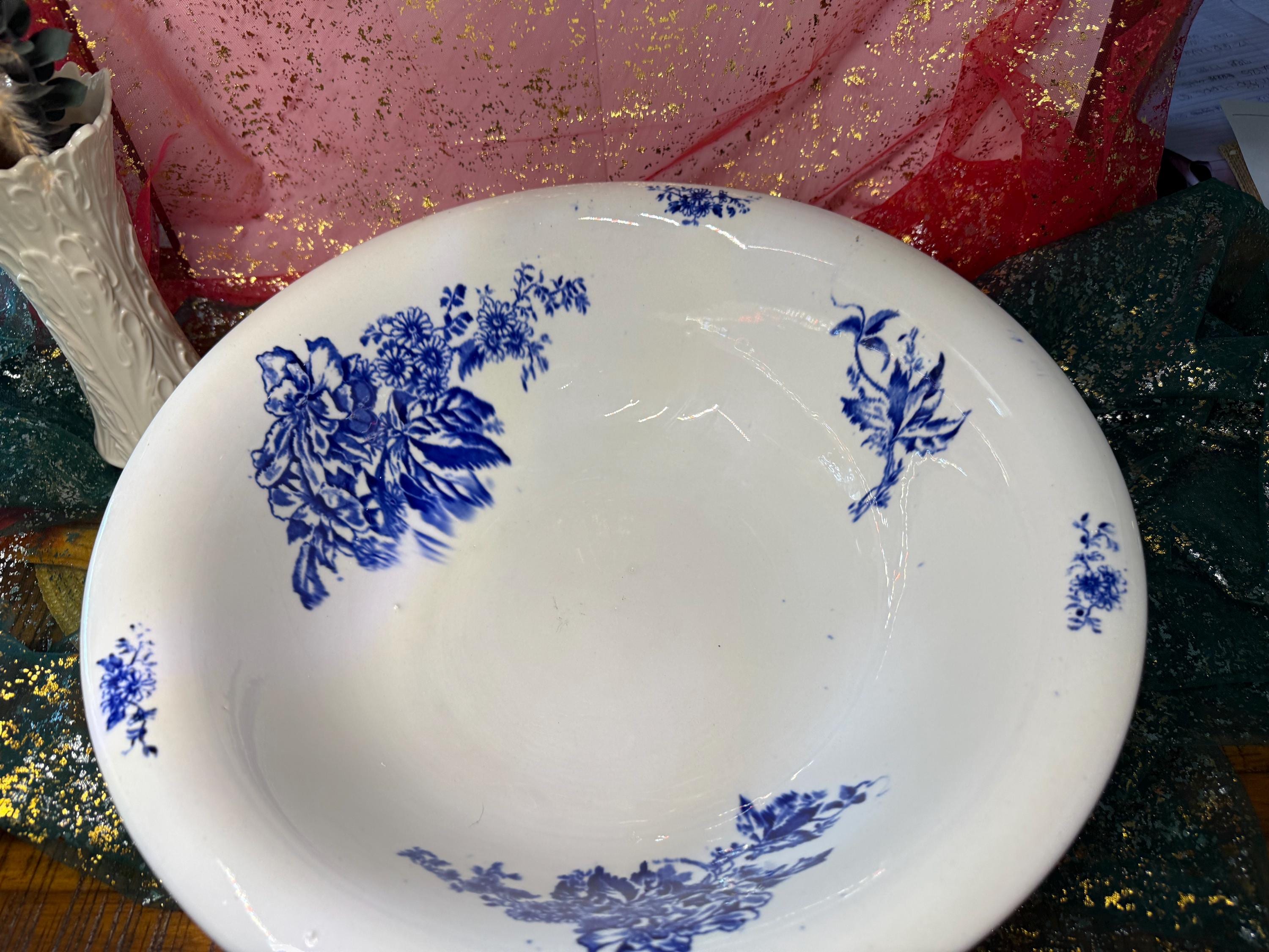 This stunning oversized antique bowl features classic cobalt blue floral transferware on a white ceramic body. Measuring approximately 15 inches across and 5 inches deep, it is a substantial piece that was originally used as a wash basin in the Victorian era, though it also works beautifully today as a decorative centerpiece, serving bowl, or display piece.