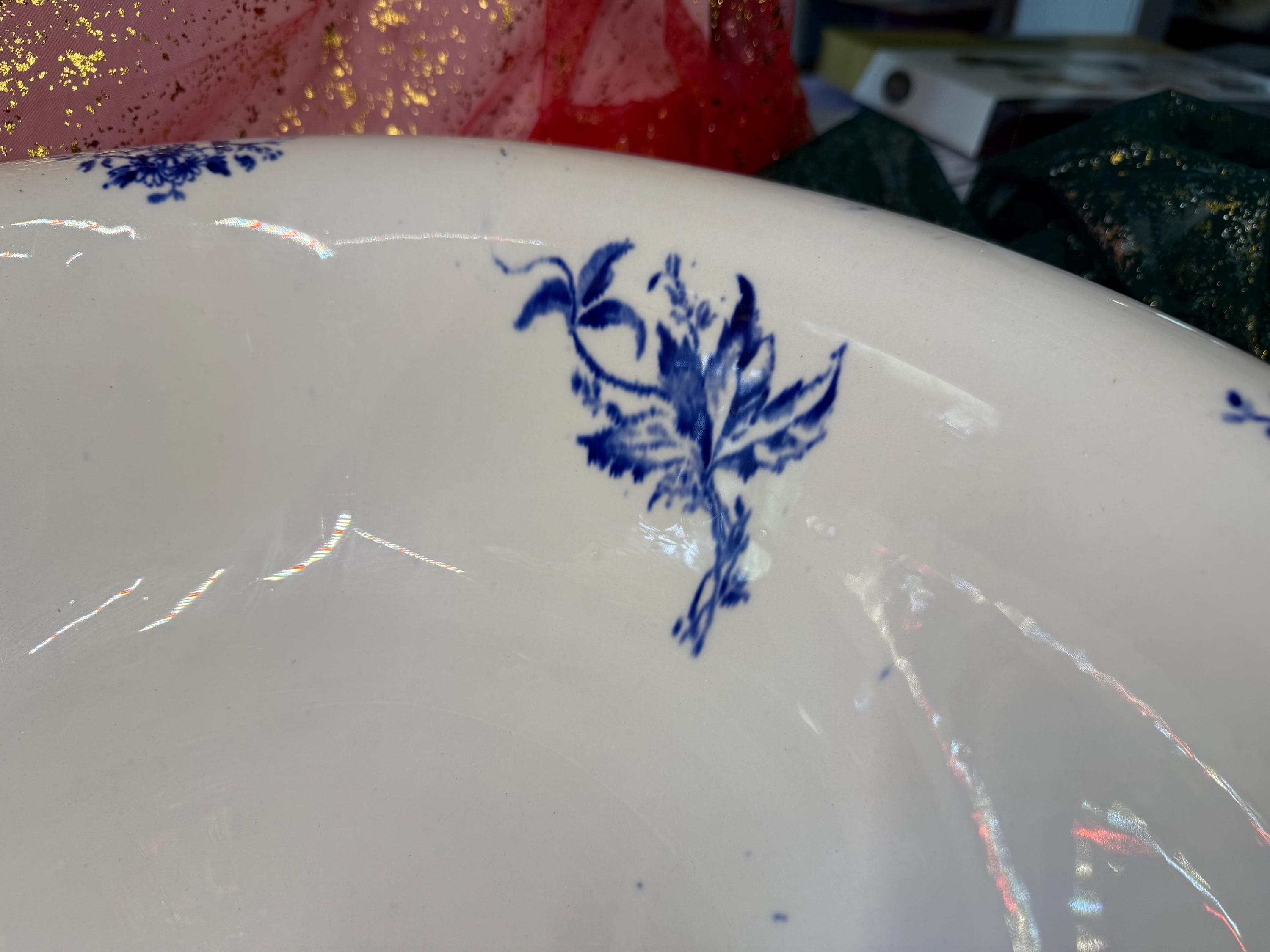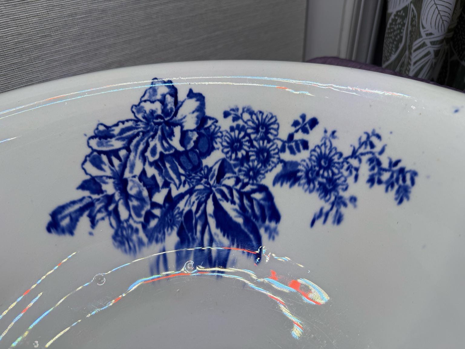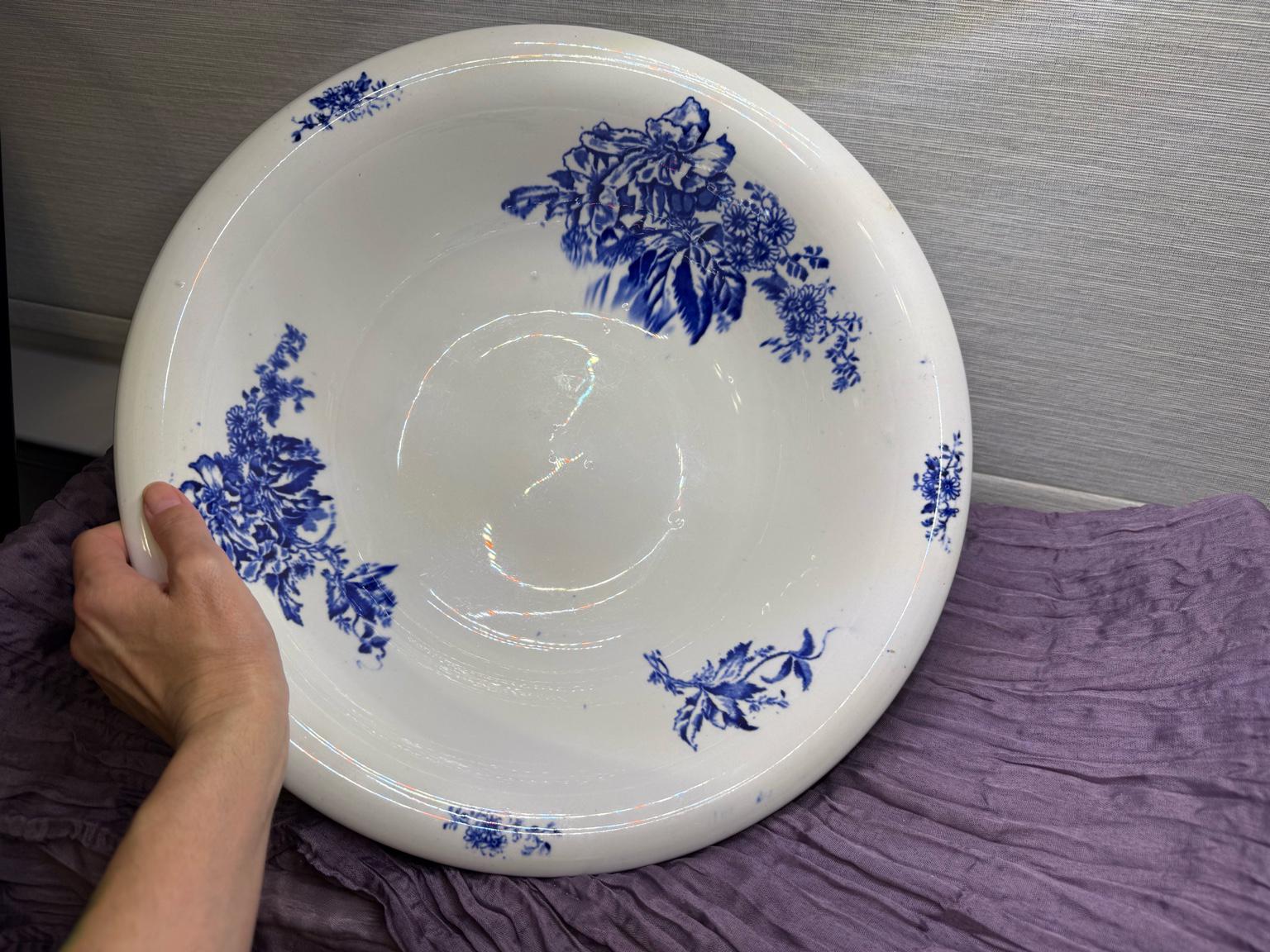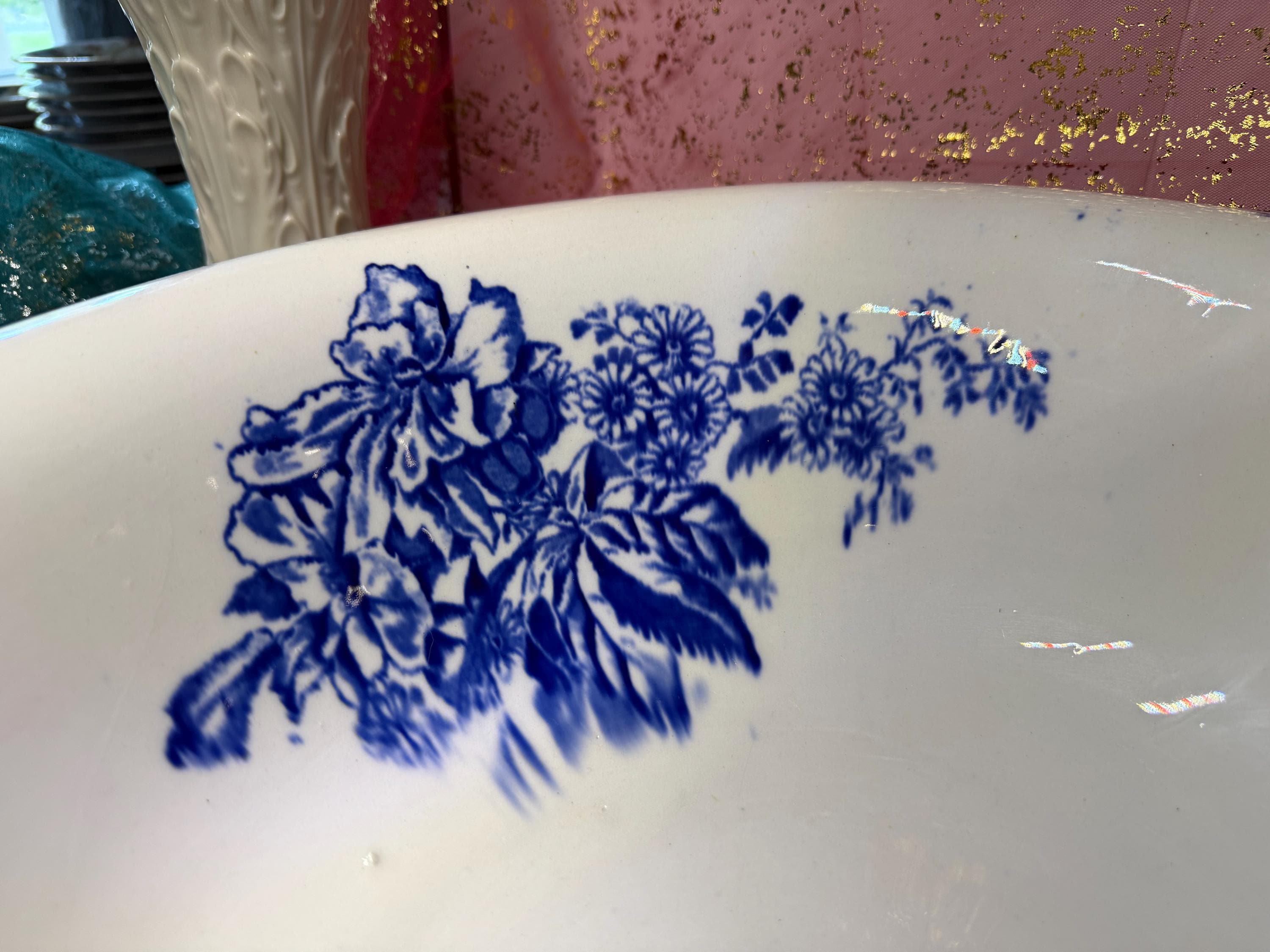 This stunning oversized antique bowl features classic cobalt blue floral transferware on a white ceramic body. Measuring approximately 15 inches across and 5 inches deep, it is a substantial piece that was originally used as a wash basin in the Victorian era, though it also works beautifully today as a decorative centerpiece, serving bowl, or display piece.