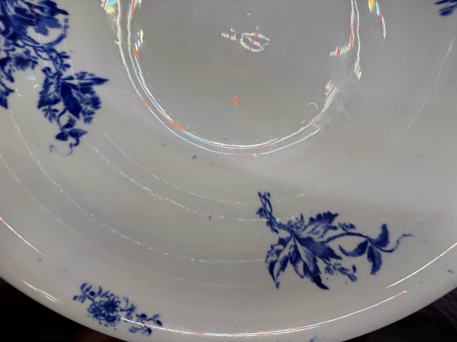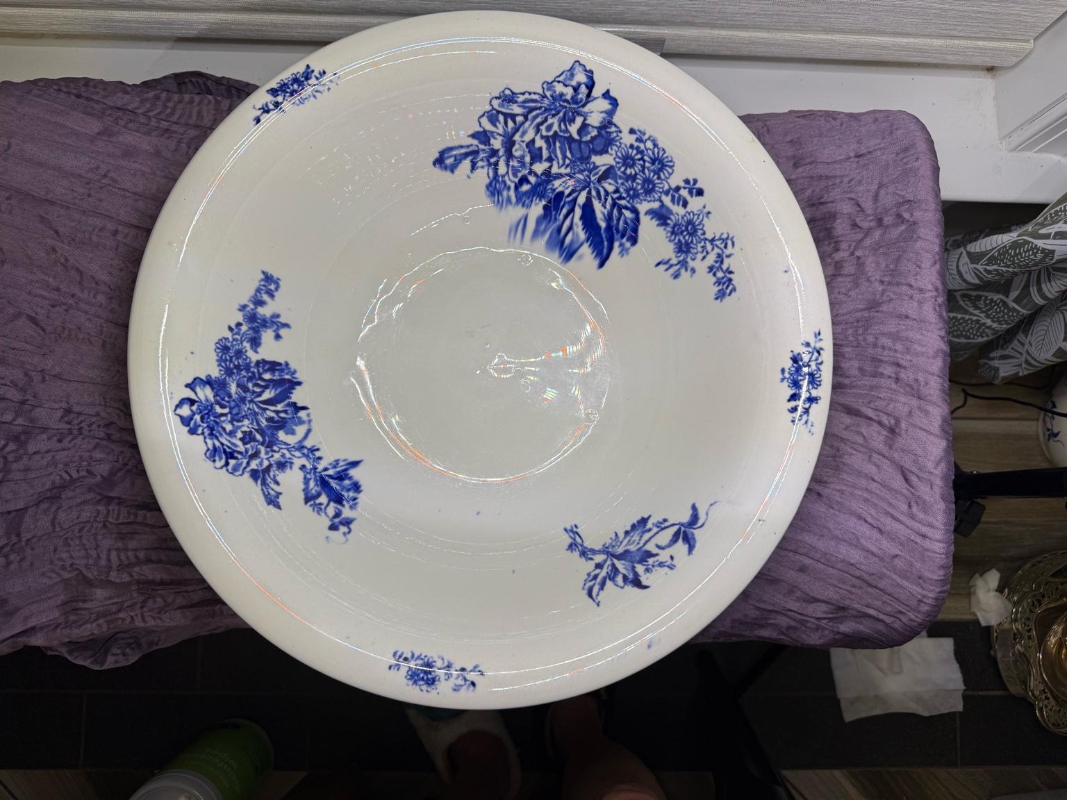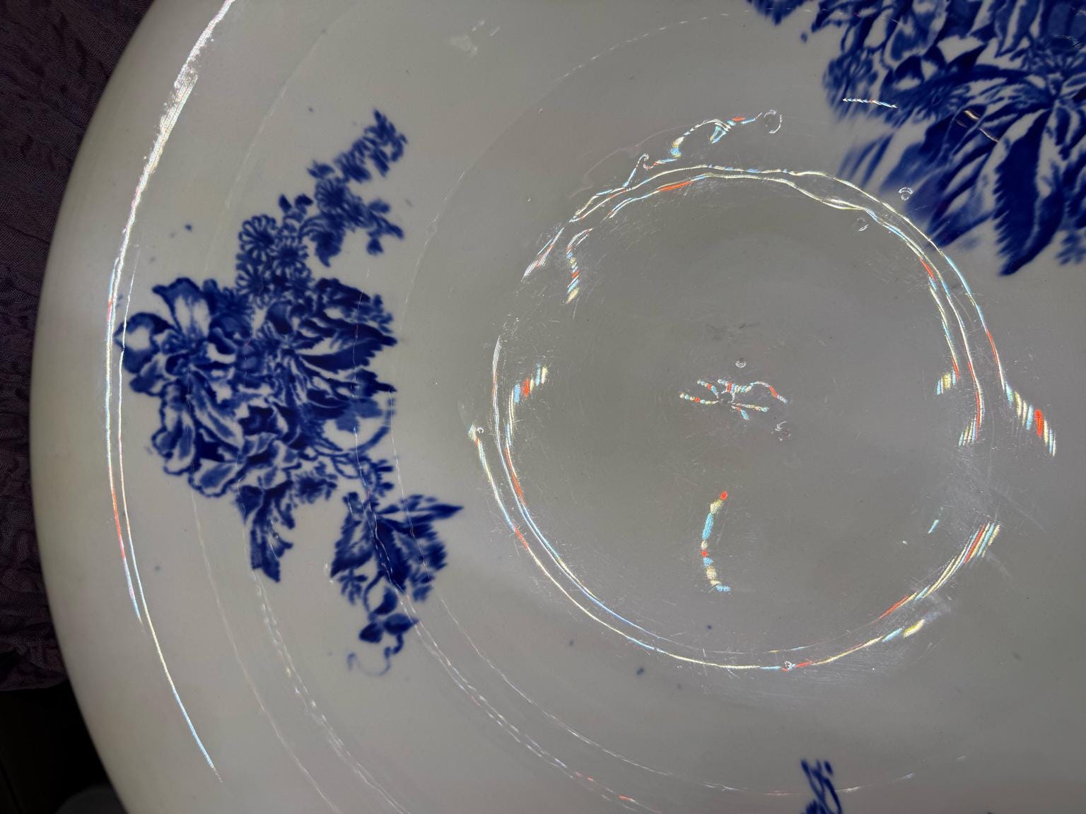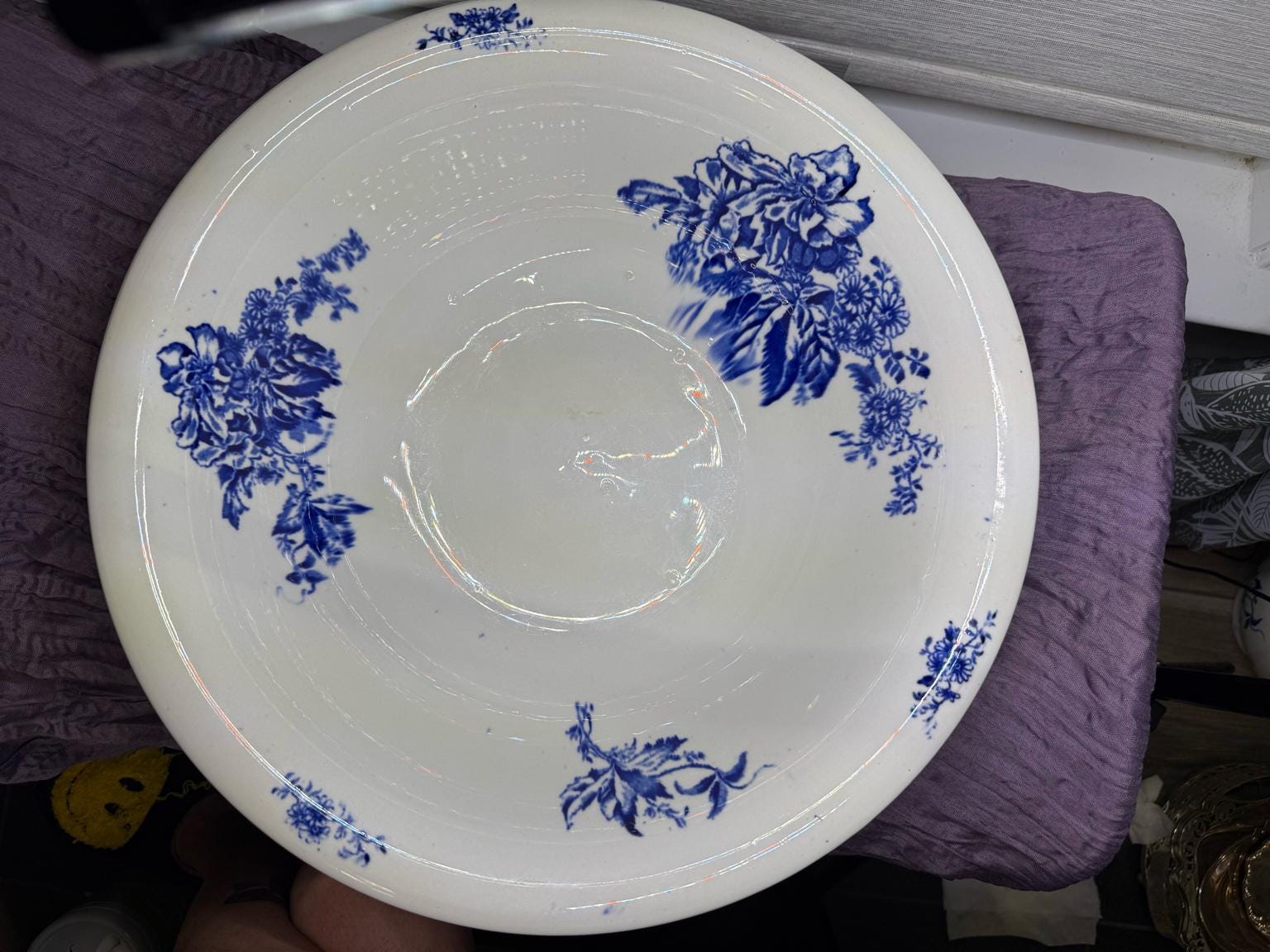 This stunning oversized antique bowl features classic cobalt blue floral transferware on a white ceramic body. Measuring approximately 15 inches across and 5 inches deep, it is a substantial piece that was originally used as a wash basin in the Victorian era, though it also works beautifully today as a decorative centerpiece, serving bowl, or display piece.
