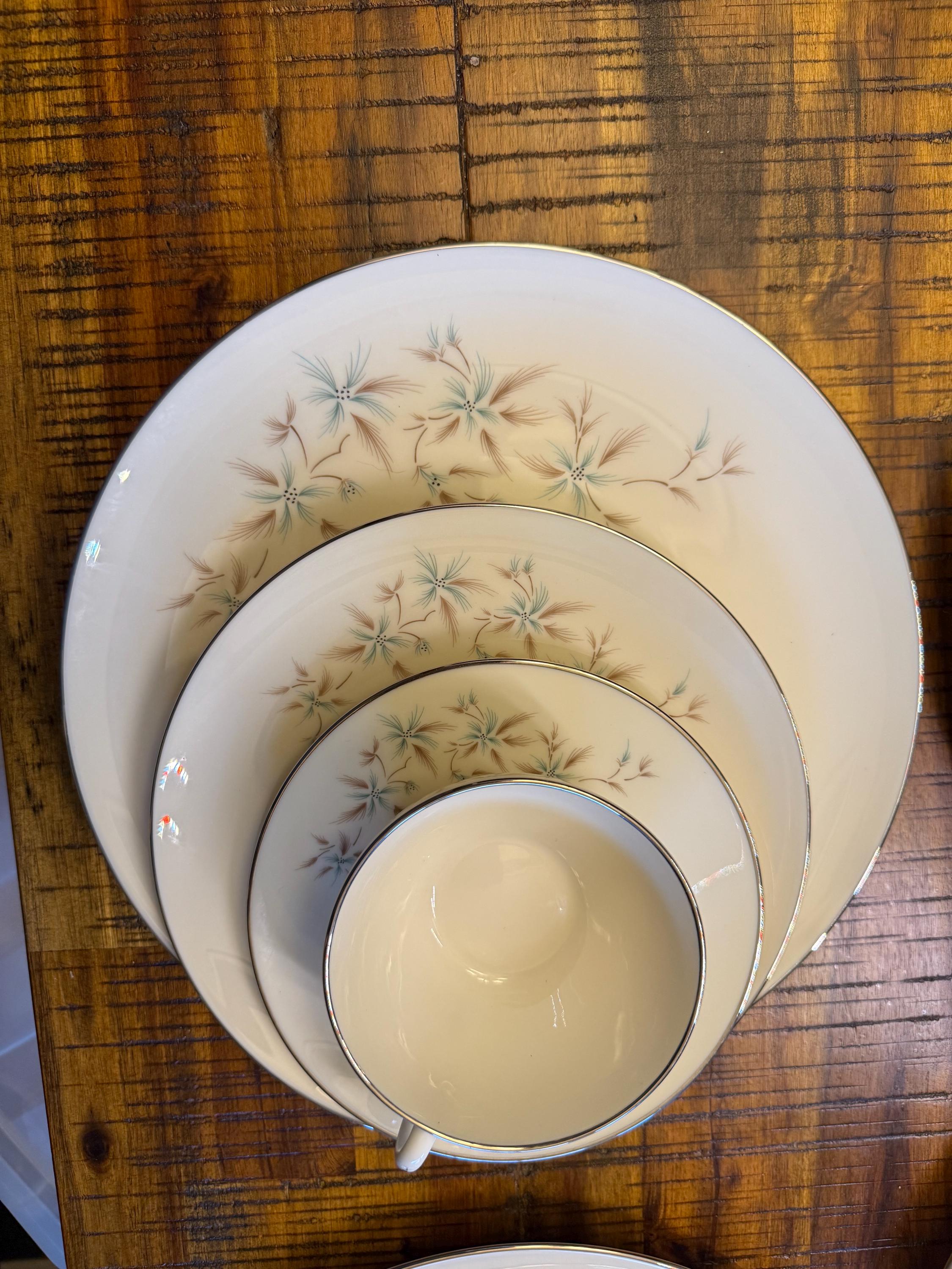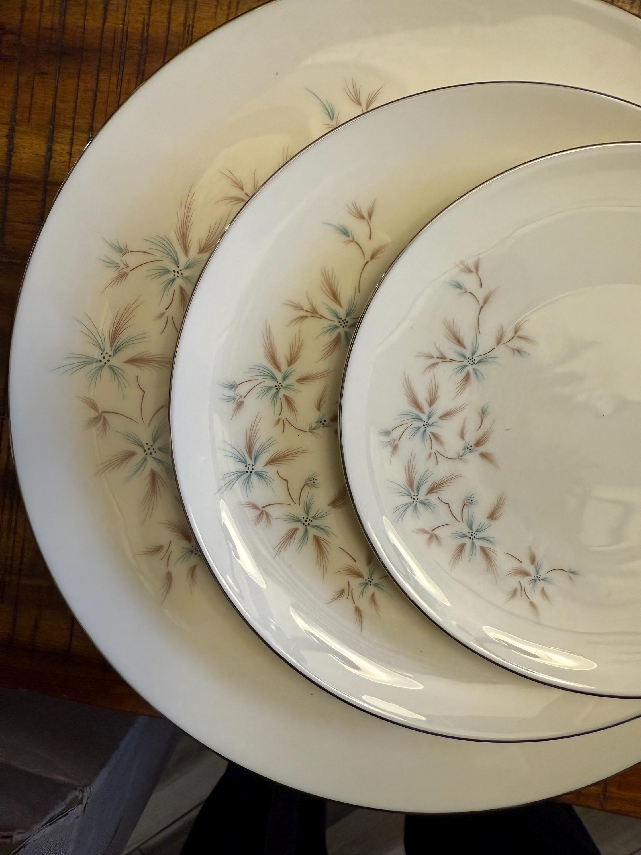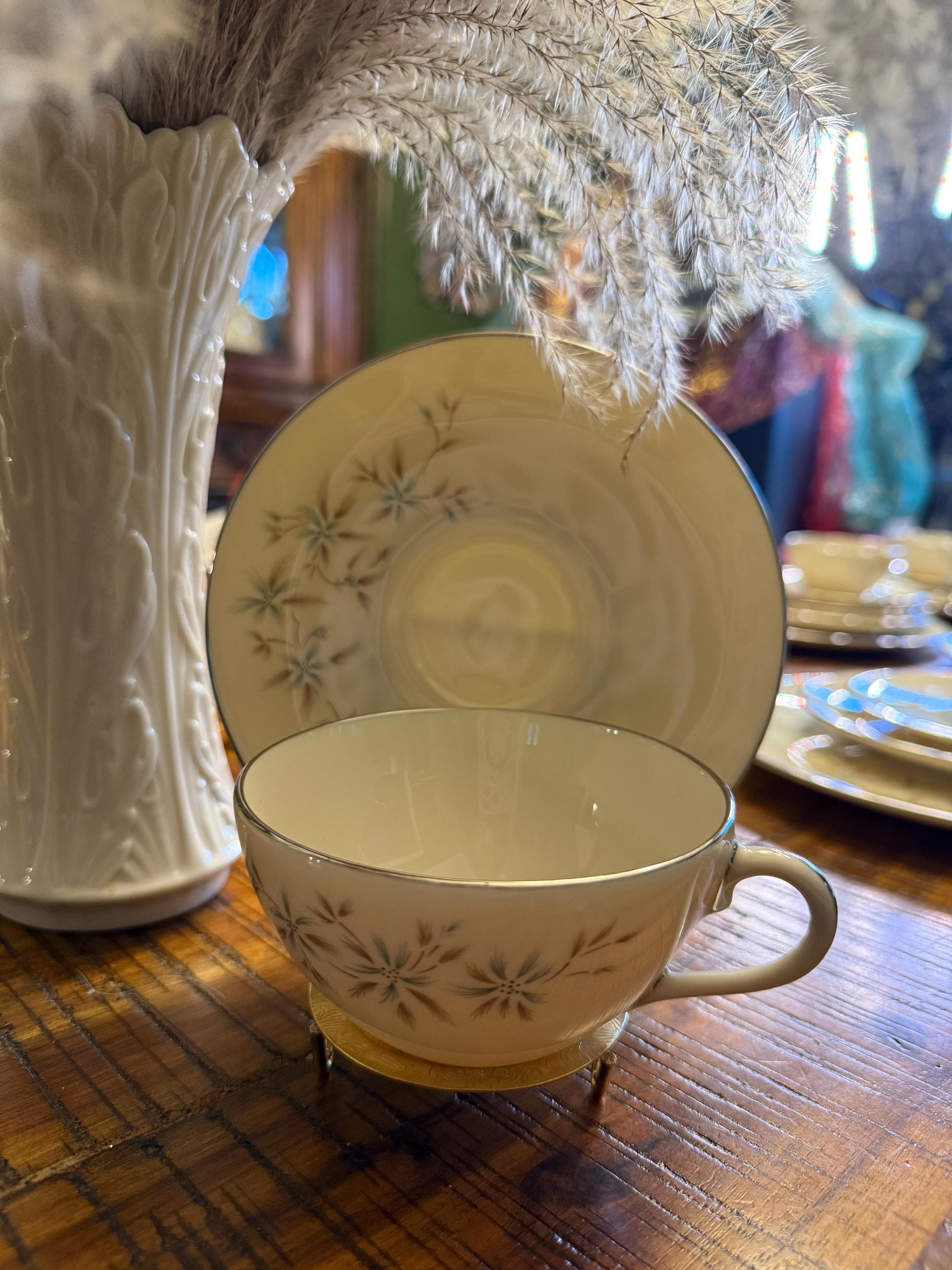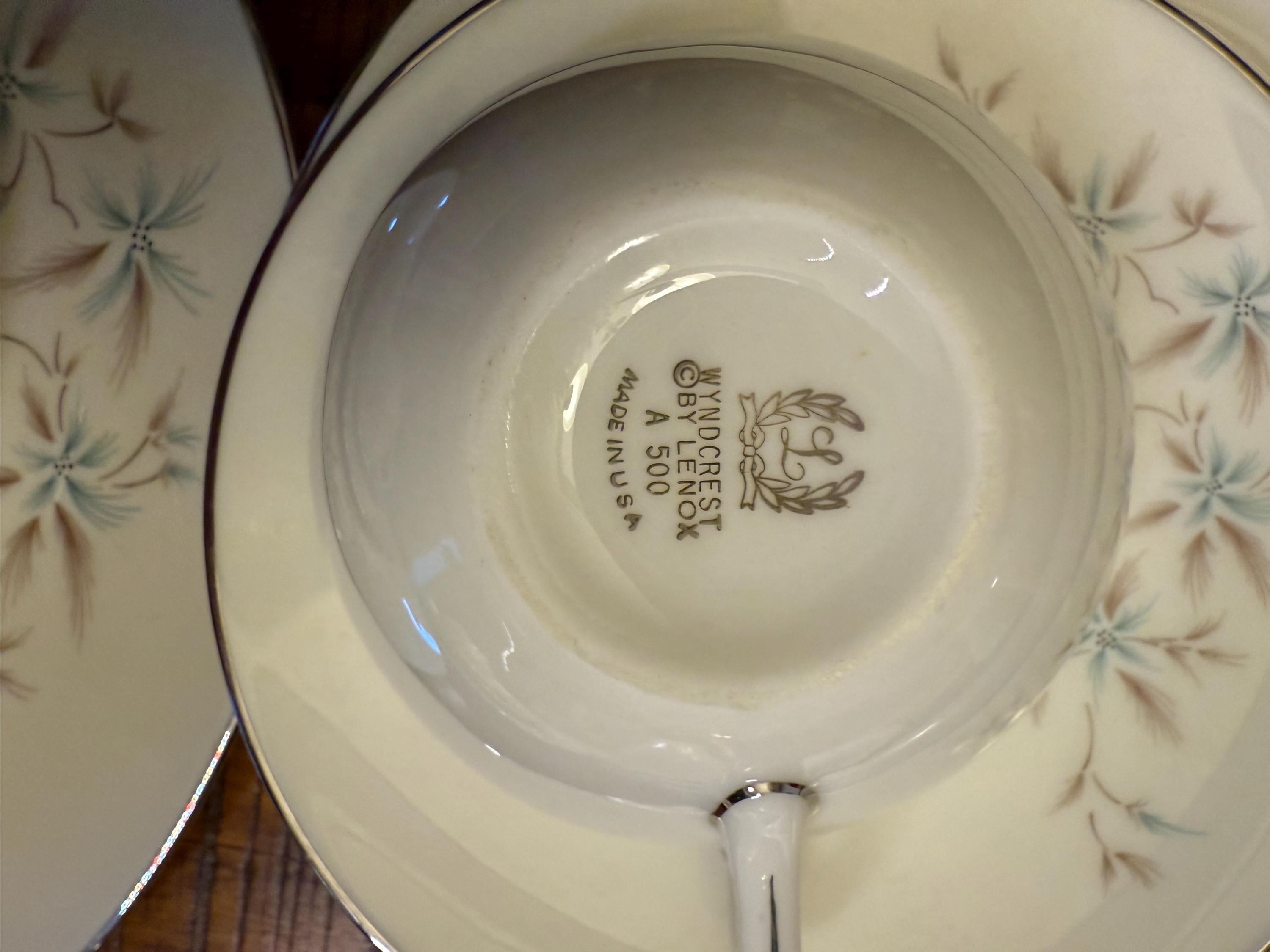 This Lenox Wyndcrest pattern features delicate blue and taupe florals with a platinum rim on ivory fine bone China. Produced in the 1950s–1960s, it reflects the classic craftsmanship and soft, timeless style Lenox is known for.