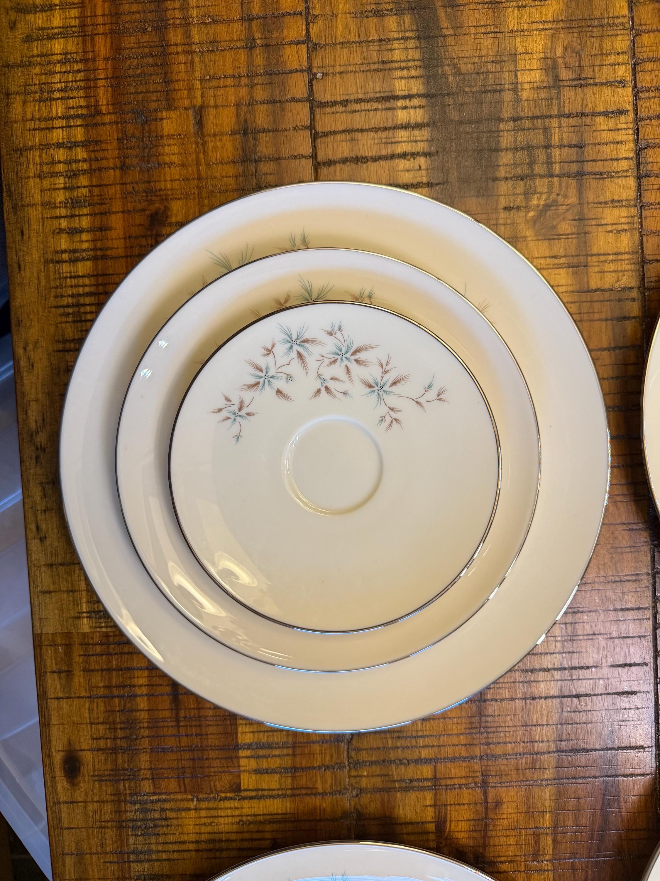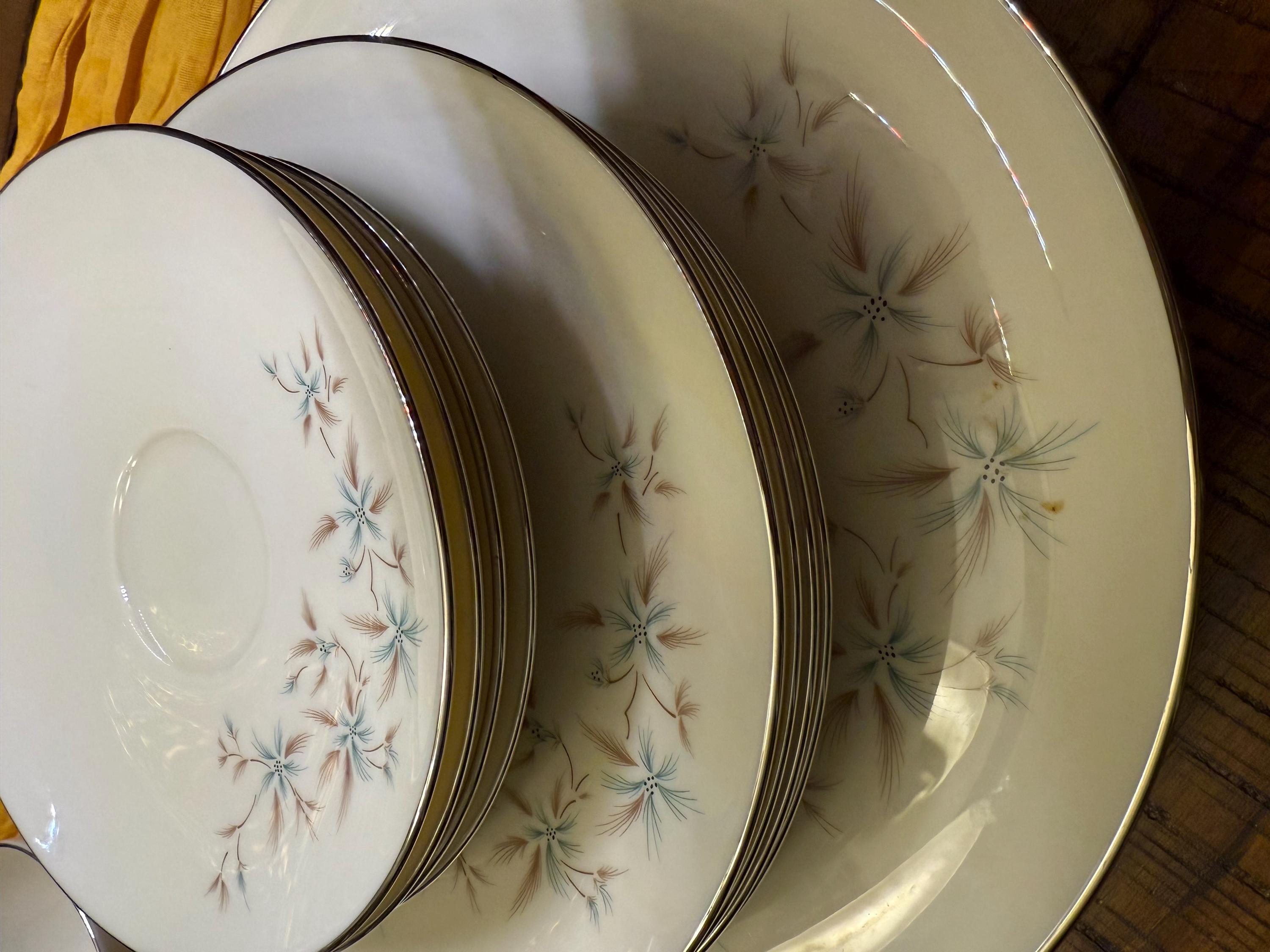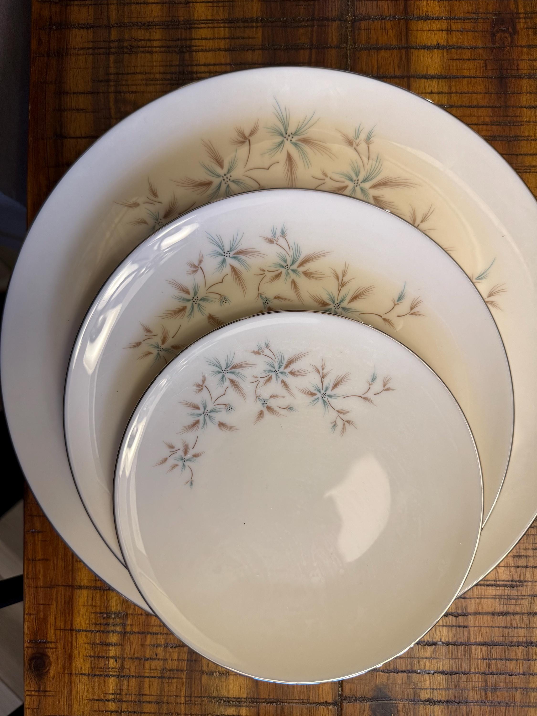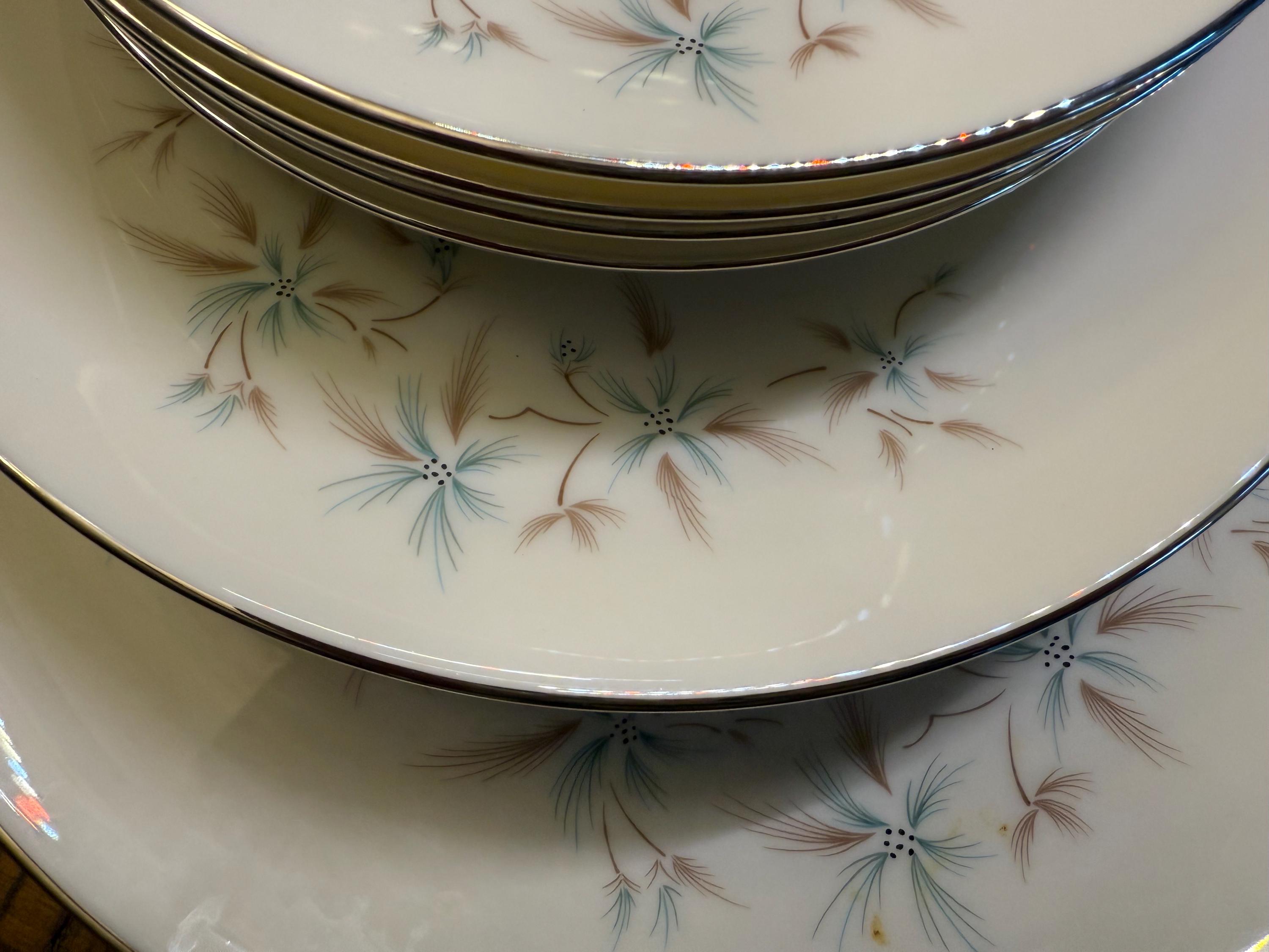 This Lenox Wyndcrest pattern features delicate blue and taupe florals with a platinum rim on ivory fine bone China. Produced in the 1950s–1960s, it reflects the classic craftsmanship and soft, timeless style Lenox is known for.