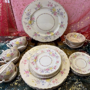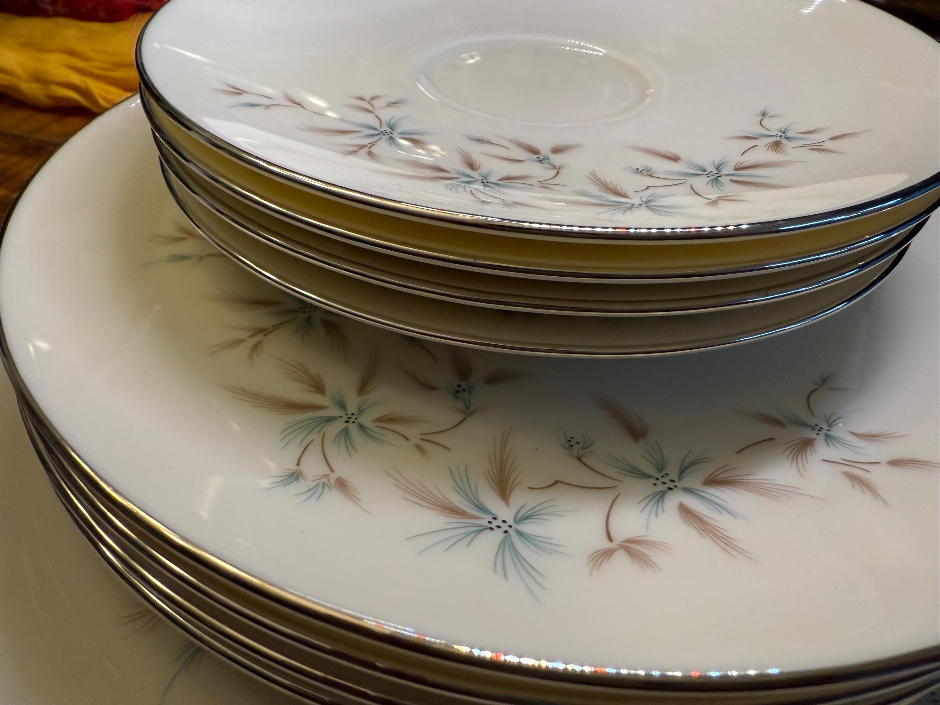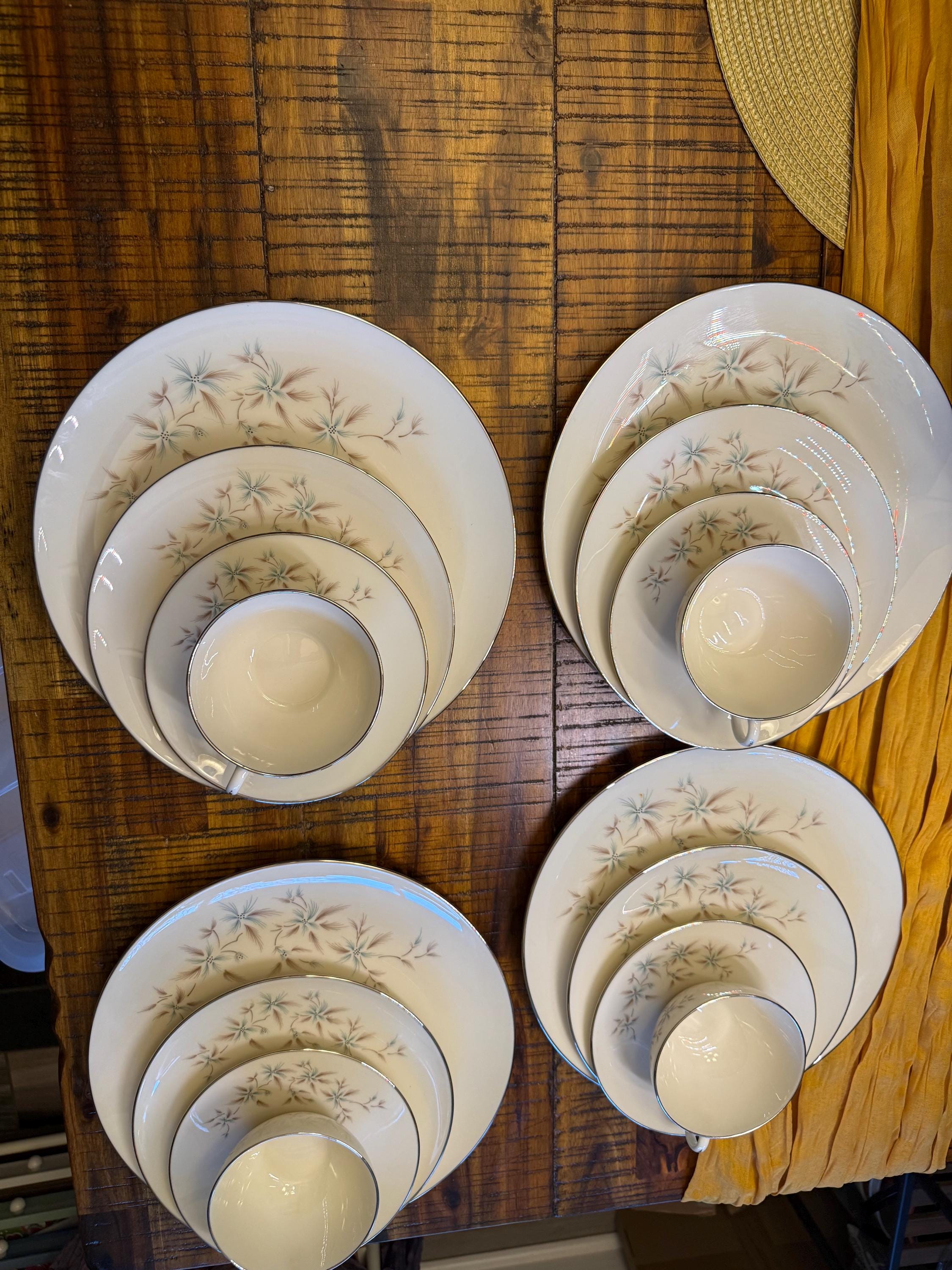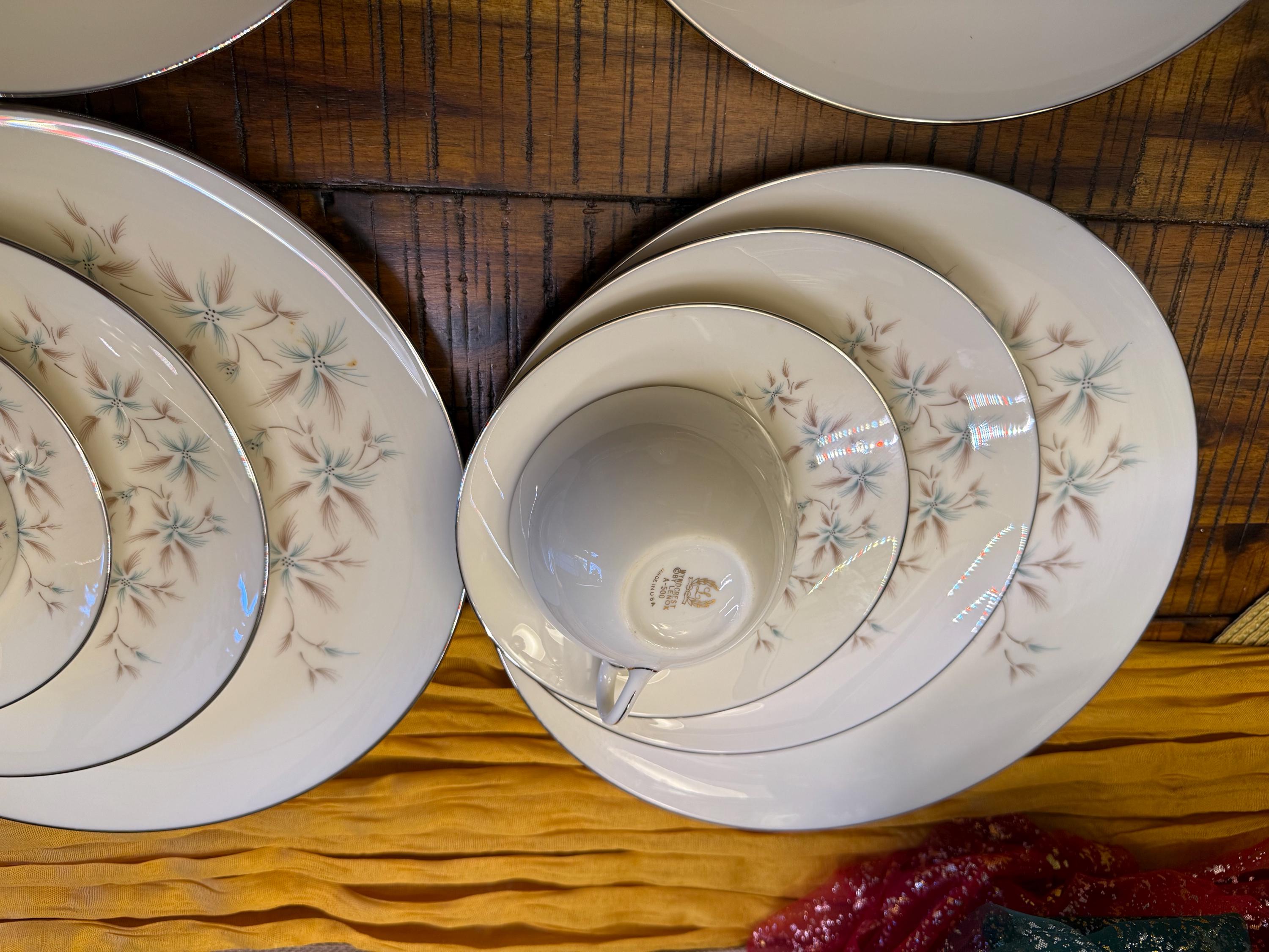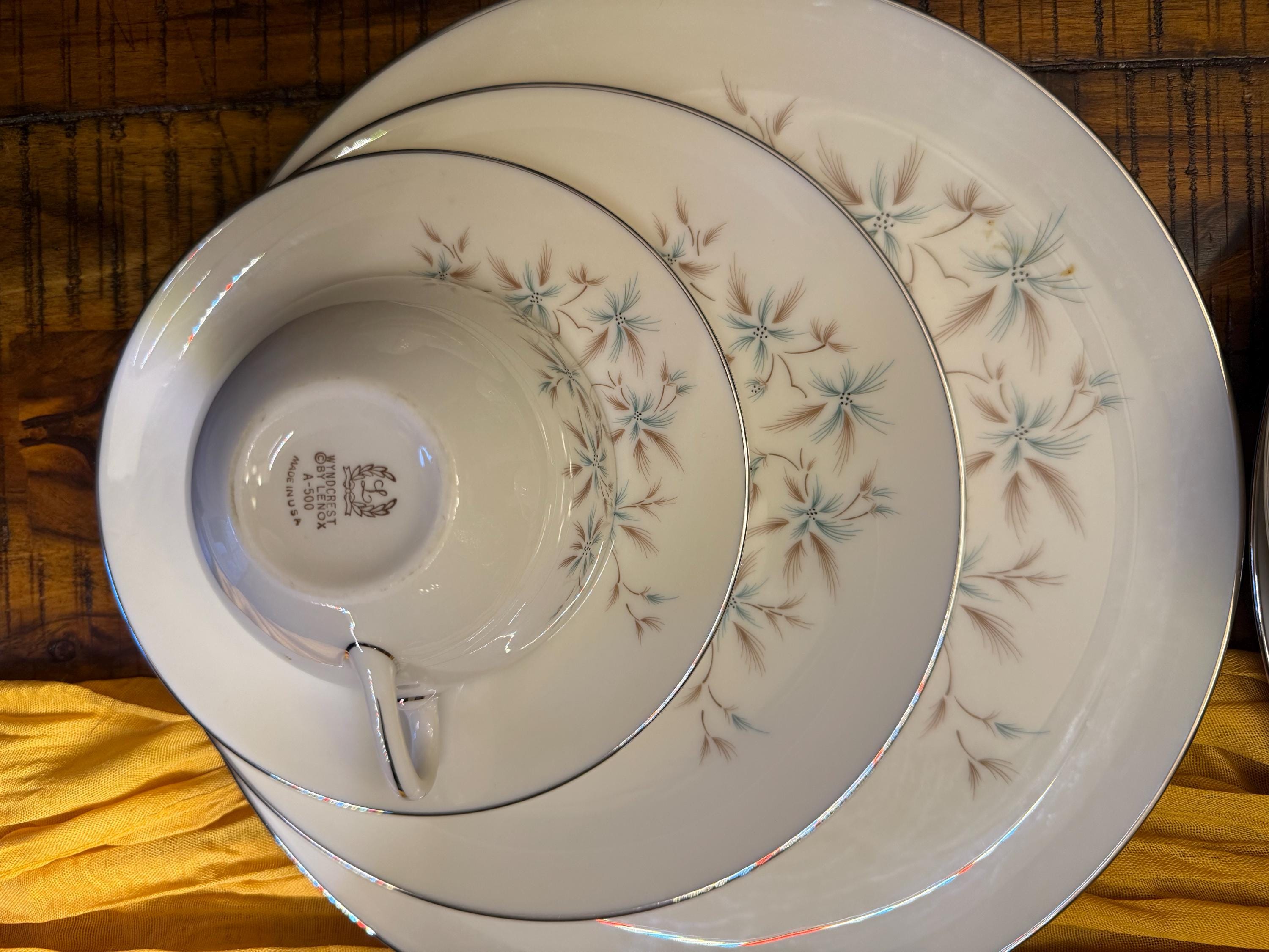 This Lenox Wyndcrest pattern features delicate blue and taupe florals with a platinum rim on ivory fine bone China. Produced in the 1950s–1960s, it reflects the classic craftsmanship and soft, timeless style Lenox is known for.