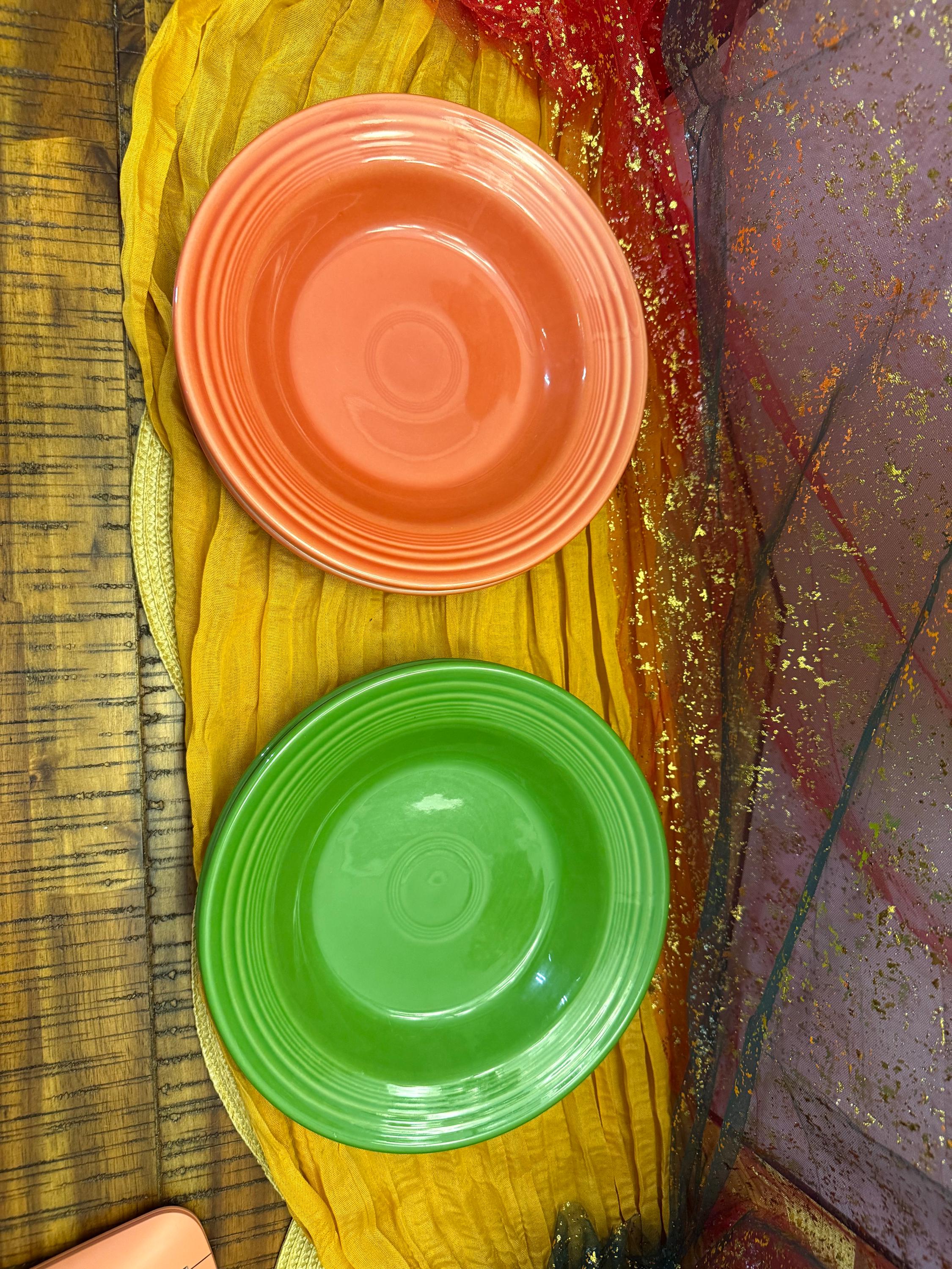 Add a cheerful splash of color to your table with these authentic Fiesta Ware 9" bowls, available in your choice of Persimmon or Shamrock Green. Each set includes two matching bowls, crafted in the USA by The Homer Laughlin China Company — known for their timeless quality and vibrant glazes.