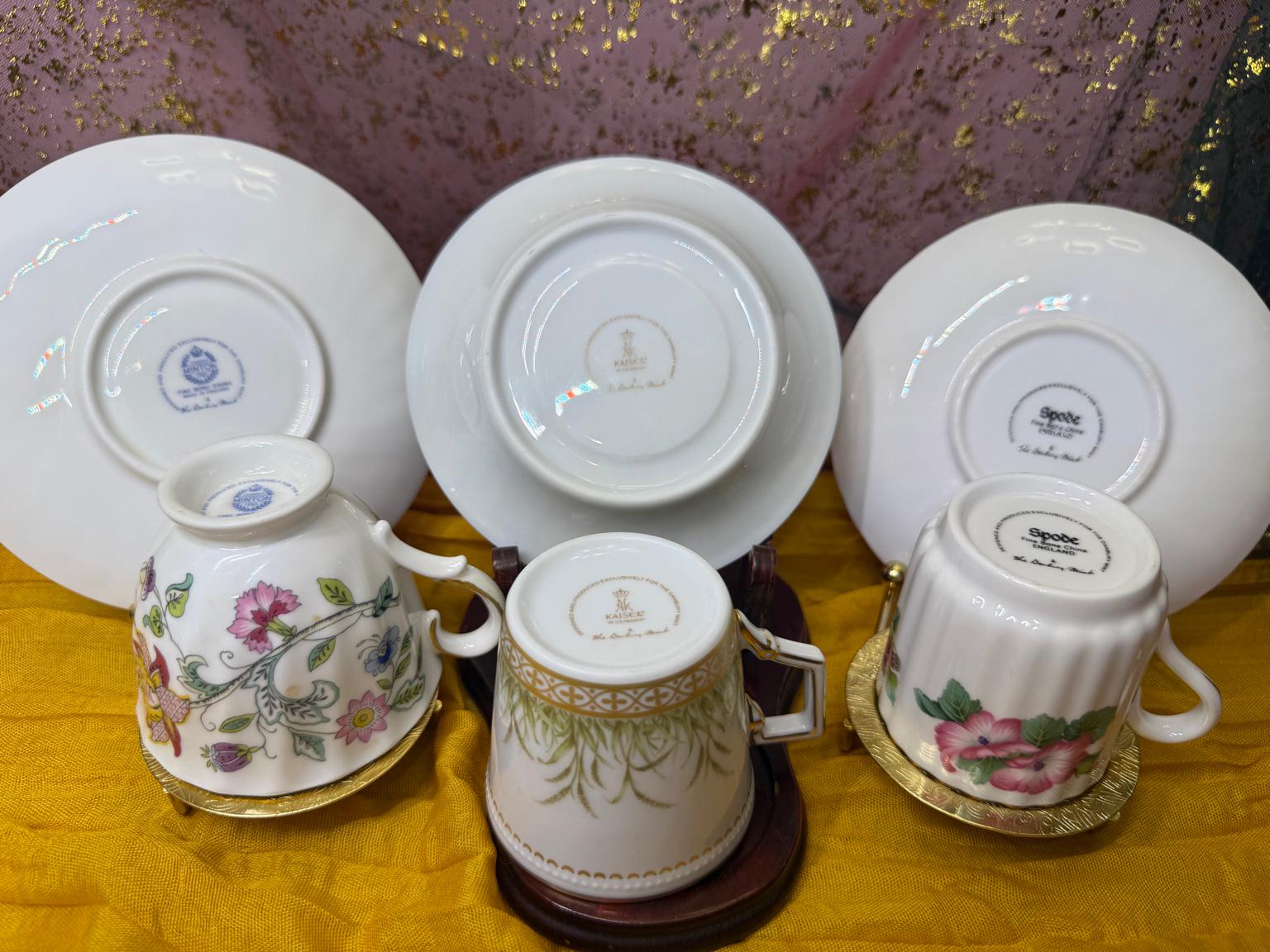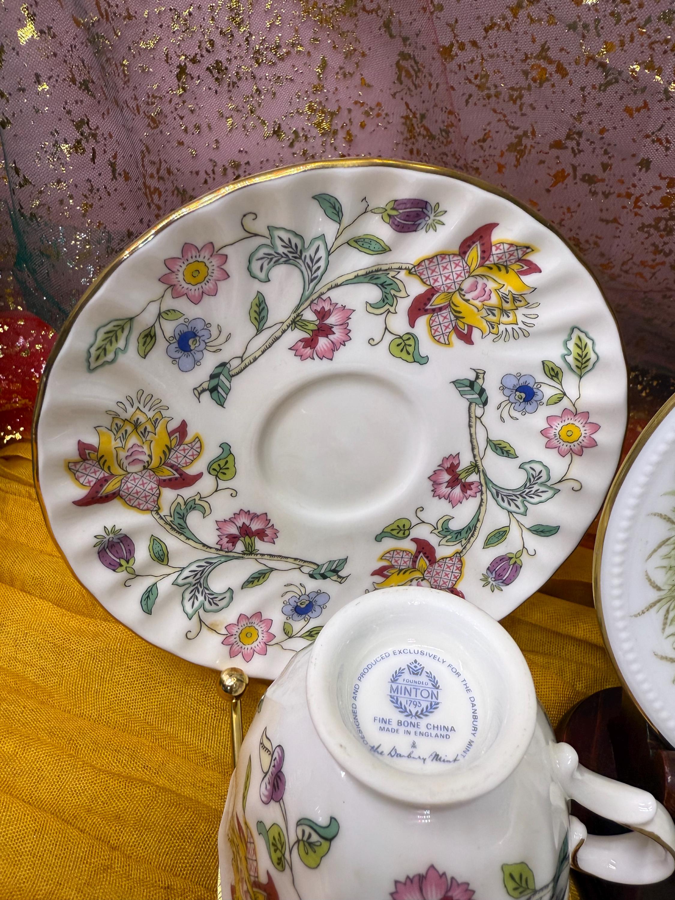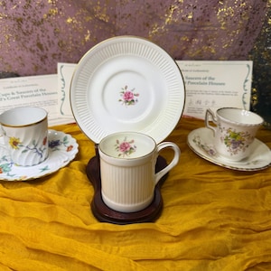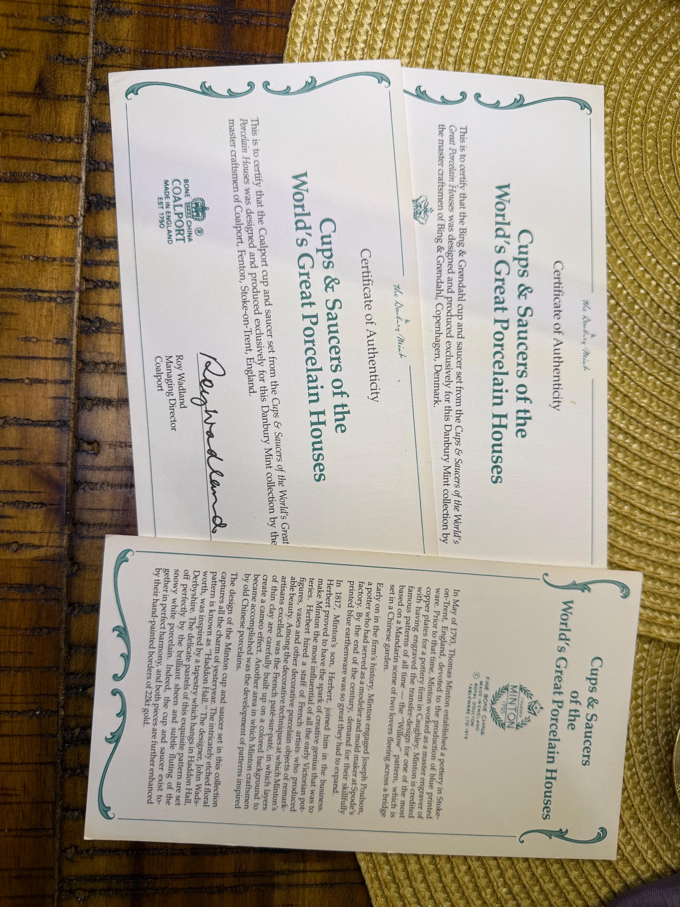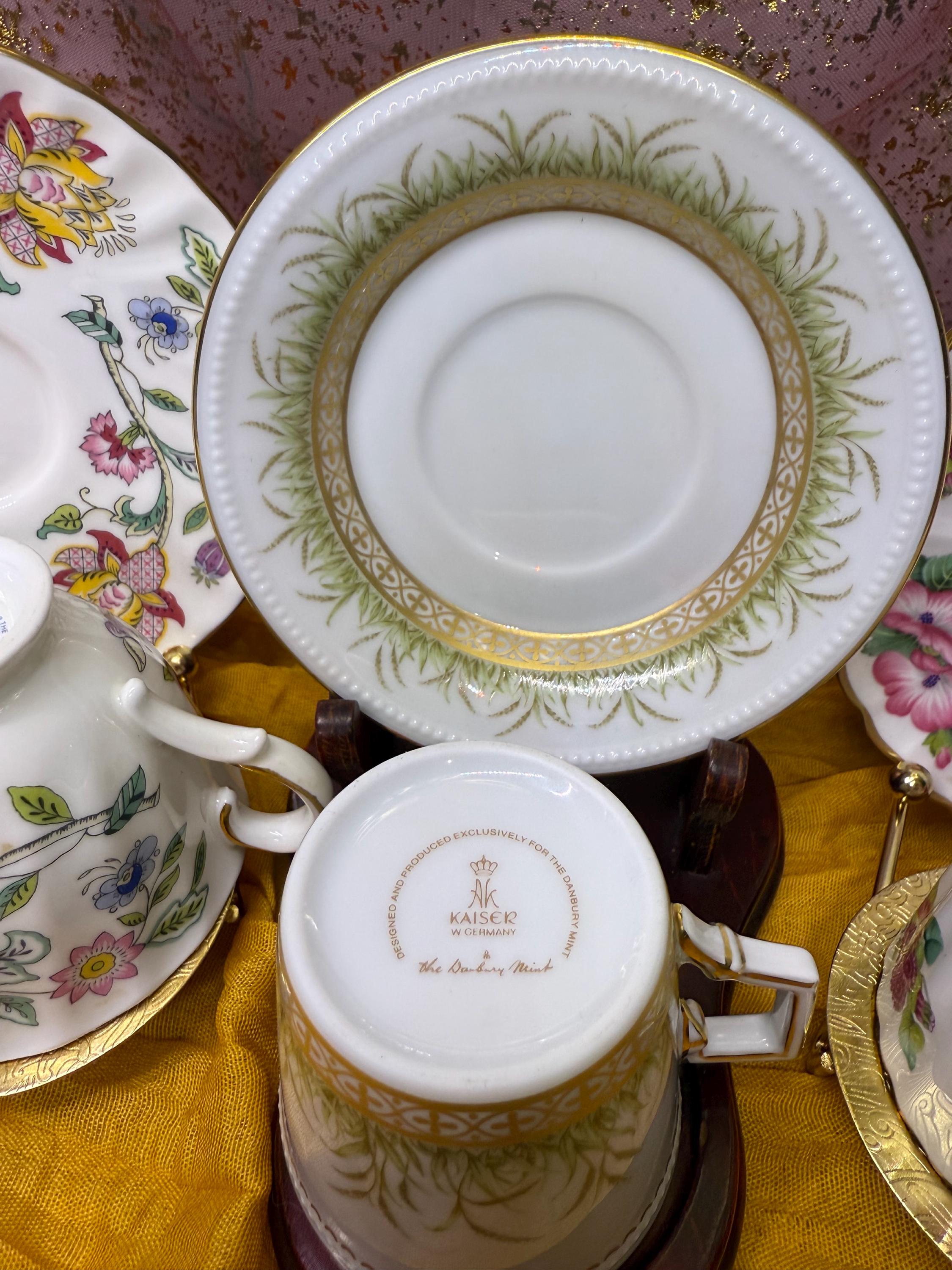 Each teacup and saucer set was created for the Danbury Mint’s “Cups & Saucers of the World’s Great Porcelain Houses” — a curated series featuring the finest European porcelain houses including Minton, Kaiser, Spode, Coalport, Bing & Grøndahl, and others. These pieces are accompanied by original Certificates of Authenticity, confirming their provenance and collectible status.