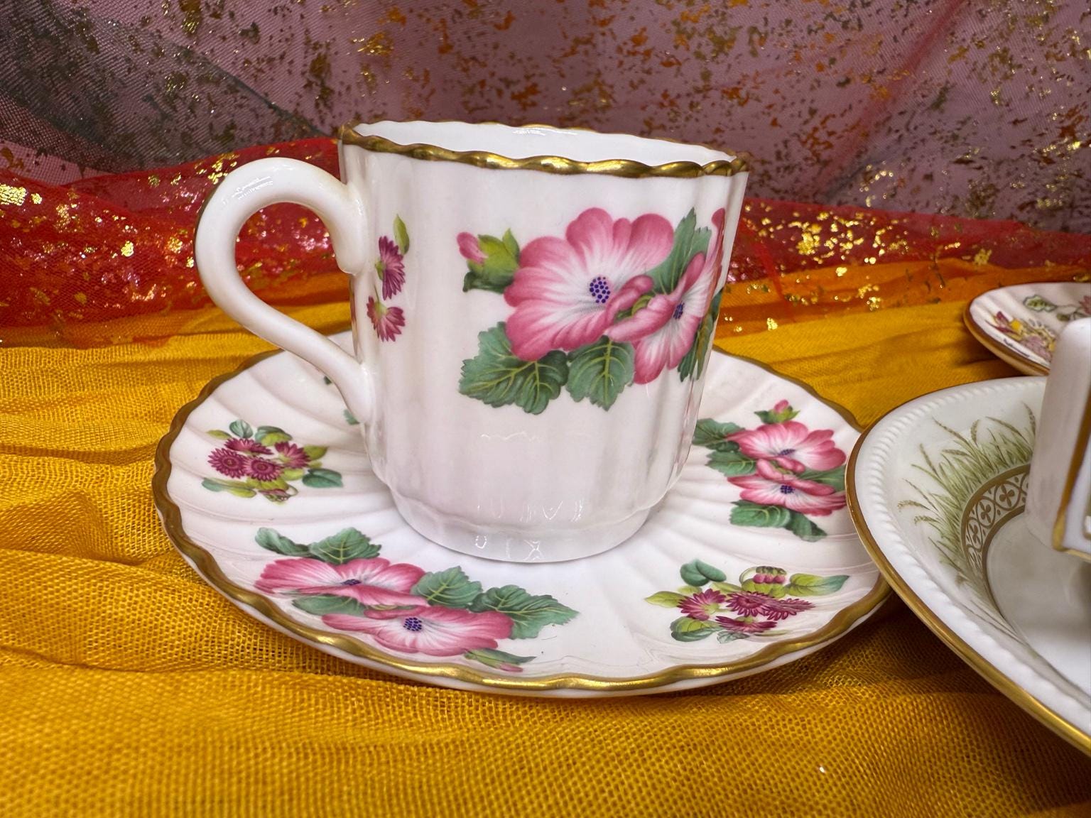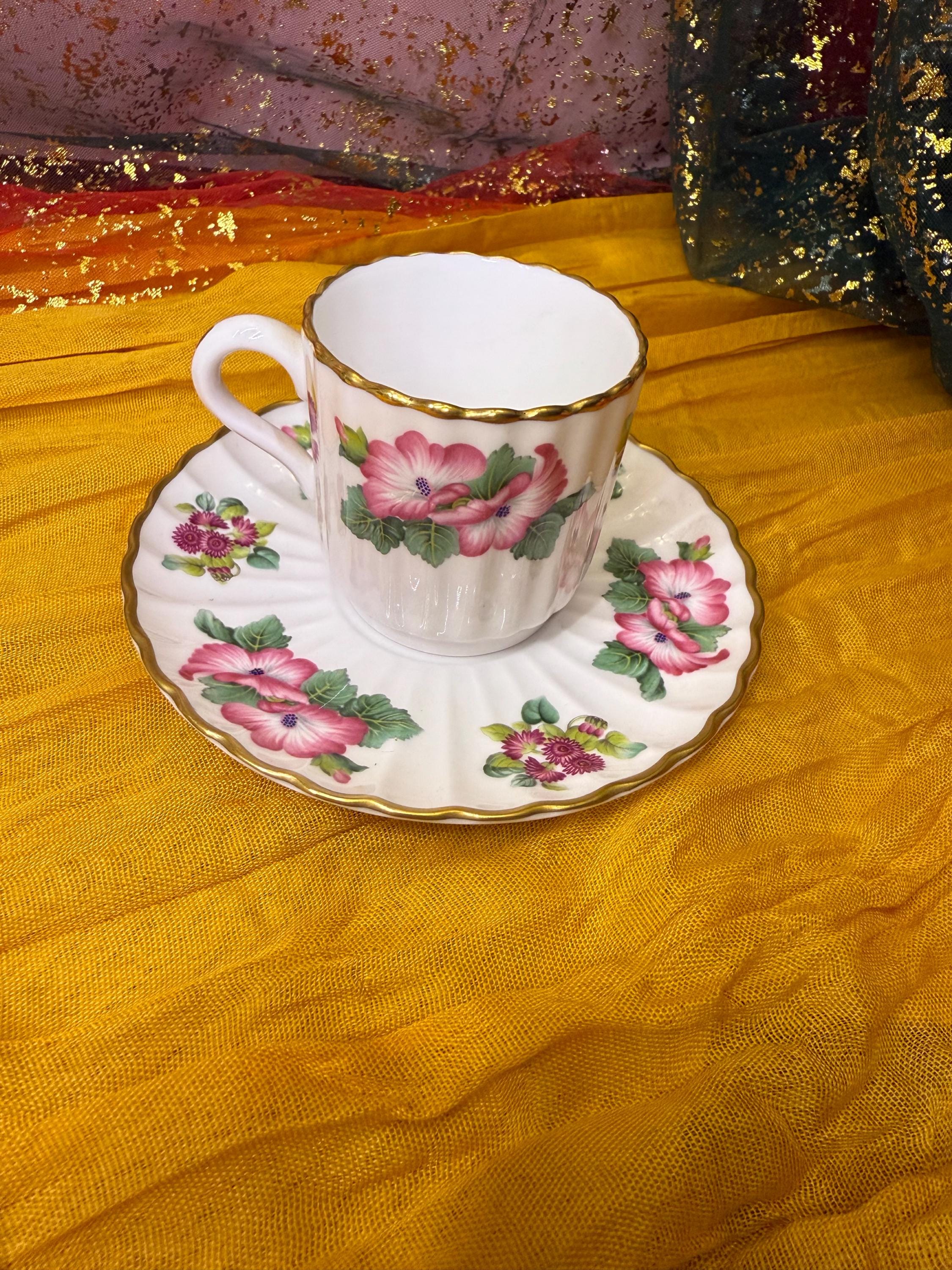 Classic ribbed porcelain body with pink hibiscus flowers and green leaves. The fluted saucer and scalloped edges are finished with gleaming gold trim.